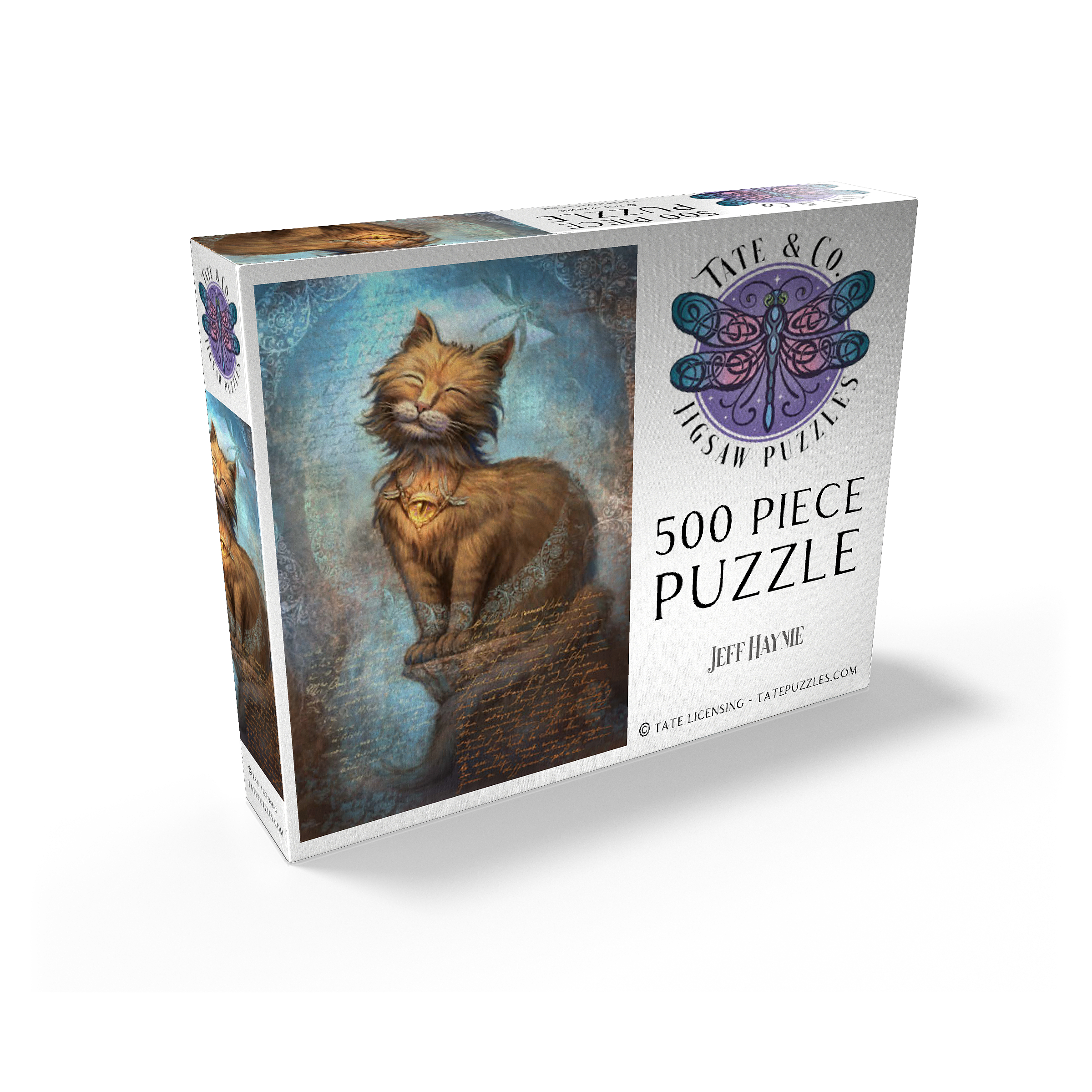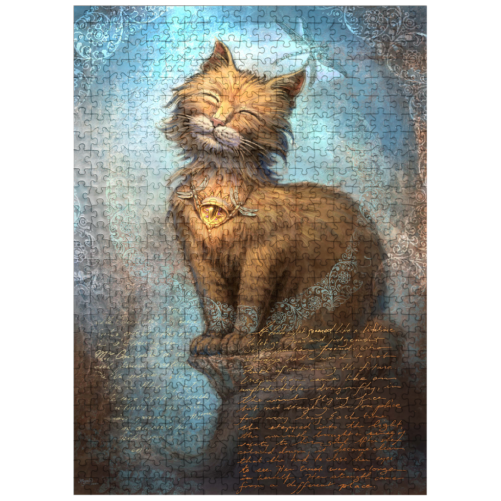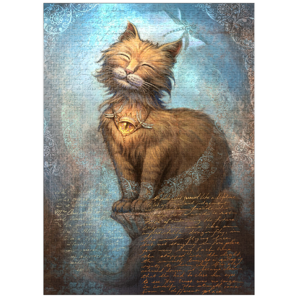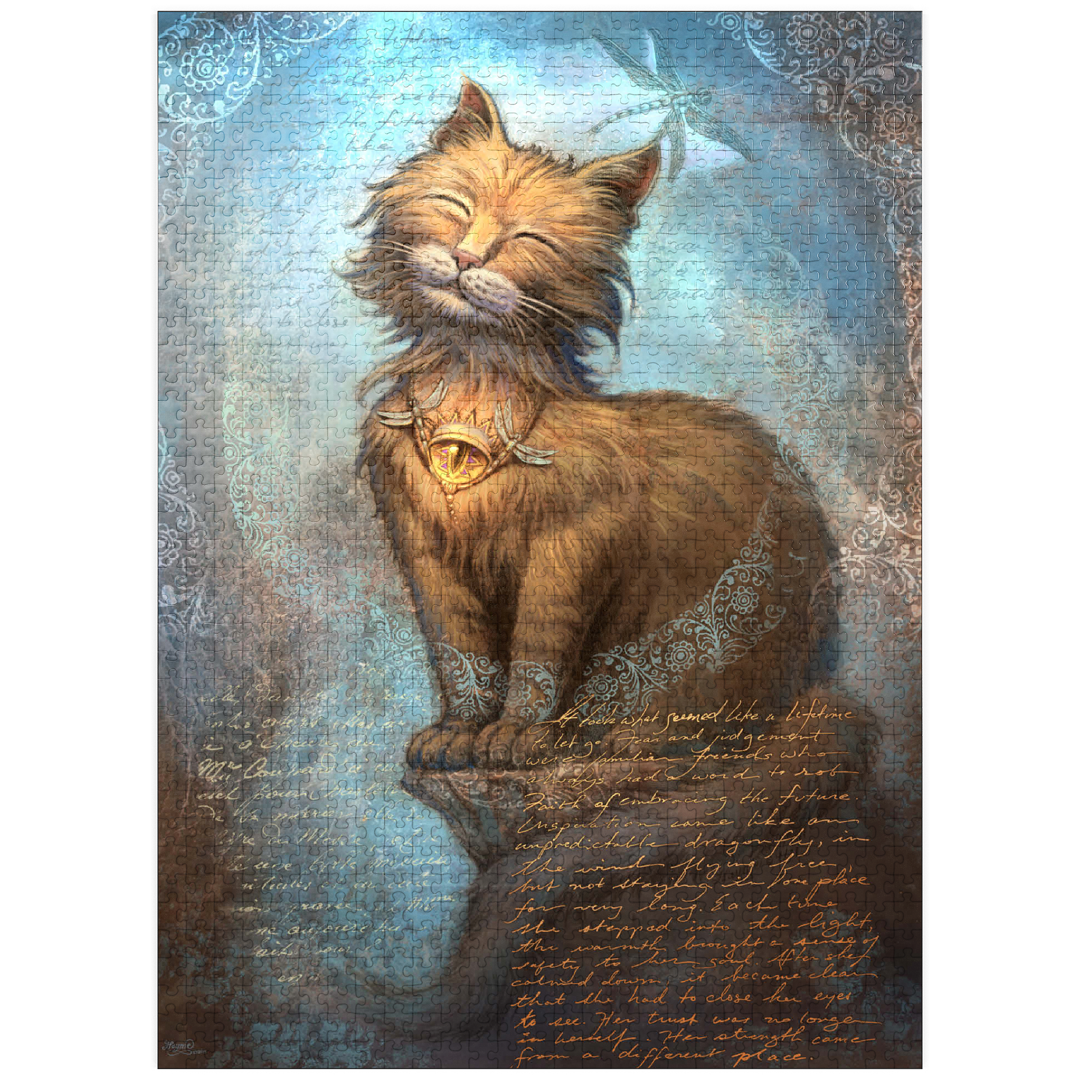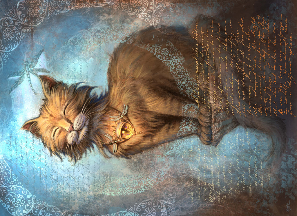 Jeff Haynie's artwork captures a serene, mystical scene of a contented cat adorned with a dragonfly pendant, basking in a dreamy ambiance. The image showcases a fluffy, orange cat sitting gracefully, eyes closed in apparent bliss. It wears a unique pendant featuring an eye design attached to dragonfly wings. Above the cat, a delicate dragonfly hovers. The background, a mix of muted blues and browns, is adorned with ornate patterns and script adding to the piece's whimsical quality. The overall atmosphere is calm, suggesting peace and contentment.