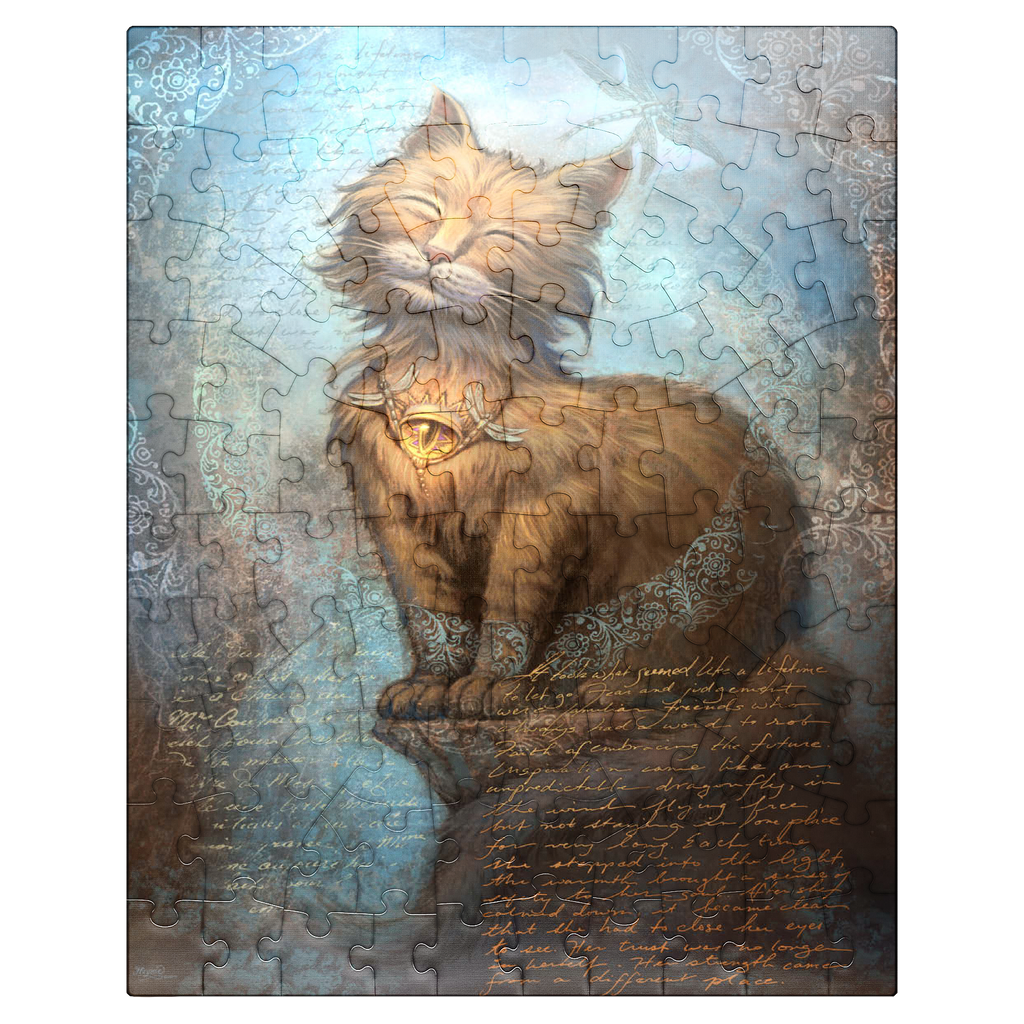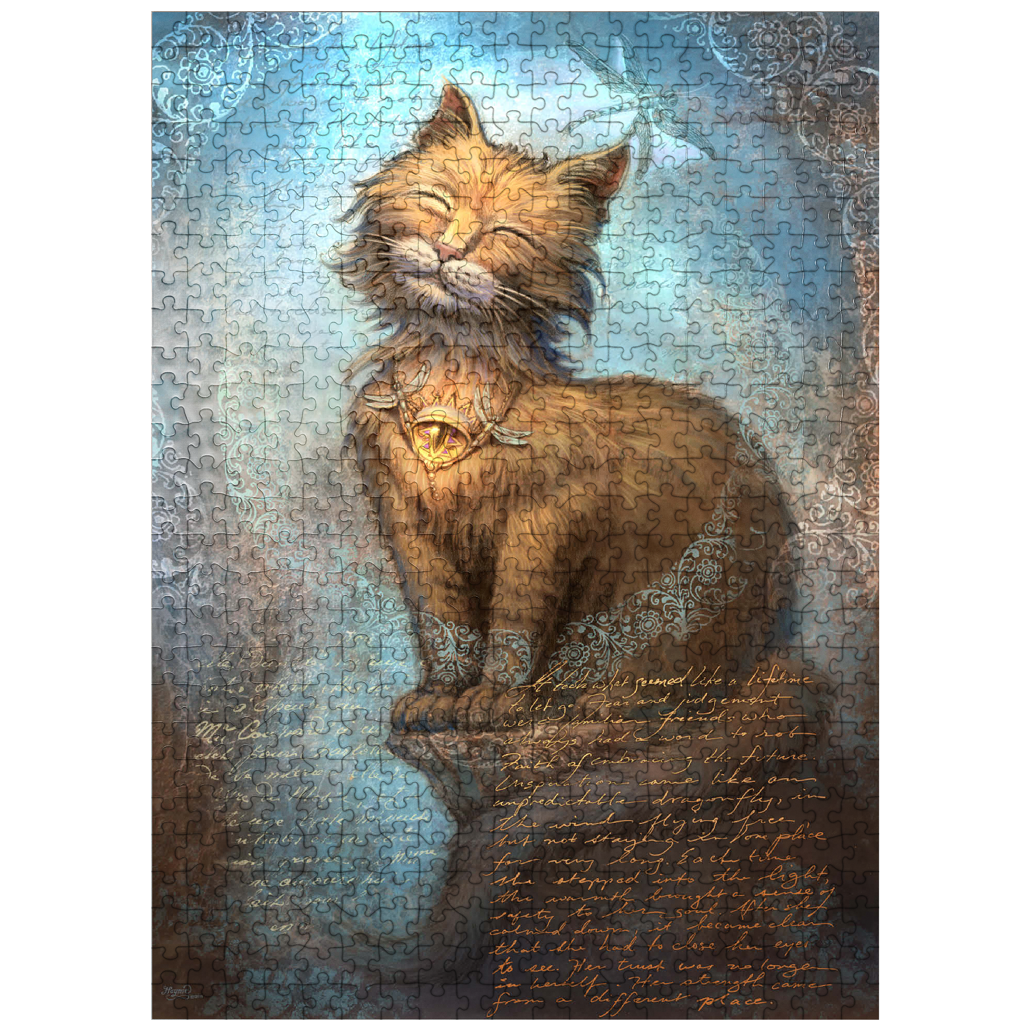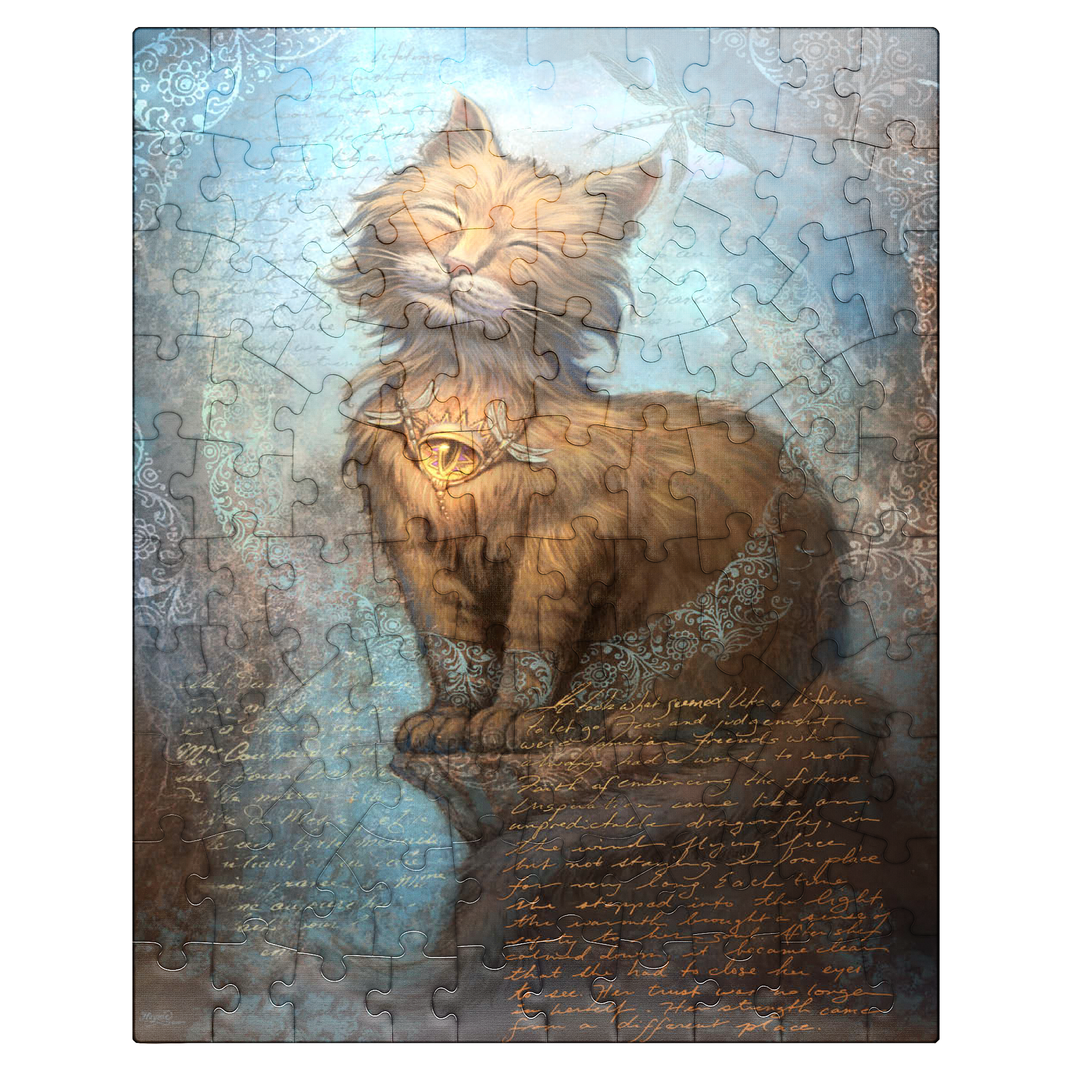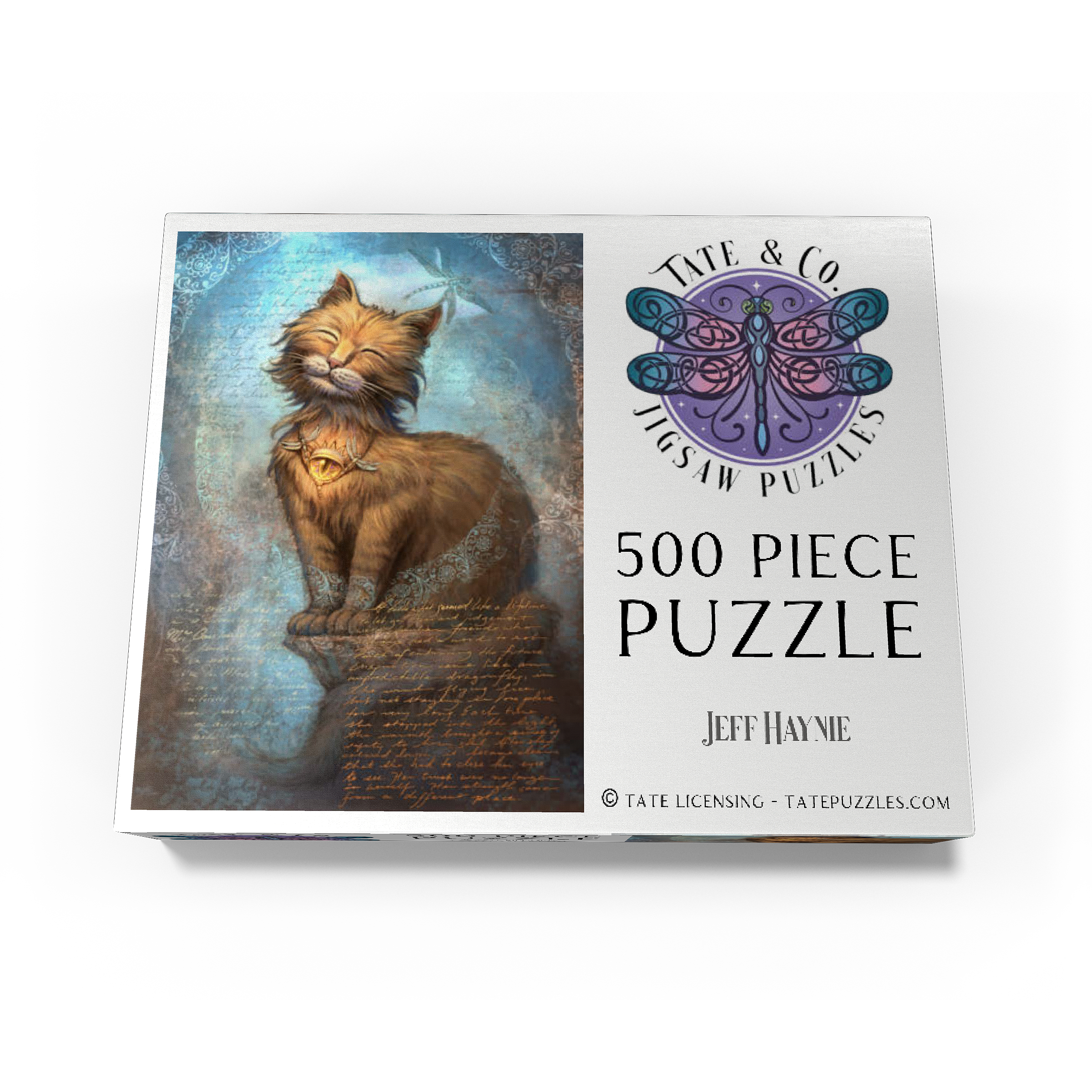 Jeff Haynie's artwork captures a serene, mystical scene of a contented cat adorned with a dragonfly pendant, basking in a dreamy ambiance. The image showcases a fluffy, orange cat sitting gracefully, eyes closed in apparent bliss. It wears a unique pendant featuring an eye design attached to dragonfly wings. Above the cat, a delicate dragonfly hovers. The background, a mix of muted blues and browns, is adorned with ornate patterns and script adding to the piece's whimsical quality. The overall atmosphere is calm, suggesting peace and contentment.