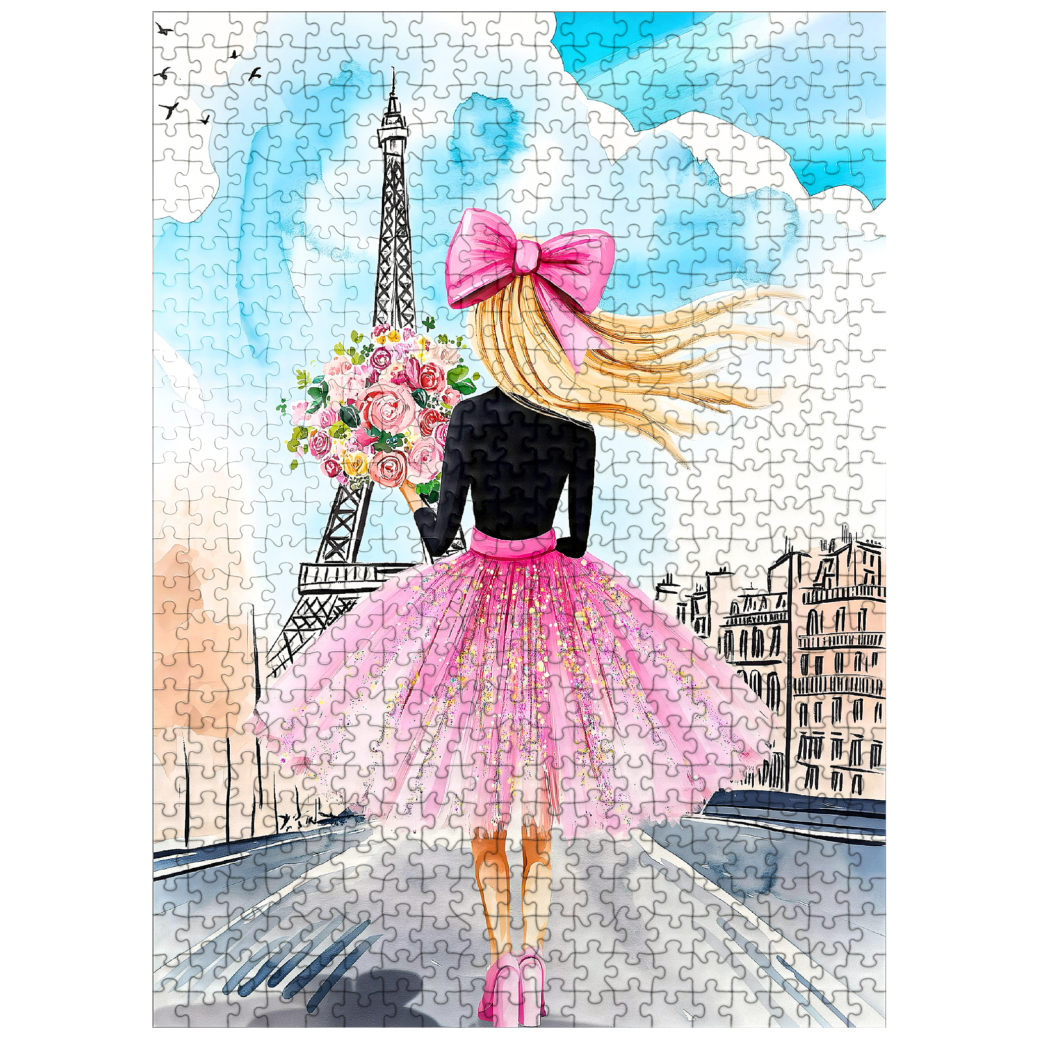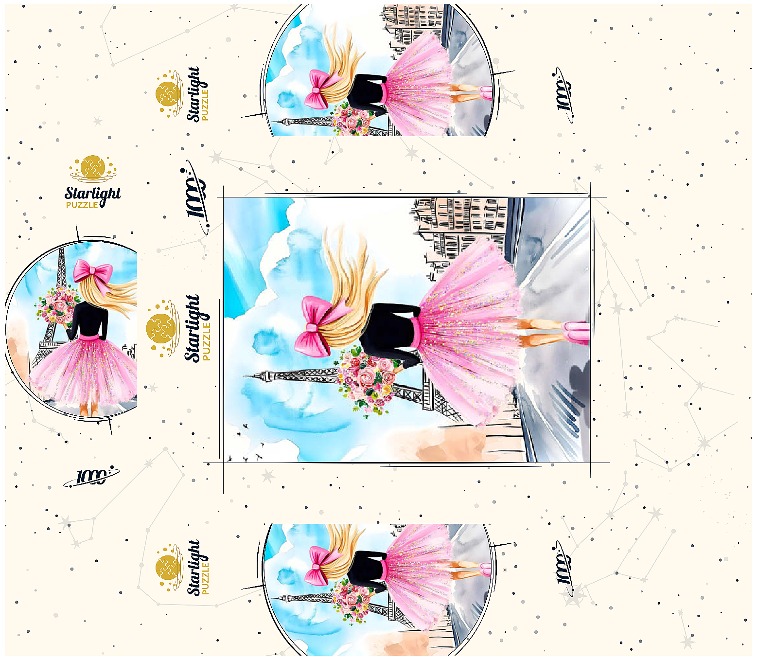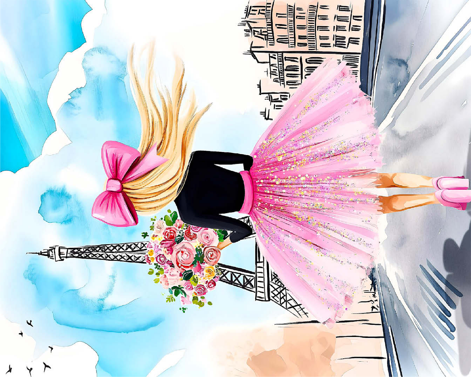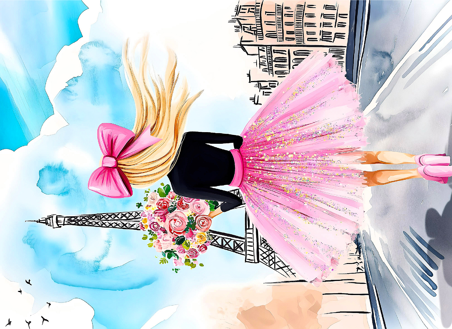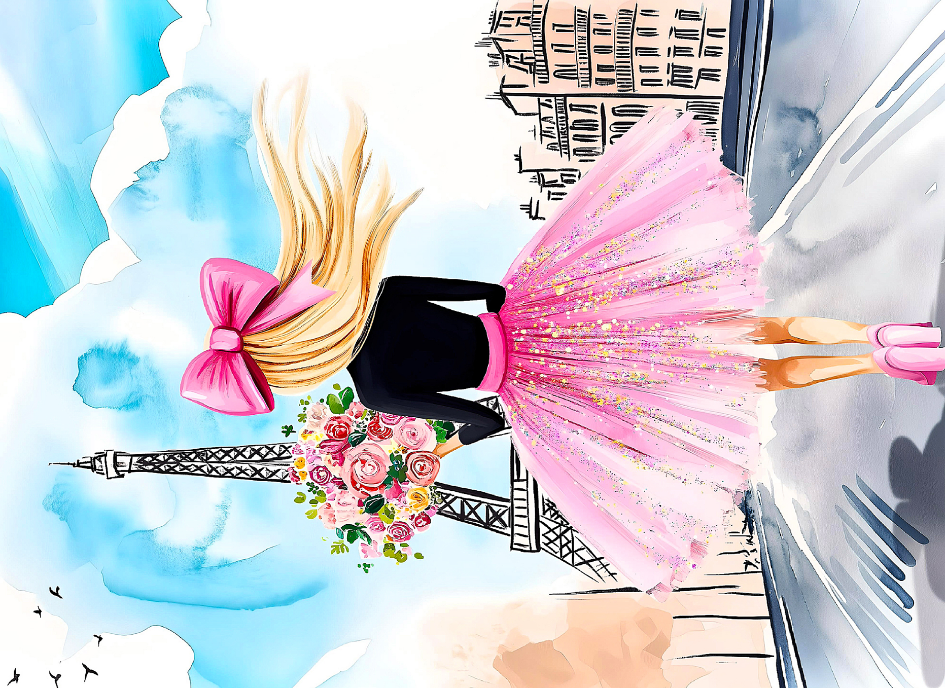 This charming artwork showcases a stylish woman standing in front of the iconic Eiffel Tower in Paris. She is adorned in a sparkling pink tulle skirt, paired with a bold pink bow and matching heels, holding a bouquet of colorful roses. The scene is set against a dreamy sky with soft clouds and elegant city architecture in the background. The illustration exudes romance and femininity, perfectly capturing the essence of Parisian charm and grace. The vibrant colors and delicate details create an enchanting and uplifting visual experience.