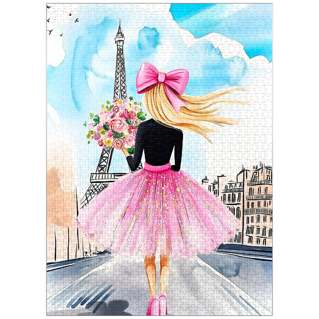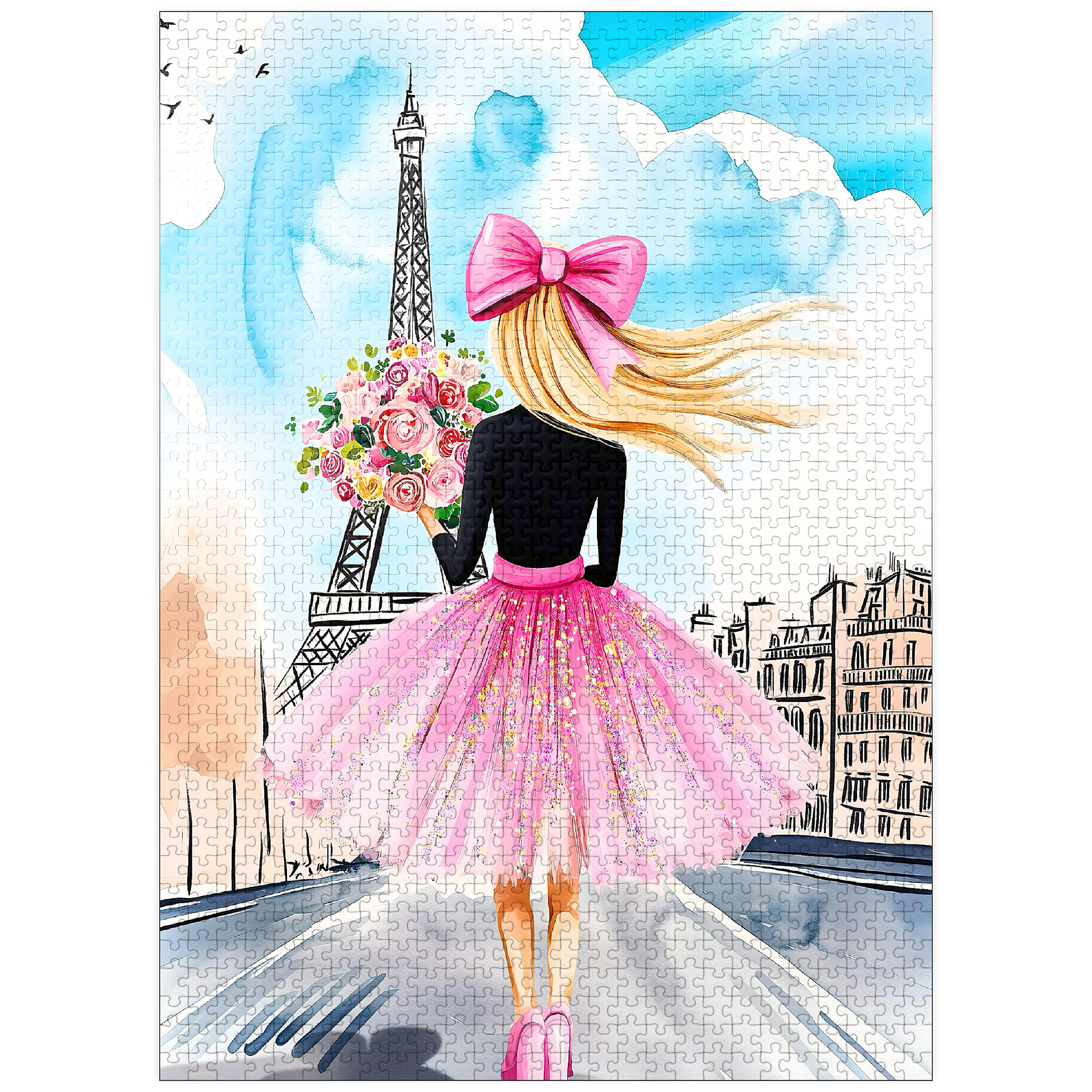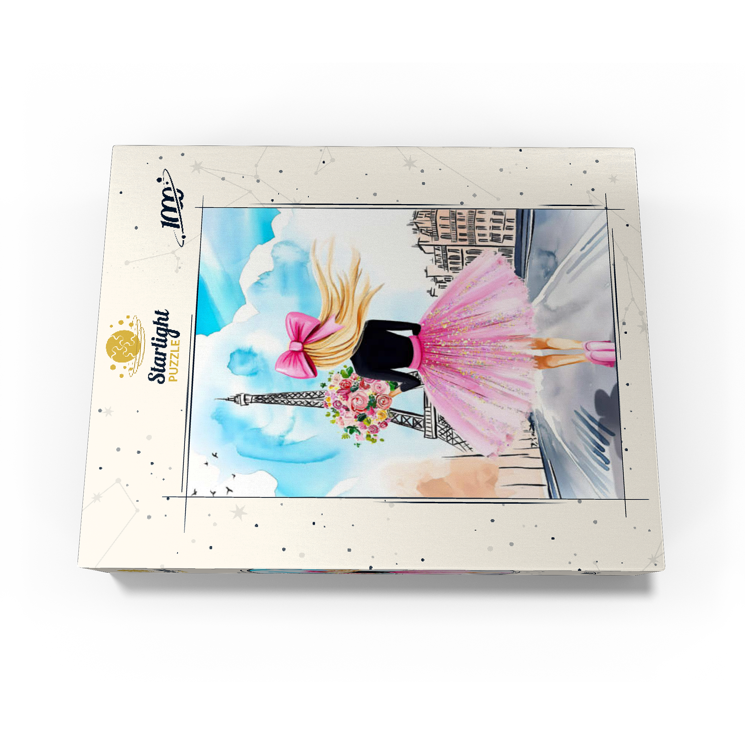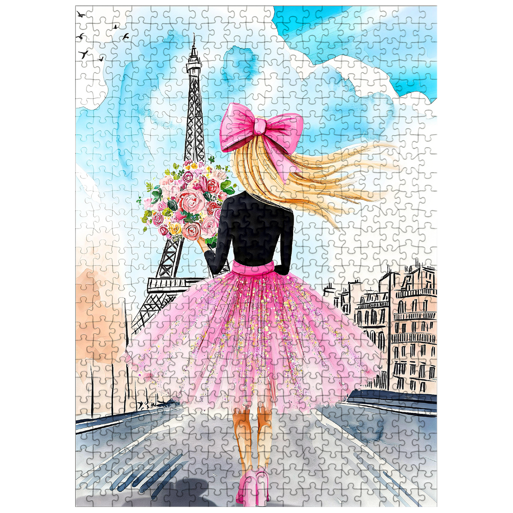 This charming artwork showcases a stylish woman standing in front of the iconic Eiffel Tower in Paris. She is adorned in a sparkling pink tulle skirt, paired with a bold pink bow and matching heels, holding a bouquet of colorful roses. The scene is set against a dreamy sky with soft clouds and elegant city architecture in the background. The illustration exudes romance and femininity, perfectly capturing the essence of Parisian charm and grace. The vibrant colors and delicate details create an enchanting and uplifting visual experience.