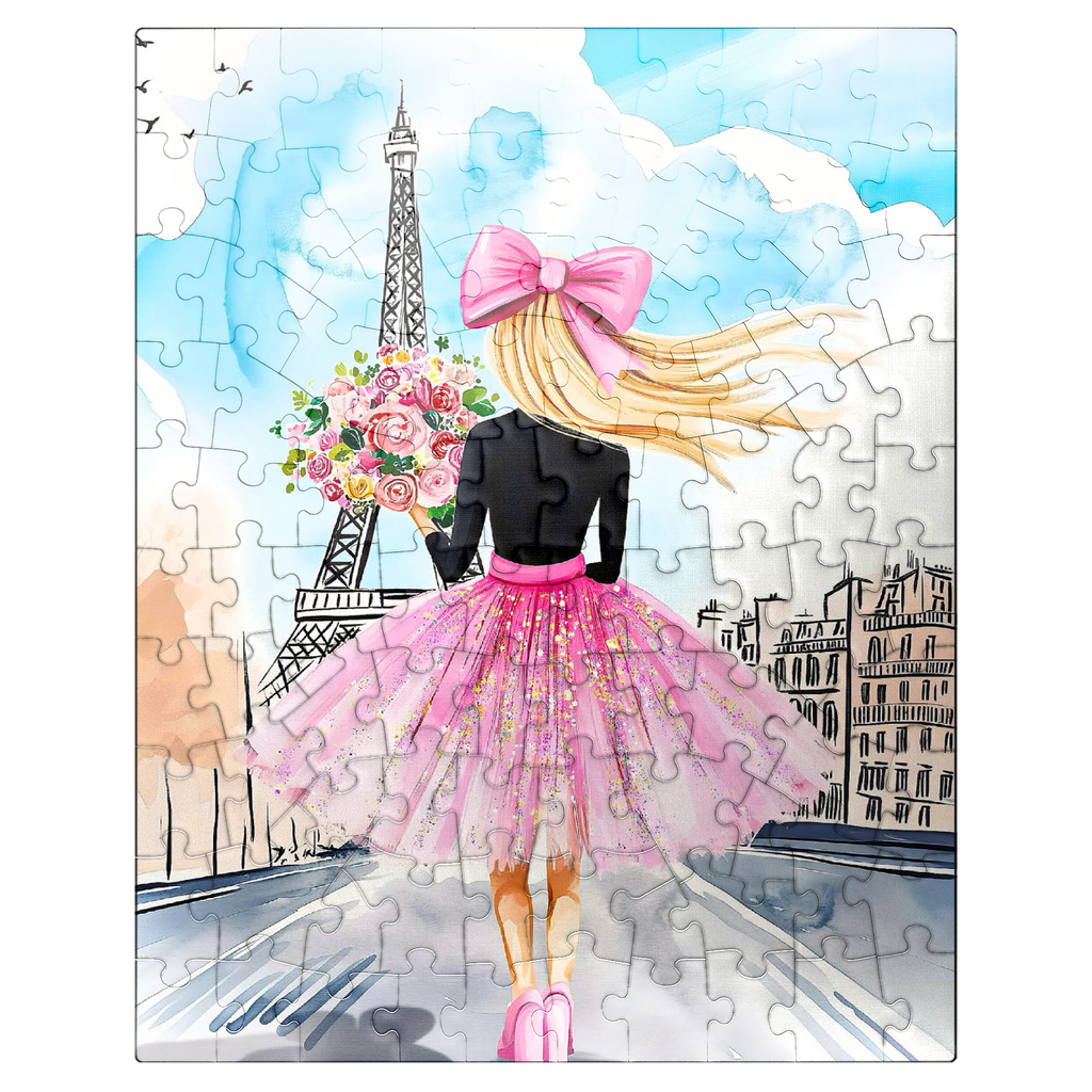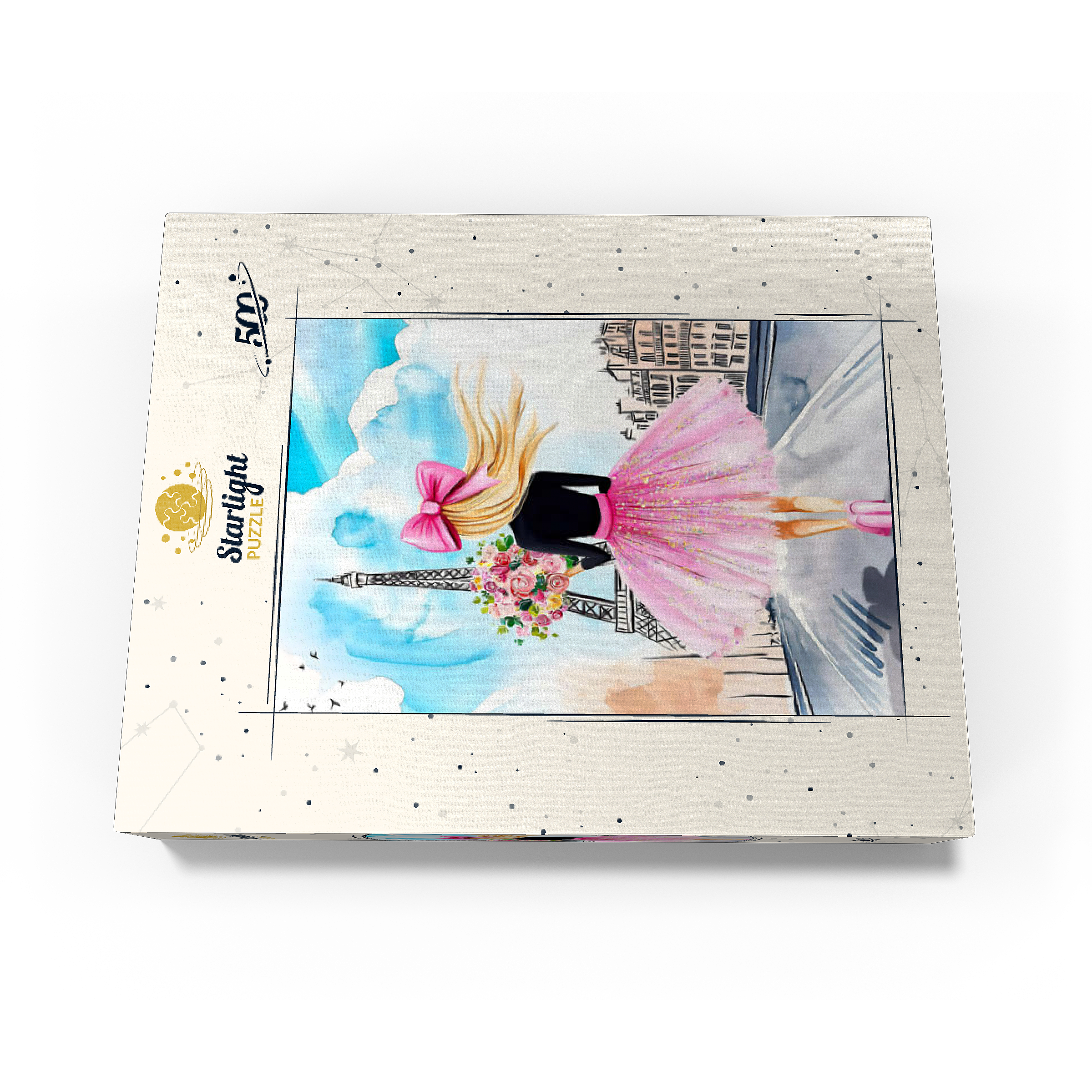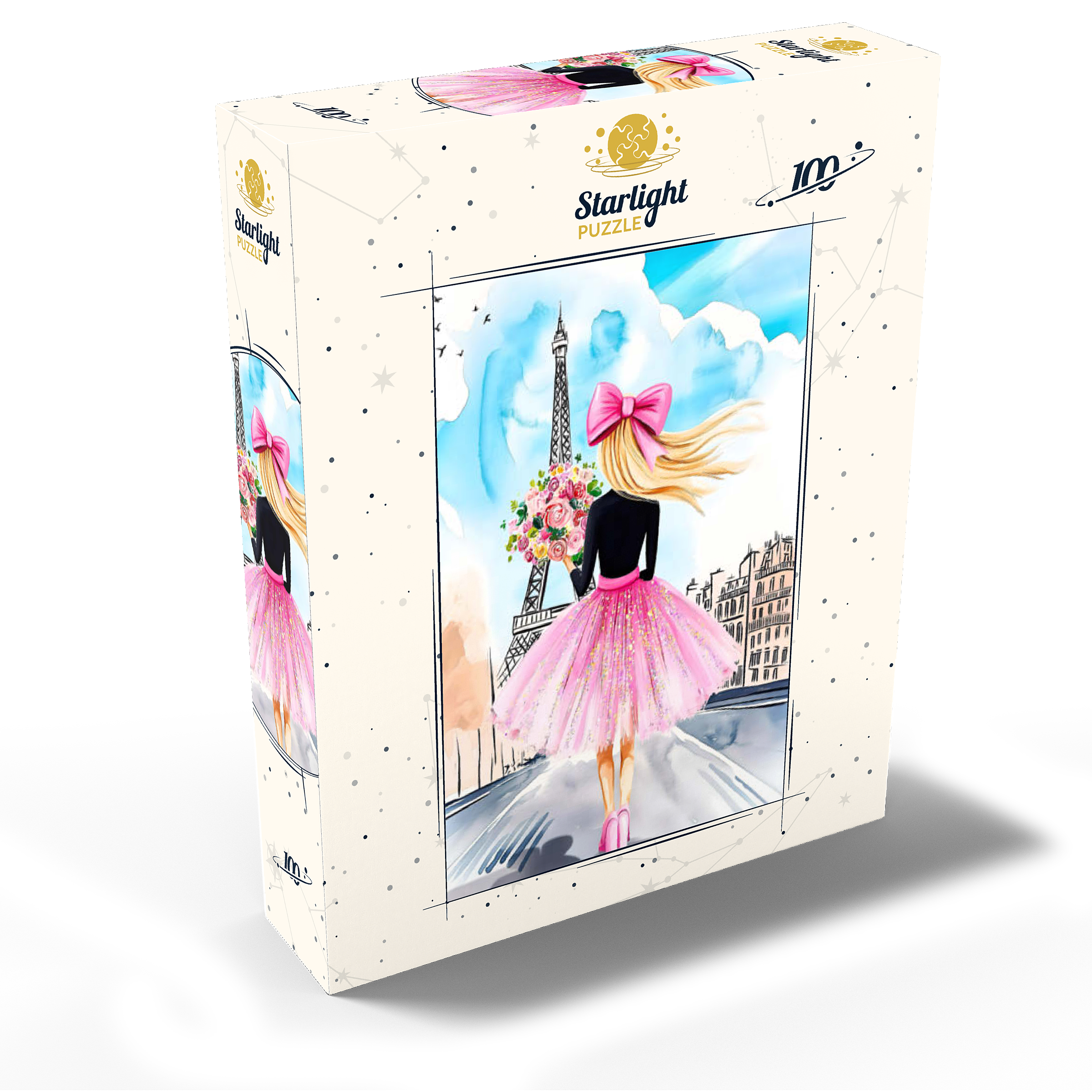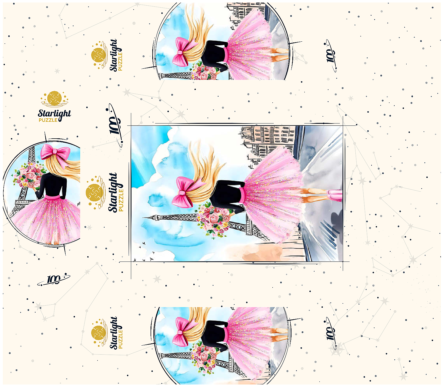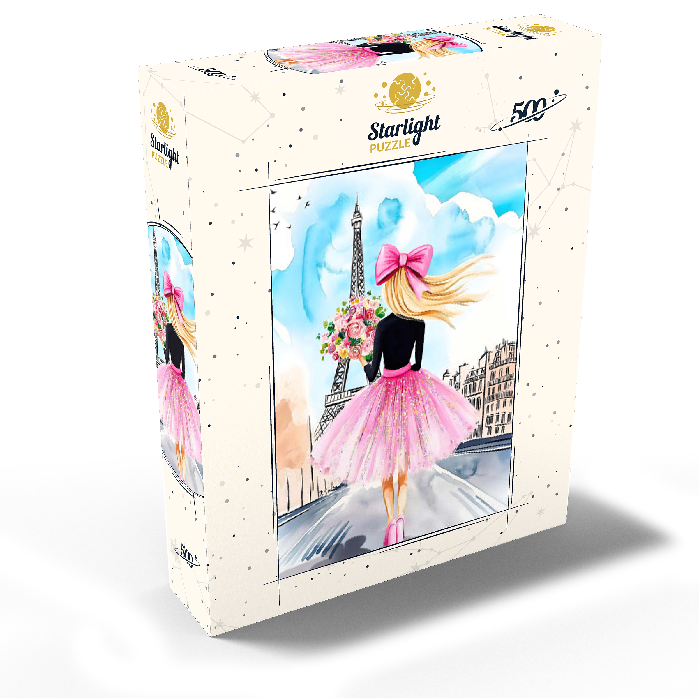 This charming artwork showcases a stylish woman standing in front of the iconic Eiffel Tower in Paris. She is adorned in a sparkling pink tulle skirt, paired with a bold pink bow and matching heels, holding a bouquet of colorful roses. The scene is set against a dreamy sky with soft clouds and elegant city architecture in the background. The illustration exudes romance and femininity, perfectly capturing the essence of Parisian charm and grace. The vibrant colors and delicate details create an enchanting and uplifting visual experience.