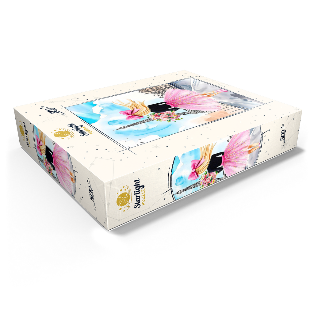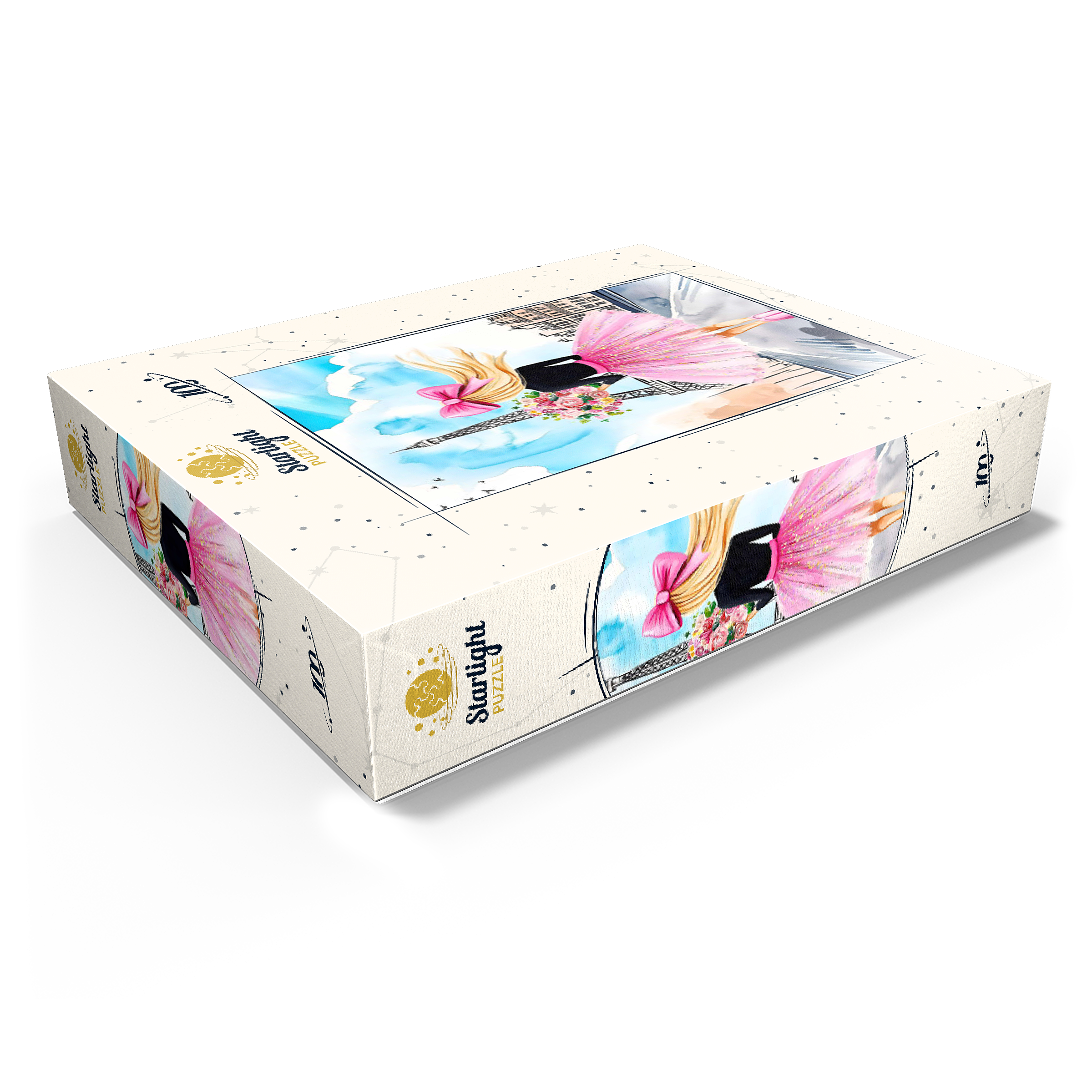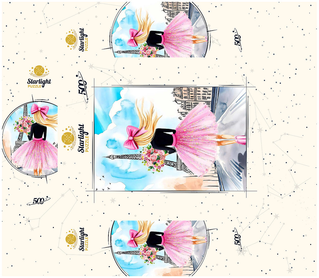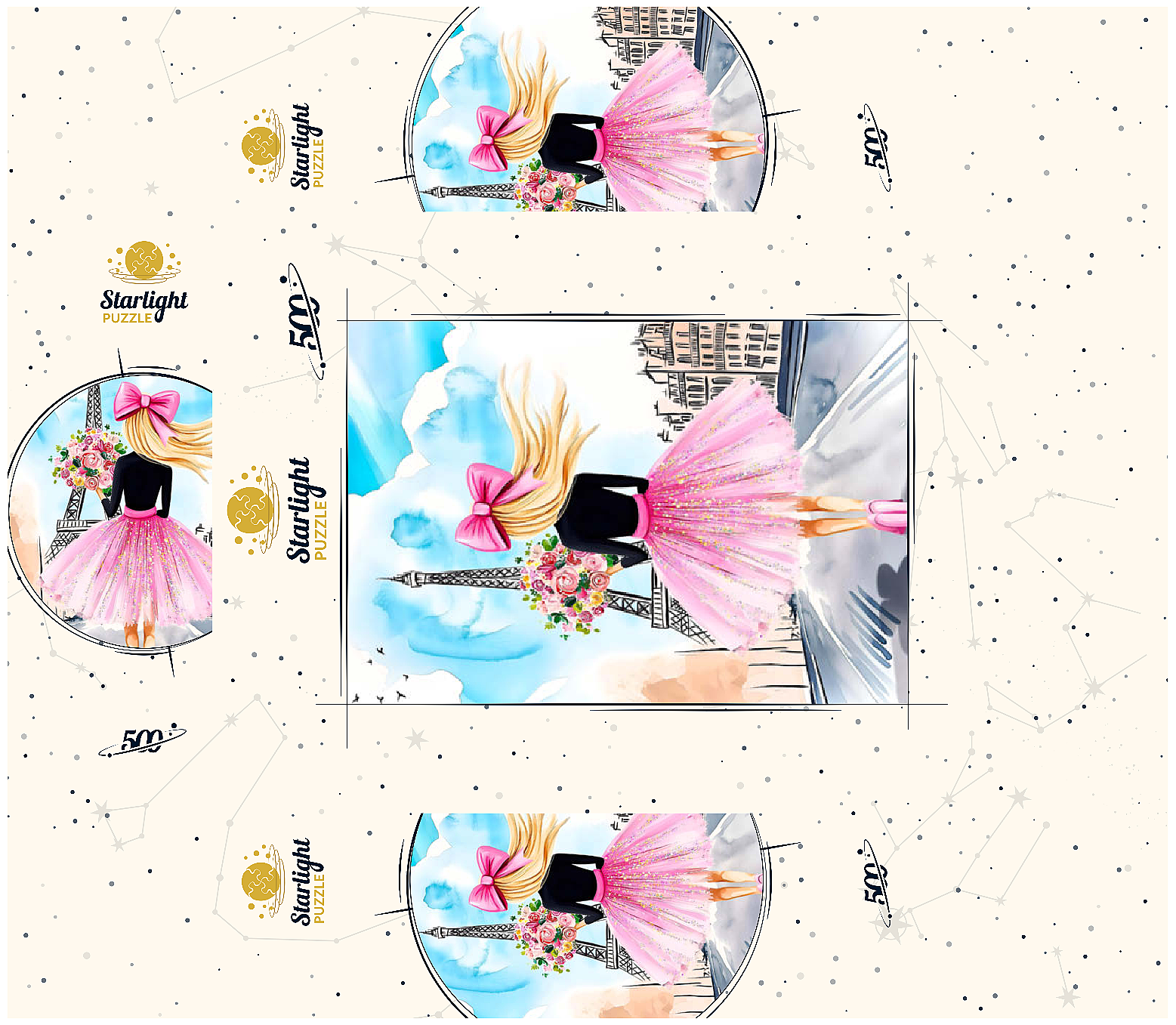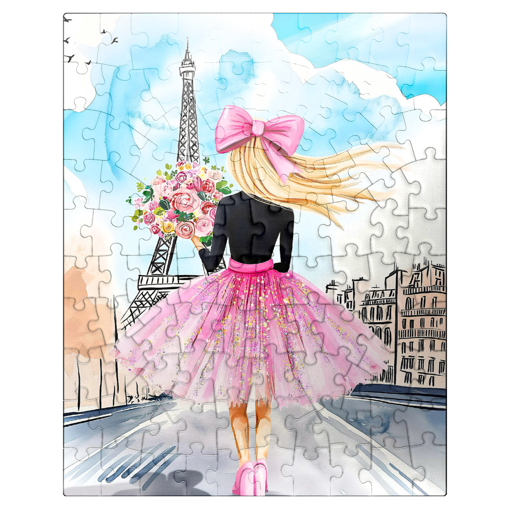 This charming artwork showcases a stylish woman standing in front of the iconic Eiffel Tower in Paris. She is adorned in a sparkling pink tulle skirt, paired with a bold pink bow and matching heels, holding a bouquet of colorful roses. The scene is set against a dreamy sky with soft clouds and elegant city architecture in the background. The illustration exudes romance and femininity, perfectly capturing the essence of Parisian charm and grace. The vibrant colors and delicate details create an enchanting and uplifting visual experience.