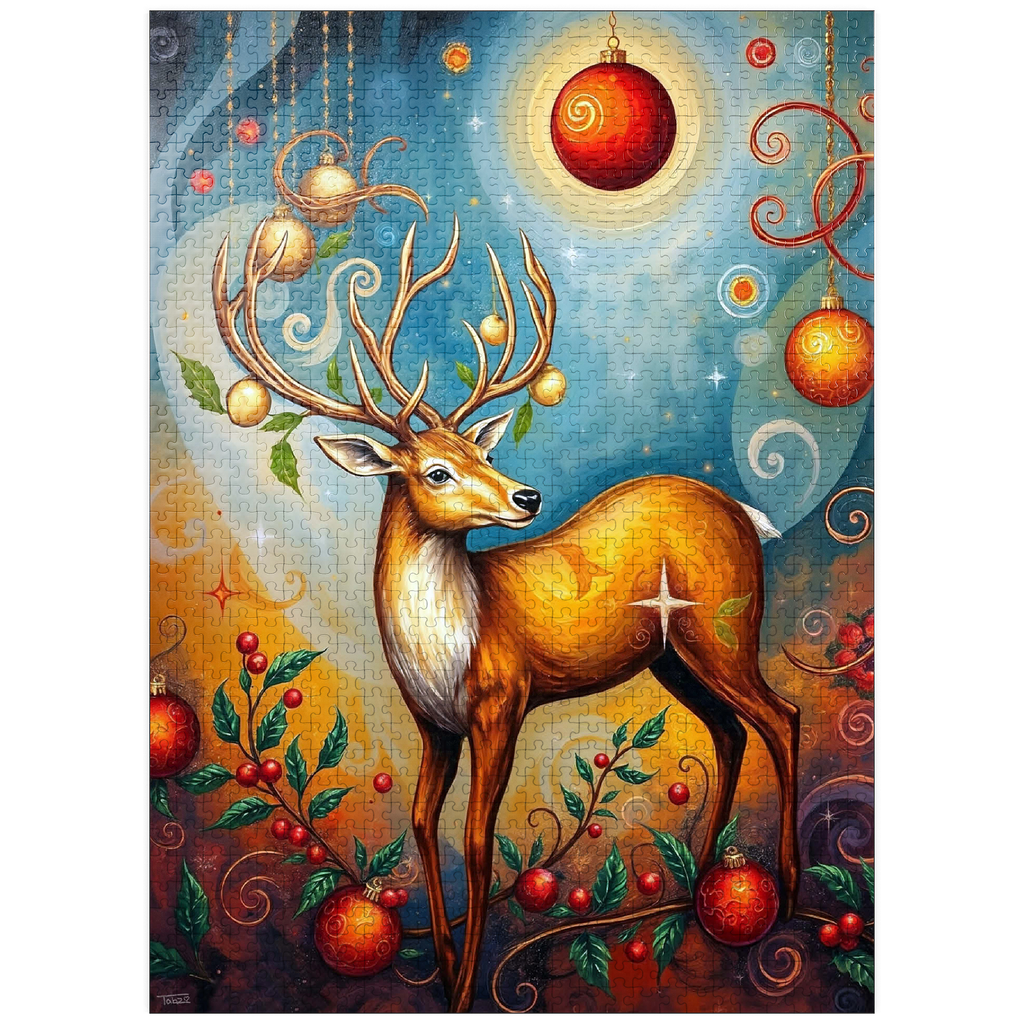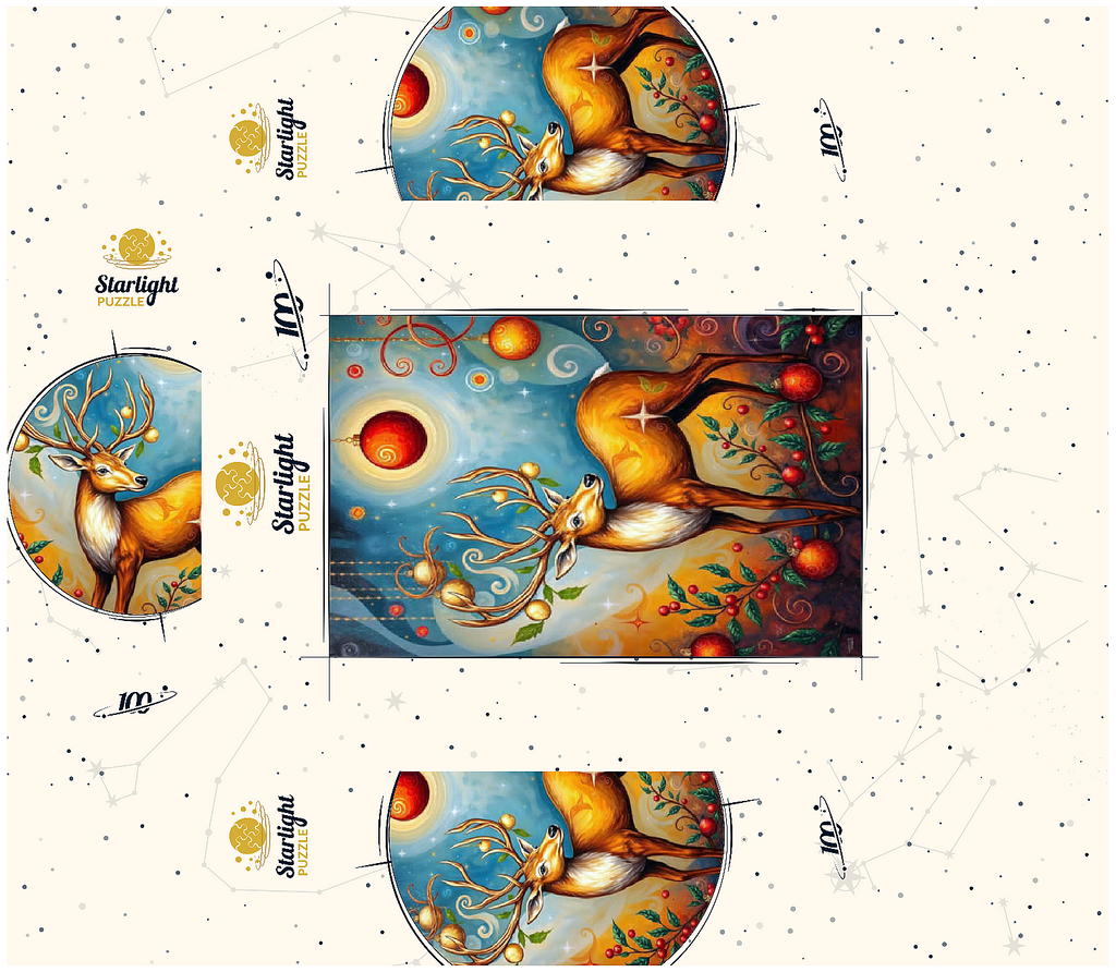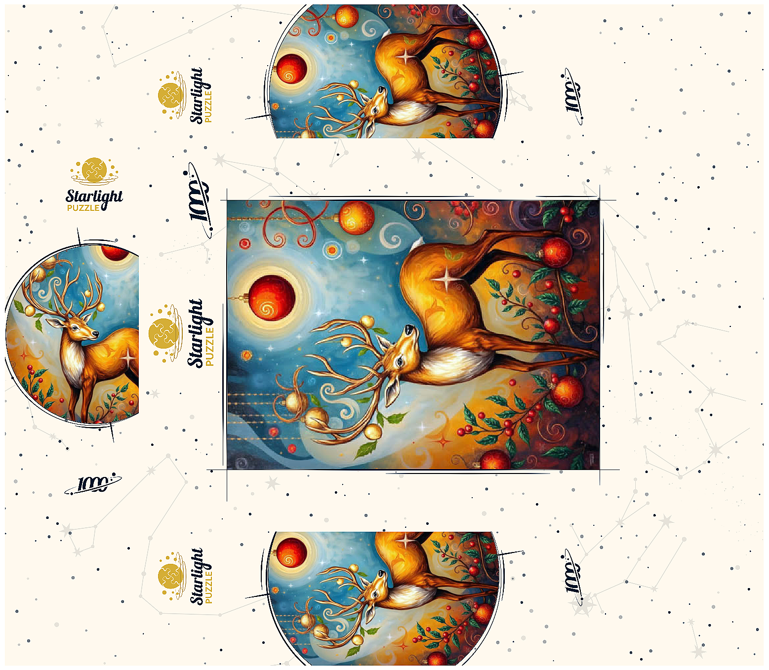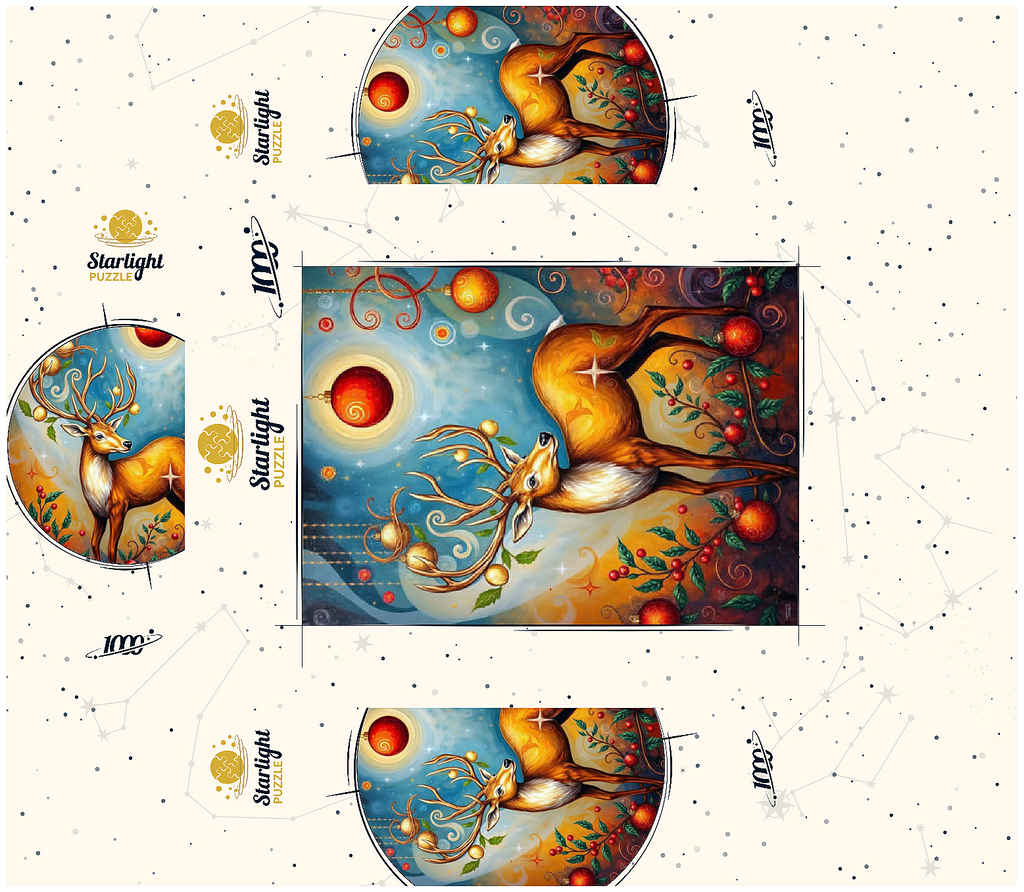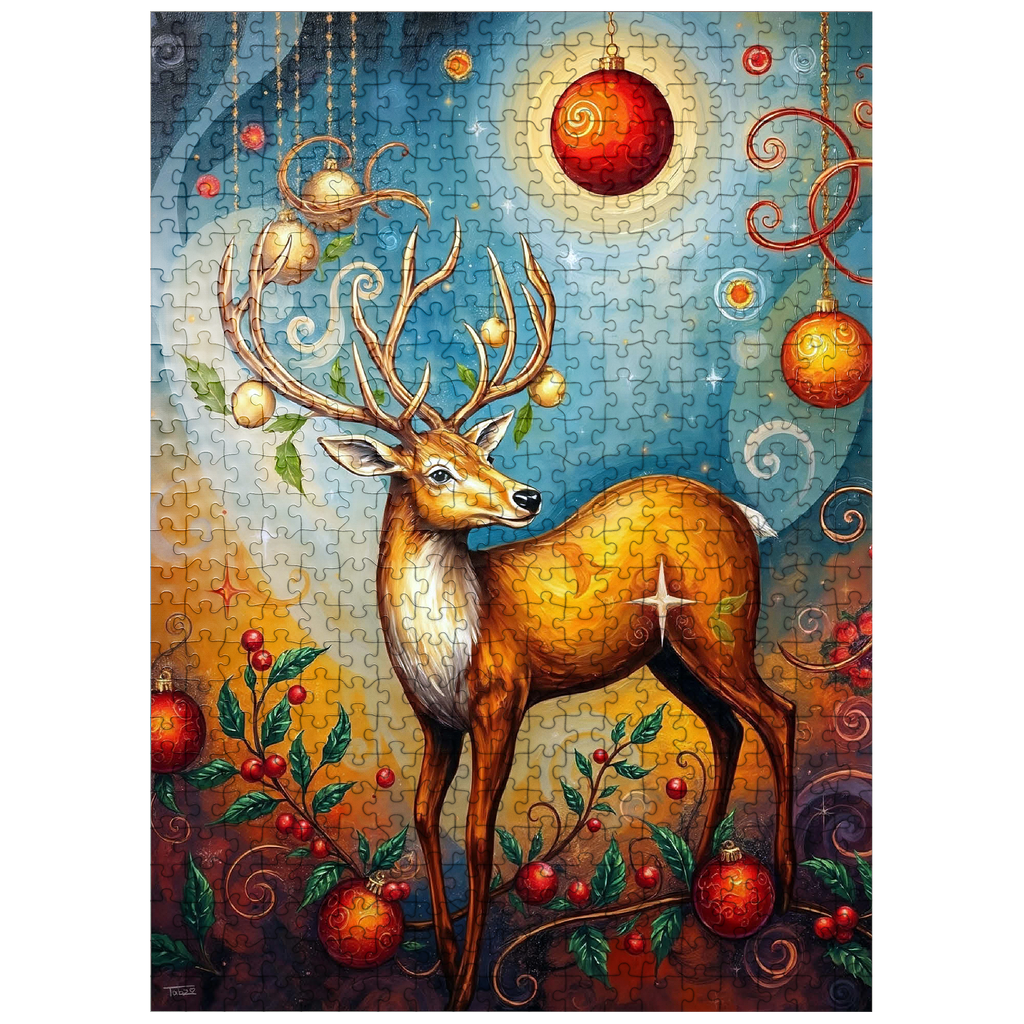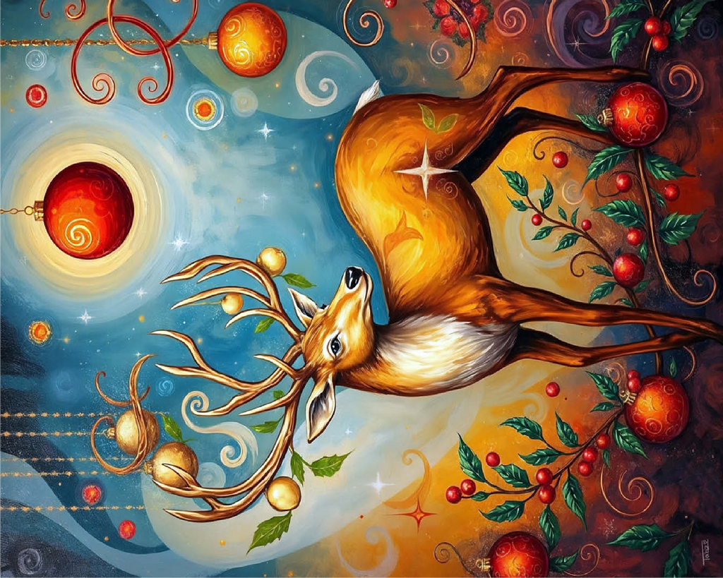 A whimsical digital artwork featuring a majestic deer adorned with golden antlers decorated with shimmering Christmas ornaments and holly leaves. The background is a magical swirl of deep blues, golds, and reds, with glowing stars and sparkling baubles suspended in the air. Bright red berries and festive greenery surround the deer, adding a classic holiday touch. The deer's gentle expression and elegant stance create a sense of warmth and wonder, making this artwork perfect for seasonal decor. Ideal for those who love Christmas themes, festive animal art, and enchanting holiday illustrations.