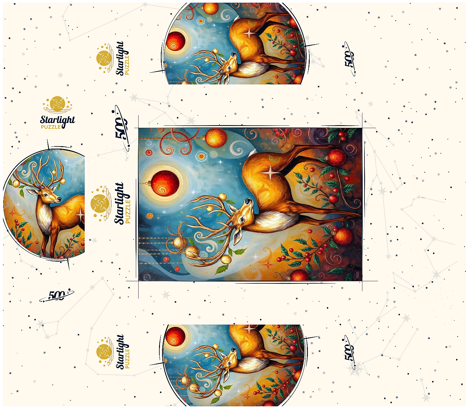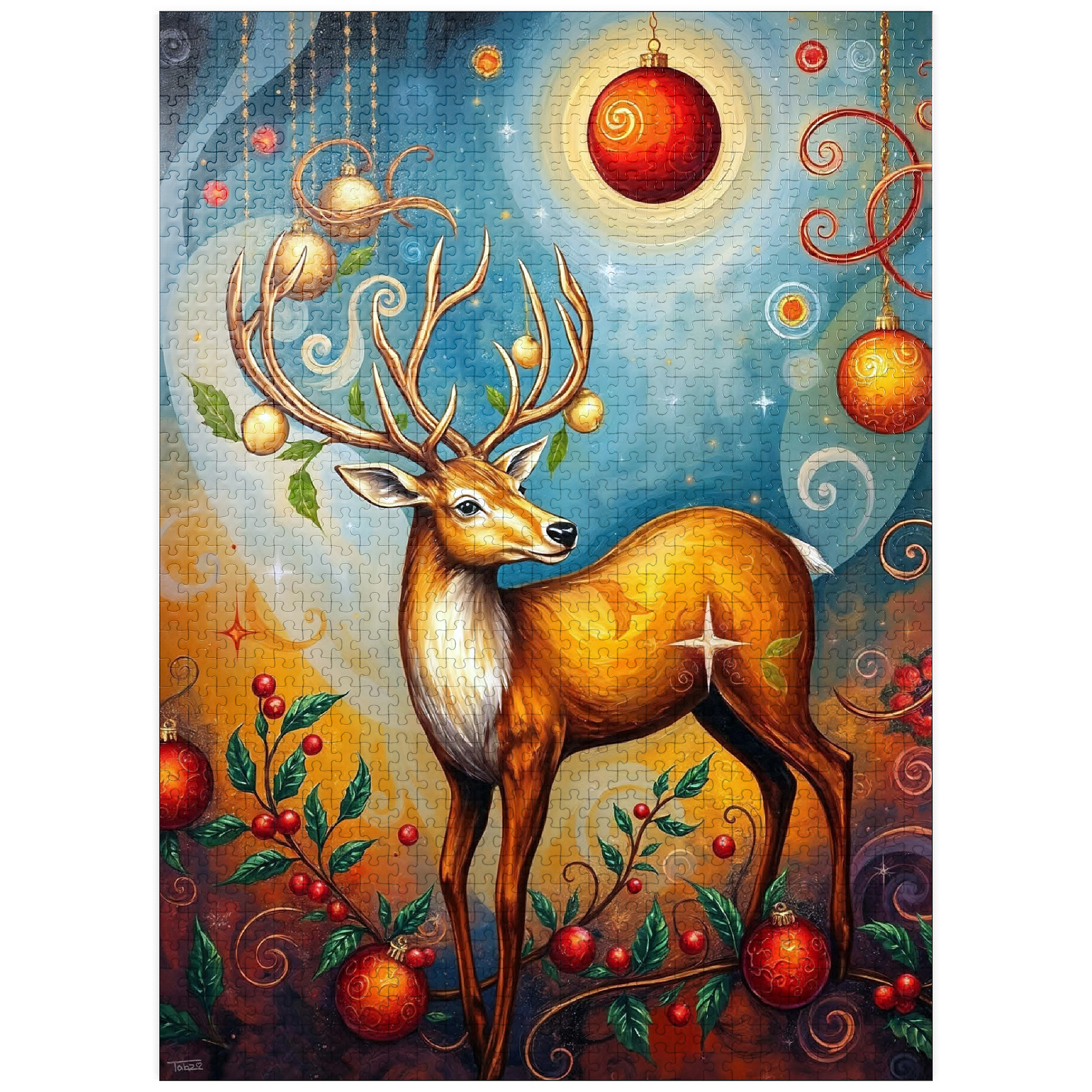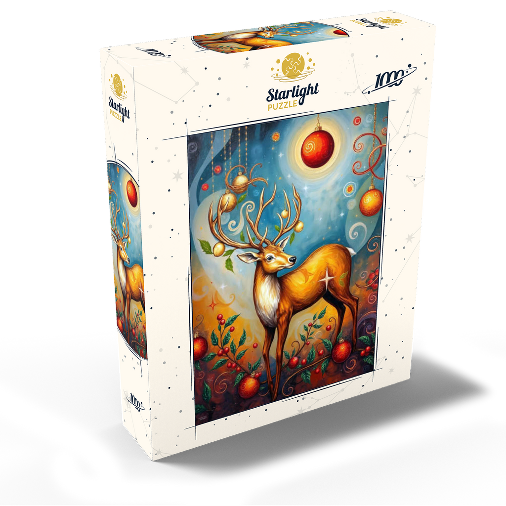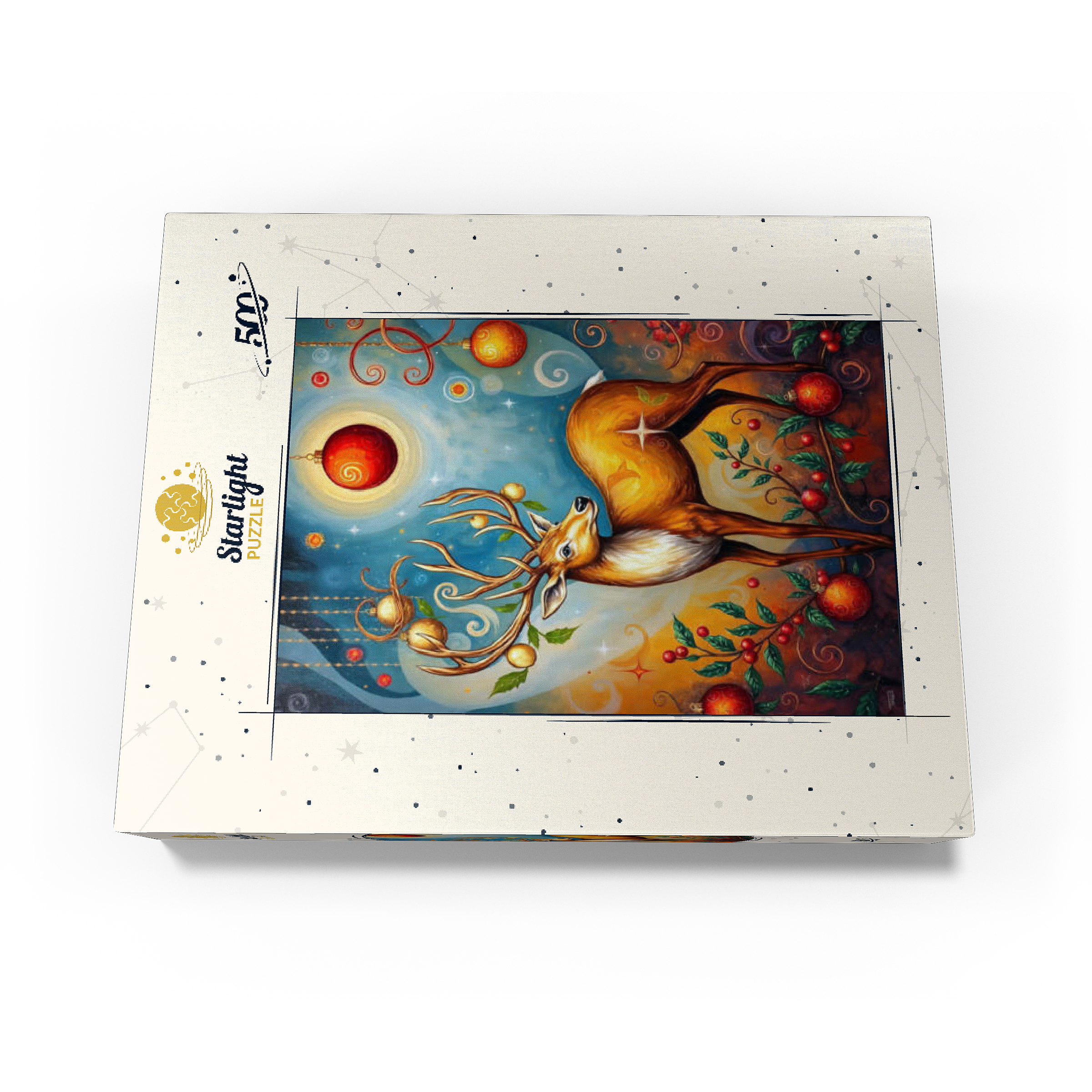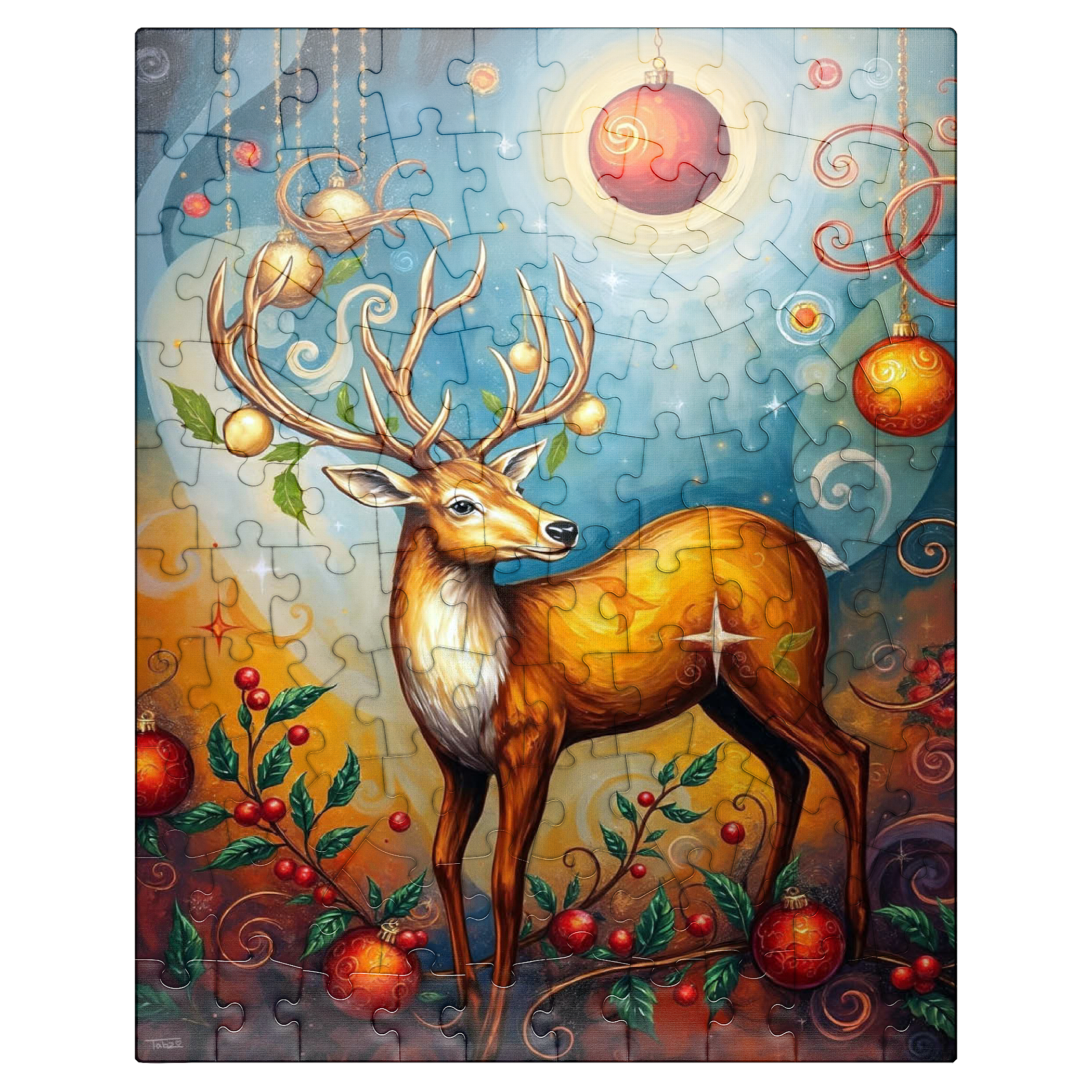 A whimsical digital artwork featuring a majestic deer adorned with golden antlers decorated with shimmering Christmas ornaments and holly leaves. The background is a magical swirl of deep blues, golds, and reds, with glowing stars and sparkling baubles suspended in the air. Bright red berries and festive greenery surround the deer, adding a classic holiday touch. The deer's gentle expression and elegant stance create a sense of warmth and wonder, making this artwork perfect for seasonal decor. Ideal for those who love Christmas themes, festive animal art, and enchanting holiday illustrations.