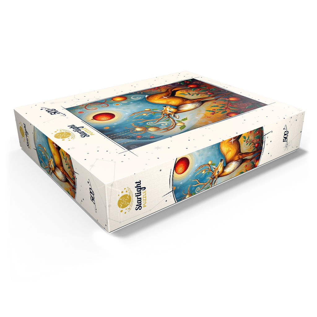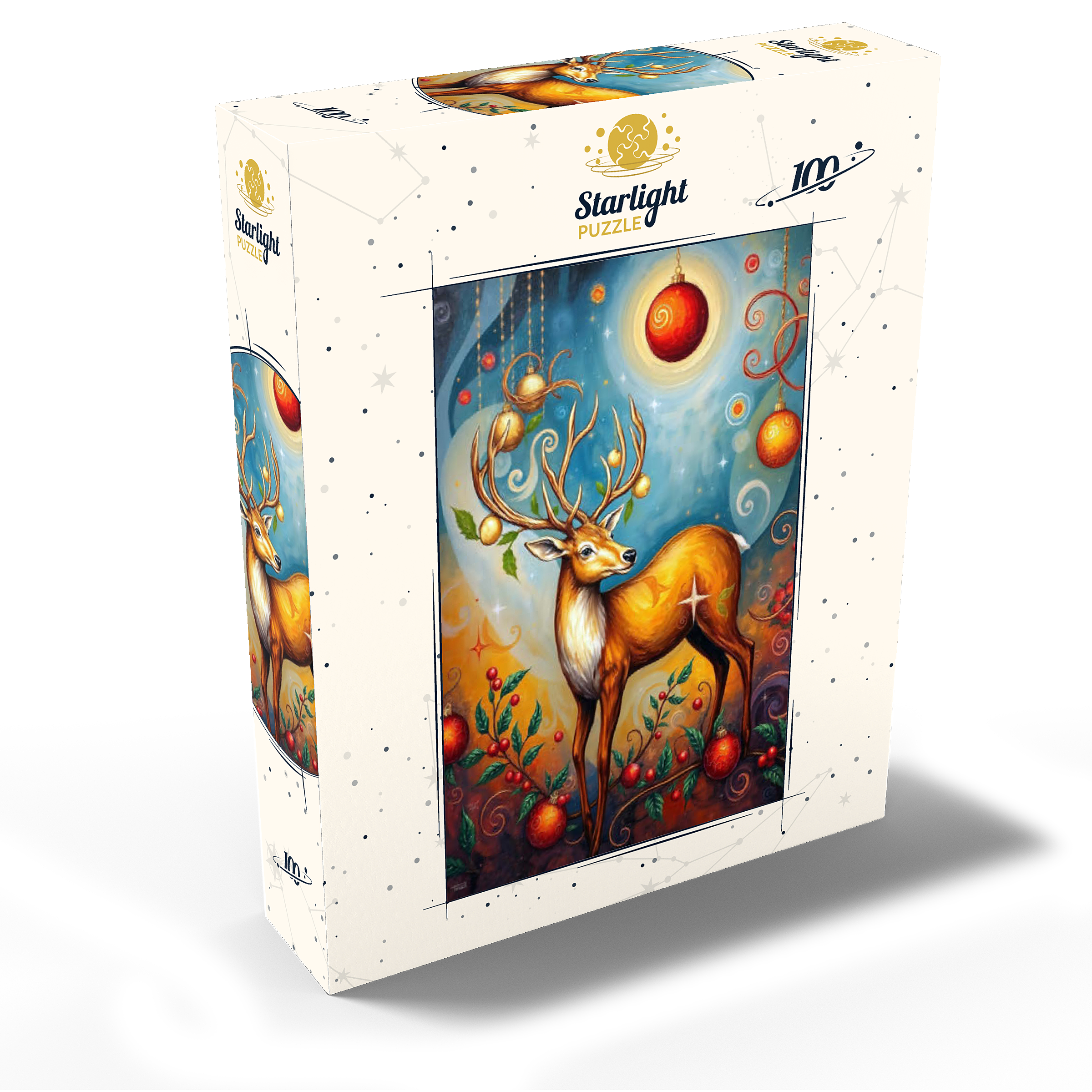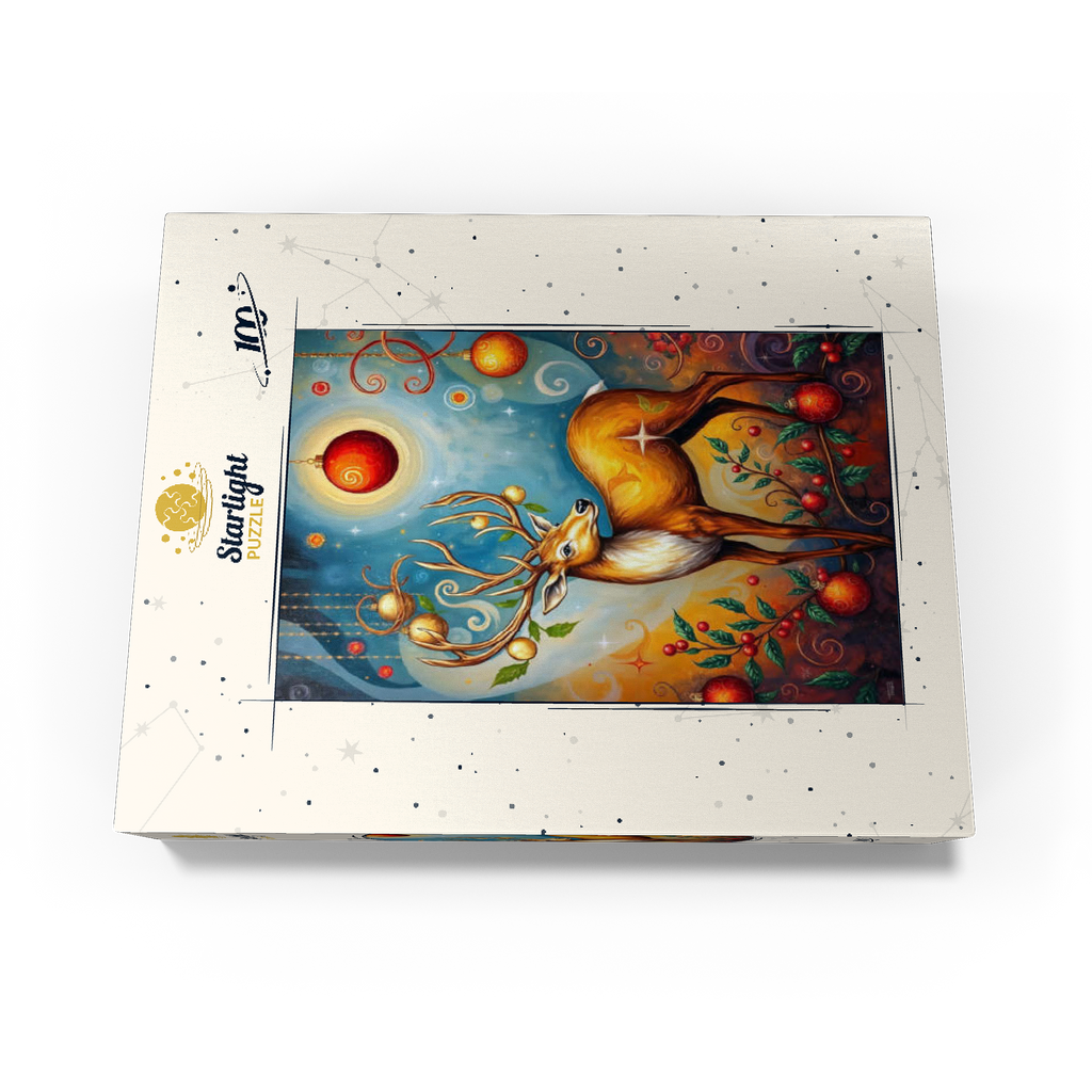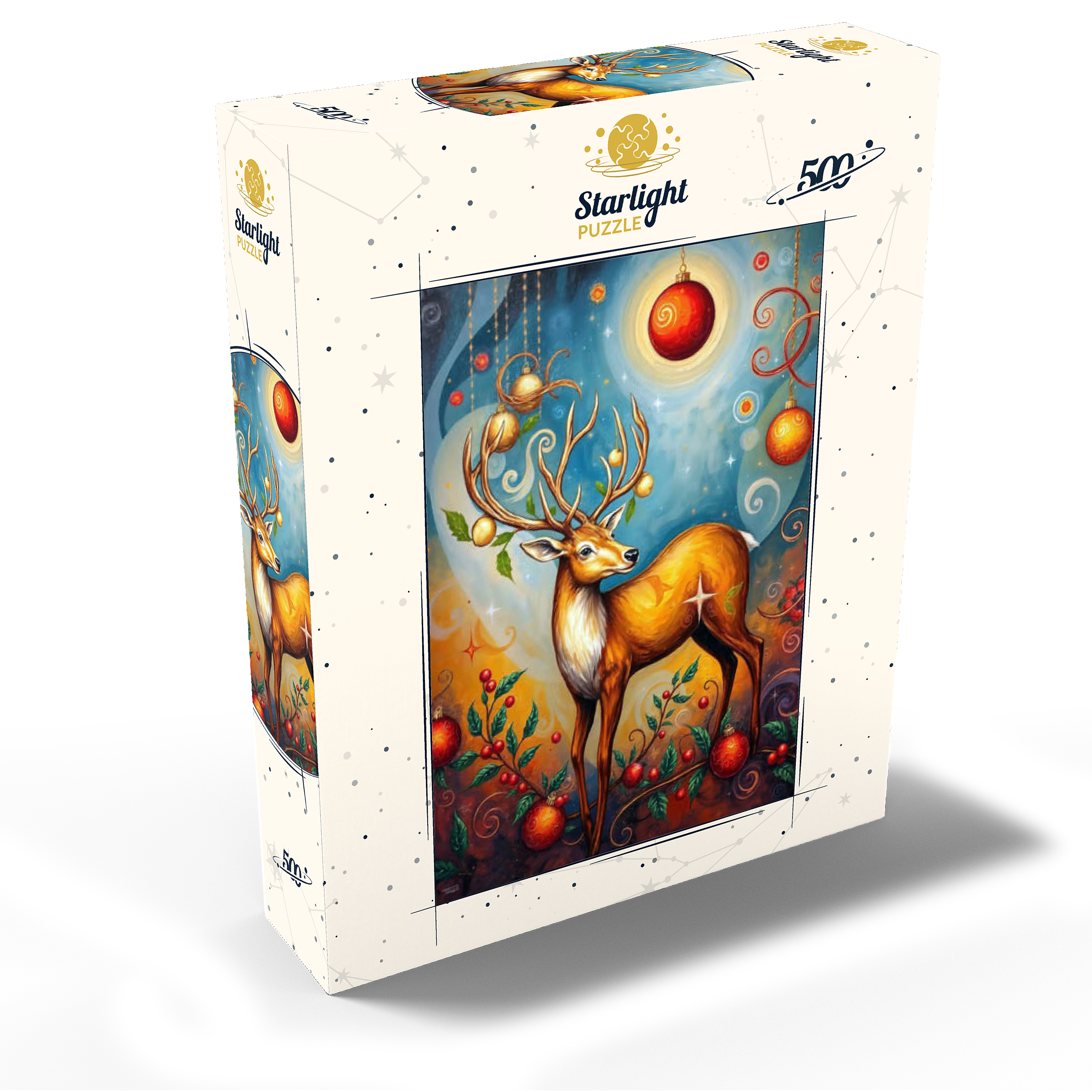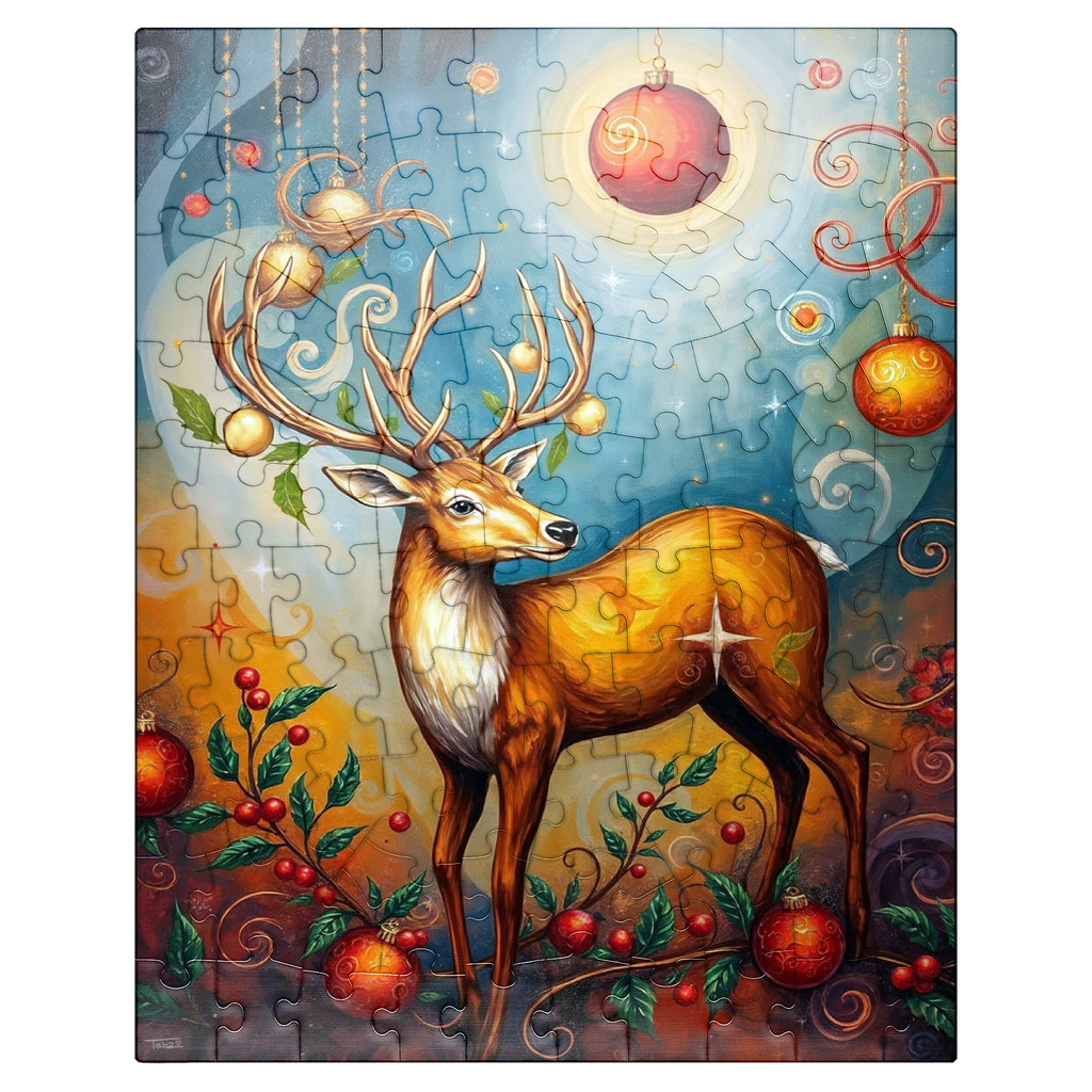 A whimsical digital artwork featuring a majestic deer adorned with golden antlers decorated with shimmering Christmas ornaments and holly leaves. The background is a magical swirl of deep blues, golds, and reds, with glowing stars and sparkling baubles suspended in the air. Bright red berries and festive greenery surround the deer, adding a classic holiday touch. The deer's gentle expression and elegant stance create a sense of warmth and wonder, making this artwork perfect for seasonal decor. Ideal for those who love Christmas themes, festive animal art, and enchanting holiday illustrations.
