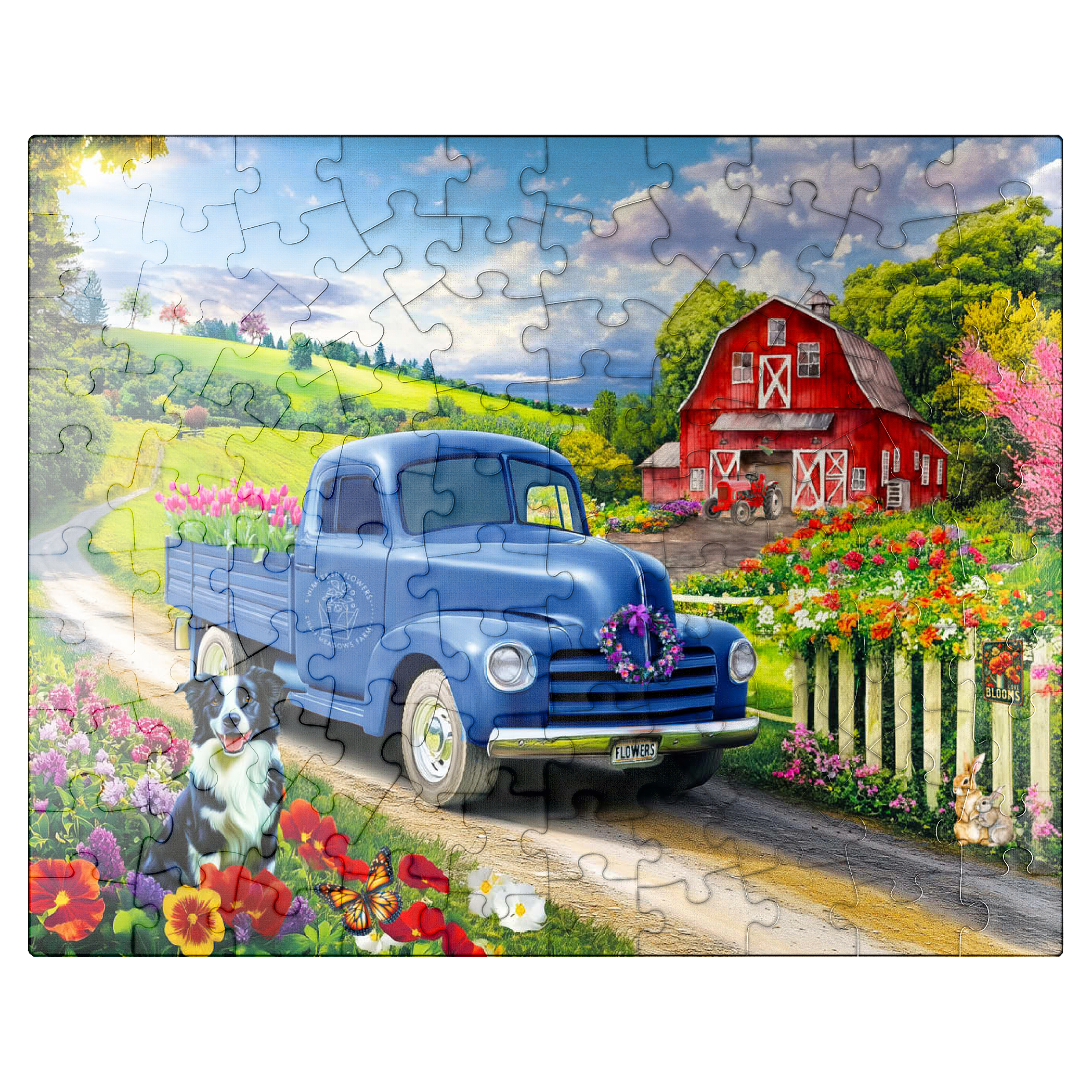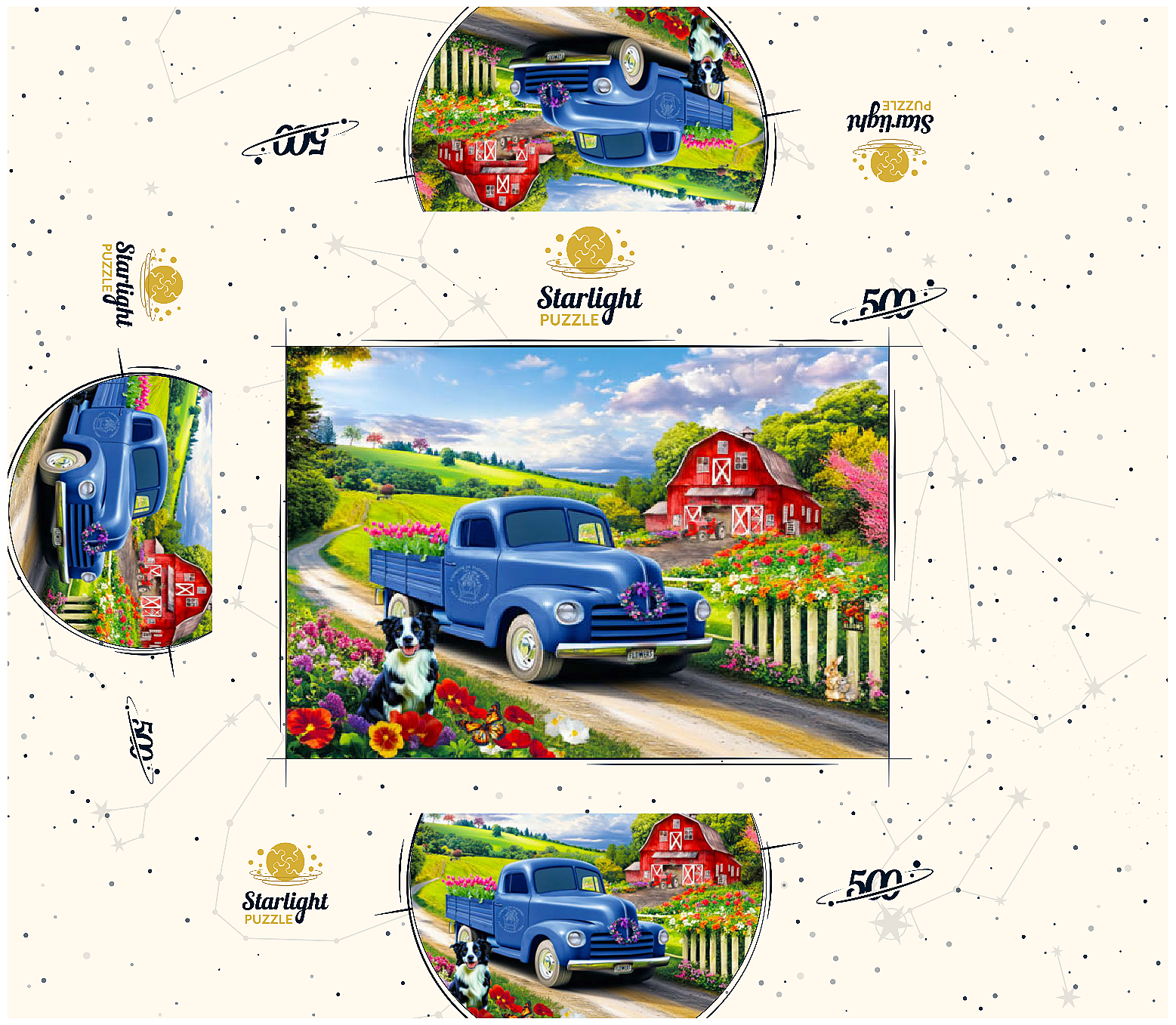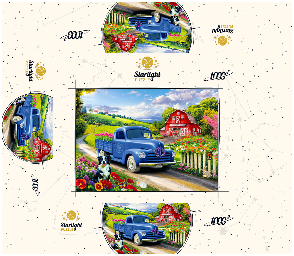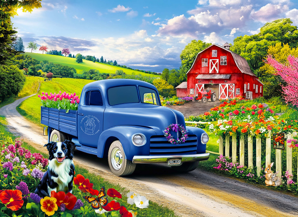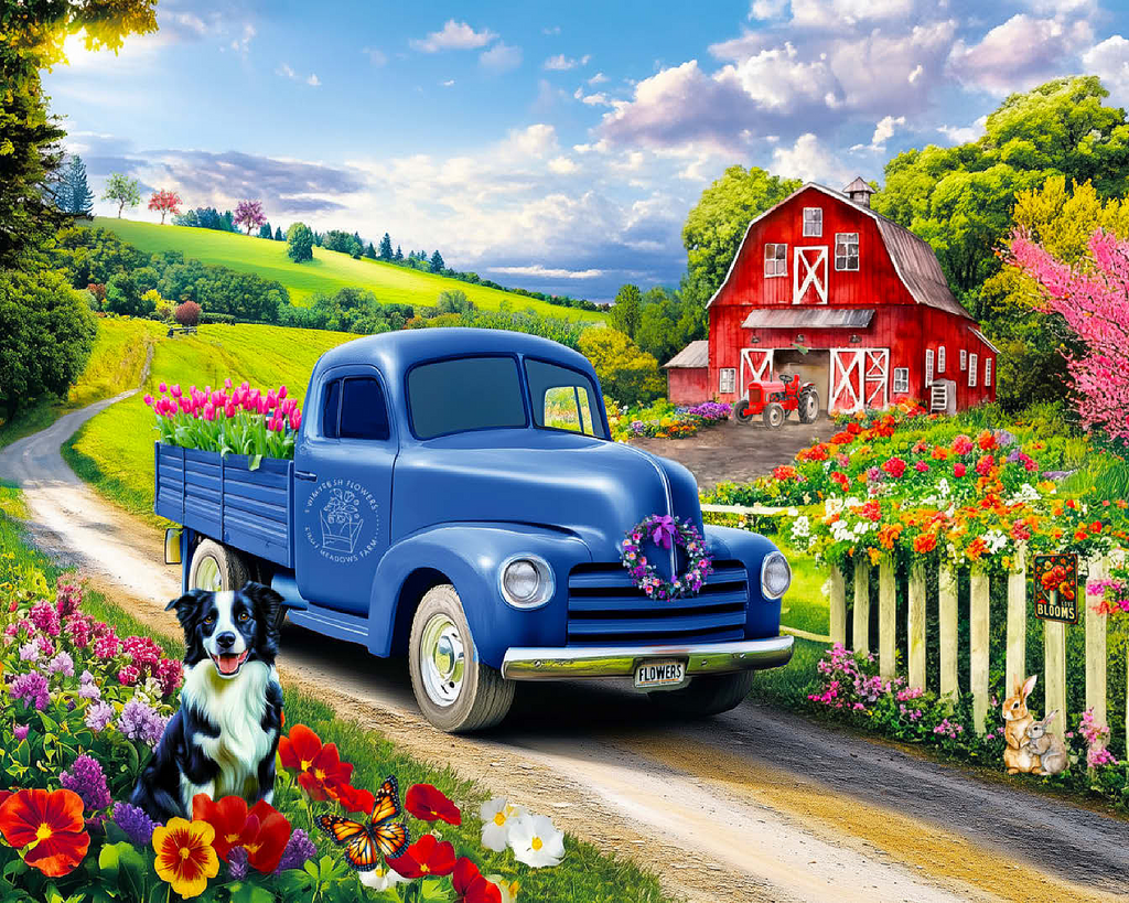 This cheerful country scene features a picturesque farm complete with a vibrant red barn, rolling green hills, and fields of colorful blooming flowers. A vintage blue truck loaded with fresh tulips sits on a dirt road, exuding rustic charm. A playful Border Collie, vibrant butterflies, and charming rabbits add life to the idyllic setting. The sunny sky and lush greenery create a warm and welcoming atmosphere, celebrating the beauty of rural life and nature's bounty.