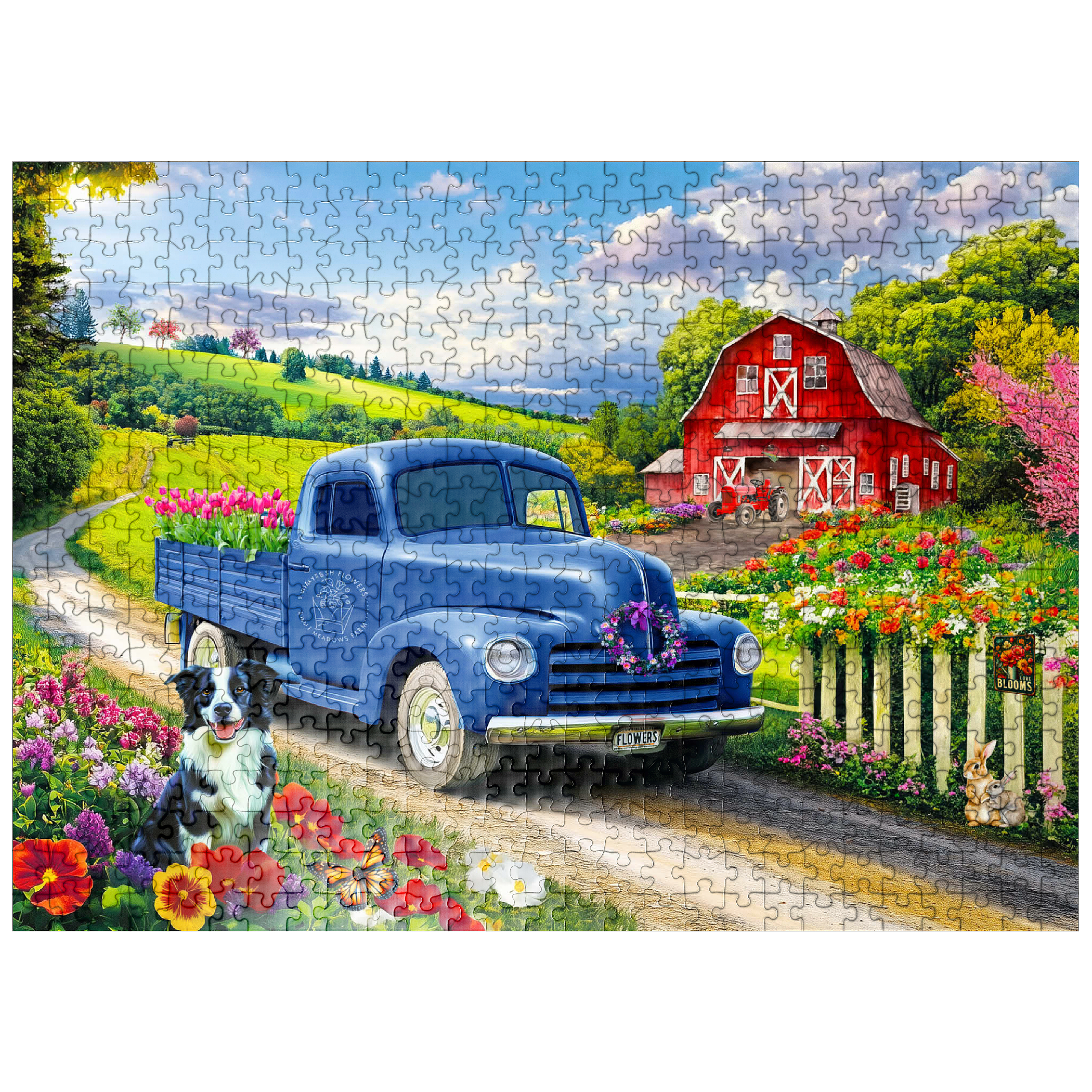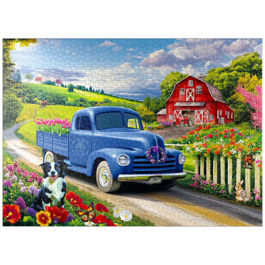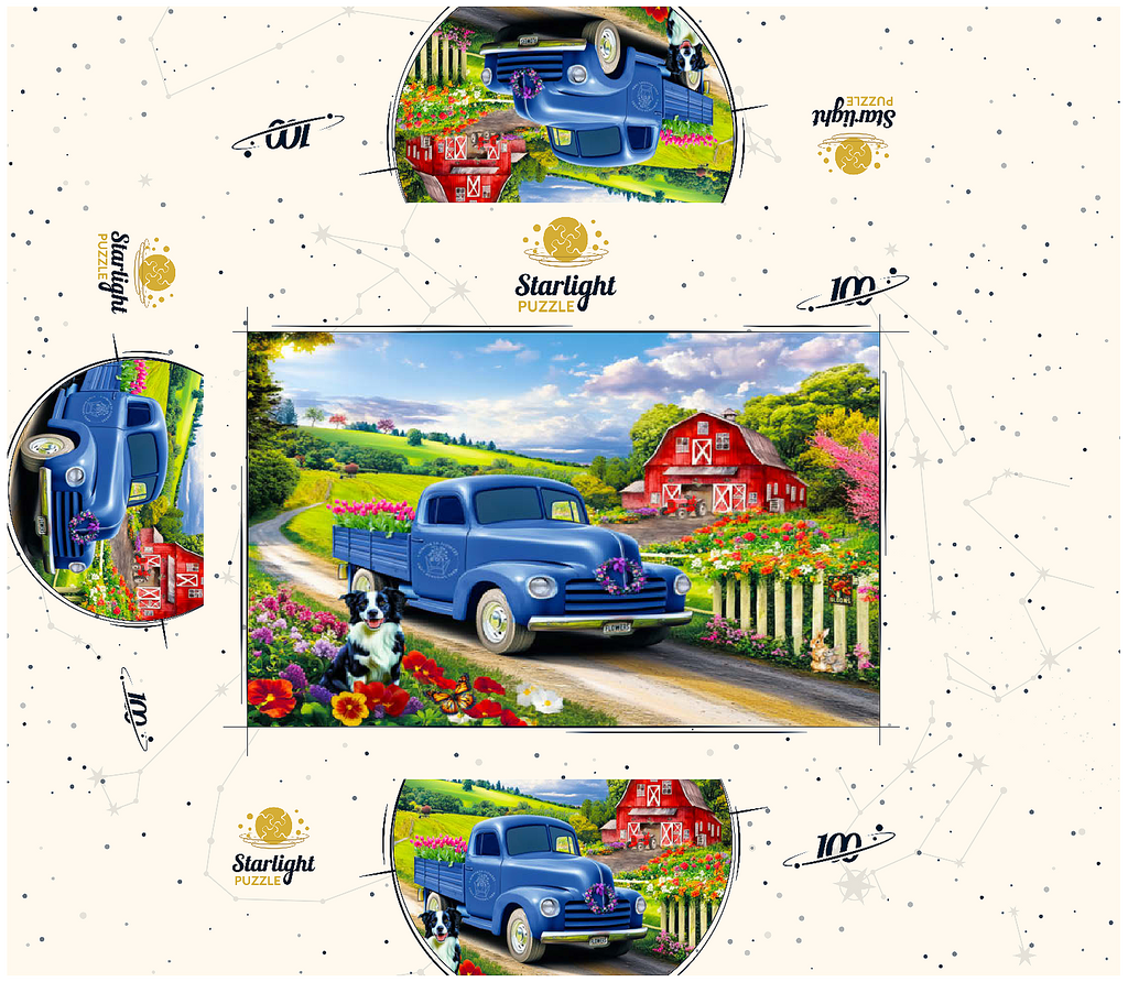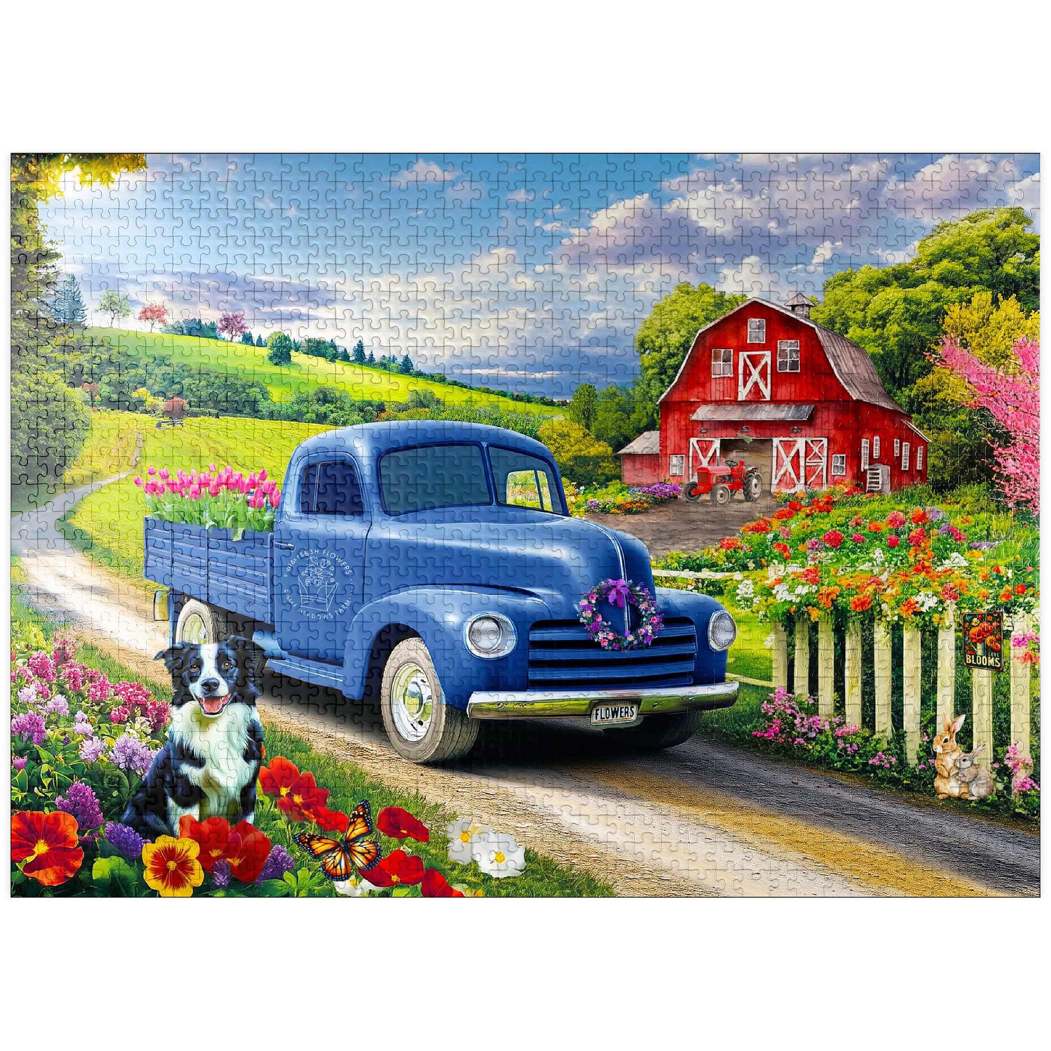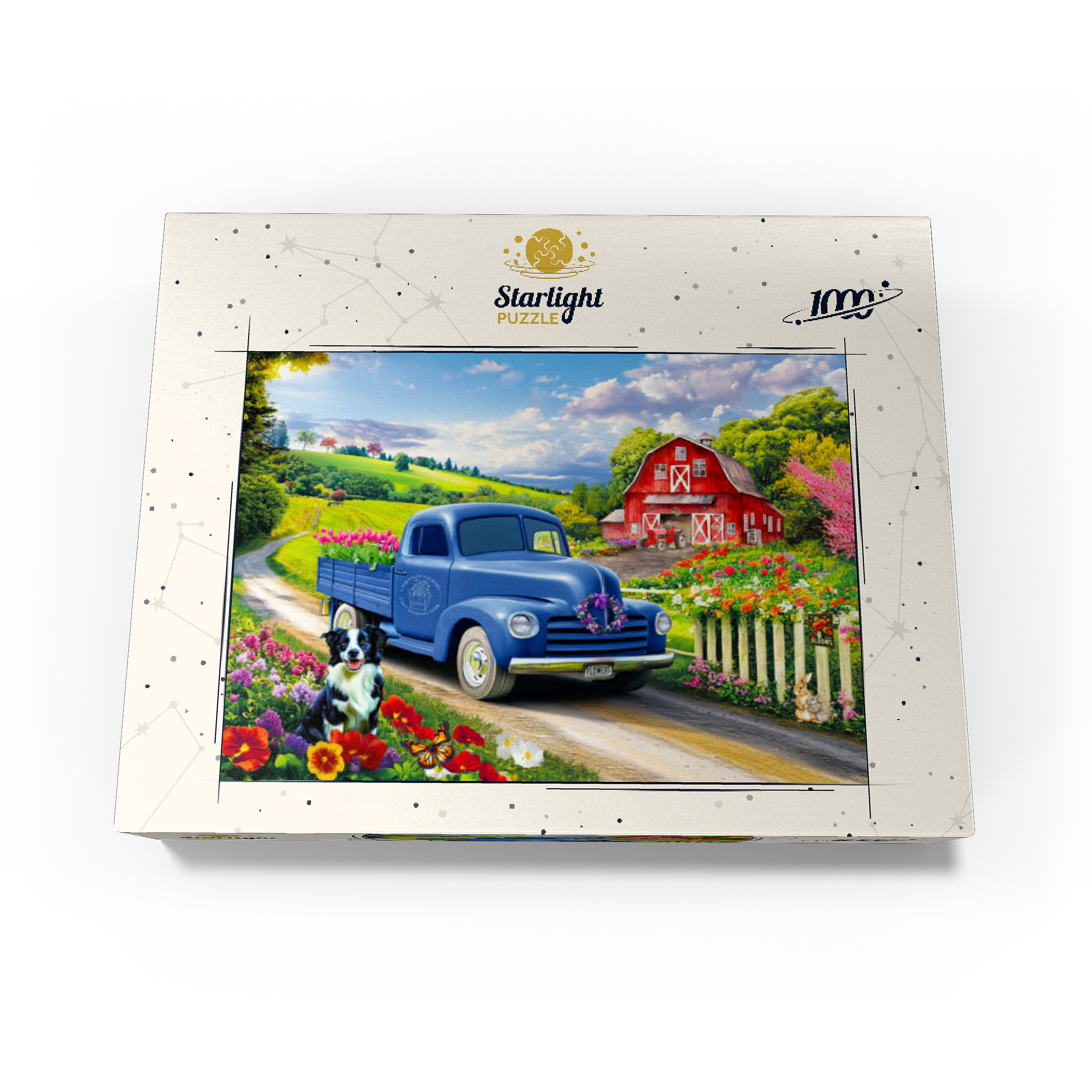 This cheerful country scene features a picturesque farm complete with a vibrant red barn, rolling green hills, and fields of colorful blooming flowers. A vintage blue truck loaded with fresh tulips sits on a dirt road, exuding rustic charm. A playful Border Collie, vibrant butterflies, and charming rabbits add life to the idyllic setting. The sunny sky and lush greenery create a warm and welcoming atmosphere, celebrating the beauty of rural life and nature's bounty.