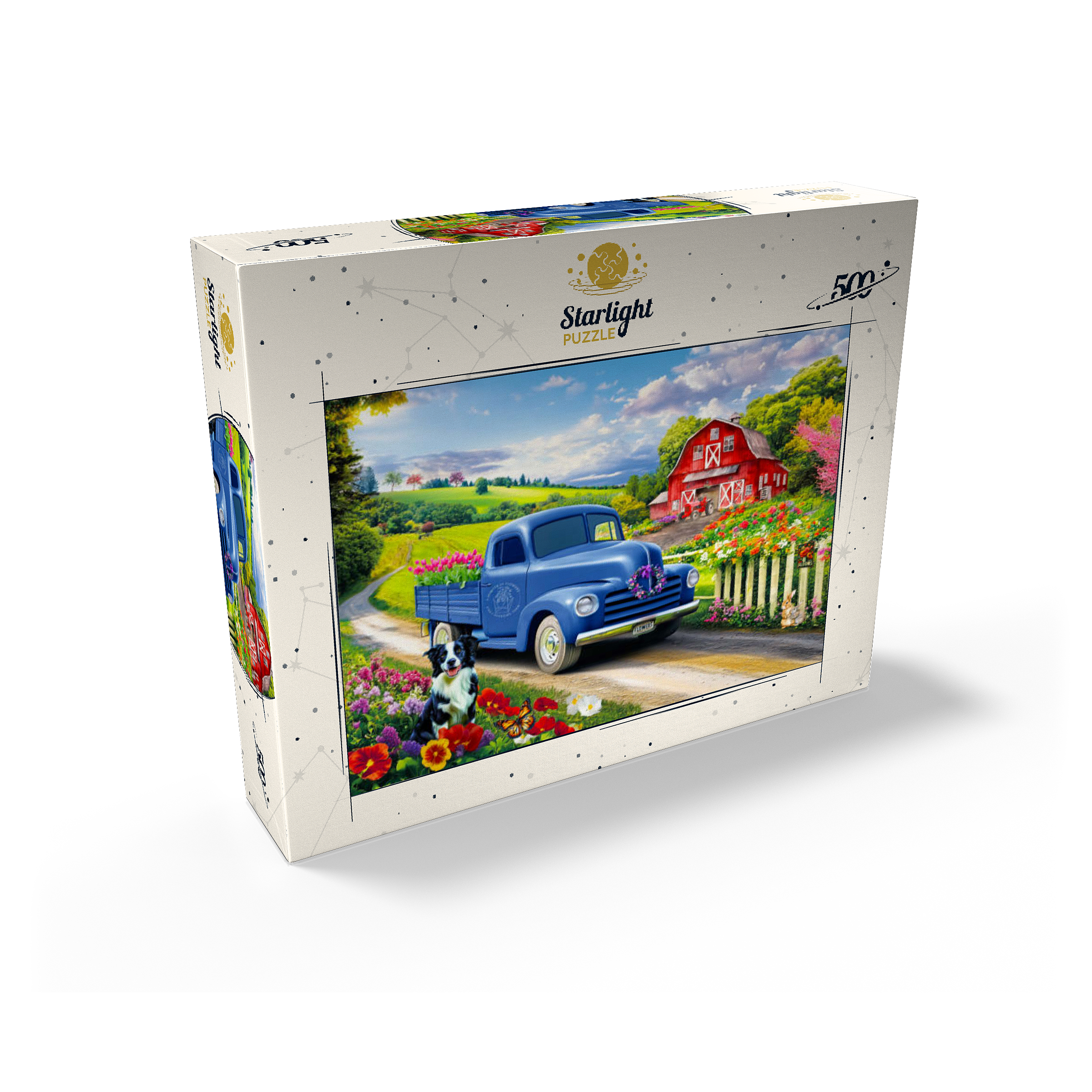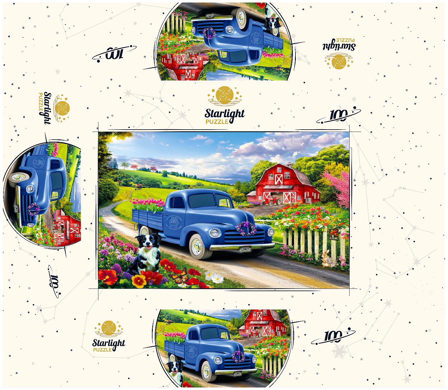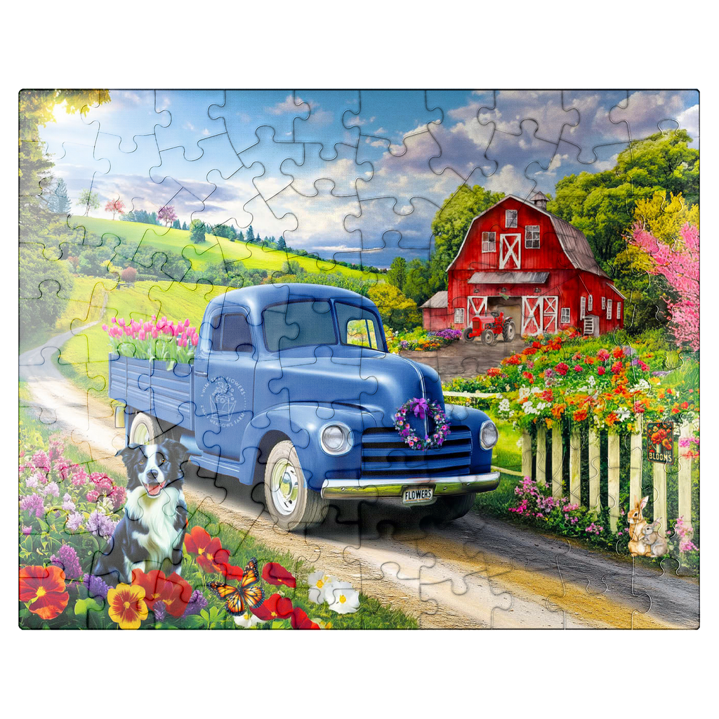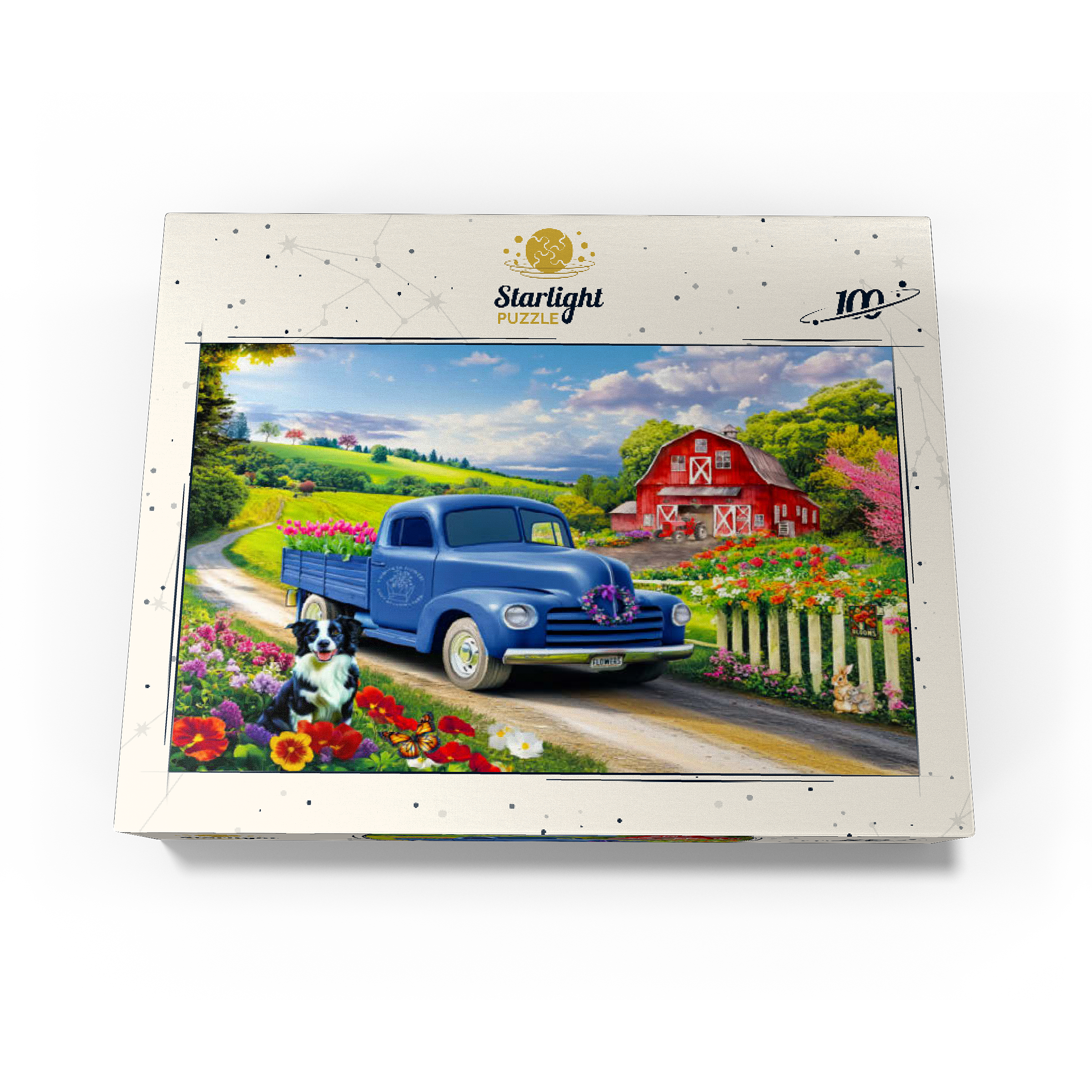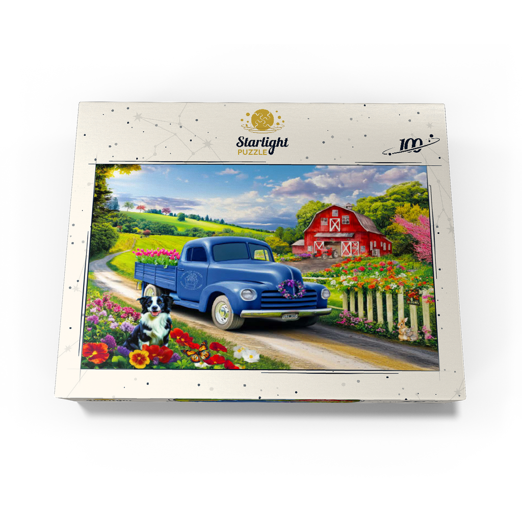 This cheerful country scene features a picturesque farm complete with a vibrant red barn, rolling green hills, and fields of colorful blooming flowers. A vintage blue truck loaded with fresh tulips sits on a dirt road, exuding rustic charm. A playful Border Collie, vibrant butterflies, and charming rabbits add life to the idyllic setting. The sunny sky and lush greenery create a warm and welcoming atmosphere, celebrating the beauty of rural life and nature's bounty.