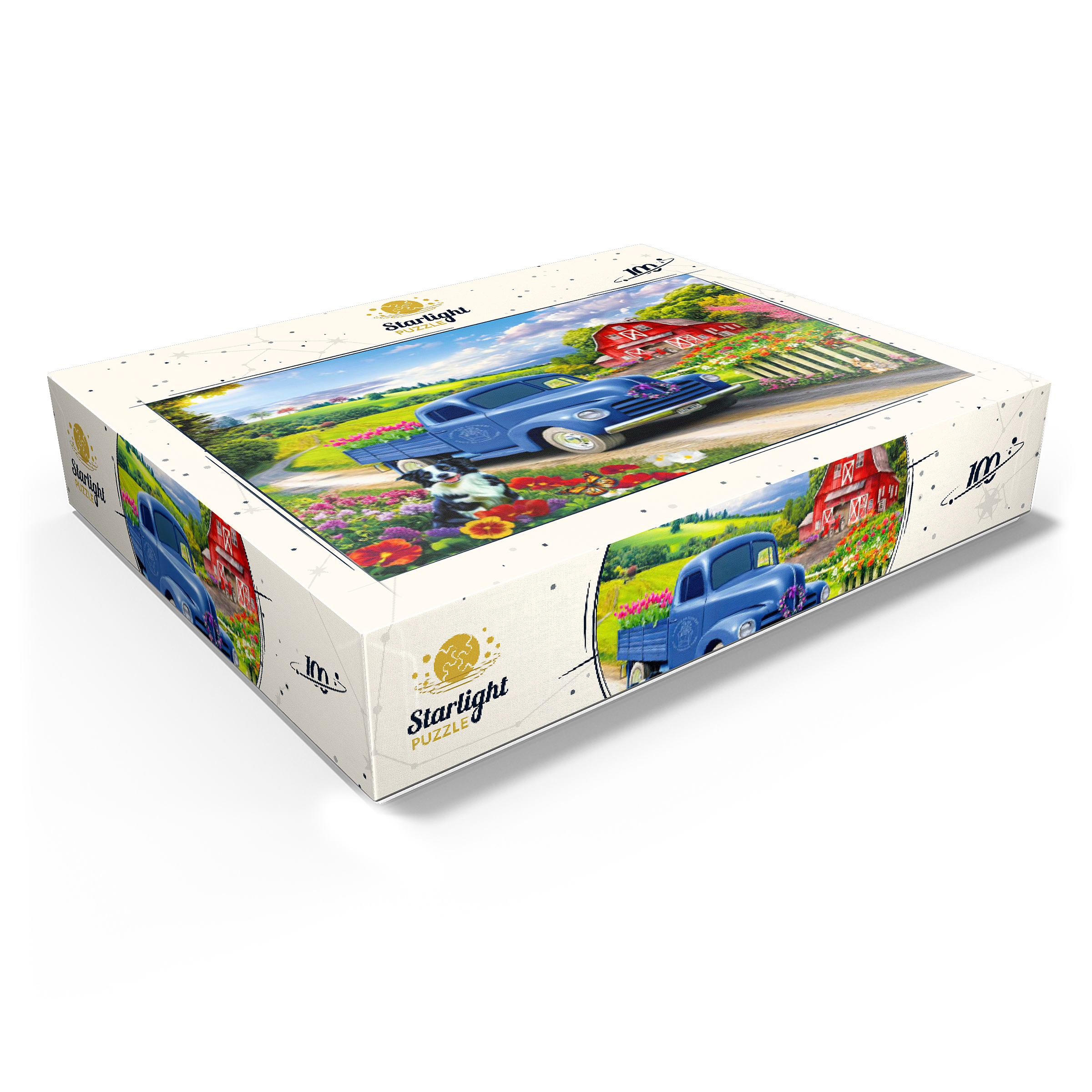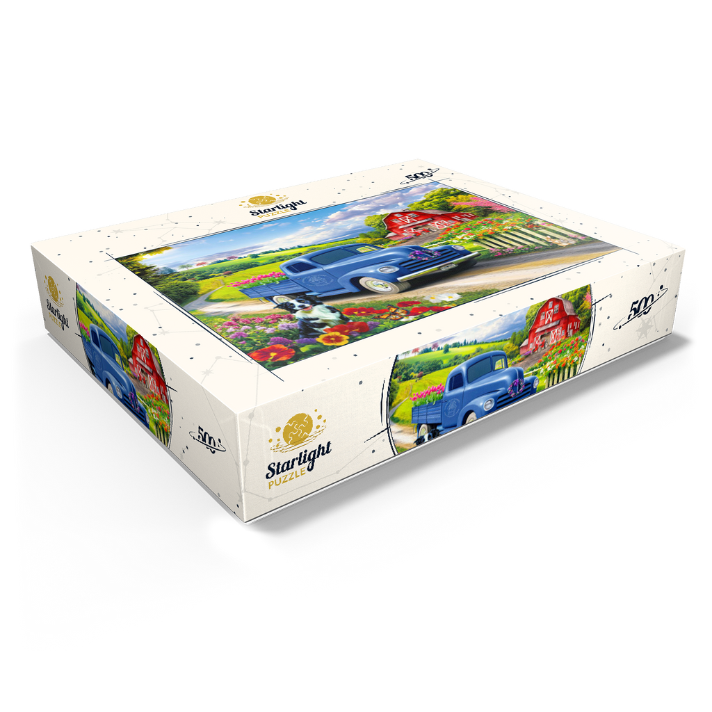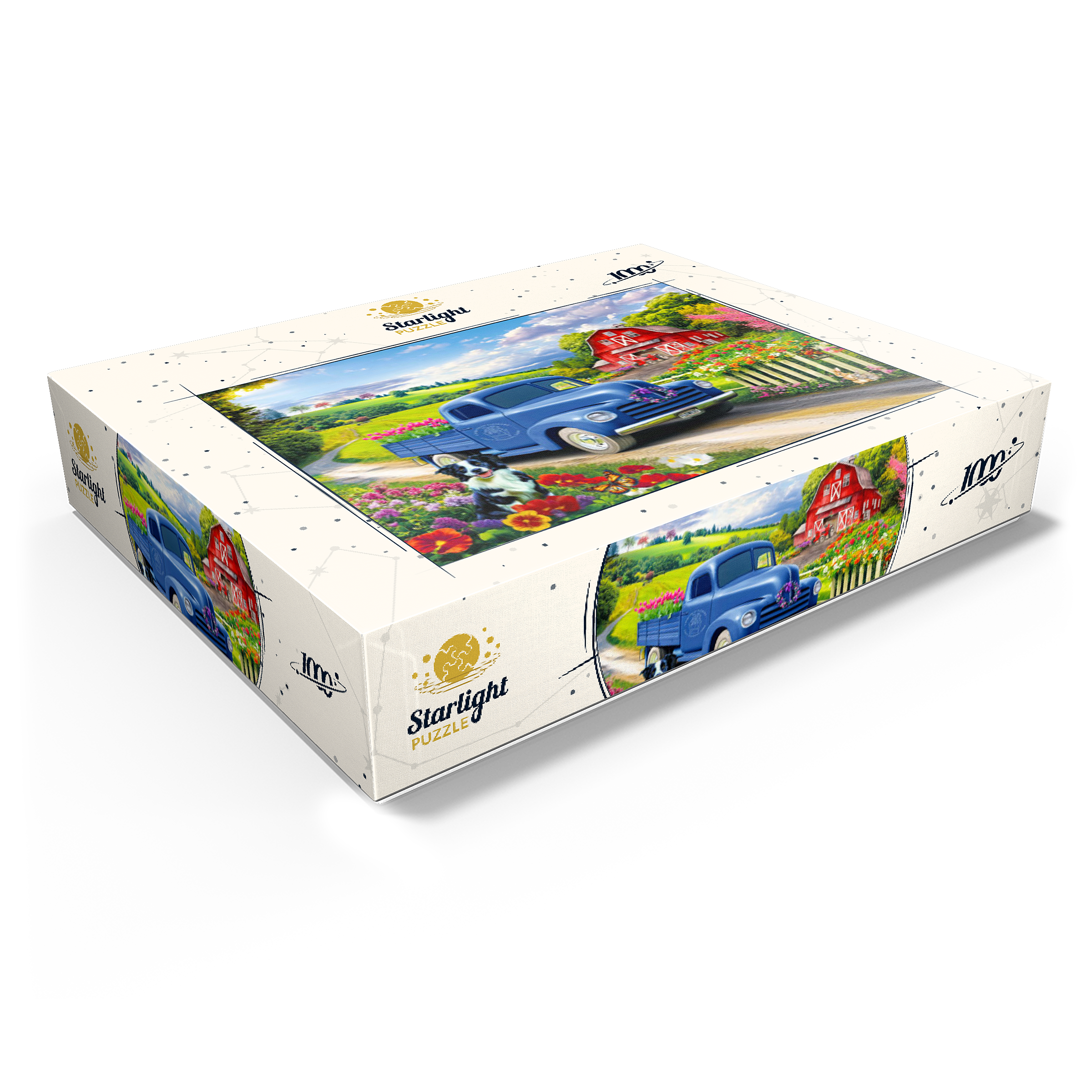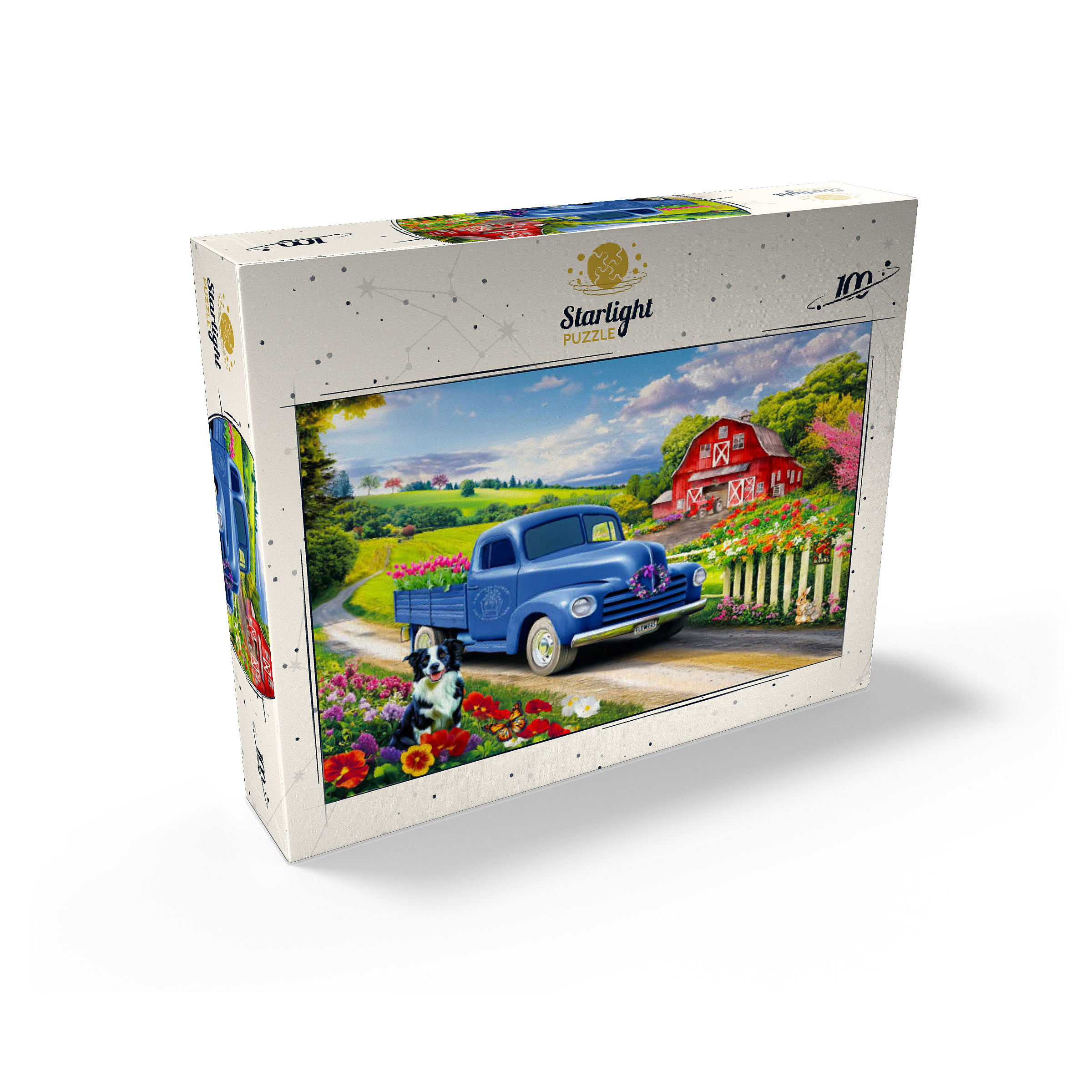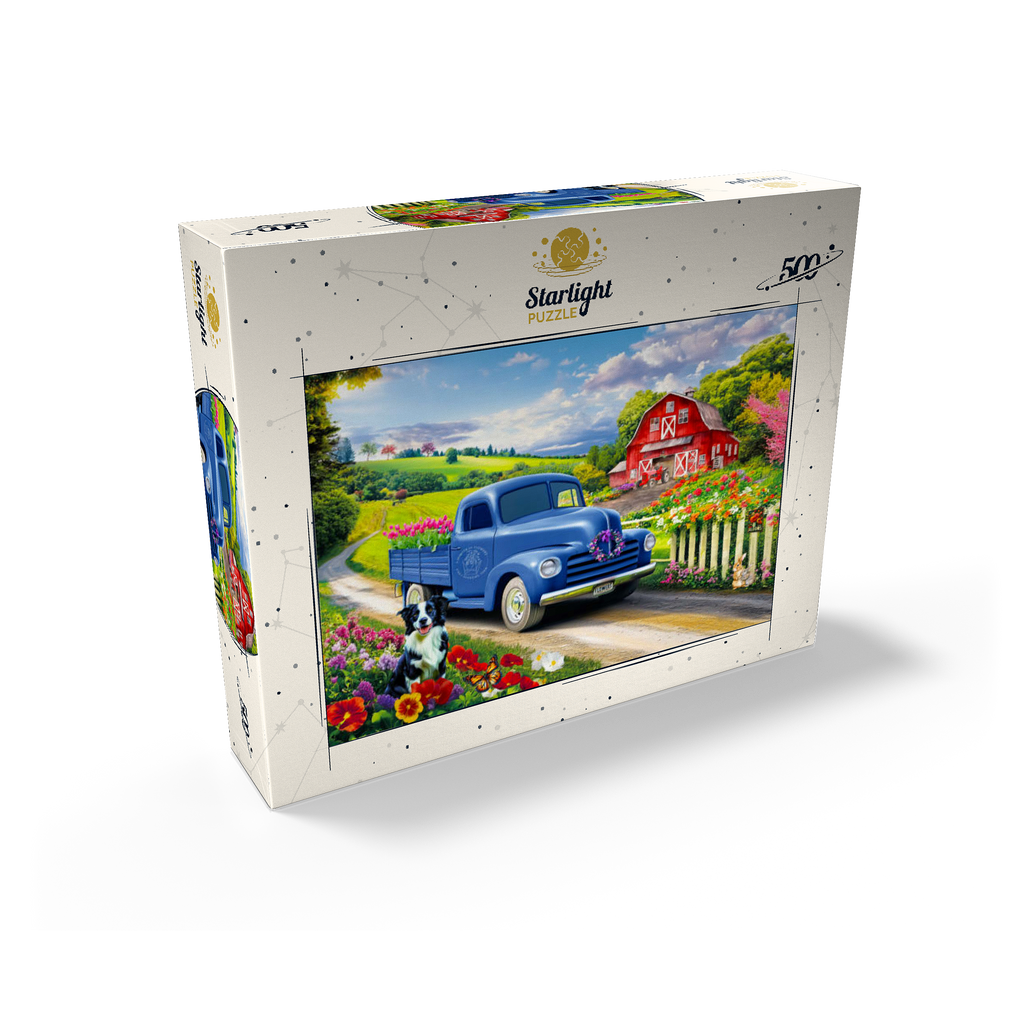 This cheerful country scene features a picturesque farm complete with a vibrant red barn, rolling green hills, and fields of colorful blooming flowers. A vintage blue truck loaded with fresh tulips sits on a dirt road, exuding rustic charm. A playful Border Collie, vibrant butterflies, and charming rabbits add life to the idyllic setting. The sunny sky and lush greenery create a warm and welcoming atmosphere, celebrating the beauty of rural life and nature's bounty.