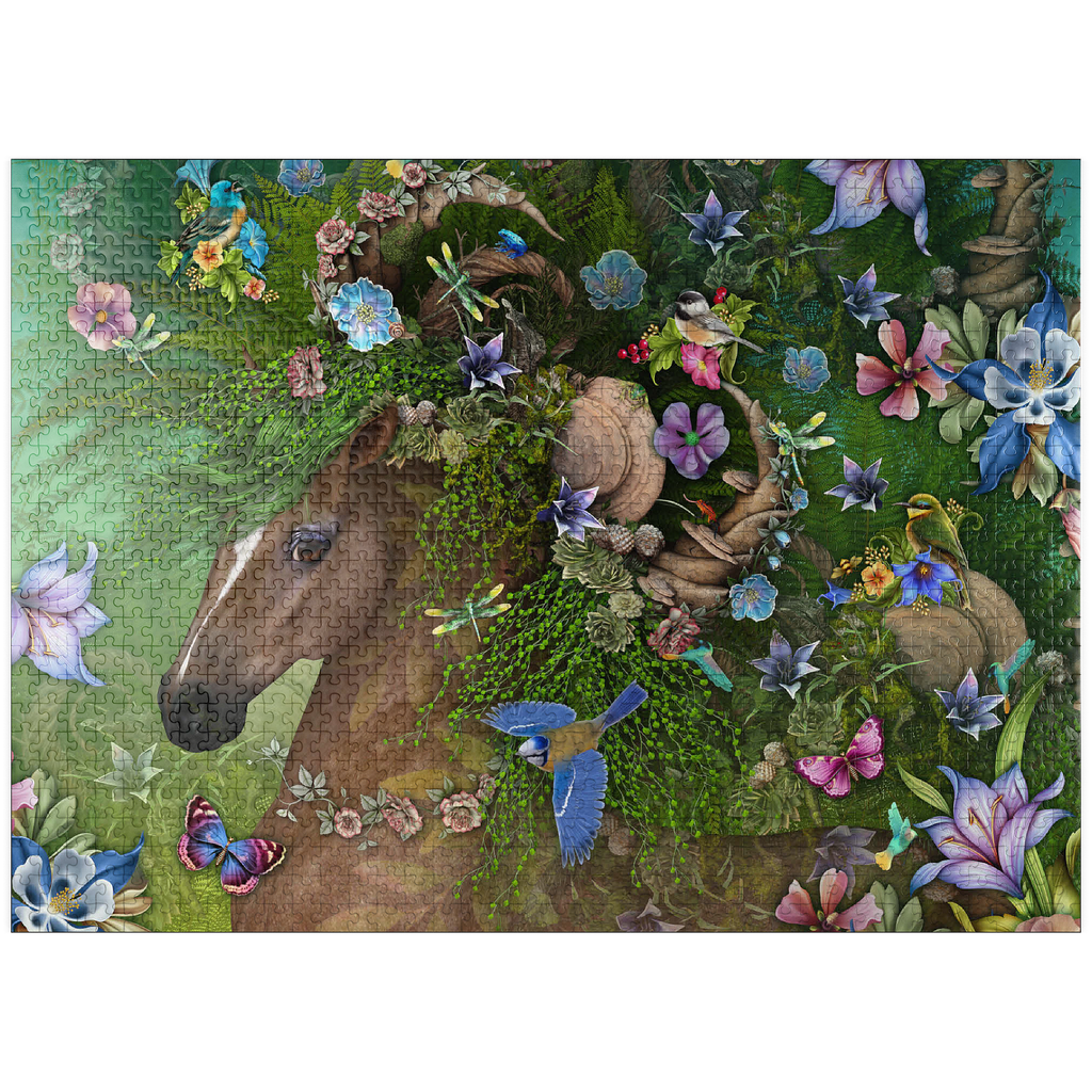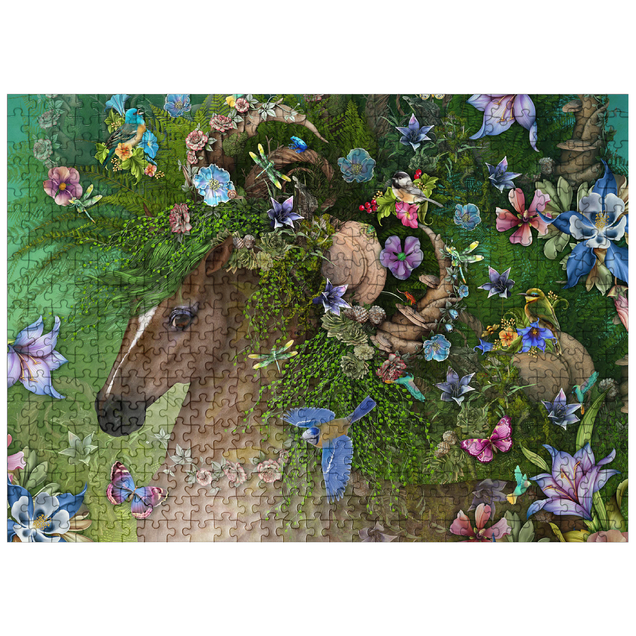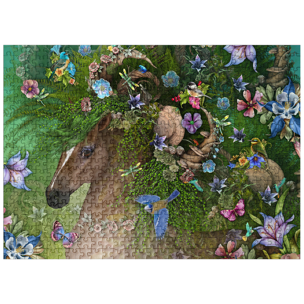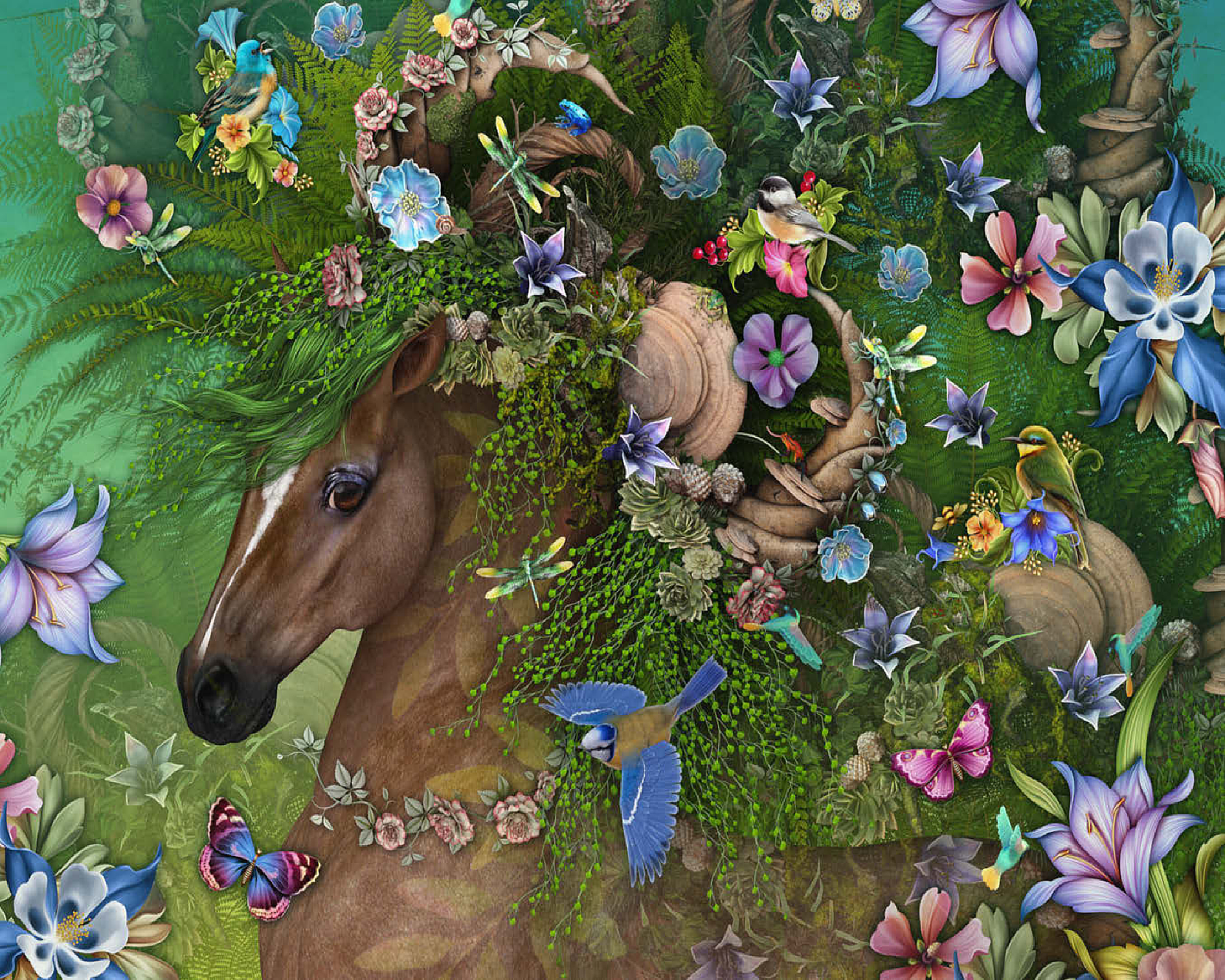 Laurie Prindle's -Forest Spirit: Summer- features a shy equine forest spirit, adorned with an incredibly lush and detailed -mane- composed of intertwined branches, vibrant green foliage, blooming flowers in shades of blue, purple, and pink, and various forest elements like moss and berries. Tiny creatures such as bluebirds, chickadees, hummingbirds, dragonflies, and butterflies are nestled within its natural headdress. The background is a rich tapestry of greenery, large blossoms, and hidden forest details, celebrating nature, wildlife, and the essence of summer woodlands.