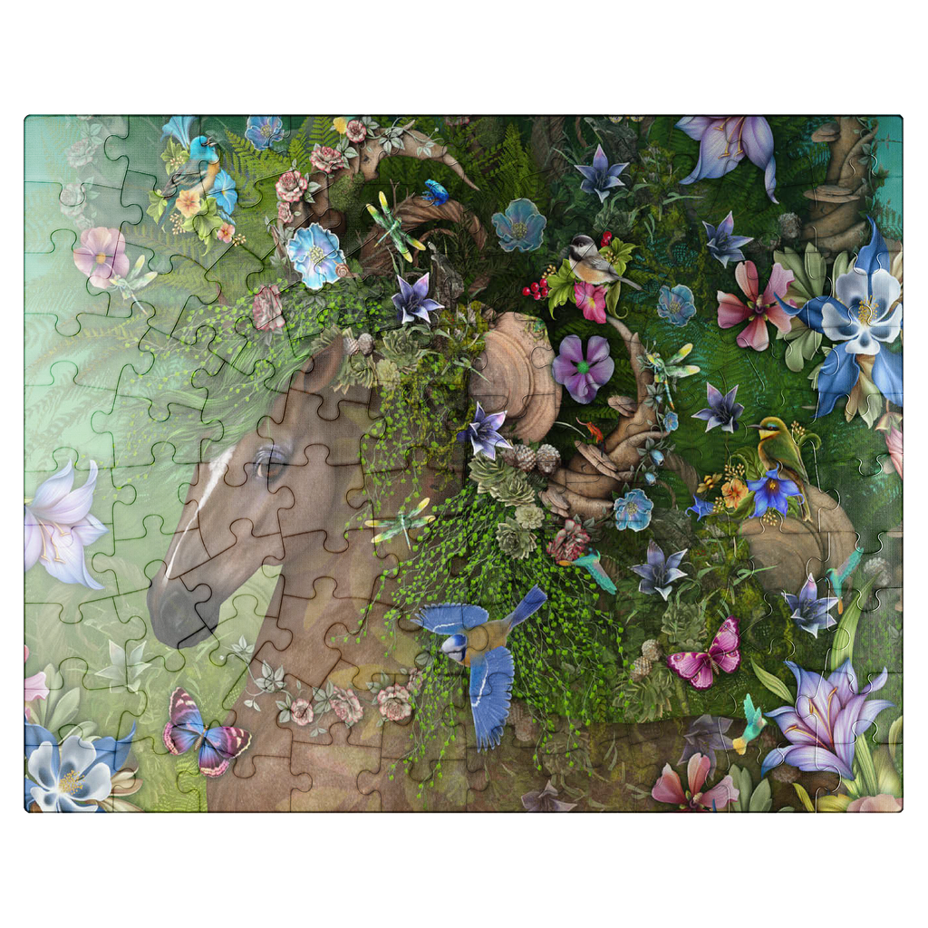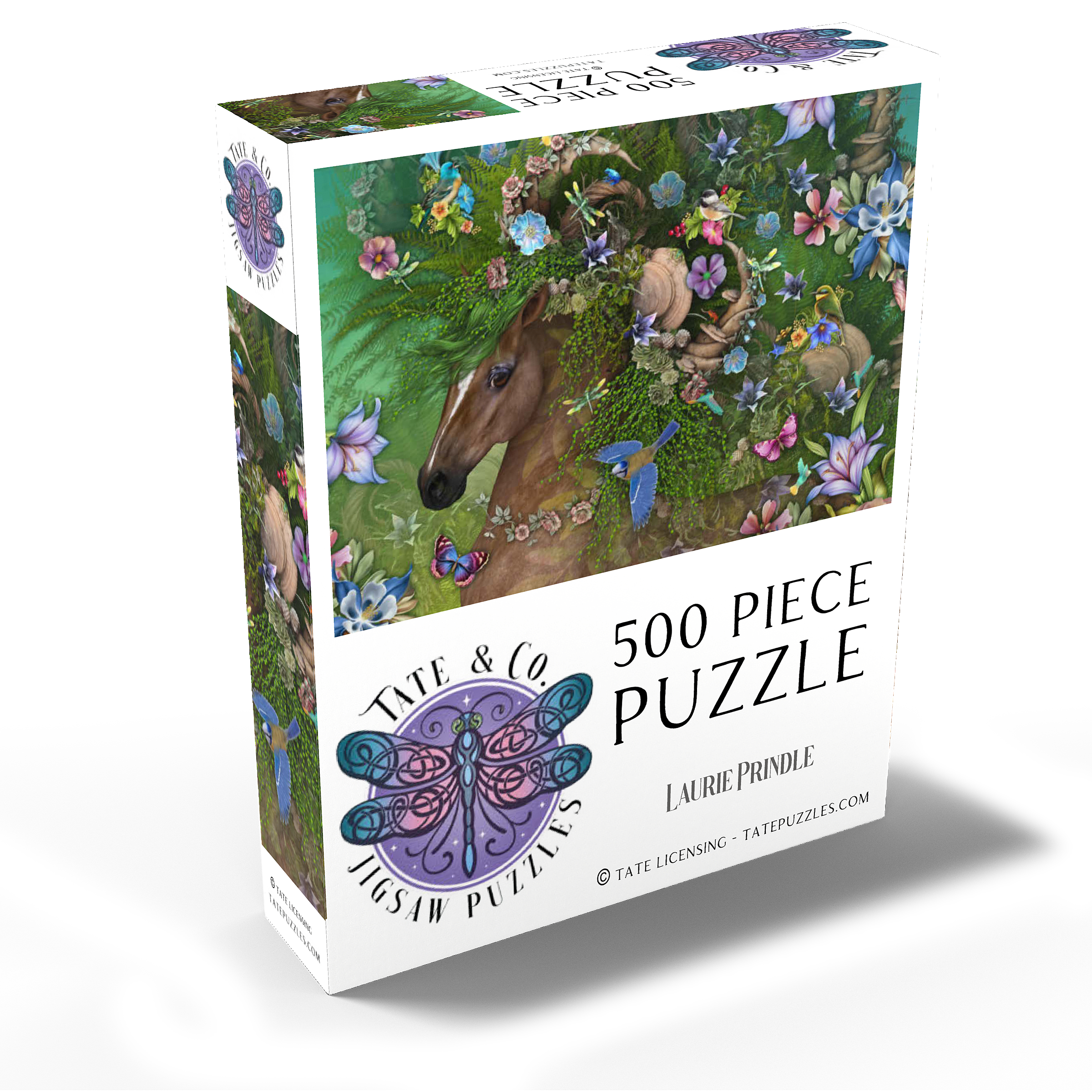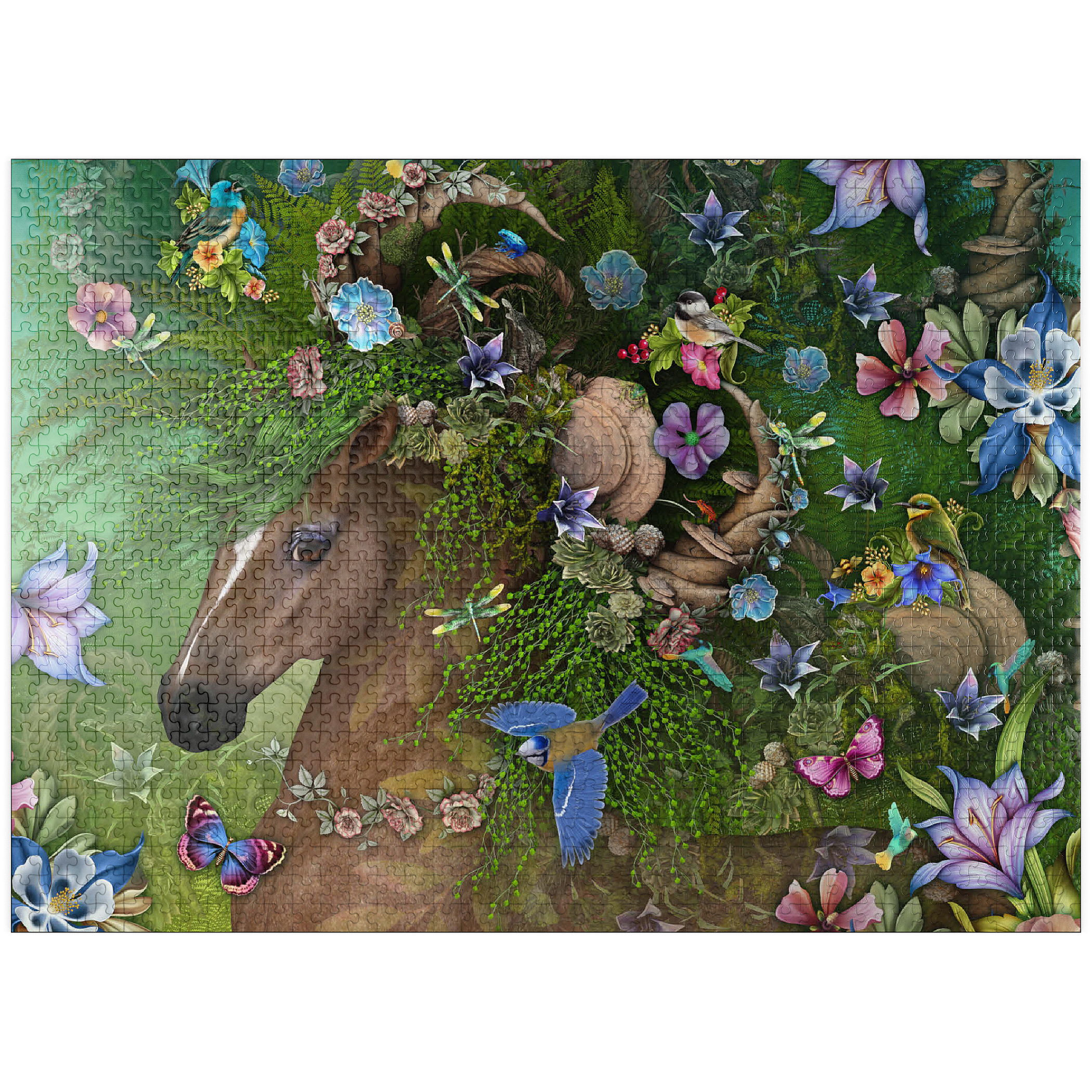Laurie Prindle's -Forest Spirit: Summer- features a shy equine forest spirit, adorned with an incredibly lush and detailed -mane- composed of intertwined branches, vibrant green foliage, blooming flowers in shades of blue, purple, and pink, and various forest elements like moss and berries. Tiny creatures such as bluebirds, chickadees, hummingbirds, dragonflies, and butterflies are nestled within its natural headdress. The background is a rich tapestry of greenery, large blossoms, and hidden forest details, celebrating nature, wildlife, and the essence of summer woodlands.