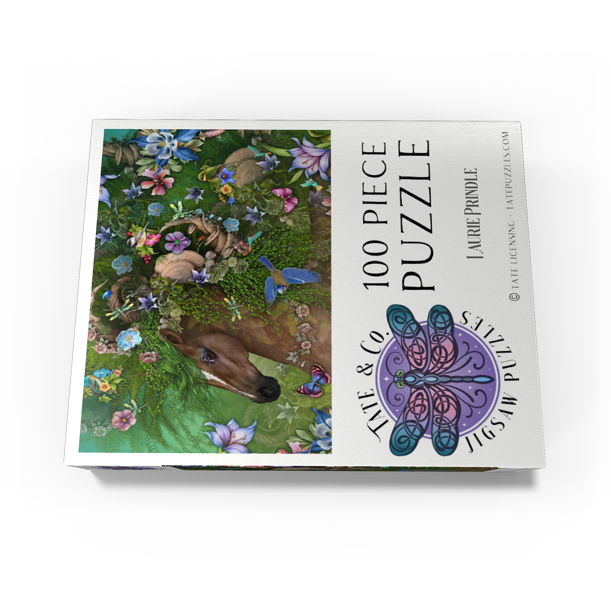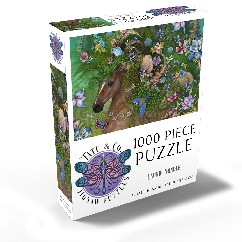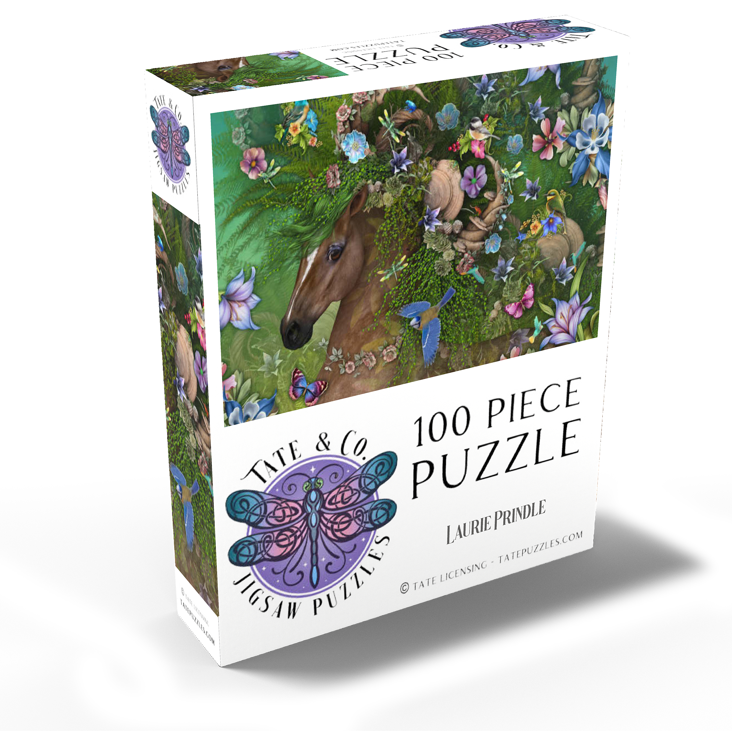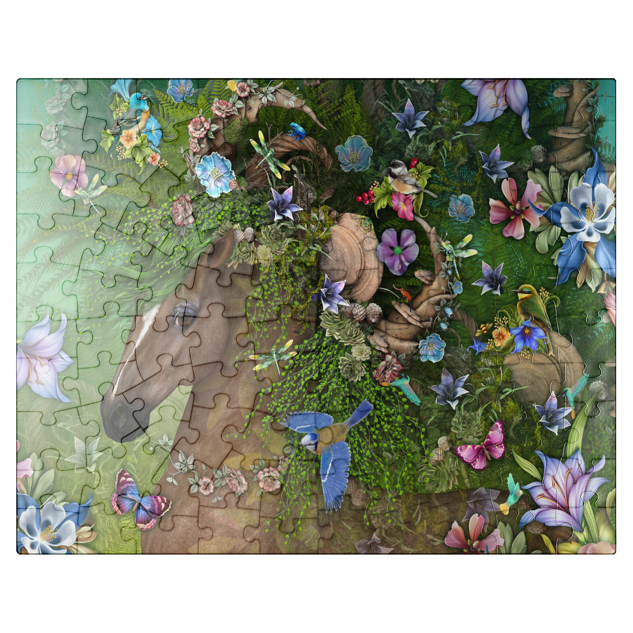 Laurie Prindle's -Forest Spirit: Summer- features a shy equine forest spirit, adorned with an incredibly lush and detailed -mane- composed of intertwined branches, vibrant green foliage, blooming flowers in shades of blue, purple, and pink, and various forest elements like moss and berries. Tiny creatures such as bluebirds, chickadees, hummingbirds, dragonflies, and butterflies are nestled within its natural headdress. The background is a rich tapestry of greenery, large blossoms, and hidden forest details, celebrating nature, wildlife, and the essence of summer woodlands.
