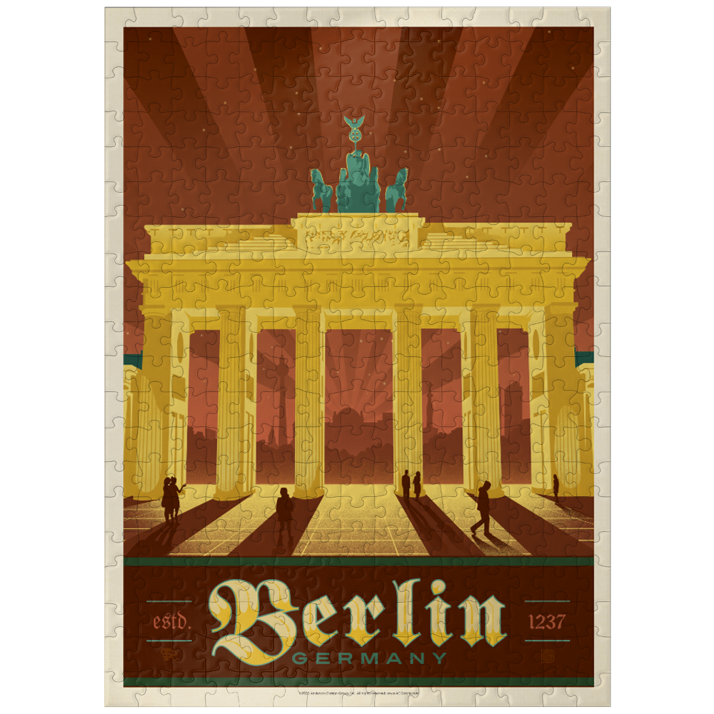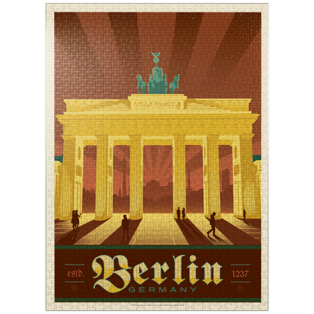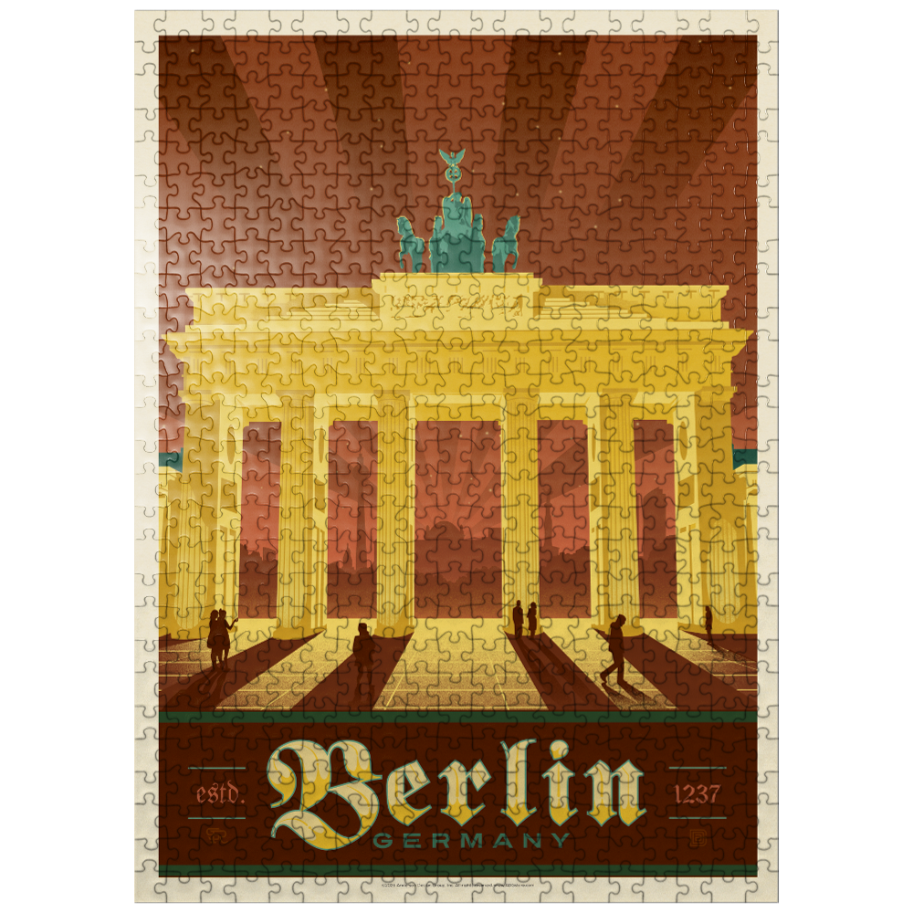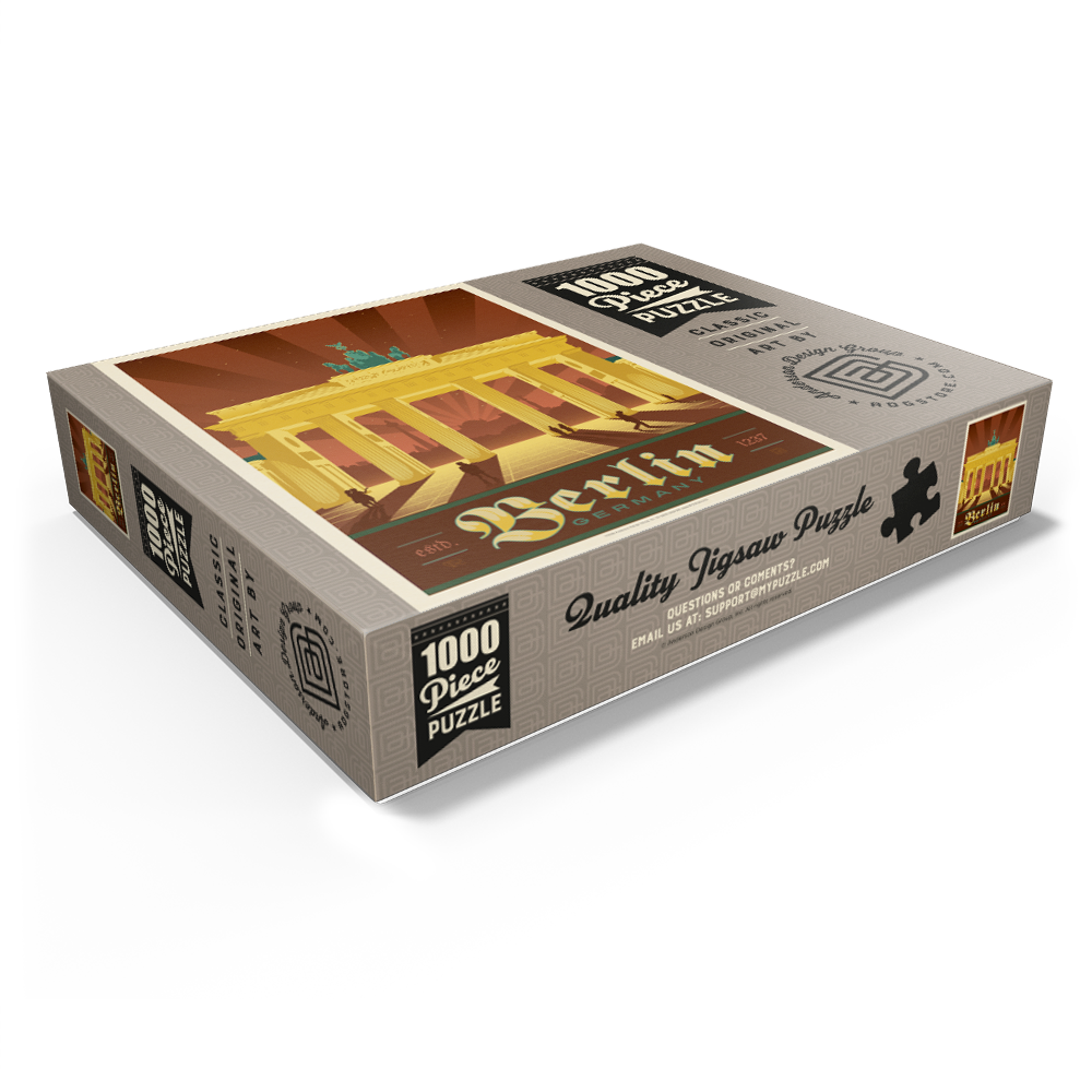 Berlin Germany Brandenburg Gate stands out in a bold retro travel style, highlighting the iconic neoclassical columns and the Quadriga statue above the landmark in central Berlin. Warm golden colors and dramatic sunburst rays create a classic vacation poster look, while small visitor silhouettes add energy, scale, and a lively city tourism feel. Subtle hints of the Berlin skyline reinforce the destination and make it instantly recognizable for Germany travel searches. The Brandenburg Gate is one of Berlin's most famous historic symbols, linked to Prussian history and later German reunification, making this scene ideal for Berlin sightseeing, architecture, and European city breaks.