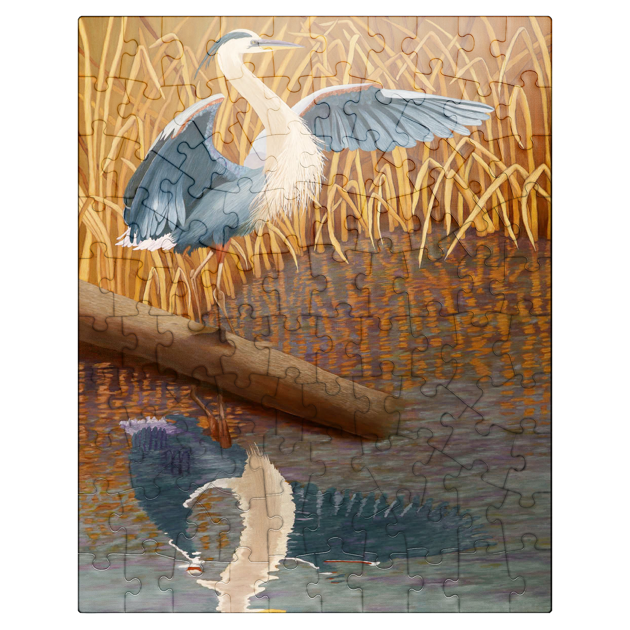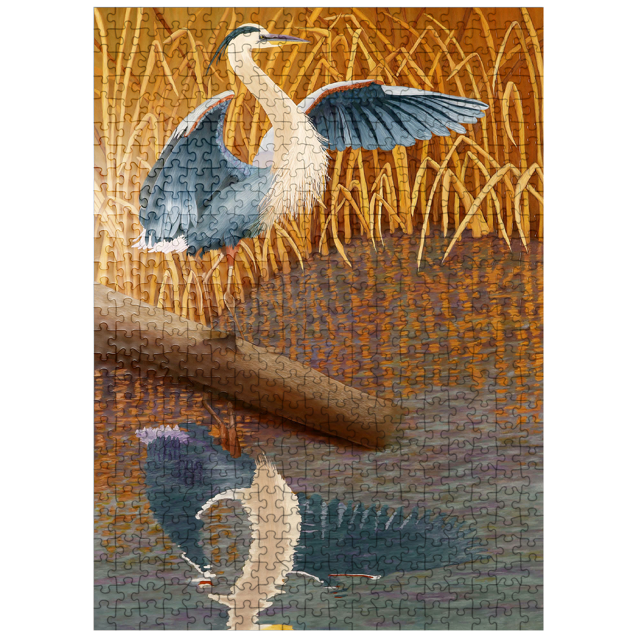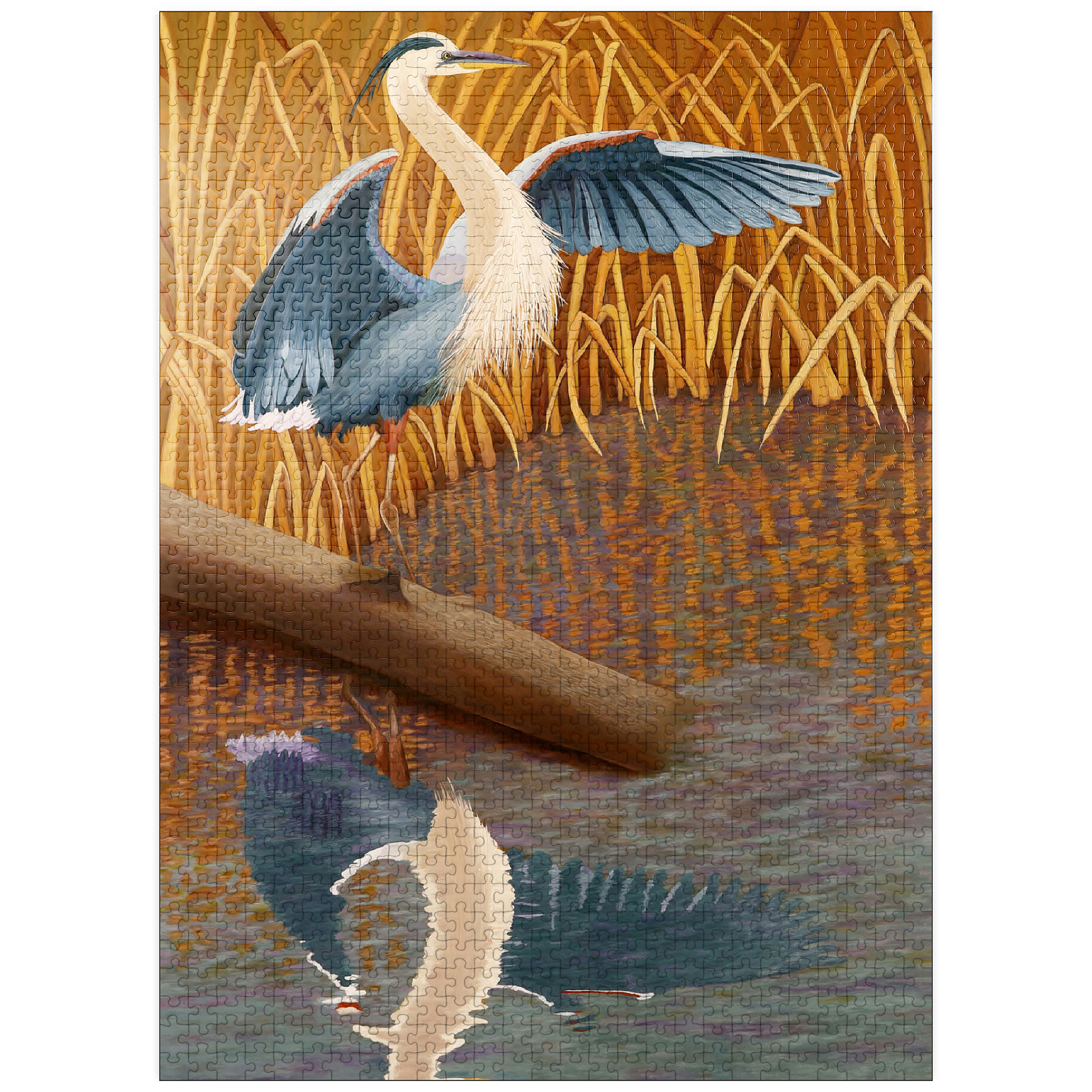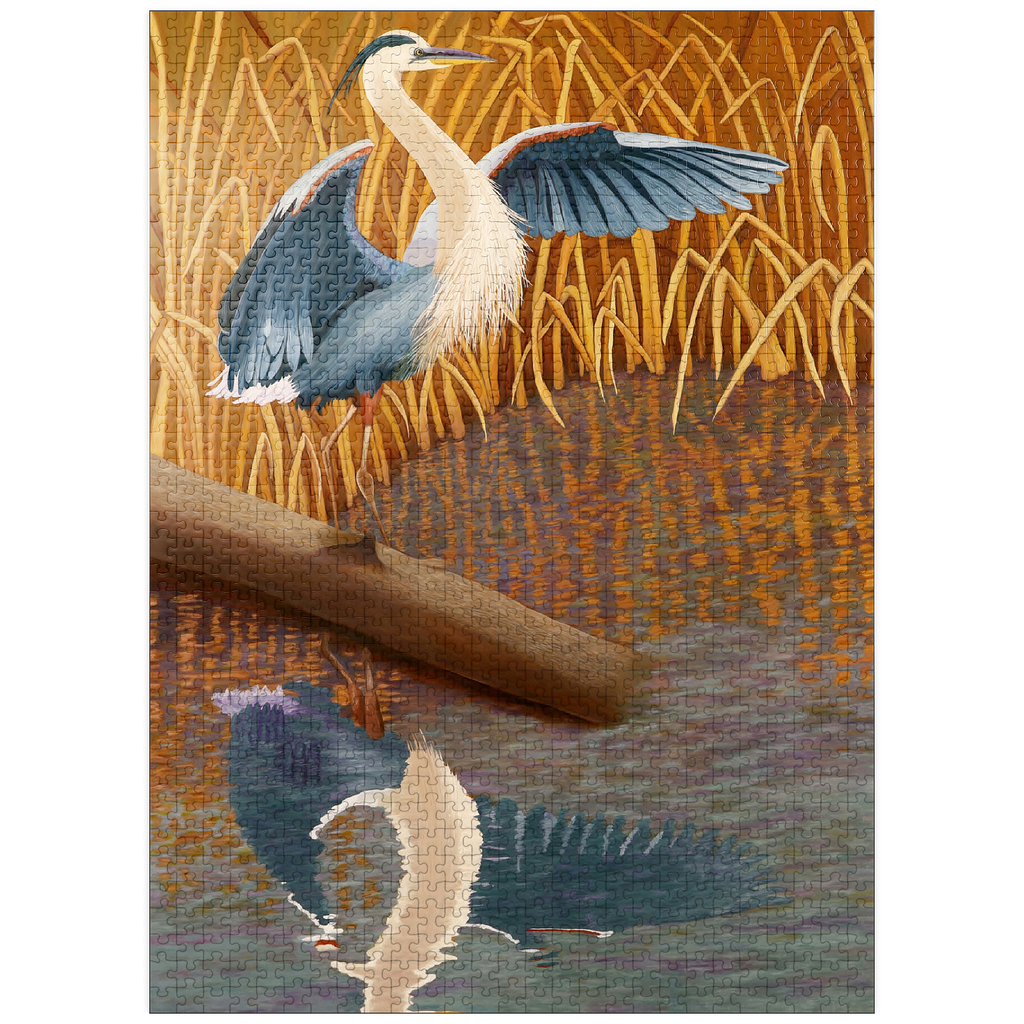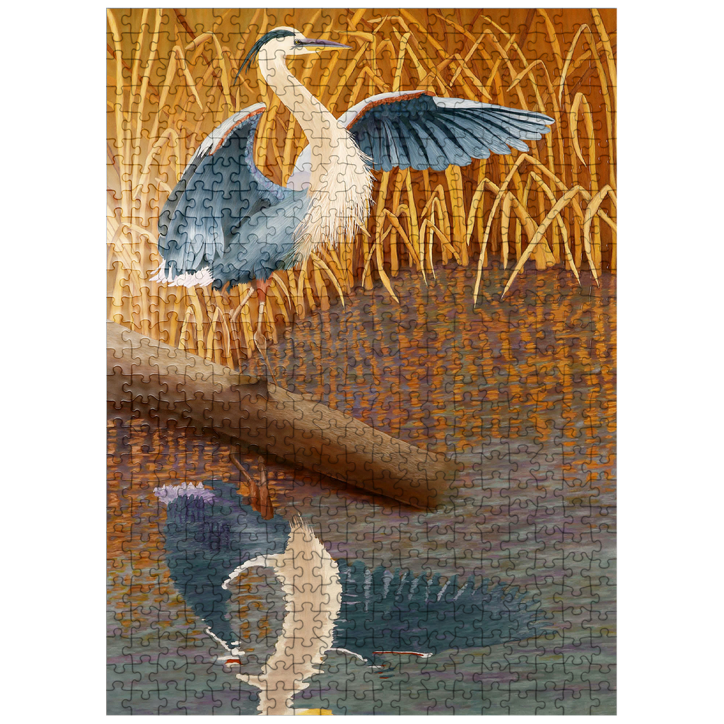 A graceful great blue heron is depicted with its wings elegantly spread, standing on a log amidst golden marsh grasses. The calm water below reflects the heron and its surroundings, creating a stunning mirror effect that enhances the tranquil atmosphere. The bird's striking blue and white plumage contrasts beautifully with the warm earthy tones of the marsh. This artwork captures the majesty and serenity of this iconic wading bird in its natural habitat, highlighting the harmony of wetlands.