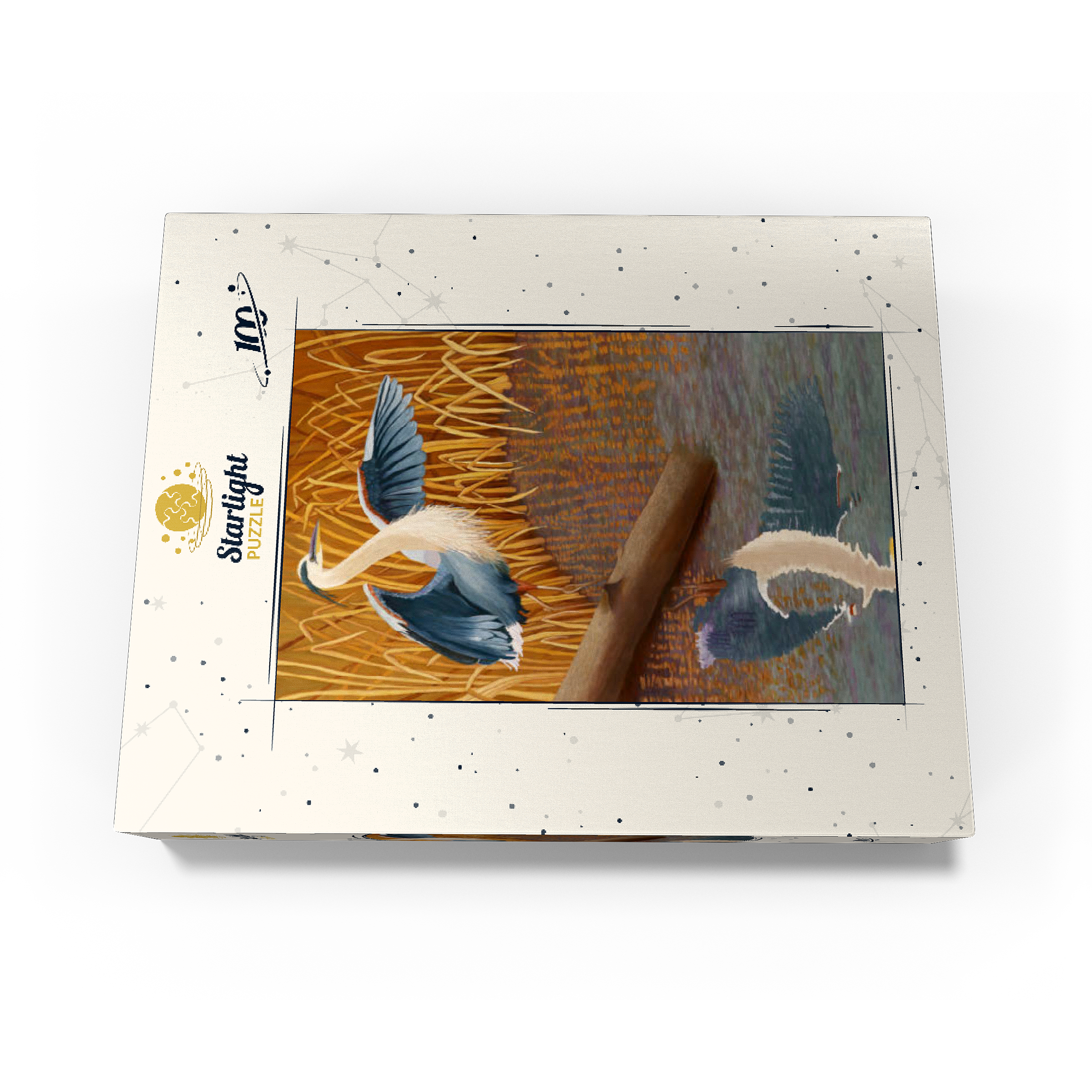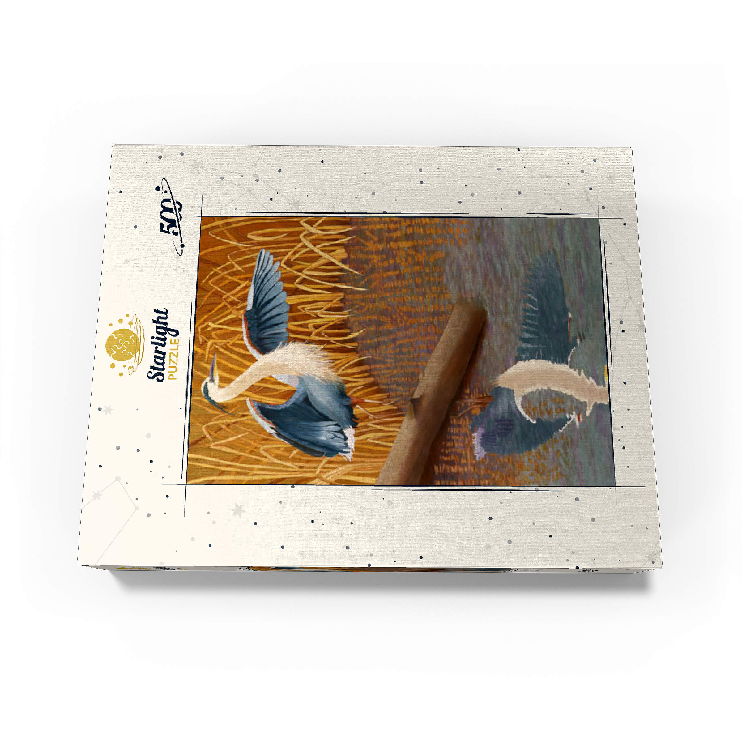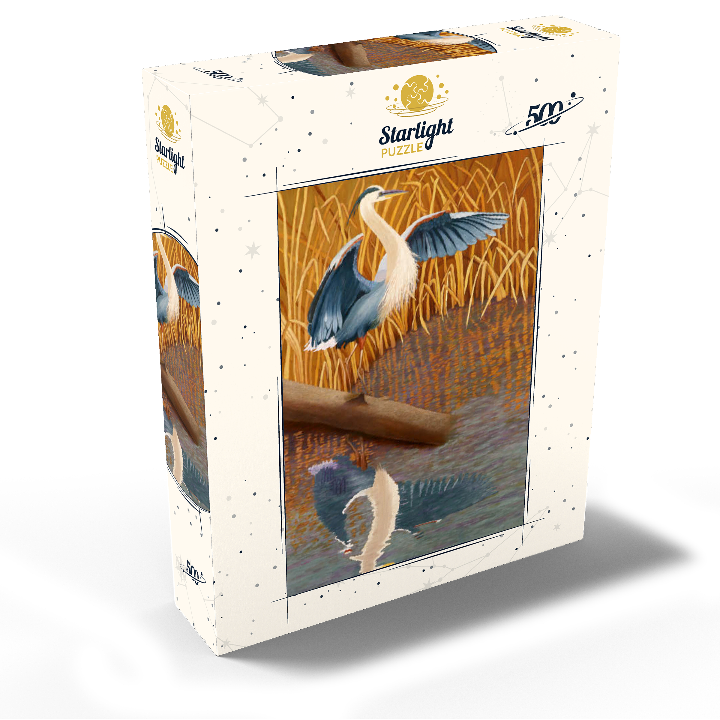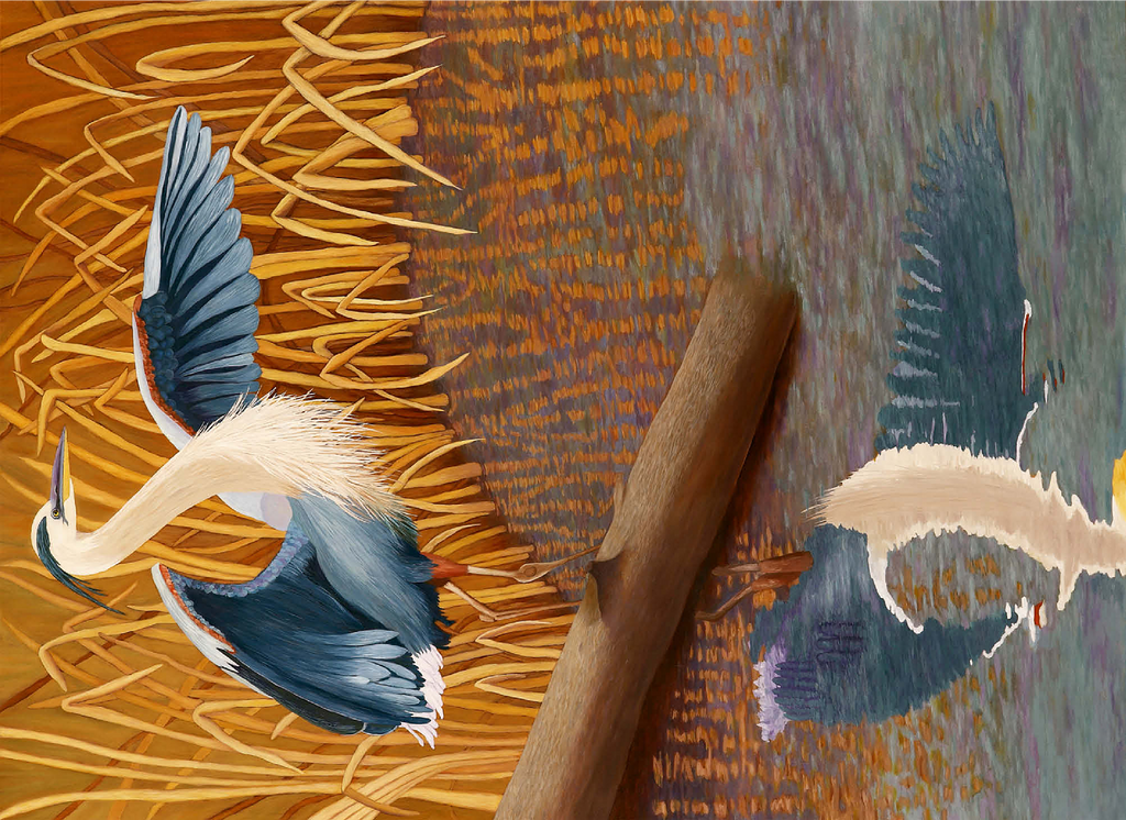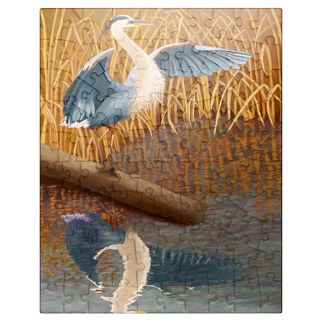 A graceful great blue heron is depicted with its wings elegantly spread, standing on a log amidst golden marsh grasses. The calm water below reflects the heron and its surroundings, creating a stunning mirror effect that enhances the tranquil atmosphere. The bird's striking blue and white plumage contrasts beautifully with the warm earthy tones of the marsh. This artwork captures the majesty and serenity of this iconic wading bird in its natural habitat, highlighting the harmony of wetlands.