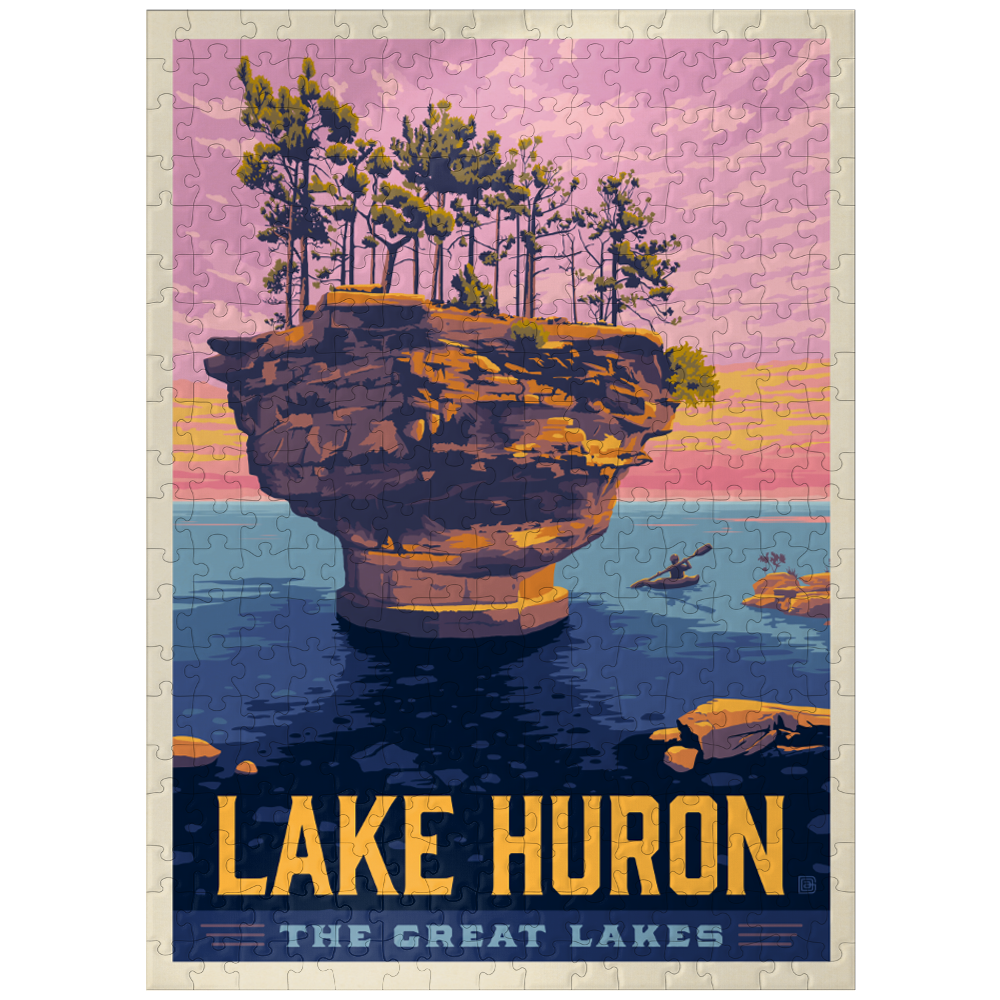 Lake Huron, one of the stunning Great Lakes, showcases its natural beauty with this captivating view of a sea stack rising from its clear blue waters. Crowned with windswept pine trees, the rock formation stands tall against a vivid sunset sky painted in shades of pink and orange. The golden light bathes the rugged cliffs, highlighting the textures of the weathered stone. In the calm waters below, a lone kayaker glides peacefully, adding a sense of adventure and scale to the scene. Known for its breathtaking shorelines and unique geological features, Lake Huron offers countless opportunities for outdoor enthusiasts to explore its pristine landscapes. This artistic depiction captures the essence of Lake Huron's wild beauty, making it a perfect tribute to the natural wonders of the Great Lakes.
