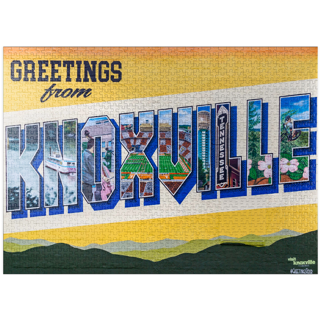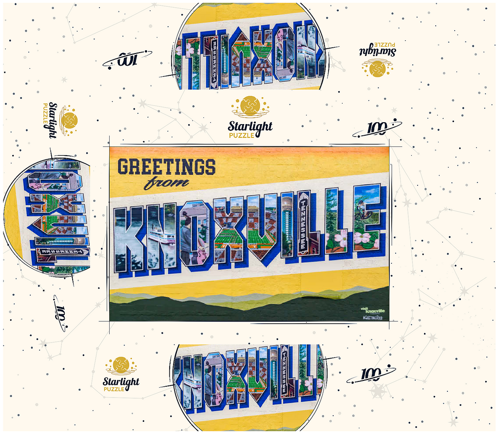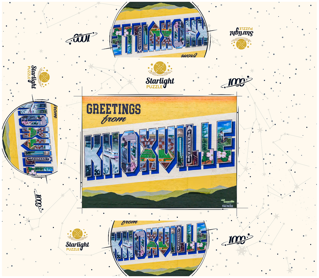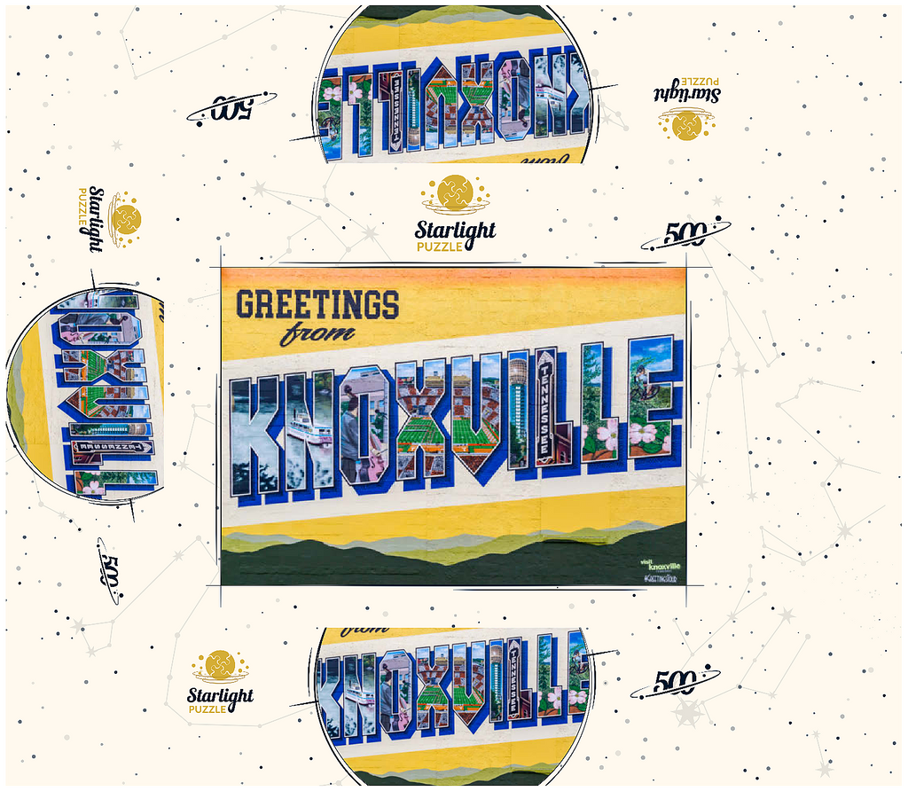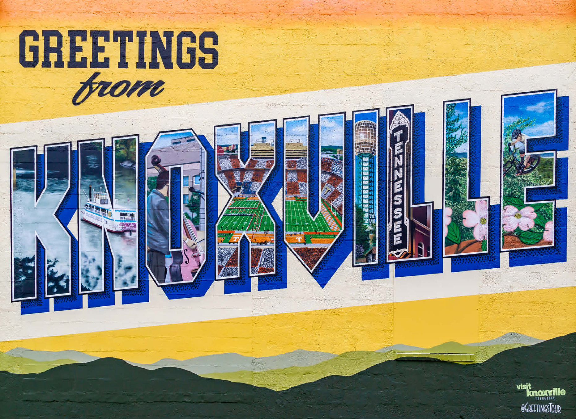 This vibrant and colorful mural titled “Greetings from Knoxville, Tennessee” showcases iconic elements of the city’s identity through a retro postcard-style design. Each letter in the word "Knoxville" contains detailed artwork representing landmarks such as Neyland Stadium, the Sunsphere from the 1982 World’s Fair, the Tennessee Theatre marquee, and scenes of local culture like riverboats, live music, biking, and dogwood blossoms. Set against a warm gradient of orange and yellow, the mural captures the spirit of this historic Southern city. Located in downtown Knoxville, this mural is a popular photo spot for both visitors and locals, celebrating the rich cultural heritage, natural beauty, and vibrant arts scene of East Tennessee. With its nostalgic style and local pride, this image perfectly embodies the welcoming charm of Knoxville.