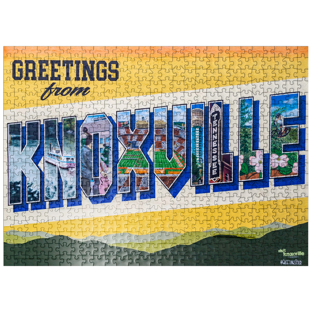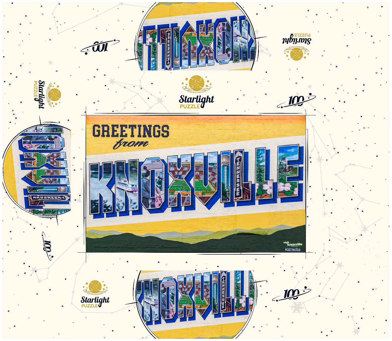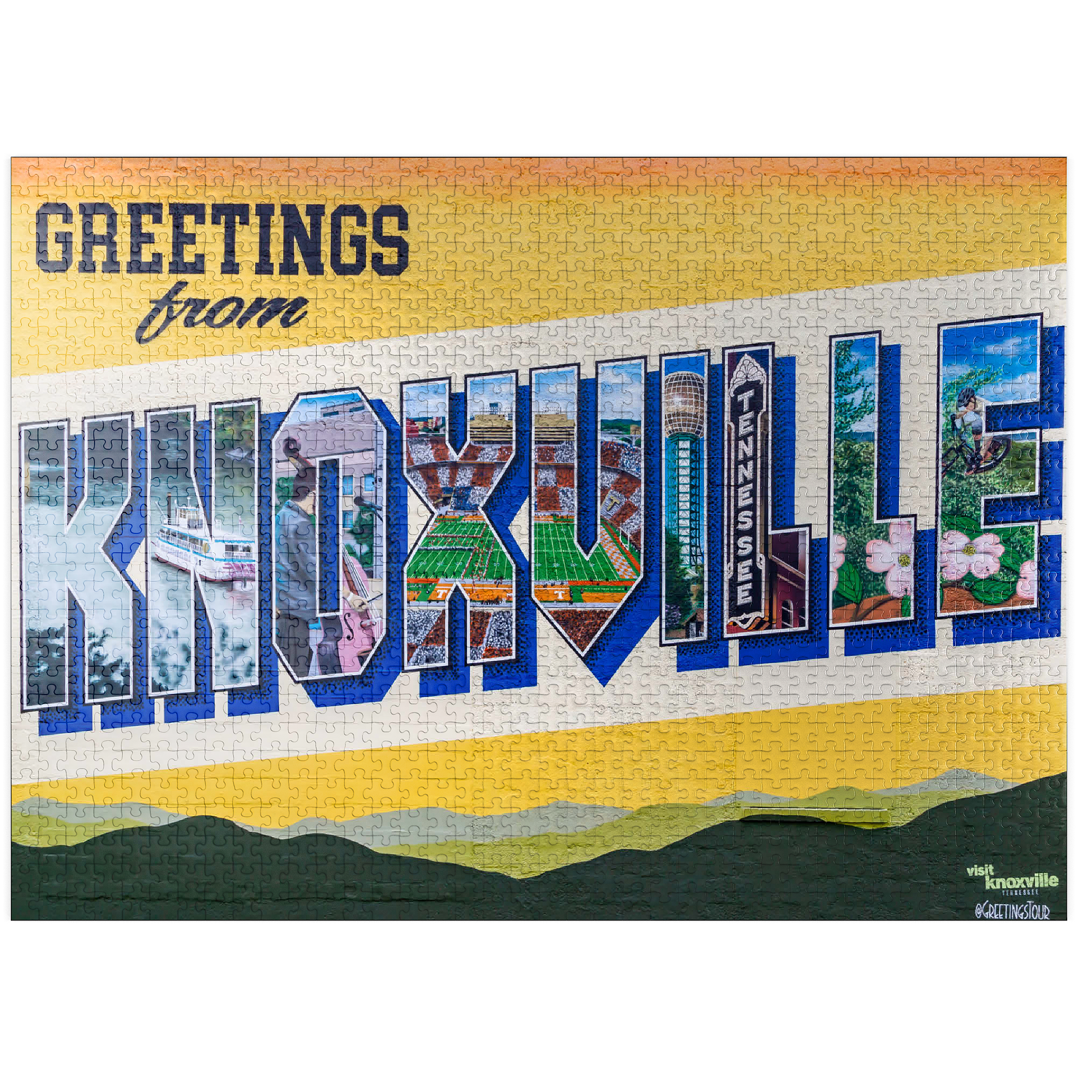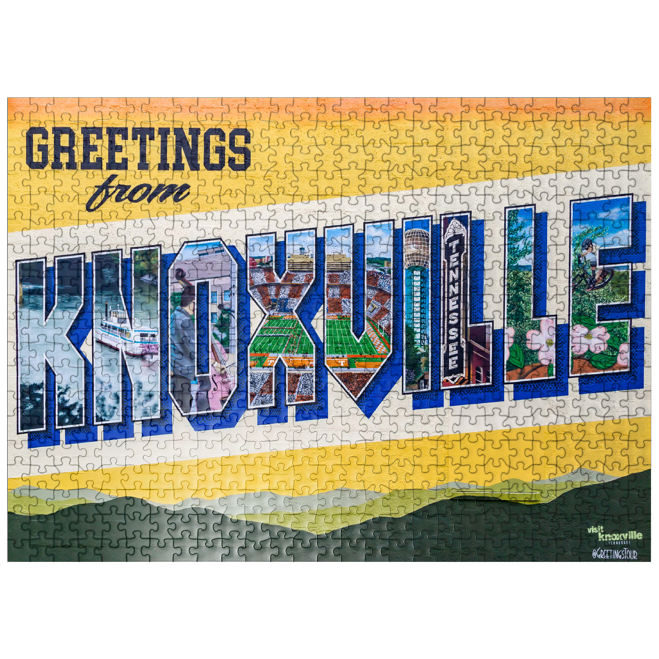 This vibrant and colorful mural titled “Greetings from Knoxville, Tennessee” showcases iconic elements of the city’s identity through a retro postcard-style design. Each letter in the word "Knoxville" contains detailed artwork representing landmarks such as Neyland Stadium, the Sunsphere from the 1982 World’s Fair, the Tennessee Theatre marquee, and scenes of local culture like riverboats, live music, biking, and dogwood blossoms. Set against a warm gradient of orange and yellow, the mural captures the spirit of this historic Southern city. Located in downtown Knoxville, this mural is a popular photo spot for both visitors and locals, celebrating the rich cultural heritage, natural beauty, and vibrant arts scene of East Tennessee. With its nostalgic style and local pride, this image perfectly embodies the welcoming charm of Knoxville.