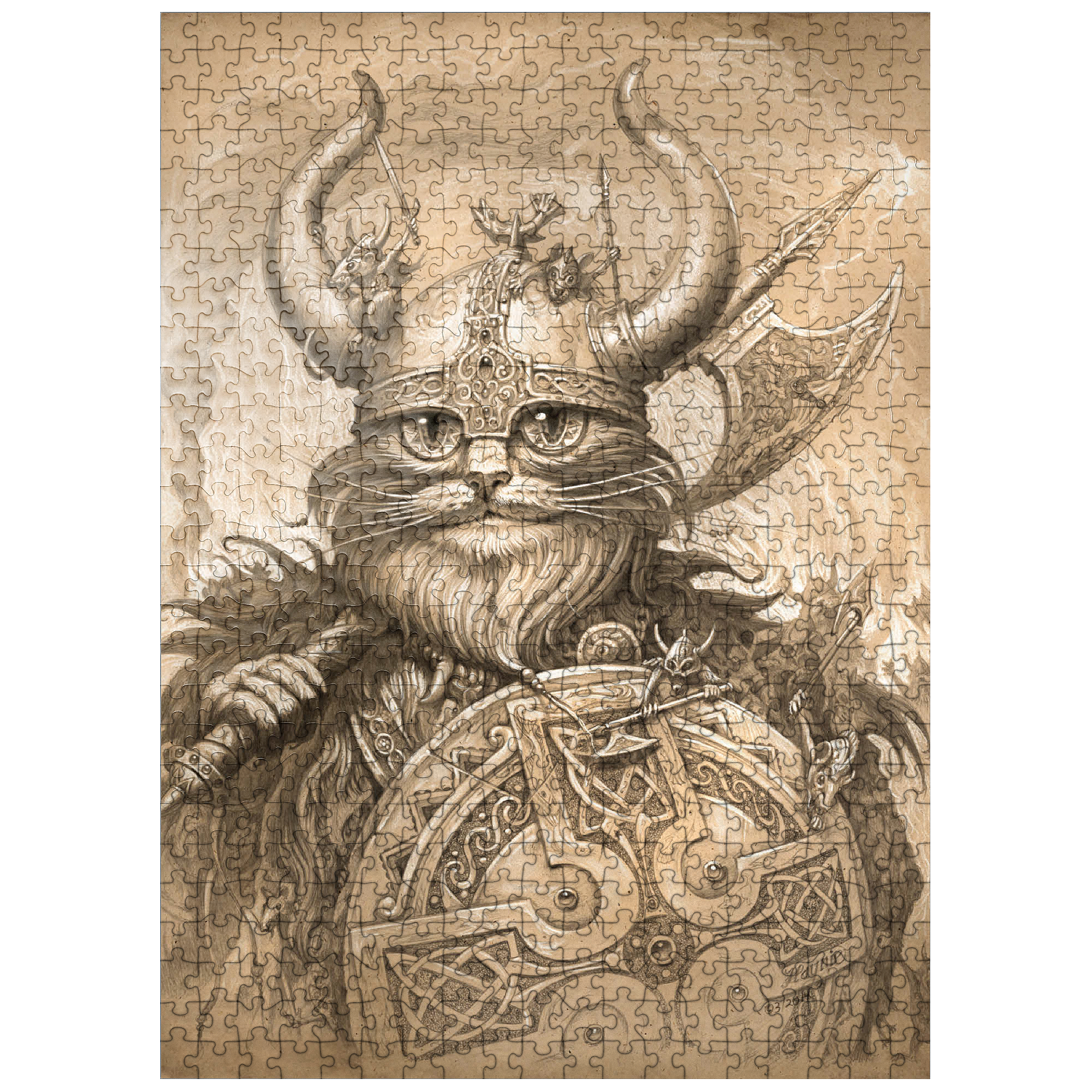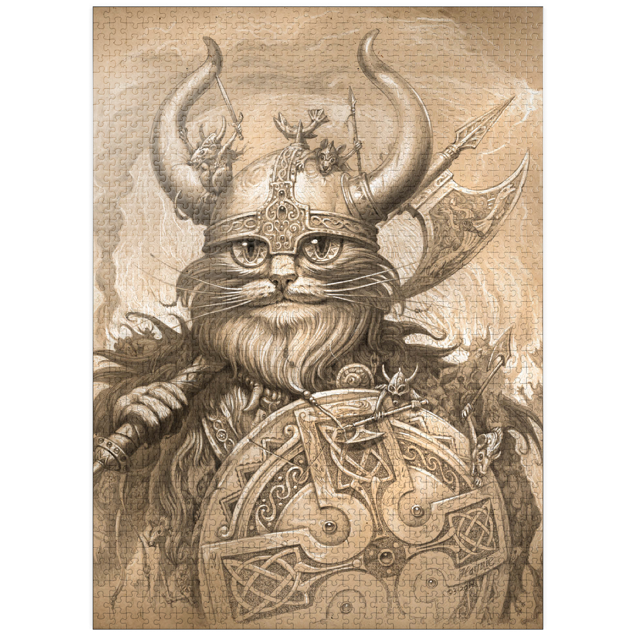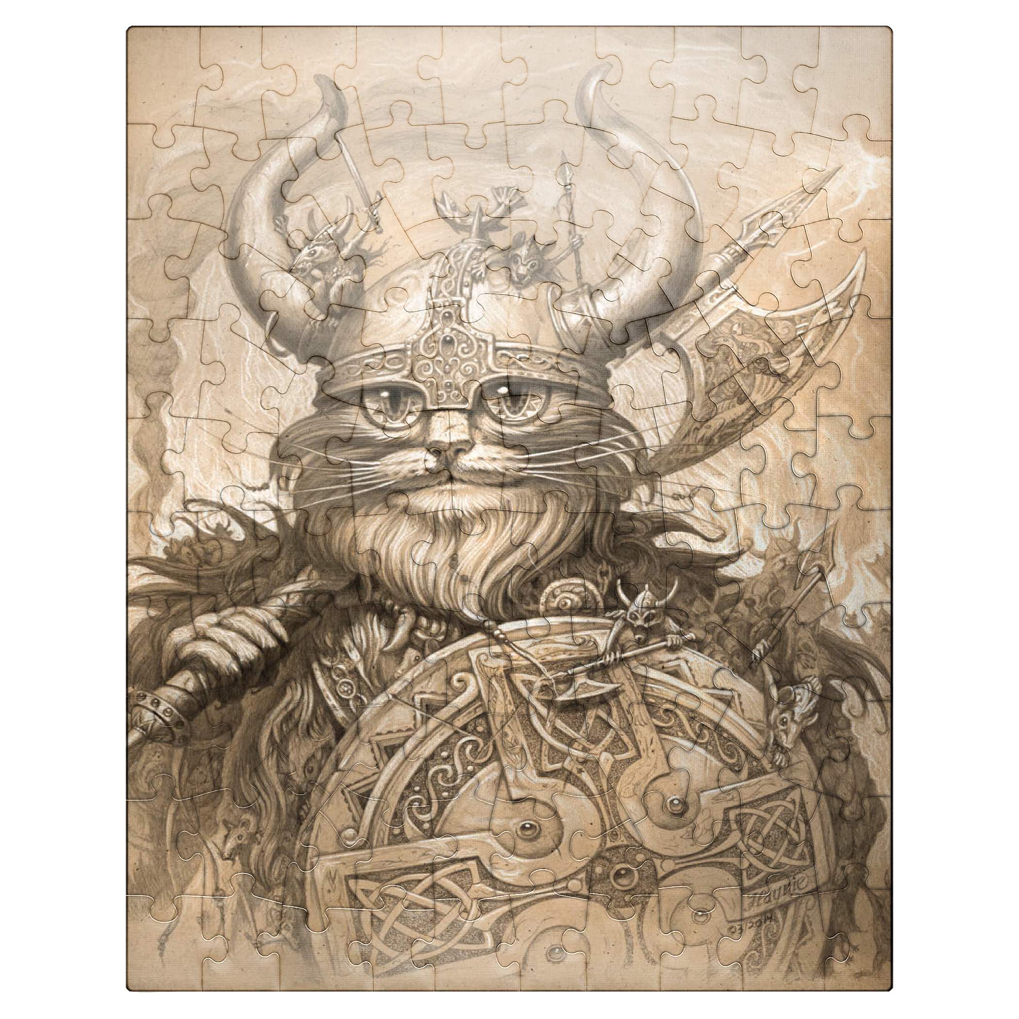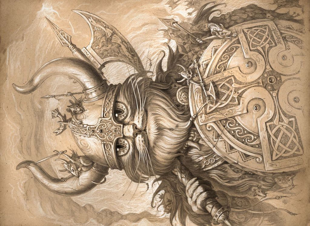 Jeff Haynie's artwork presents a whimsical yet formidable warrior cat adorned in Viking attire, poised for an epic, if somewhat absurd, battle. The drawing depicts a majestic cat wearing a horned Viking helmet, complete with intricate detailing and minuscule rat warriors clinging to it. The feline warrior is equipped with a shield bearing Celtic knots and wields a substantial axe. The atmosphere is one of determined readiness with a touch of humor, emphasized by the cat's calm expression against a backdrop hinting at an imminent battle, showcasing Haynie's attention to historical detail and playful imagination.