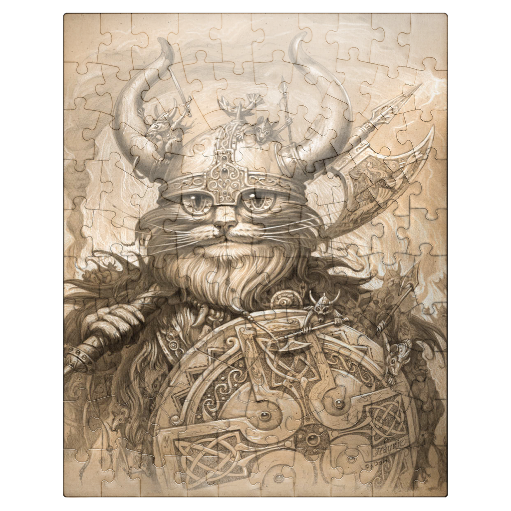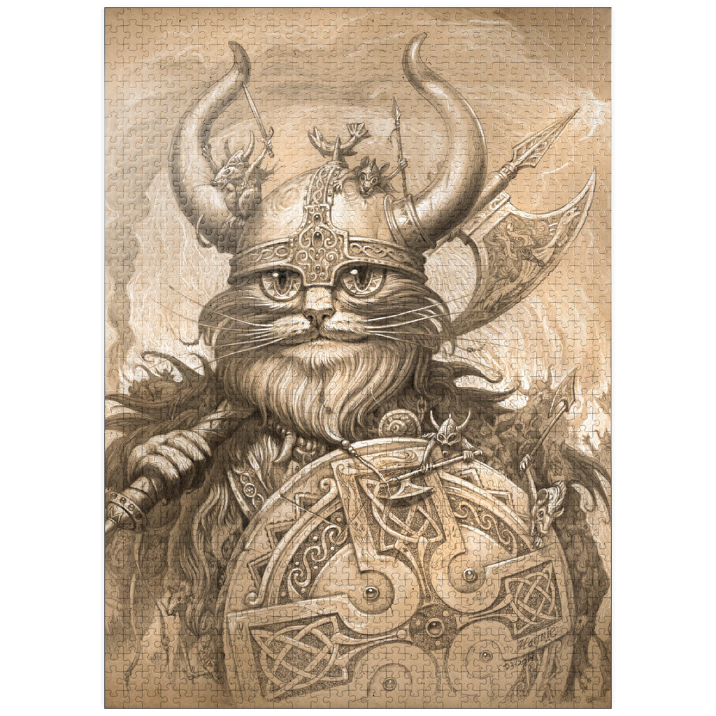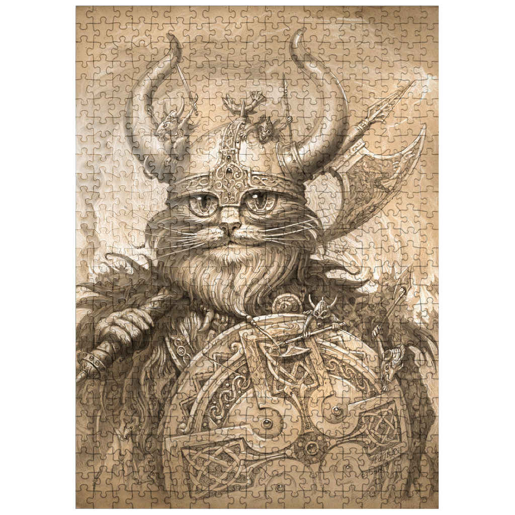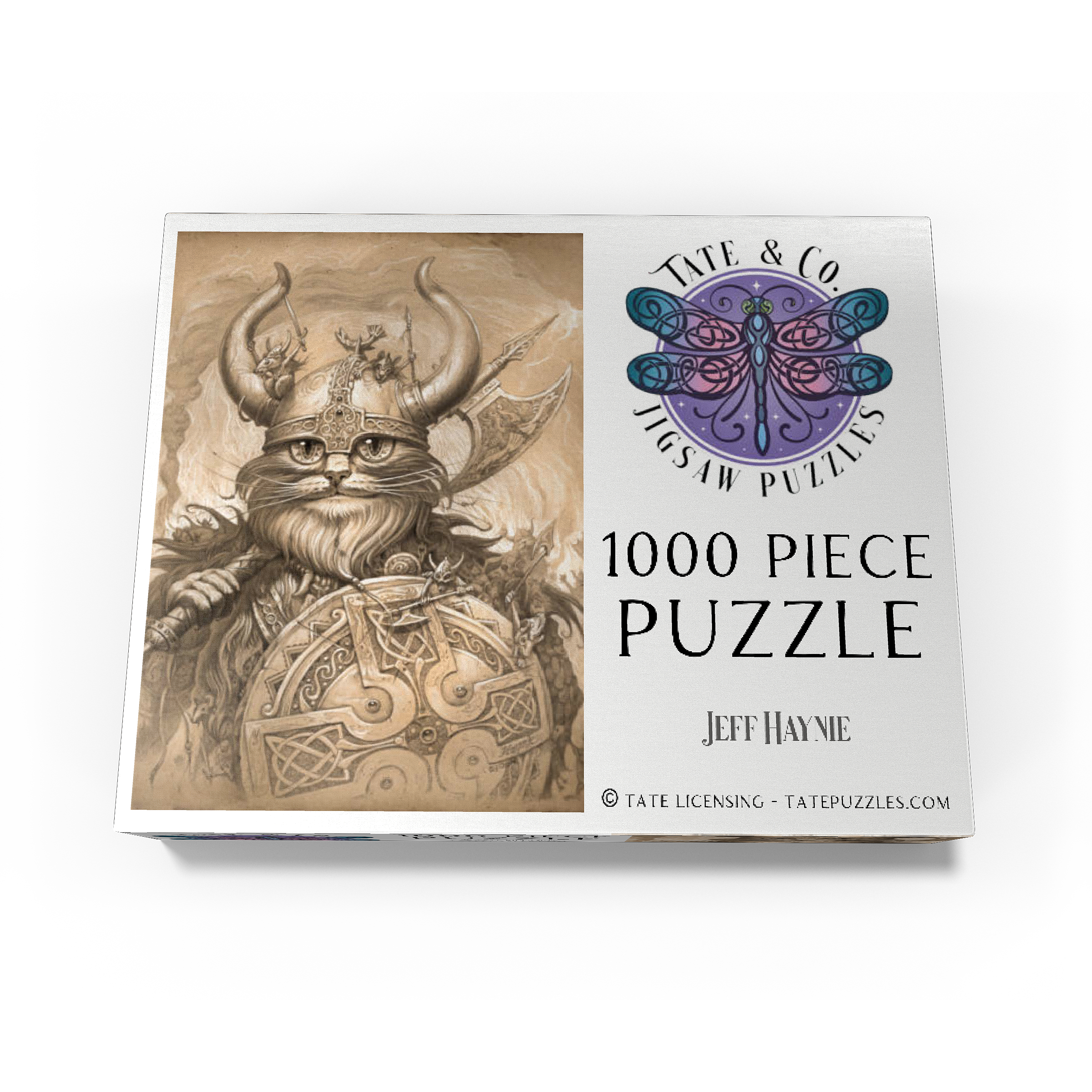 Jeff Haynie's artwork presents a whimsical yet formidable warrior cat adorned in Viking attire, poised for an epic, if somewhat absurd, battle. The drawing depicts a majestic cat wearing a horned Viking helmet, complete with intricate detailing and minuscule rat warriors clinging to it. The feline warrior is equipped with a shield bearing Celtic knots and wields a substantial axe. The atmosphere is one of determined readiness with a touch of humor, emphasized by the cat's calm expression against a backdrop hinting at an imminent battle, showcasing Haynie's attention to historical detail and playful imagination.