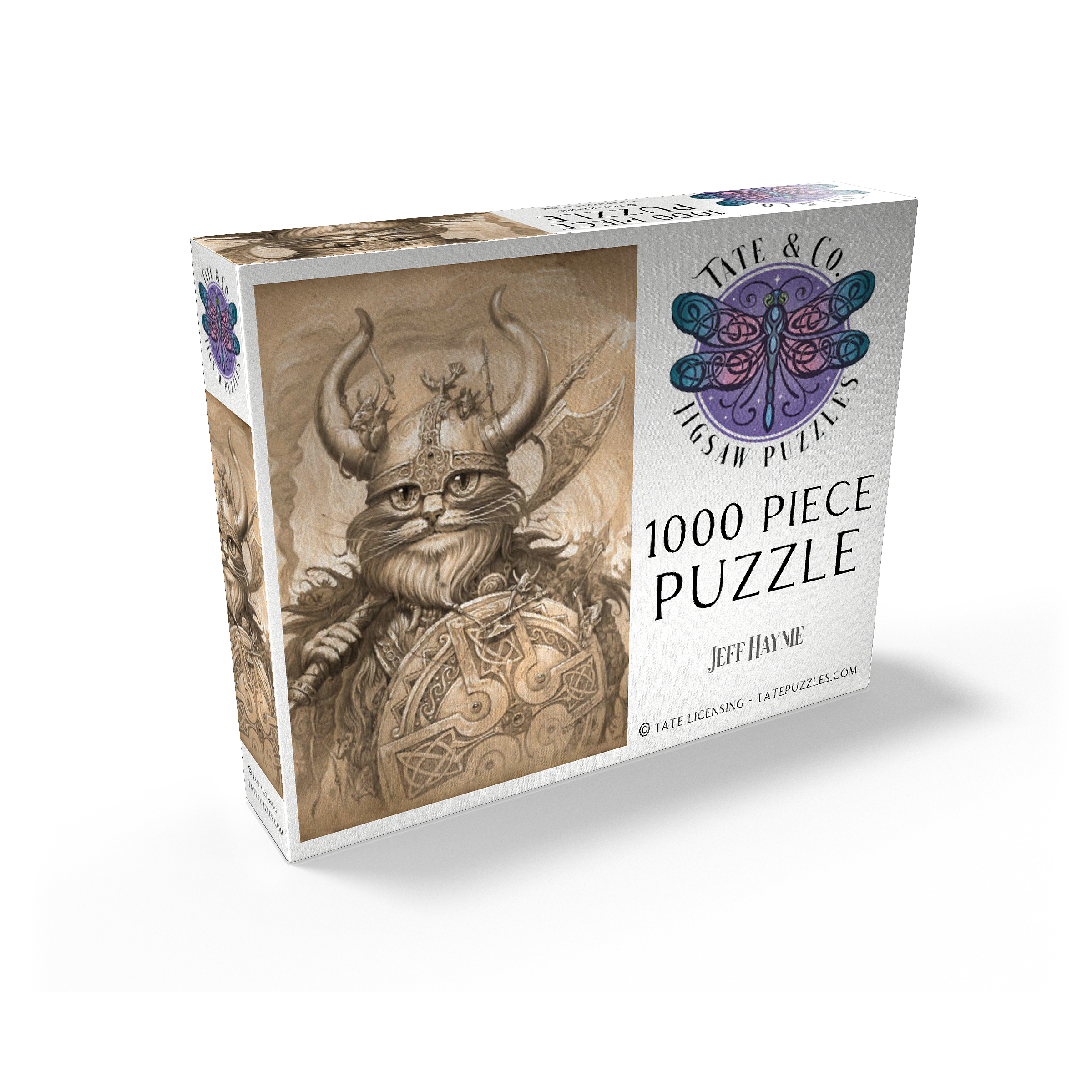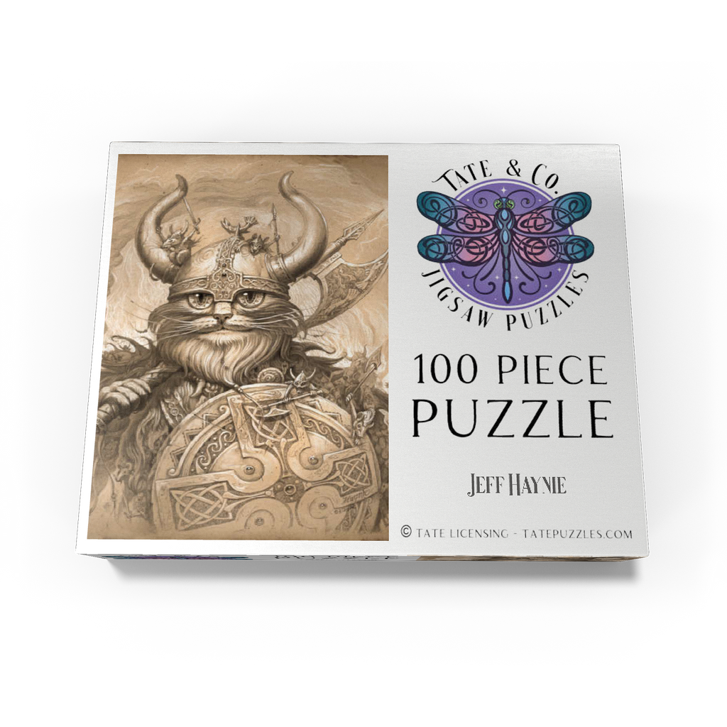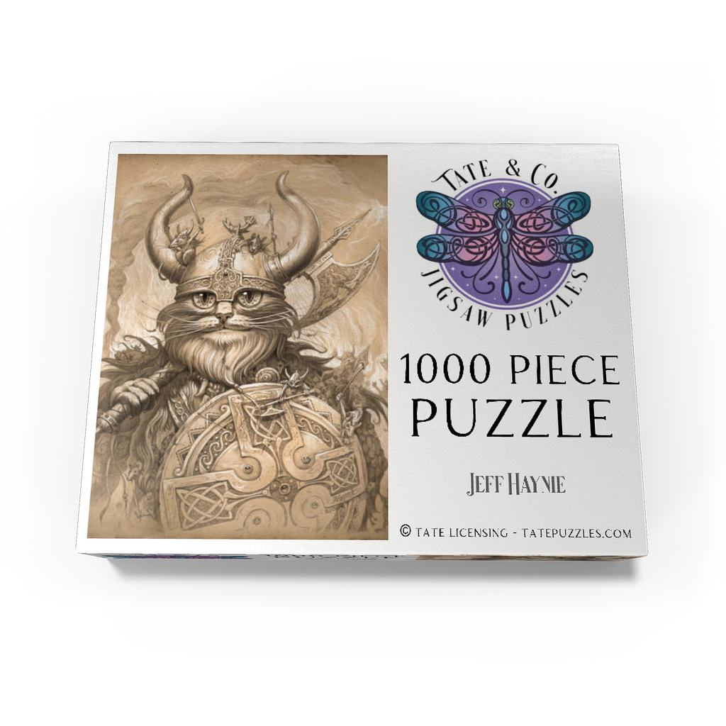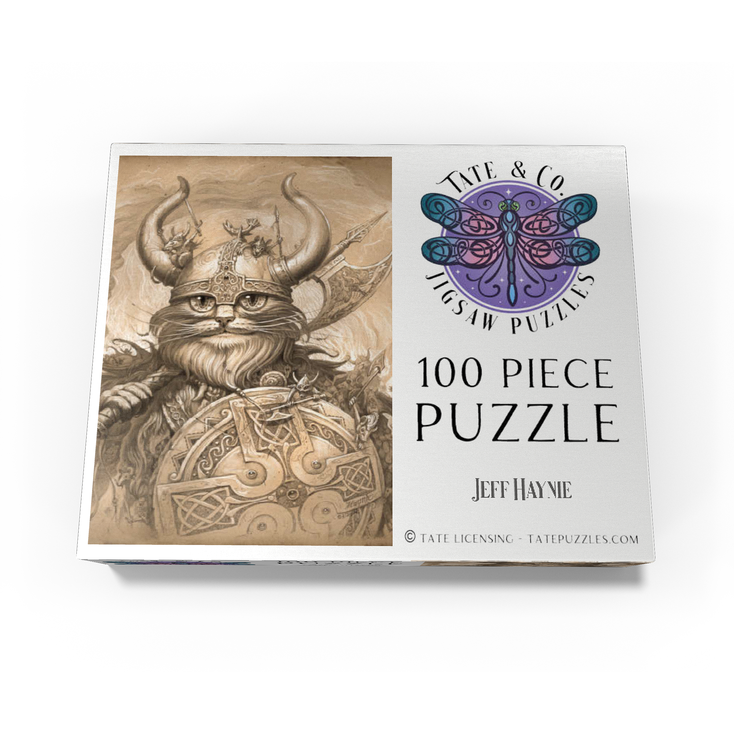 Jeff Haynie's artwork presents a whimsical yet formidable warrior cat adorned in Viking attire, poised for an epic, if somewhat absurd, battle. The drawing depicts a majestic cat wearing a horned Viking helmet, complete with intricate detailing and minuscule rat warriors clinging to it. The feline warrior is equipped with a shield bearing Celtic knots and wields a substantial axe. The atmosphere is one of determined readiness with a touch of humor, emphasized by the cat's calm expression against a backdrop hinting at an imminent battle, showcasing Haynie's attention to historical detail and playful imagination.