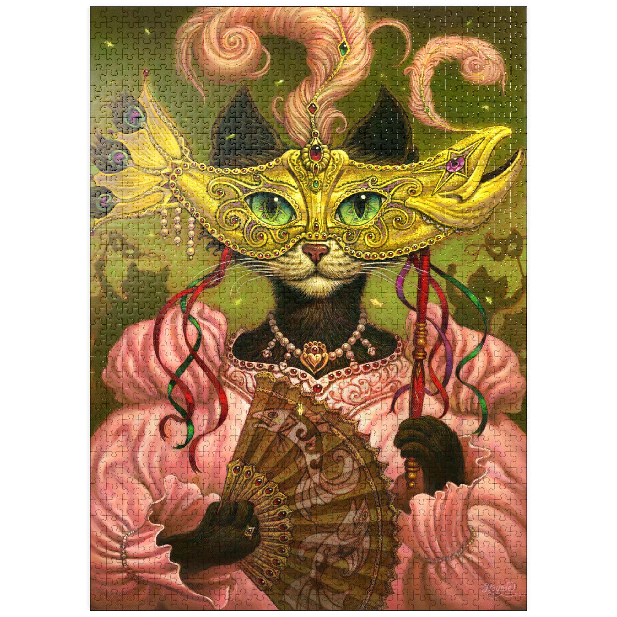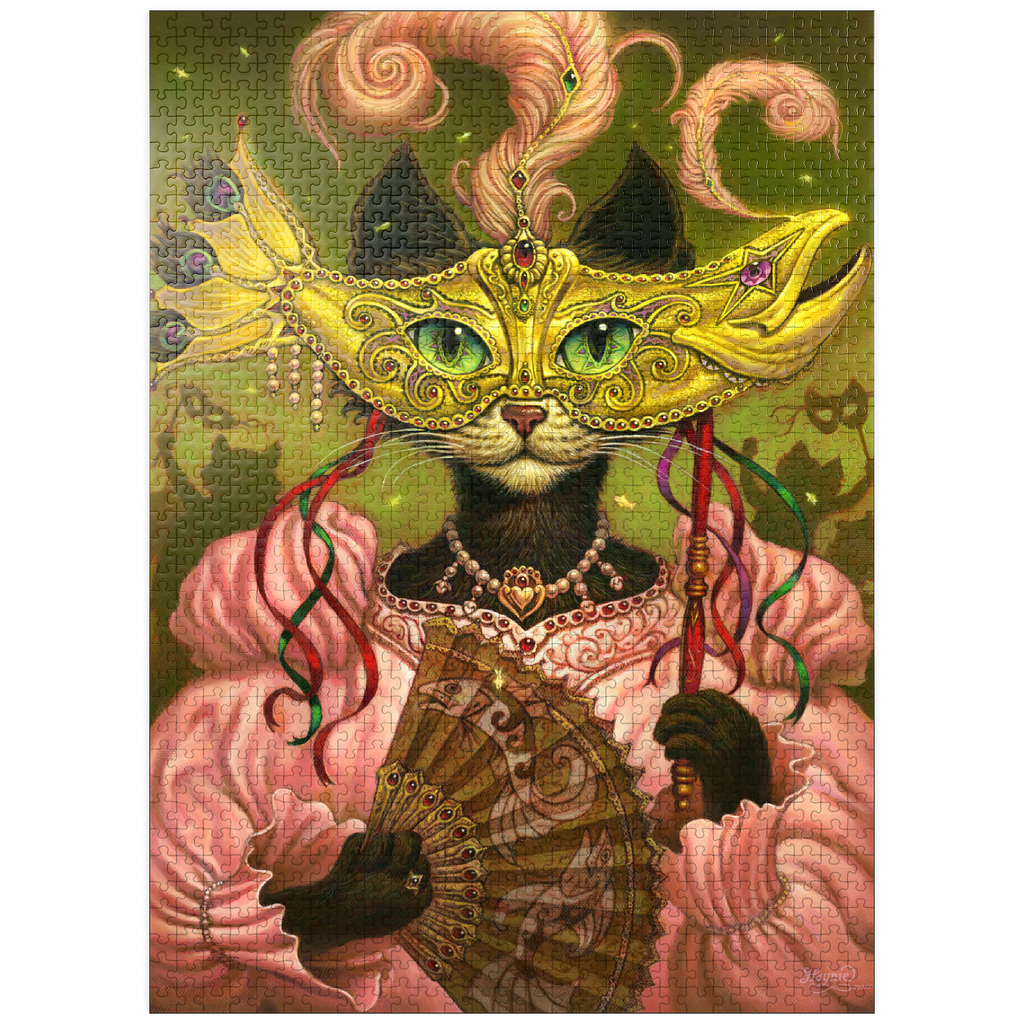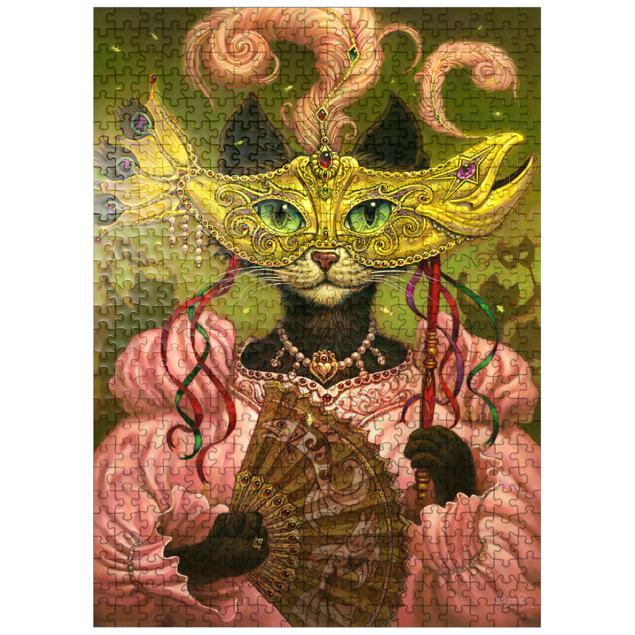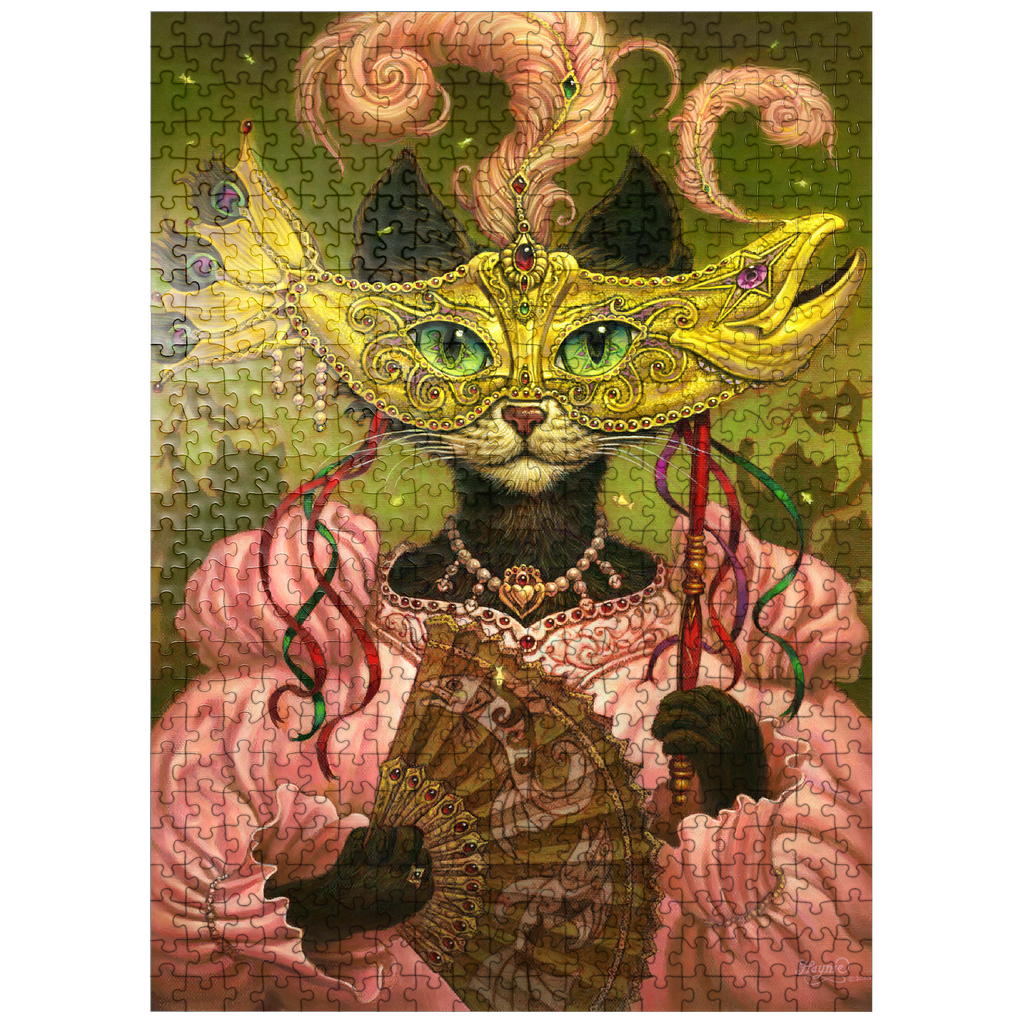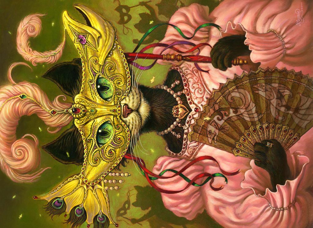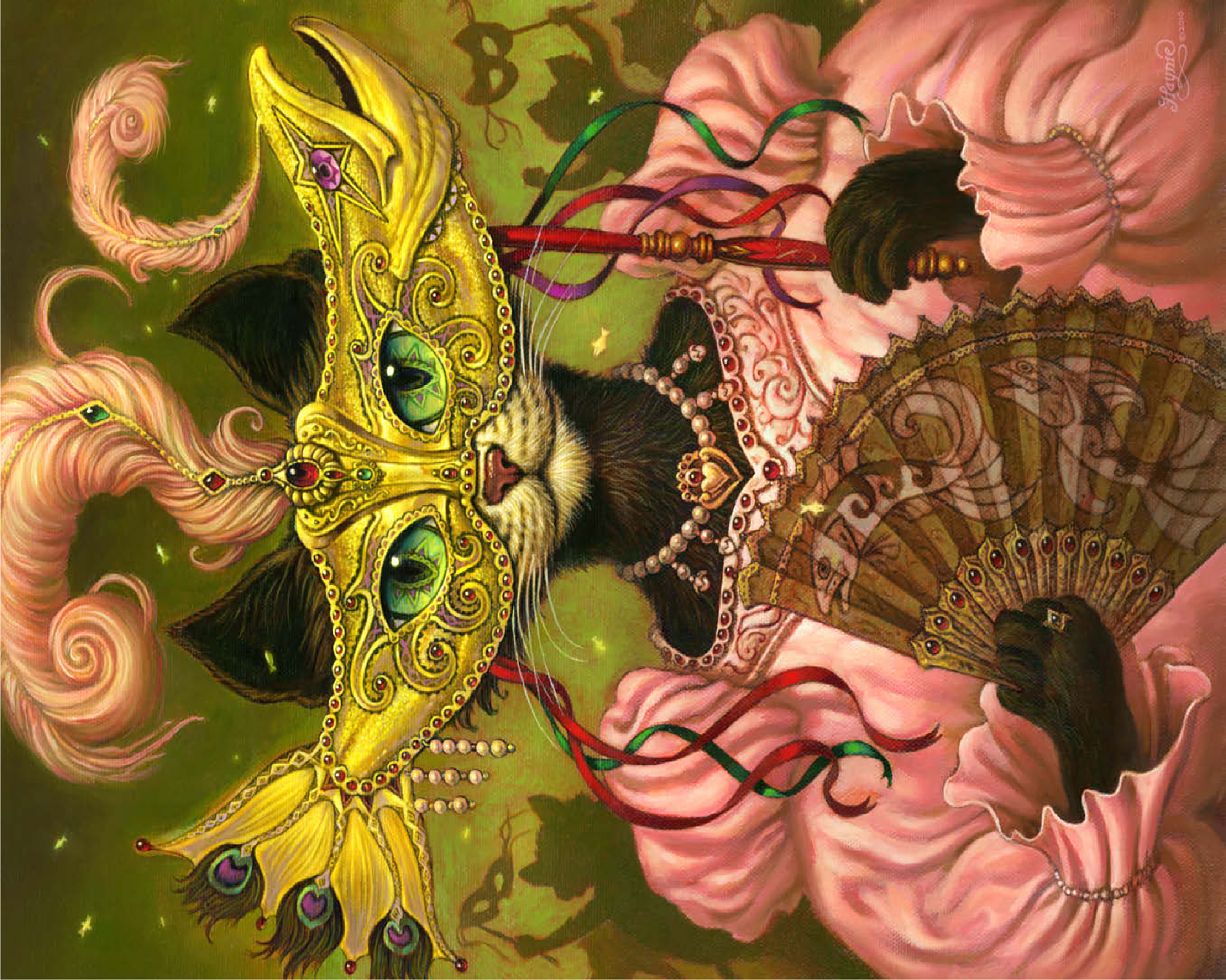 Jeff Haynie's -Incatneato- depicts a black cat elegantly dressed for a masquerade. the cat wears a golden, jewel-encrusted fish mask with peacock feathers and flowing pink plumes. it dons a frilly pink gown, a pearl necklace, and holds an ornate fan. the background is olive green with faded silhouettes of masked figures and shimmering stars. overall, the artwork exudes a whimsical, sophisticated, and slightly surreal atmosphere, with an air of mystery and playful elegance.
