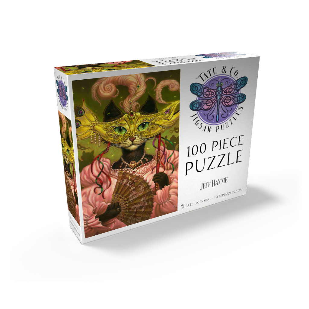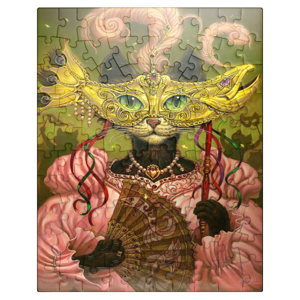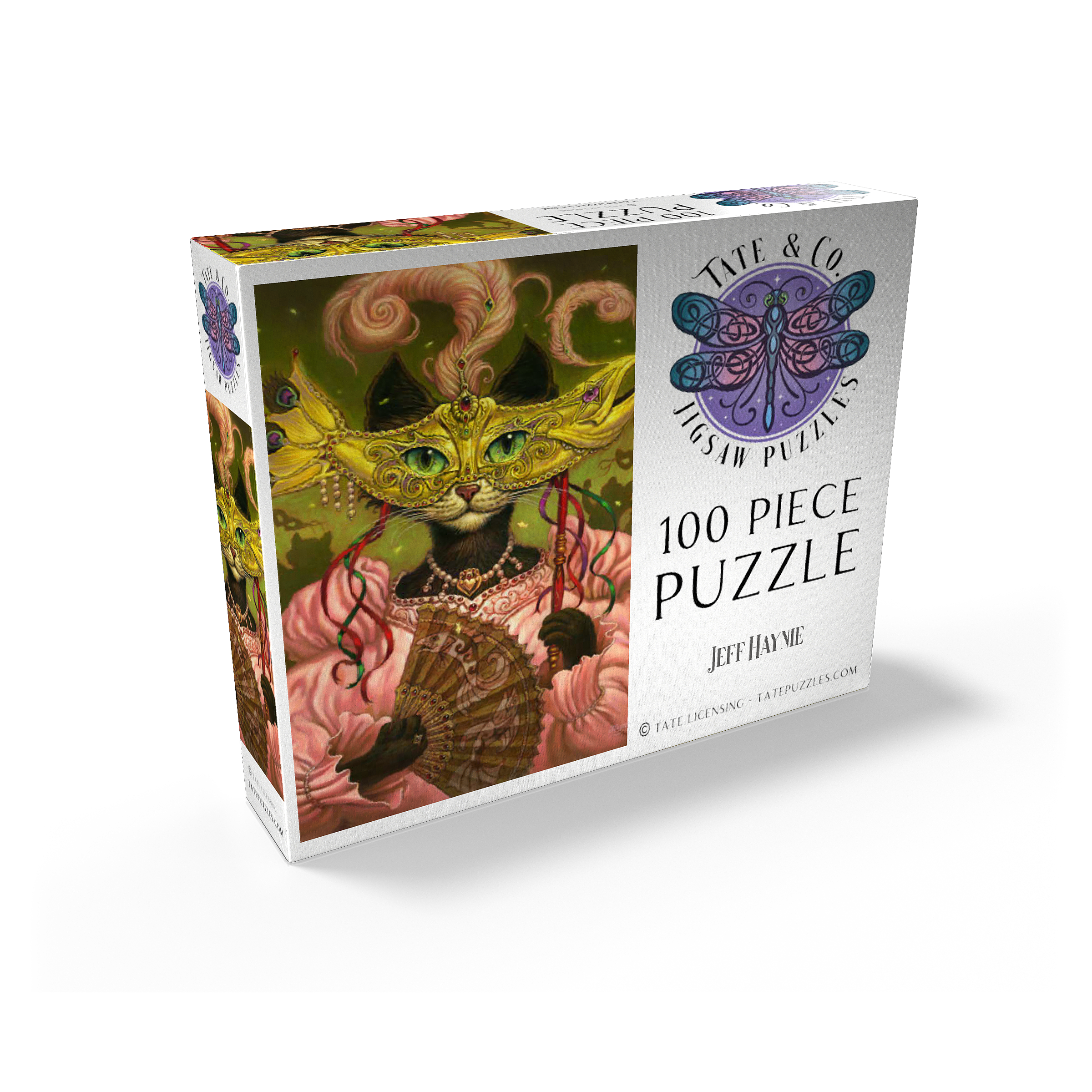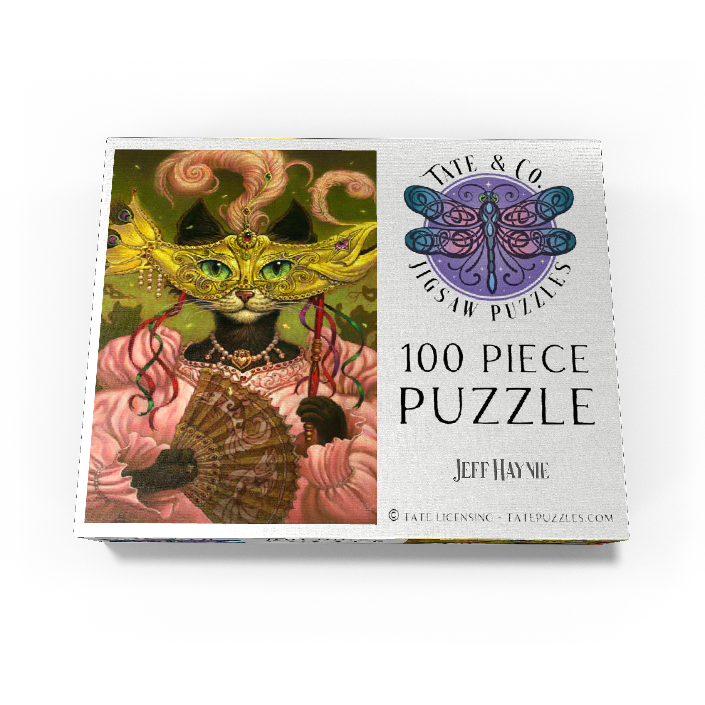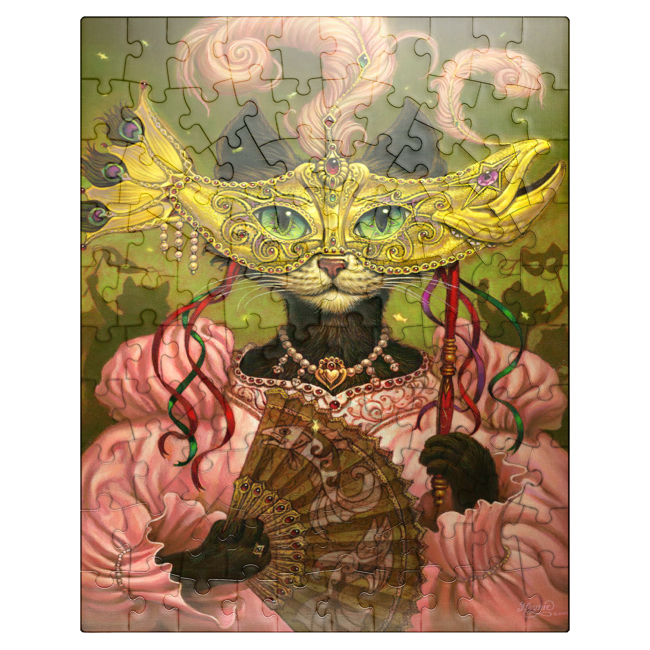 Jeff Haynie's -Incatneato- depicts a black cat elegantly dressed for a masquerade. the cat wears a golden, jewel-encrusted fish mask with peacock feathers and flowing pink plumes. it dons a frilly pink gown, a pearl necklace, and holds an ornate fan. the background is olive green with faded silhouettes of masked figures and shimmering stars. overall, the artwork exudes a whimsical, sophisticated, and slightly surreal atmosphere, with an air of mystery and playful elegance.