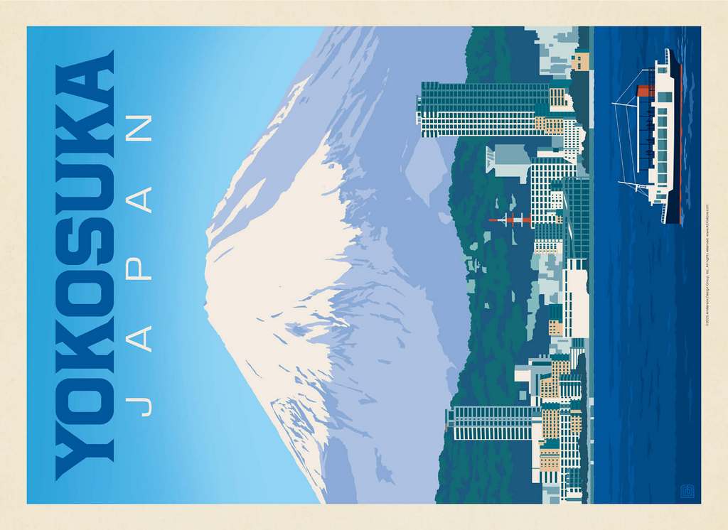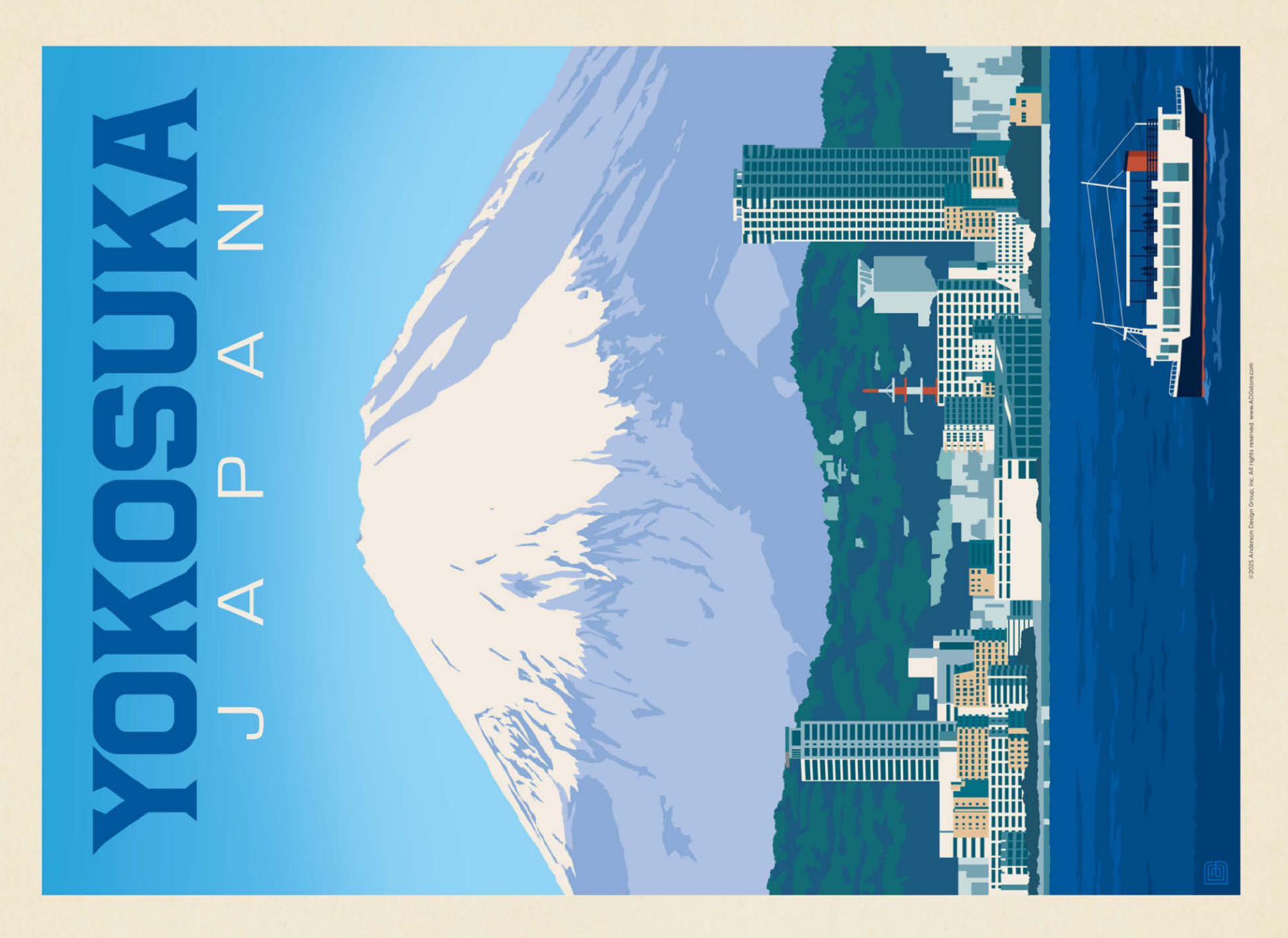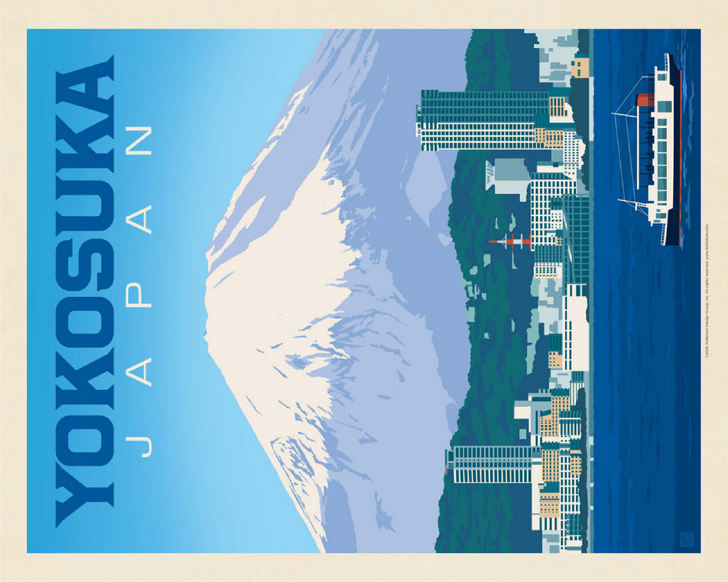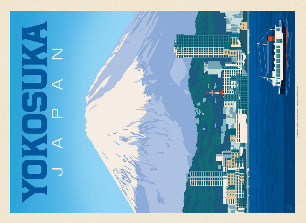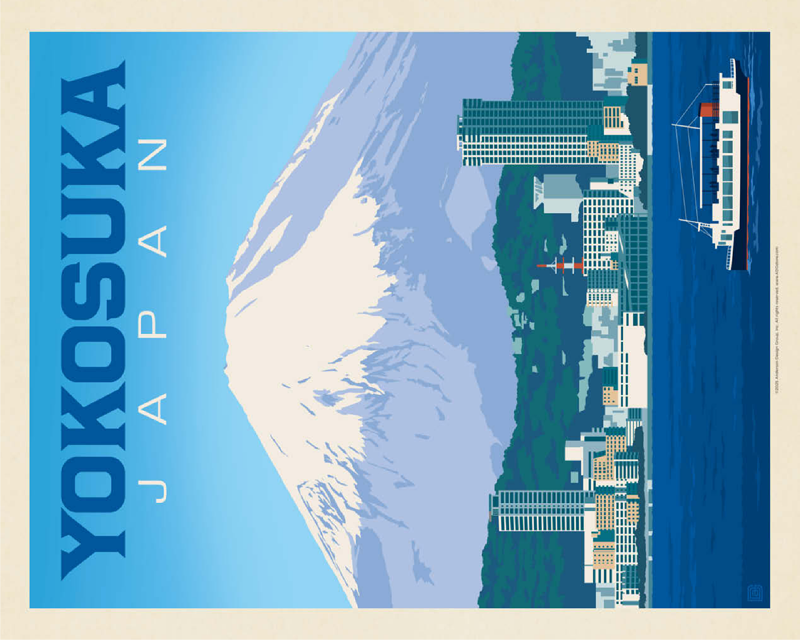 This vibrant artwork captures the coastal city of Yokosuka, Japan, with its modern skyline set against the majestic backdrop of snow-capped Mount Fuji. A ferry glides across the deep blue waters of Tokyo Bay, highlighting Yokosuka's maritime heritage and its role as a key naval port. The lush green hills and urban buildings below Mount Fuji emphasize the city's unique balance of nature and development. Known for its strategic importance and scenic views, Yokosuka offers a stunning perspective on Japan's coastal charm and iconic mountain landscapes in a clean, stylized composition.