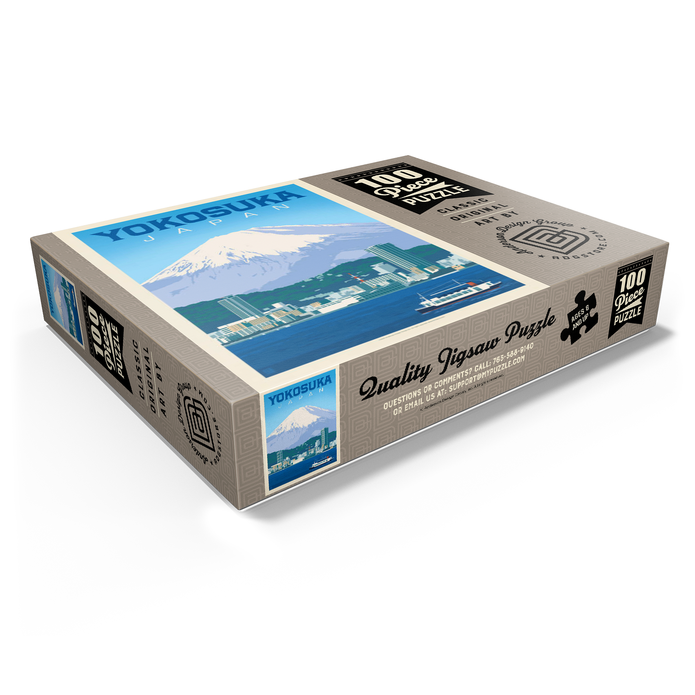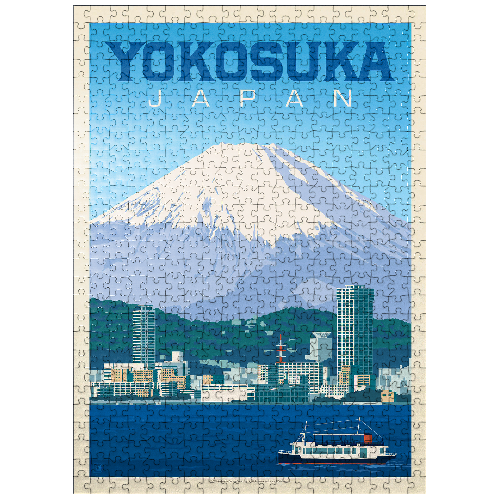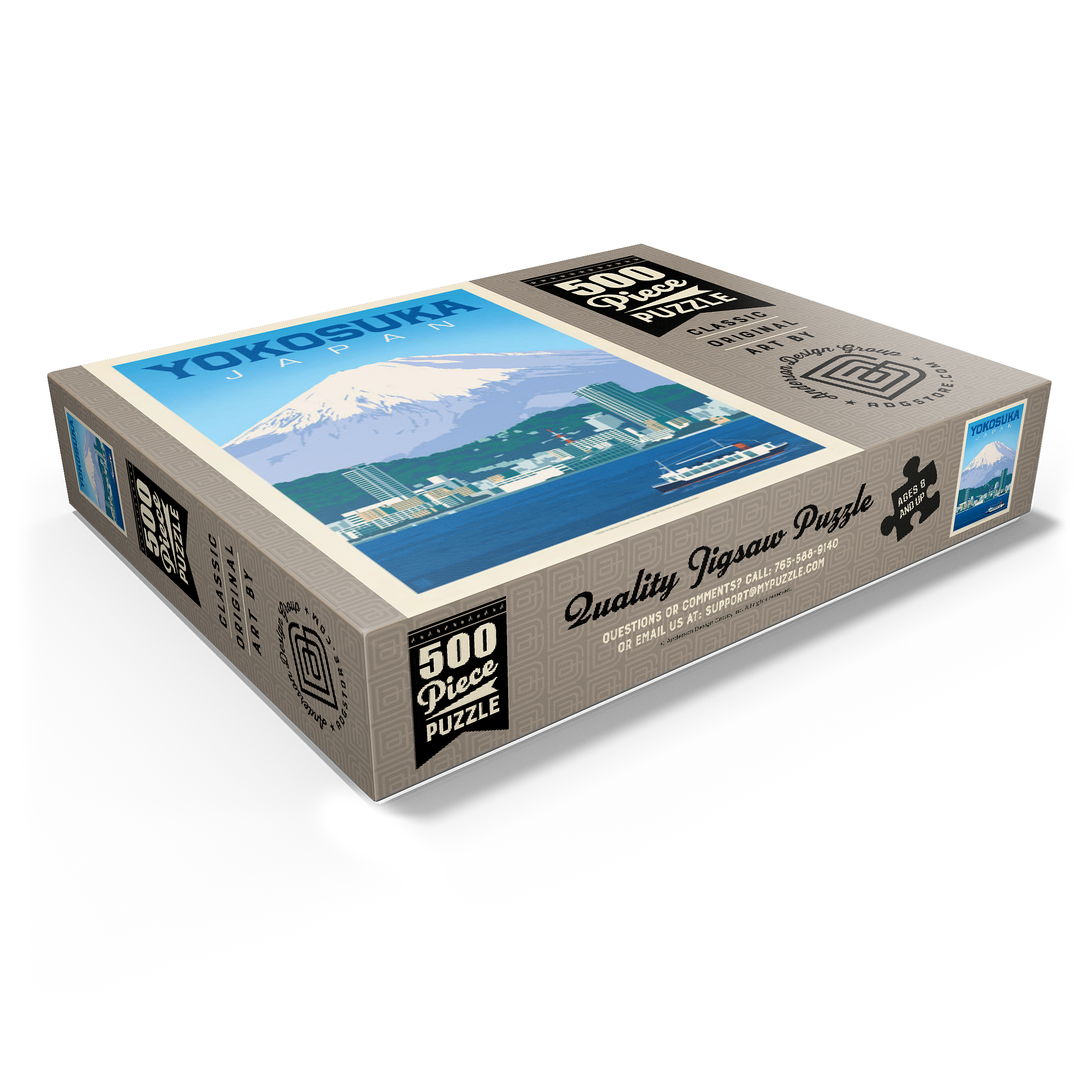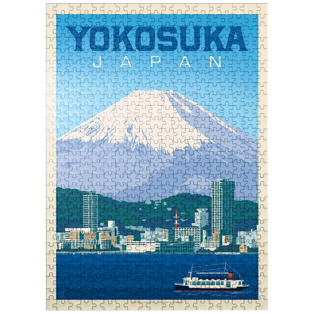 This vibrant artwork captures the coastal city of Yokosuka, Japan, with its modern skyline set against the majestic backdrop of snow-capped Mount Fuji. A ferry glides across the deep blue waters of Tokyo Bay, highlighting Yokosuka's maritime heritage and its role as a key naval port. The lush green hills and urban buildings below Mount Fuji emphasize the city's unique balance of nature and development. Known for its strategic importance and scenic views, Yokosuka offers a stunning perspective on Japan's coastal charm and iconic mountain landscapes in a clean, stylized composition.