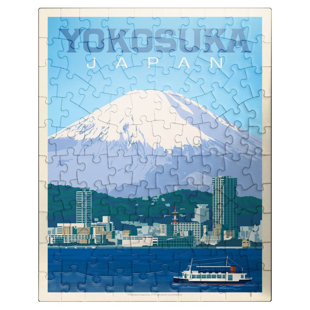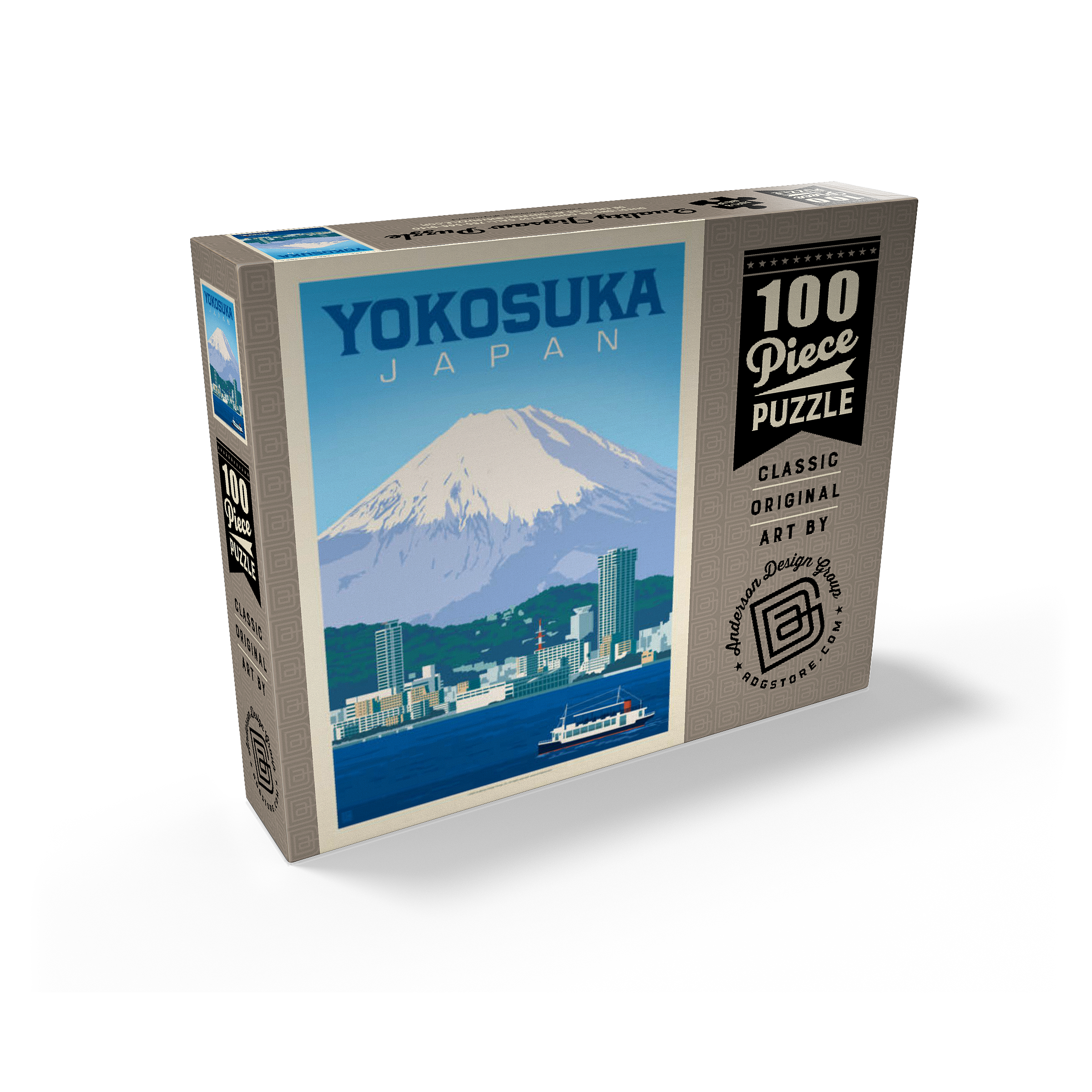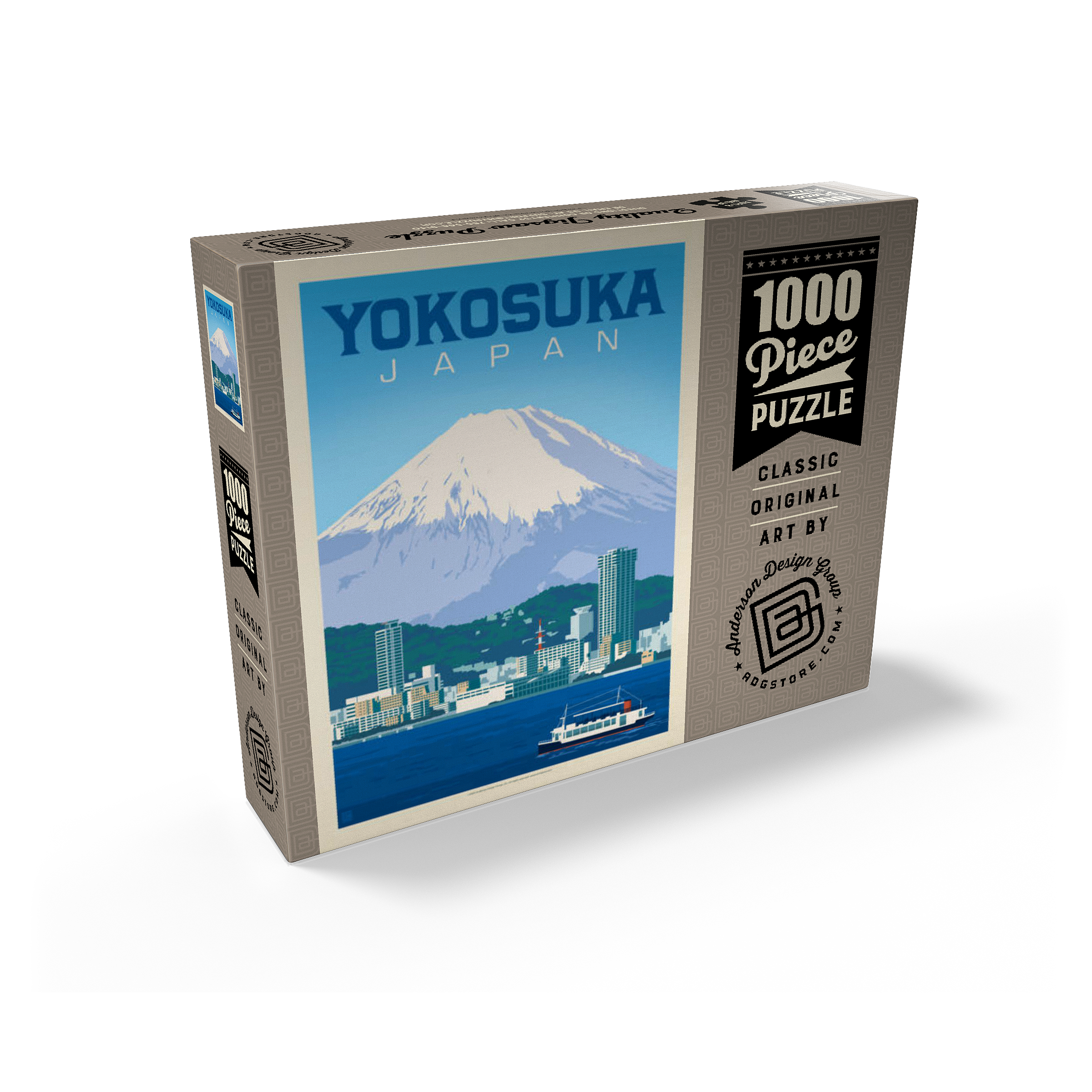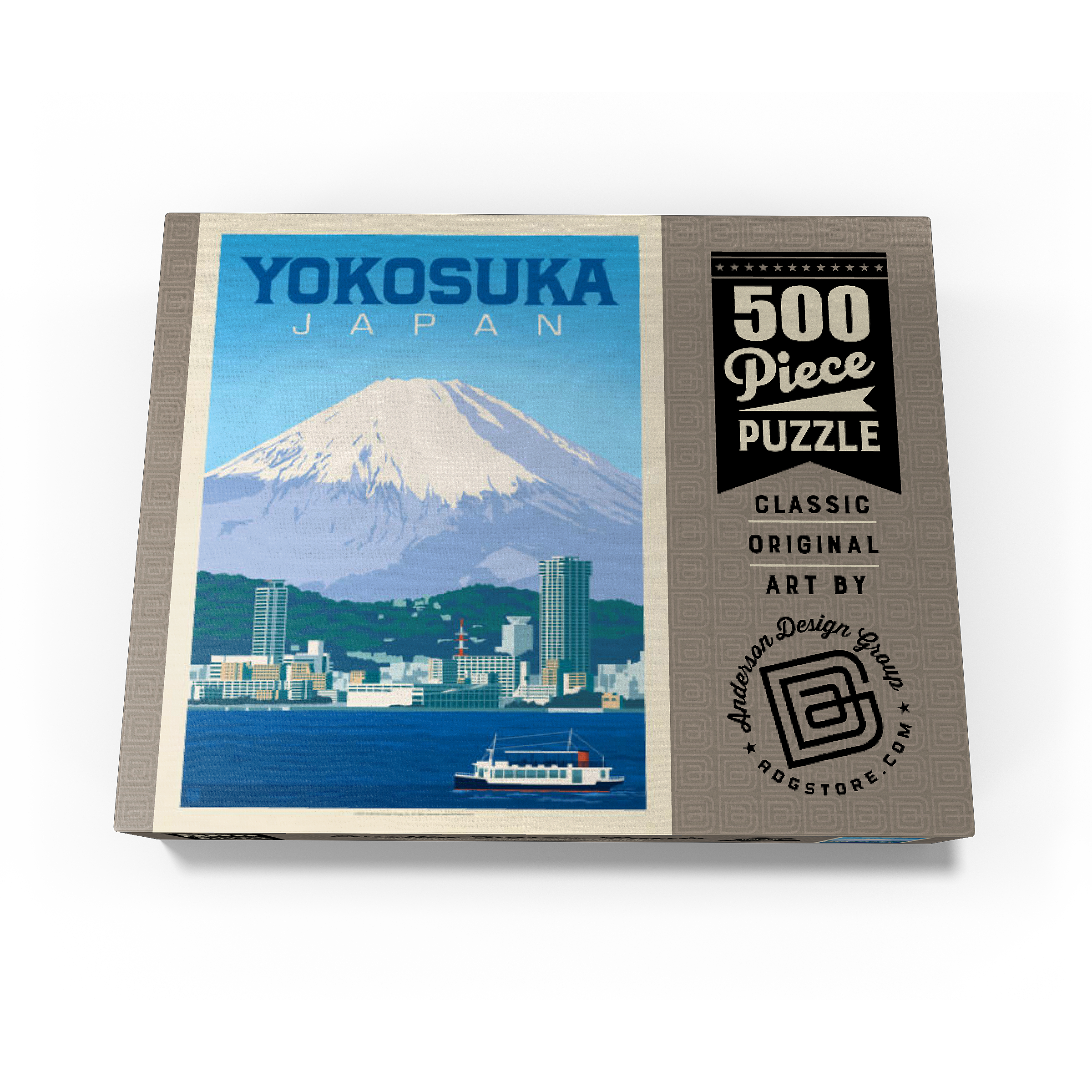 This vibrant artwork captures the coastal city of Yokosuka, Japan, with its modern skyline set against the majestic backdrop of snow-capped Mount Fuji. A ferry glides across the deep blue waters of Tokyo Bay, highlighting Yokosuka's maritime heritage and its role as a key naval port. The lush green hills and urban buildings below Mount Fuji emphasize the city's unique balance of nature and development. Known for its strategic importance and scenic views, Yokosuka offers a stunning perspective on Japan's coastal charm and iconic mountain landscapes in a clean, stylized composition.
