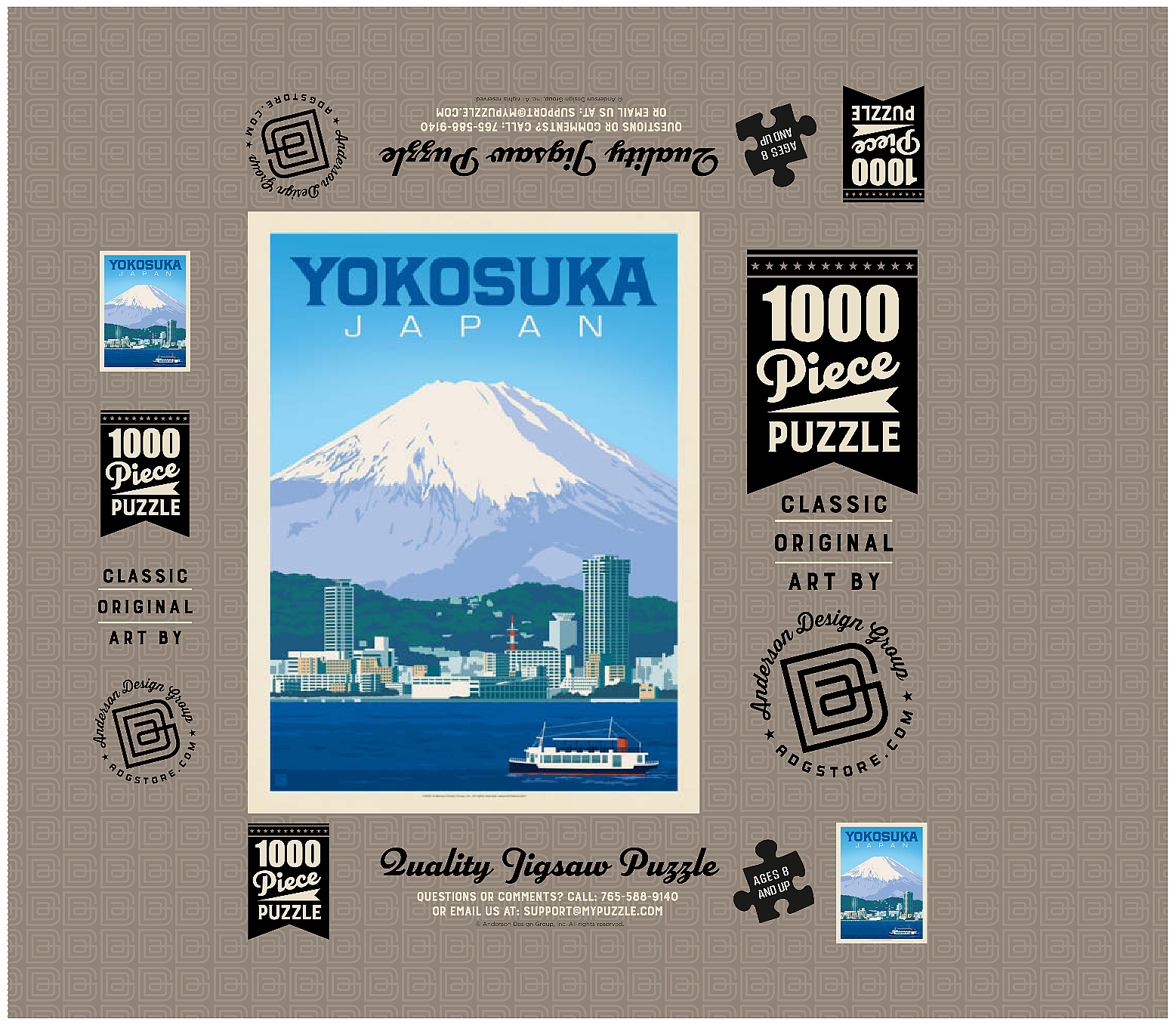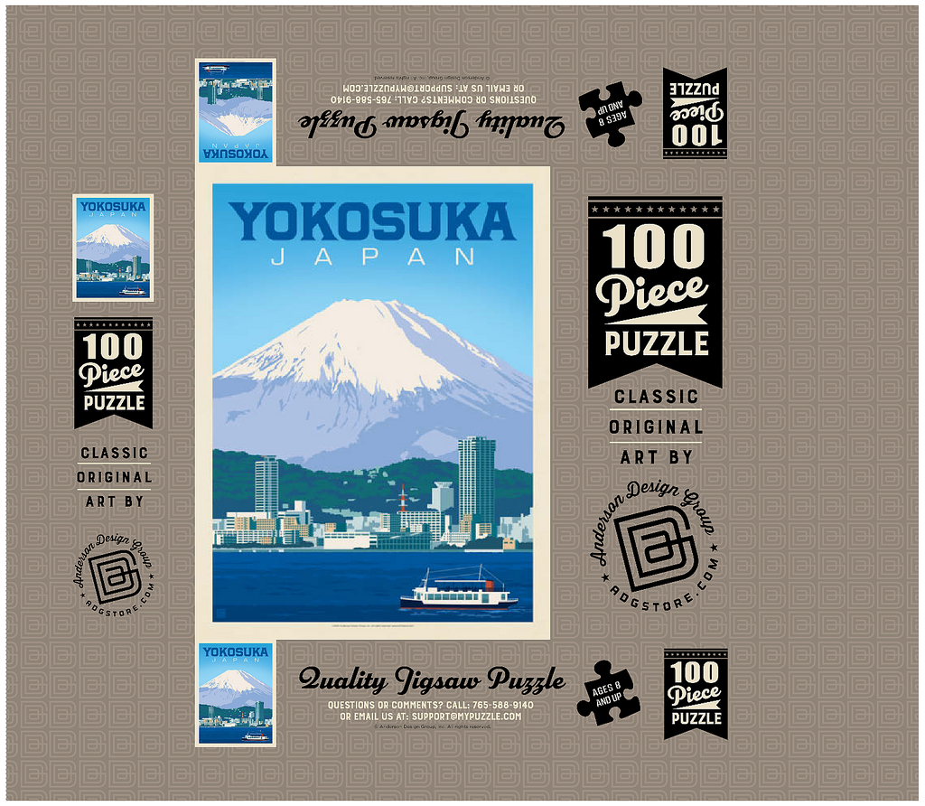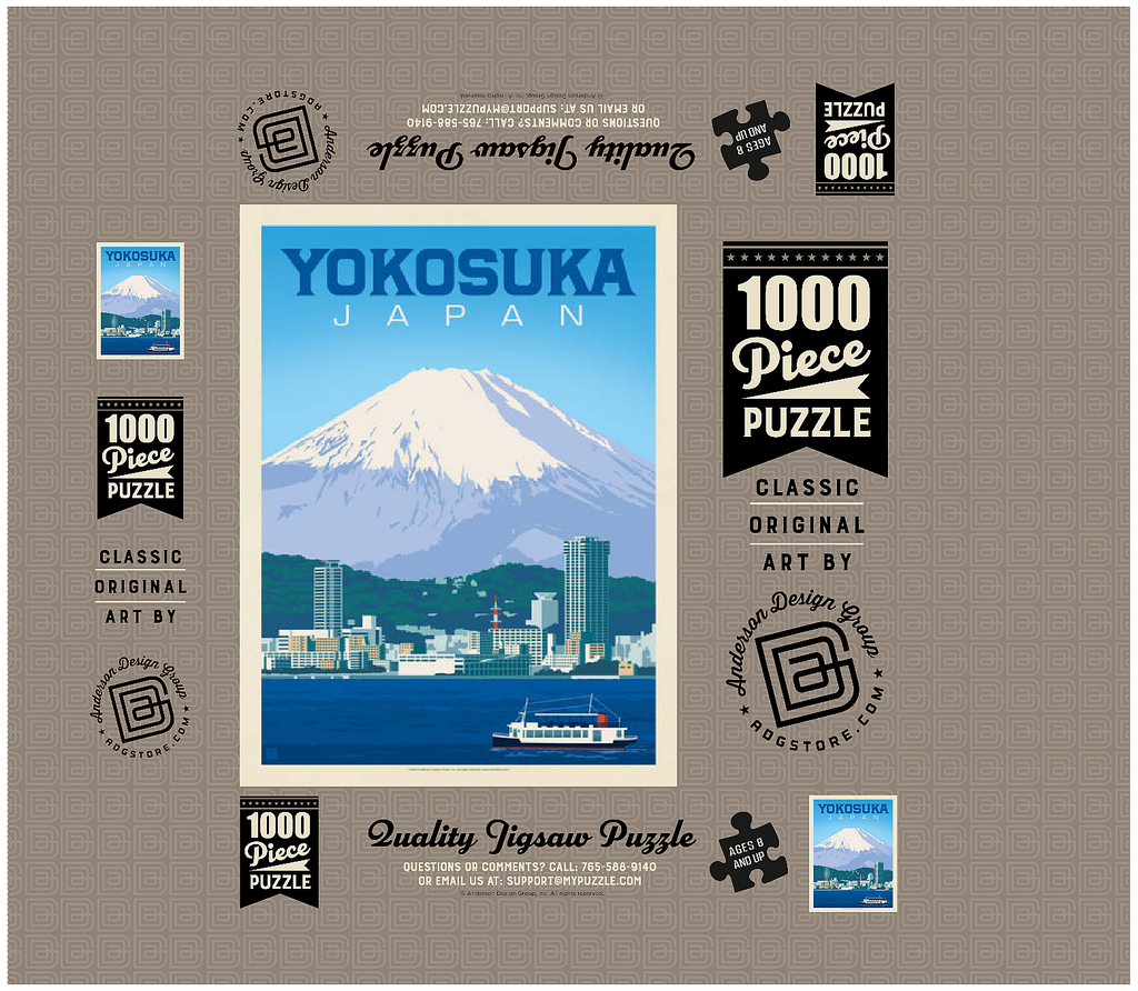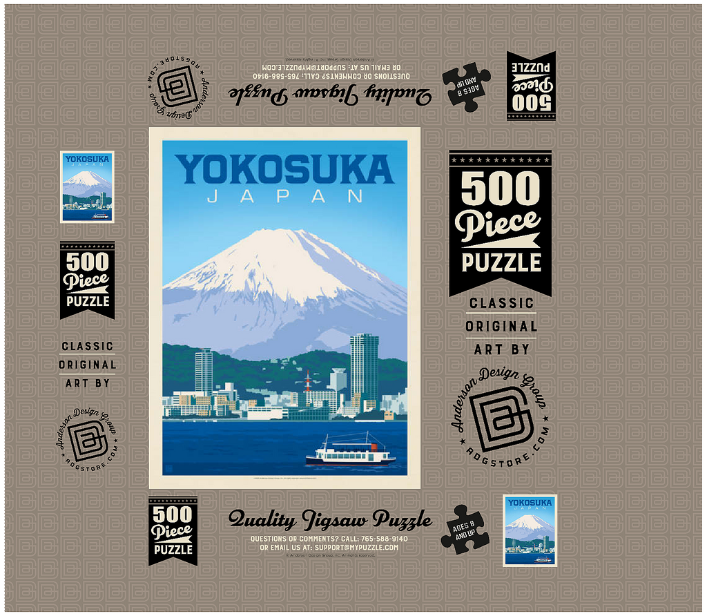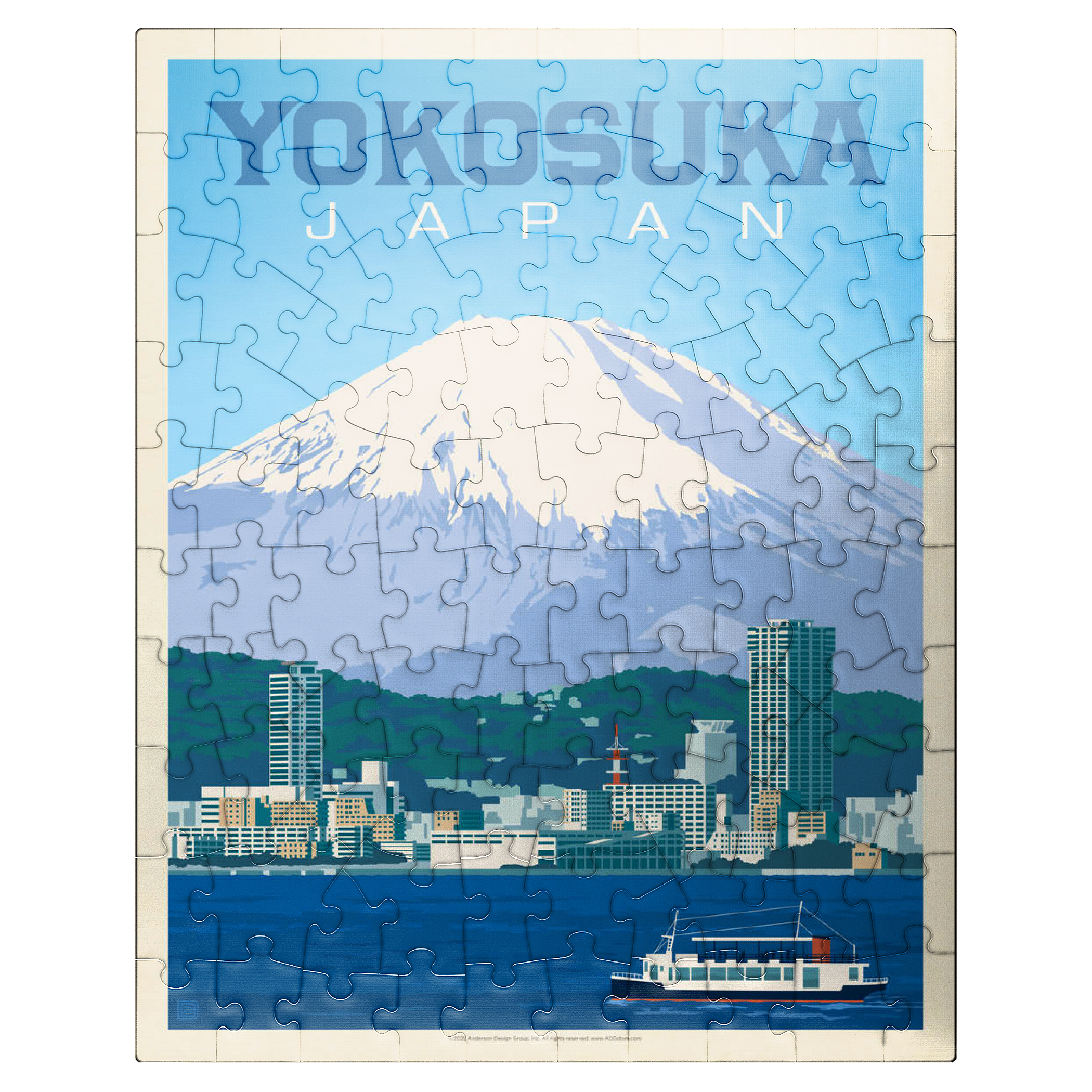 This vibrant artwork captures the coastal city of Yokosuka, Japan, with its modern skyline set against the majestic backdrop of snow-capped Mount Fuji. A ferry glides across the deep blue waters of Tokyo Bay, highlighting Yokosuka's maritime heritage and its role as a key naval port. The lush green hills and urban buildings below Mount Fuji emphasize the city's unique balance of nature and development. Known for its strategic importance and scenic views, Yokosuka offers a stunning perspective on Japan's coastal charm and iconic mountain landscapes in a clean, stylized composition.