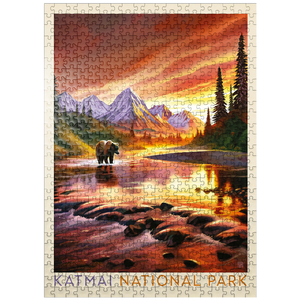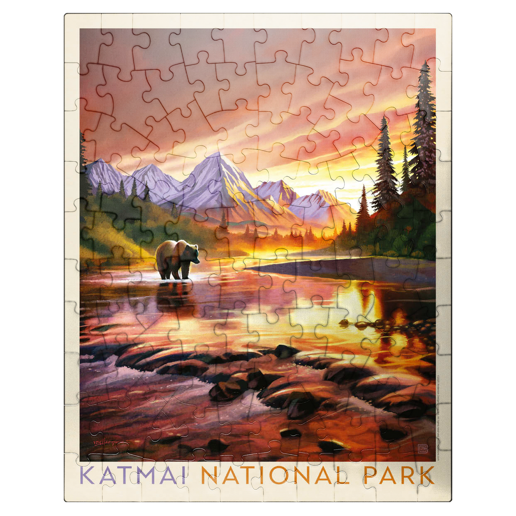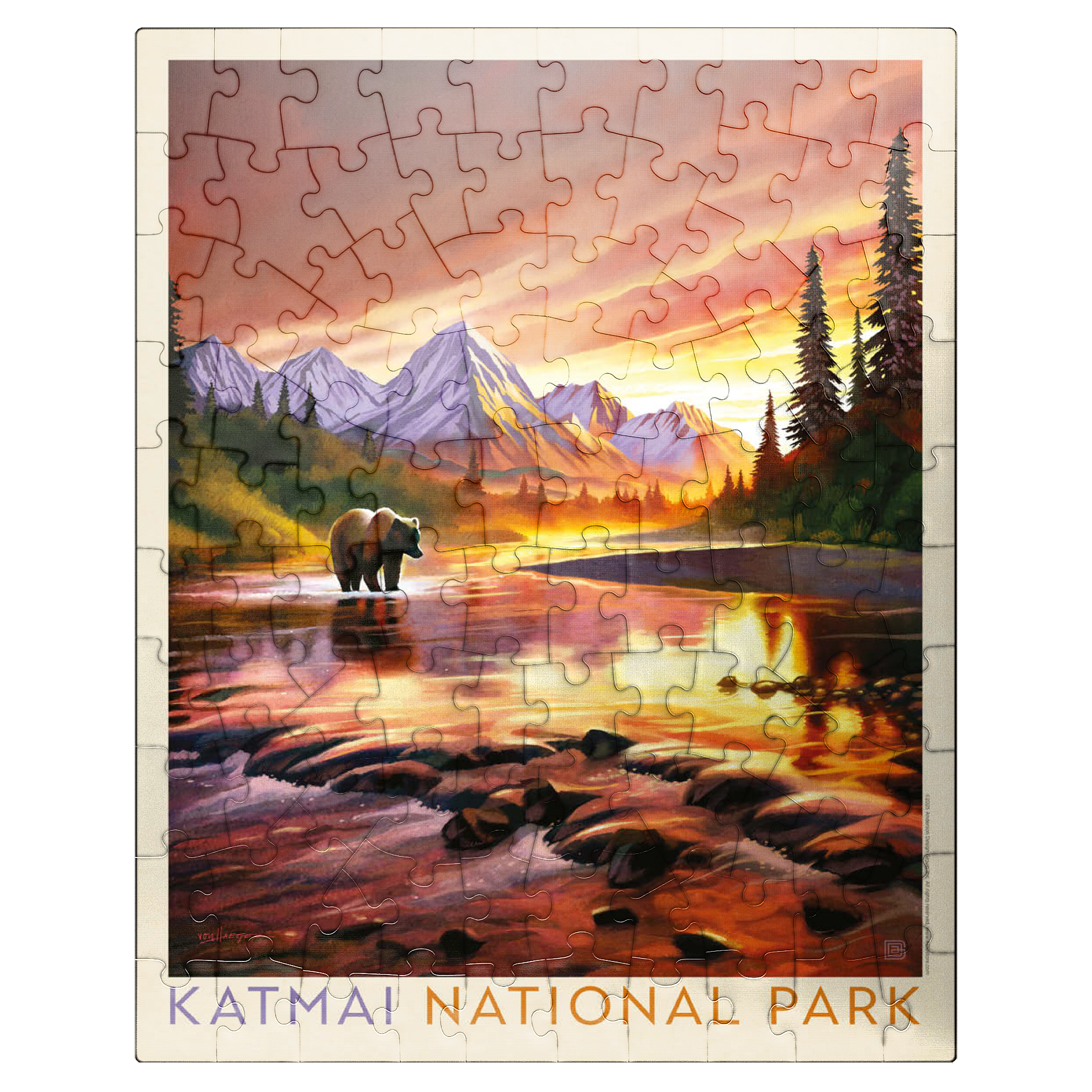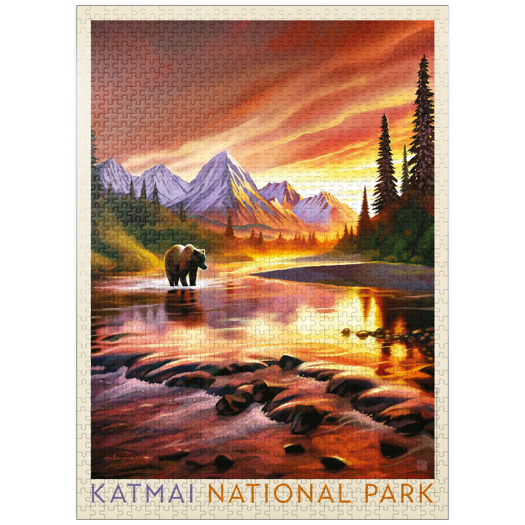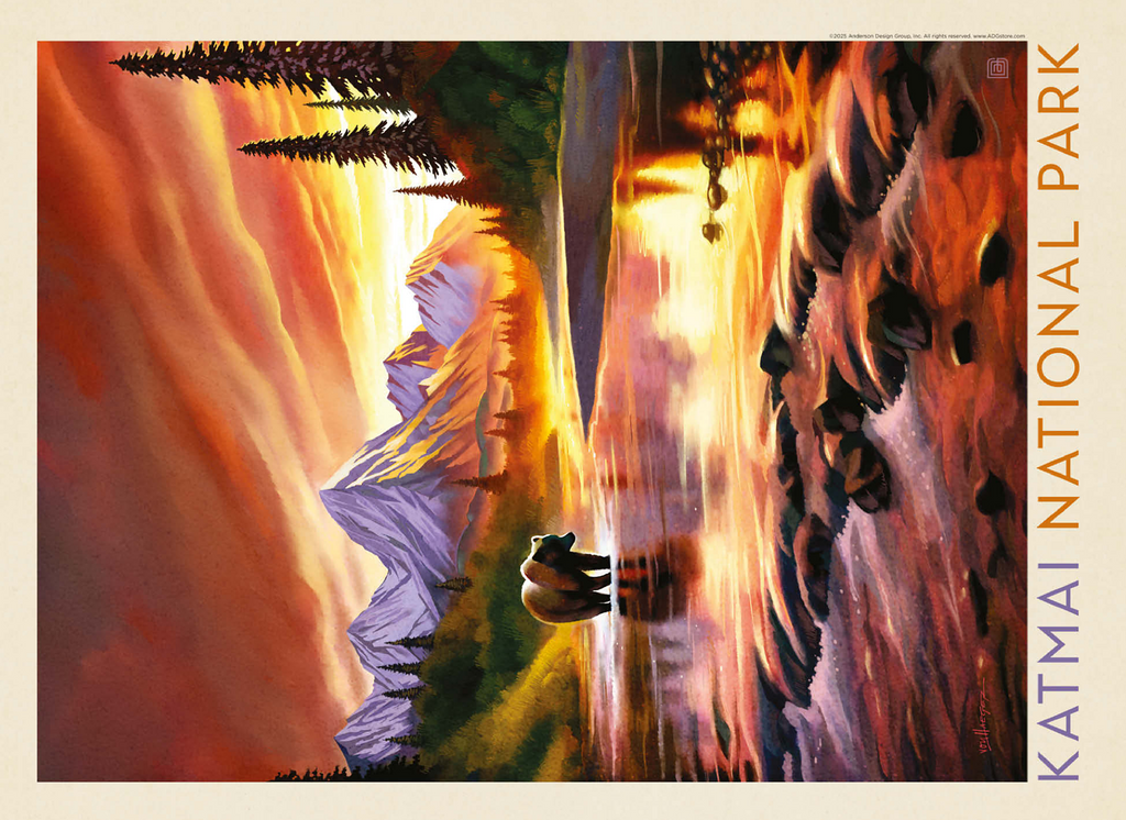 Katmai National Park in Alaska is vividly portrayed with a majestic grizzly bear standing in a reflective river at sunset. the golden-orange sky glows behind rugged snowcapped peaks, casting warm light across the water and surrounding forest. the tranquil scene highlights the park's breathtaking wilderness, where towering mountains and pristine rivers create a haven for wildlife. this artistic depiction captures the powerful yet peaceful presence of the Alaskan bear against a backdrop of dramatic colors and serene natural beauty. the balance of glowing light, rugged terrain, and wild solitude embodies the untamed spirit of Katmai's landscapes at dusk.