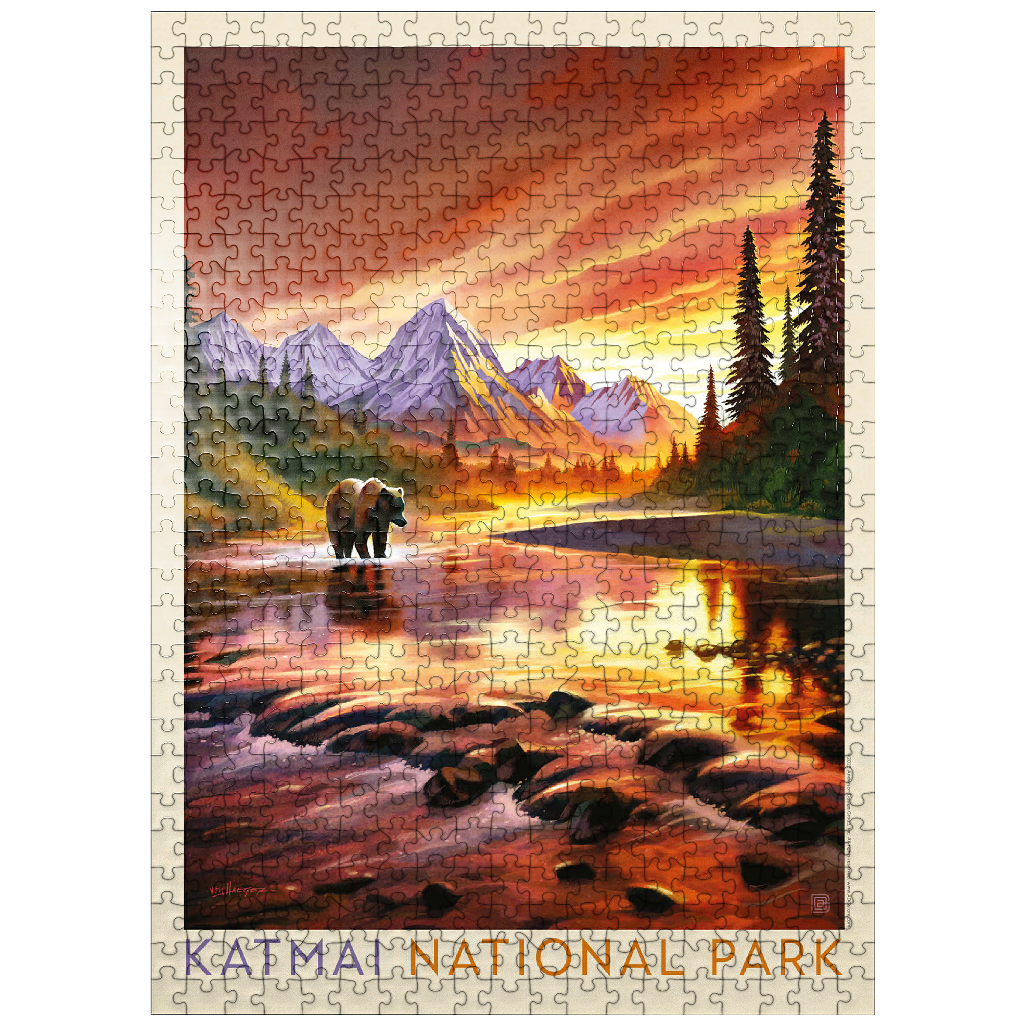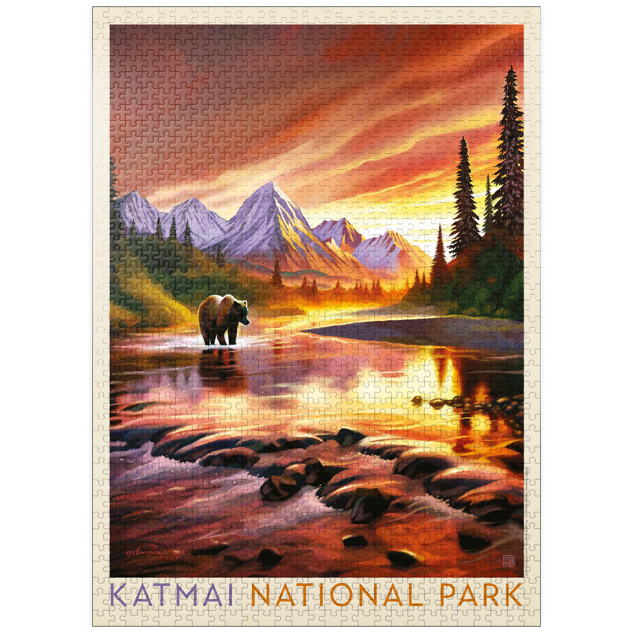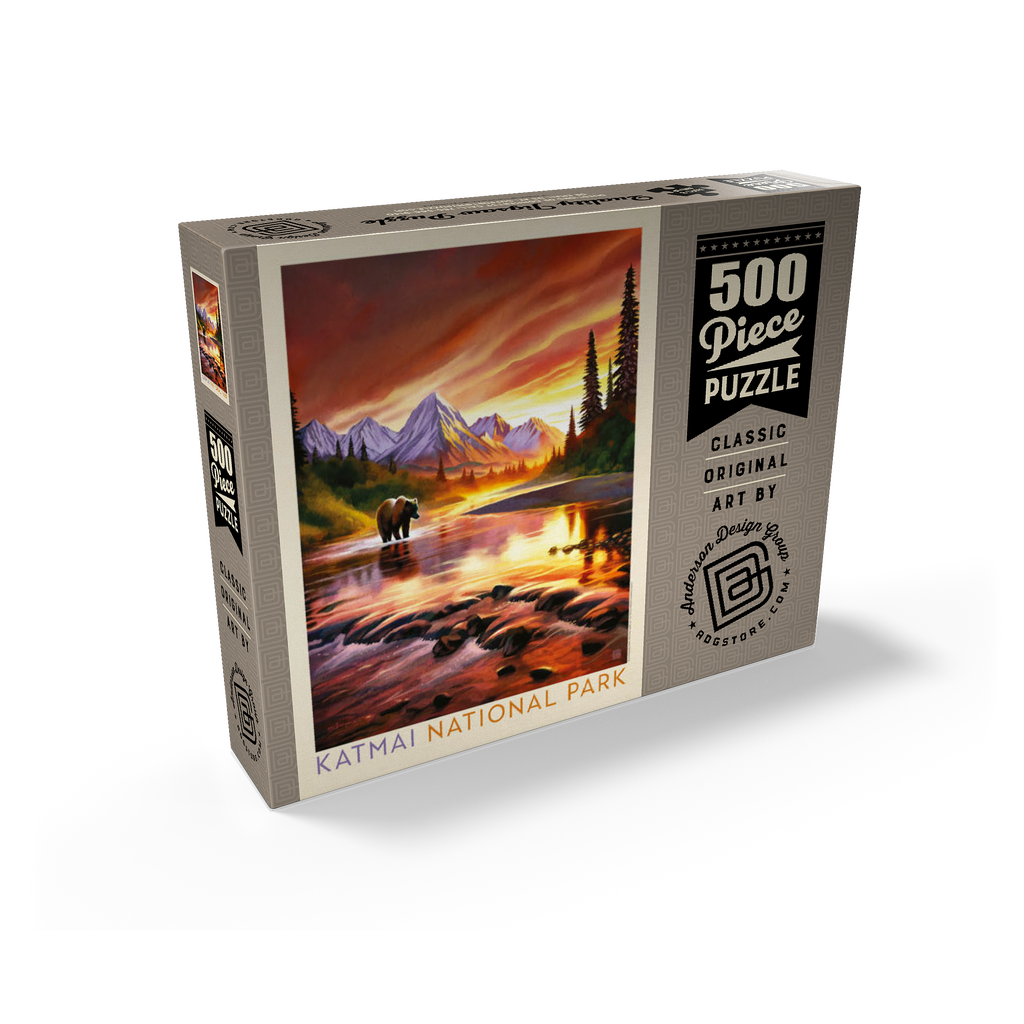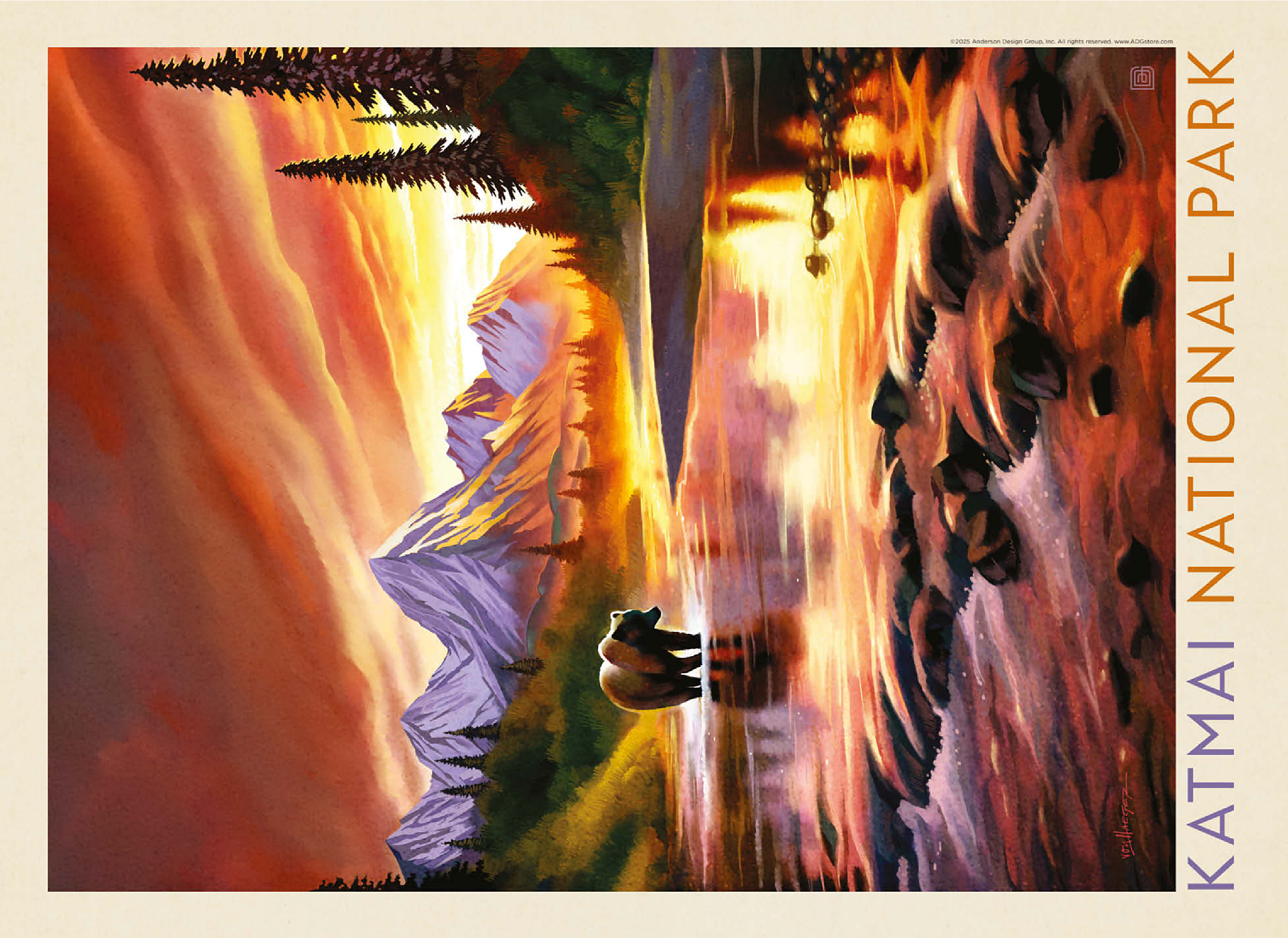 Katmai National Park in Alaska is vividly portrayed with a majestic grizzly bear standing in a reflective river at sunset. the golden-orange sky glows behind rugged snowcapped peaks, casting warm light across the water and surrounding forest. the tranquil scene highlights the park's breathtaking wilderness, where towering mountains and pristine rivers create a haven for wildlife. this artistic depiction captures the powerful yet peaceful presence of the Alaskan bear against a backdrop of dramatic colors and serene natural beauty. the balance of glowing light, rugged terrain, and wild solitude embodies the untamed spirit of Katmai's landscapes at dusk.