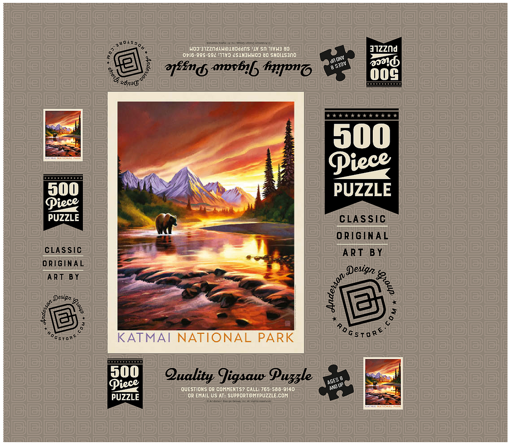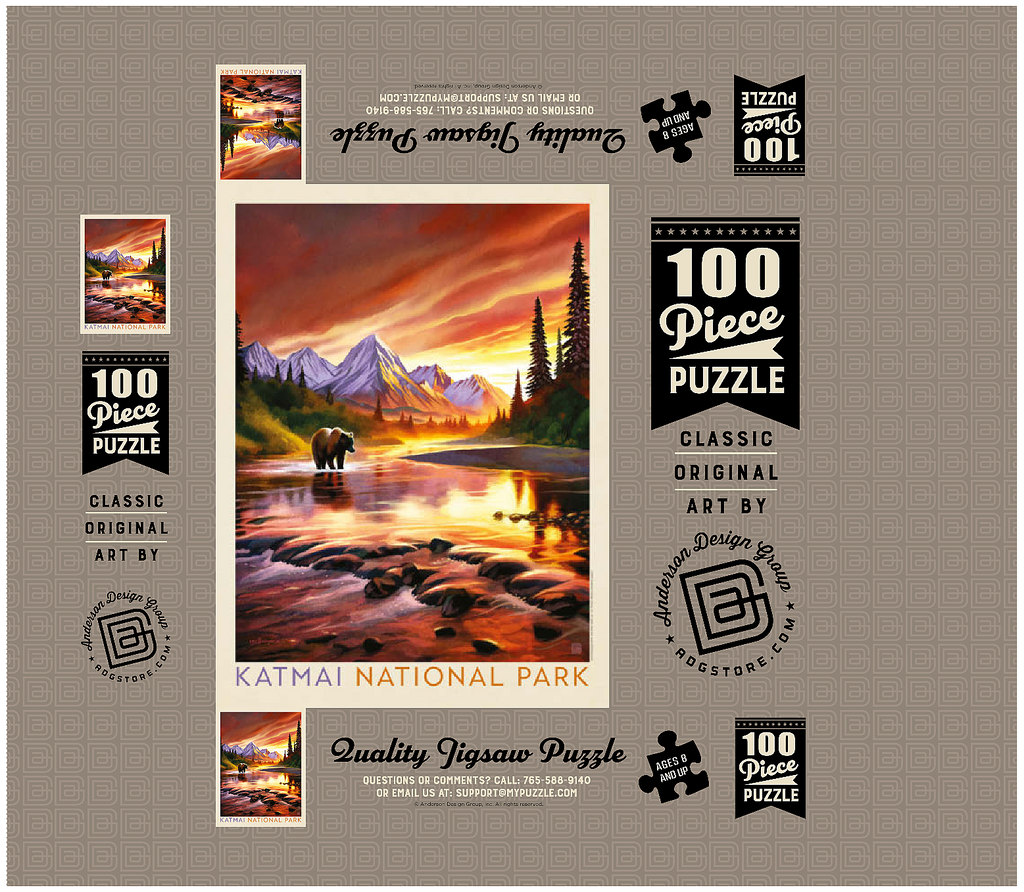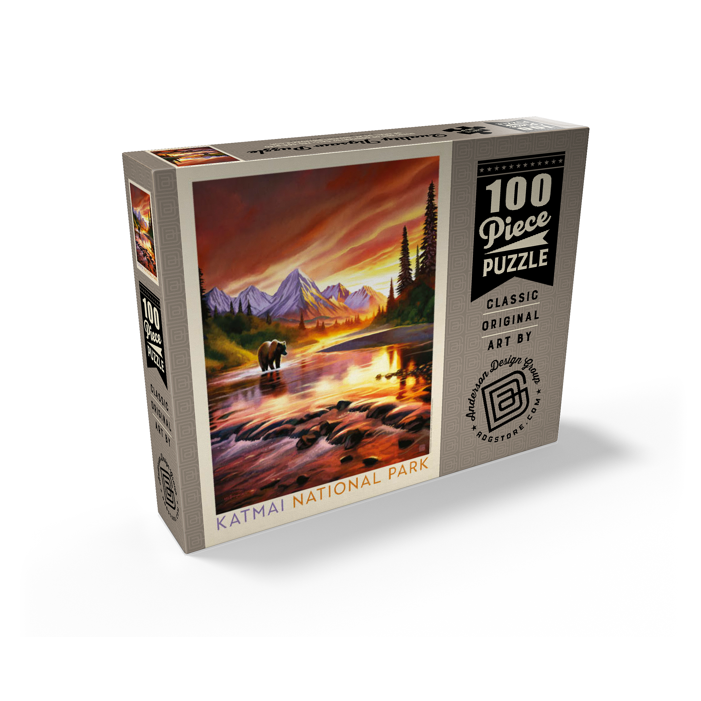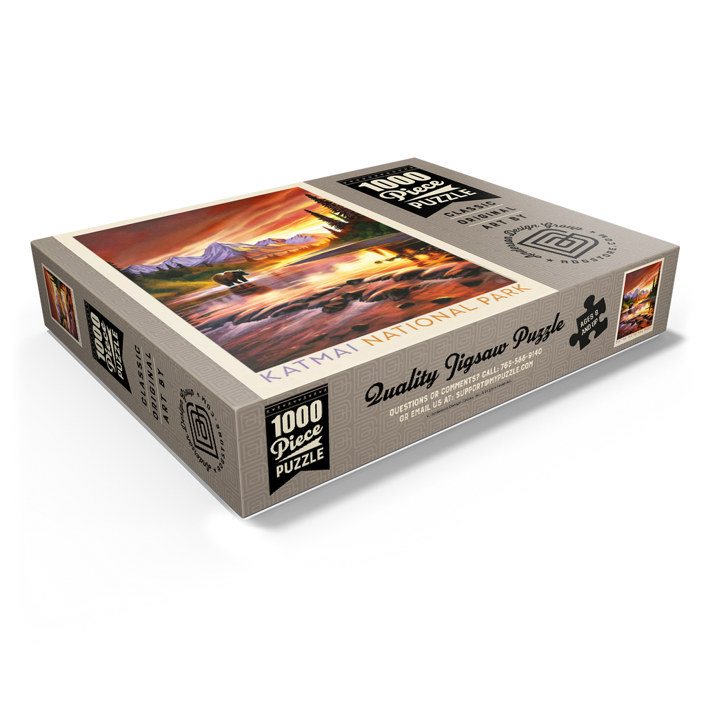 Katmai National Park in Alaska is vividly portrayed with a majestic grizzly bear standing in a reflective river at sunset. the golden-orange sky glows behind rugged snowcapped peaks, casting warm light across the water and surrounding forest. the tranquil scene highlights the park's breathtaking wilderness, where towering mountains and pristine rivers create a haven for wildlife. this artistic depiction captures the powerful yet peaceful presence of the Alaskan bear against a backdrop of dramatic colors and serene natural beauty. the balance of glowing light, rugged terrain, and wild solitude embodies the untamed spirit of Katmai's landscapes at dusk.