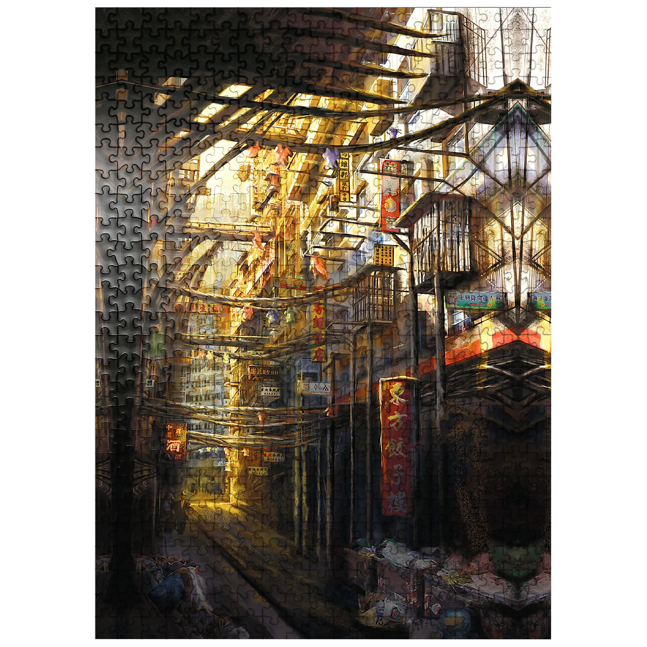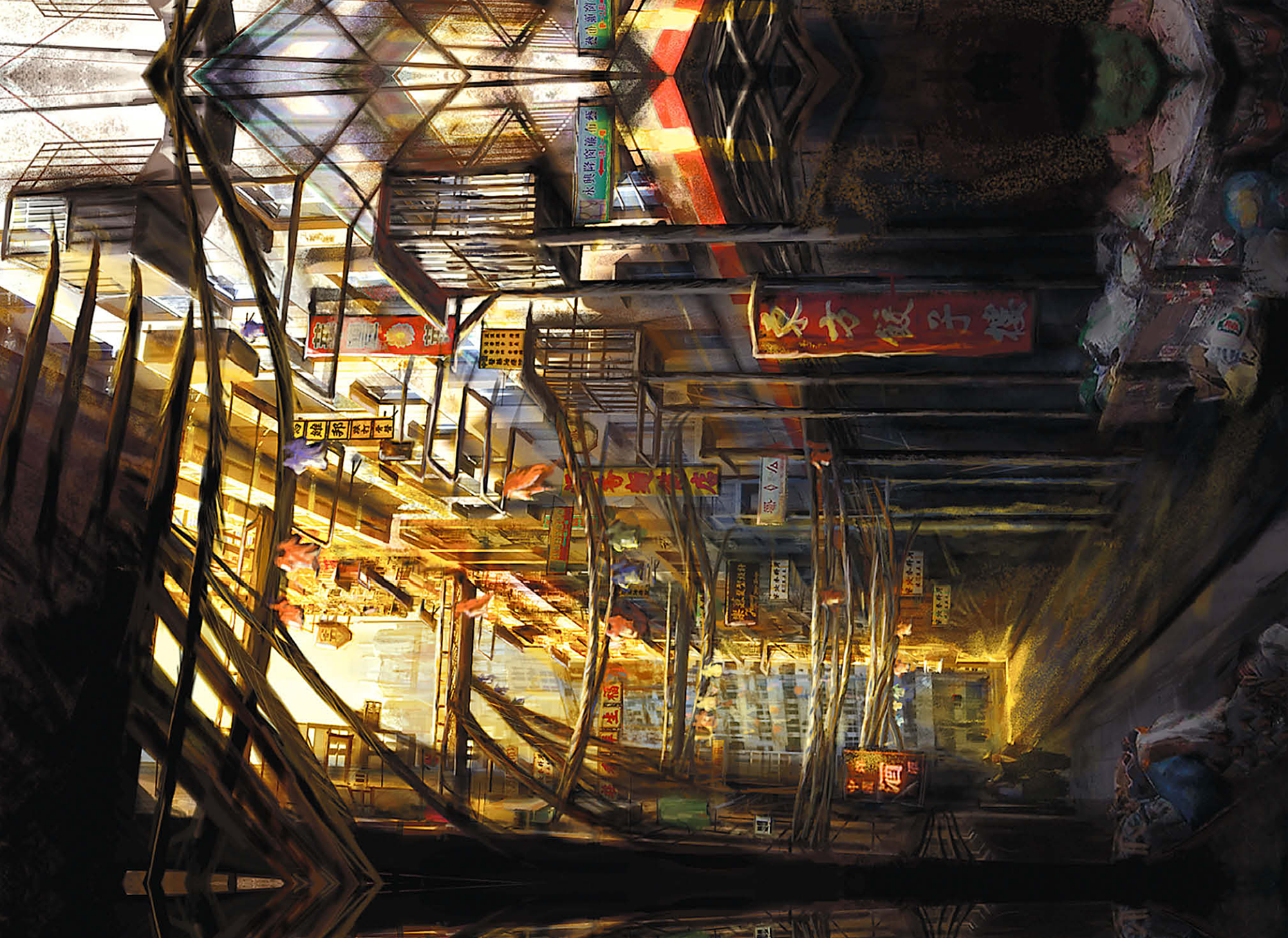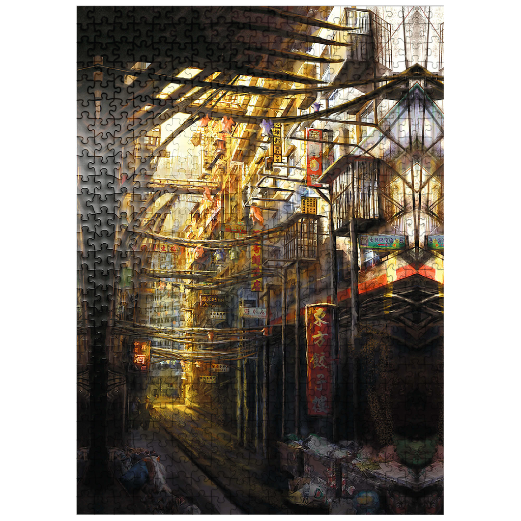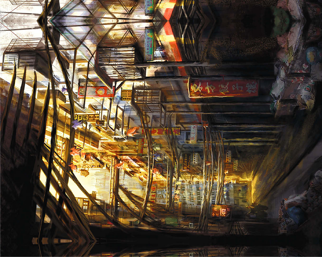 Kowloon is a cyberpunk cityscape that pays tribute to the gritty intensity of 1980s Kowloon Walled City, reimagined with earthy tones of yellow, red, black, and rust. the painting captures a dense urban labyrinth-stacked apartments, tangled wires, and glowing signage-conveying a raw energy that pulses through the narrow alleys. unlike the sleek neon visions of the future, this work embraces a grounded, analog aesthetic where decay and life coexist. smoky air and dim lantern light give the scene a cinematic feel, blending history with speculative fiction. Kowloon is both a dystopian dream and a nostalgic homage to vanished urban chaos.