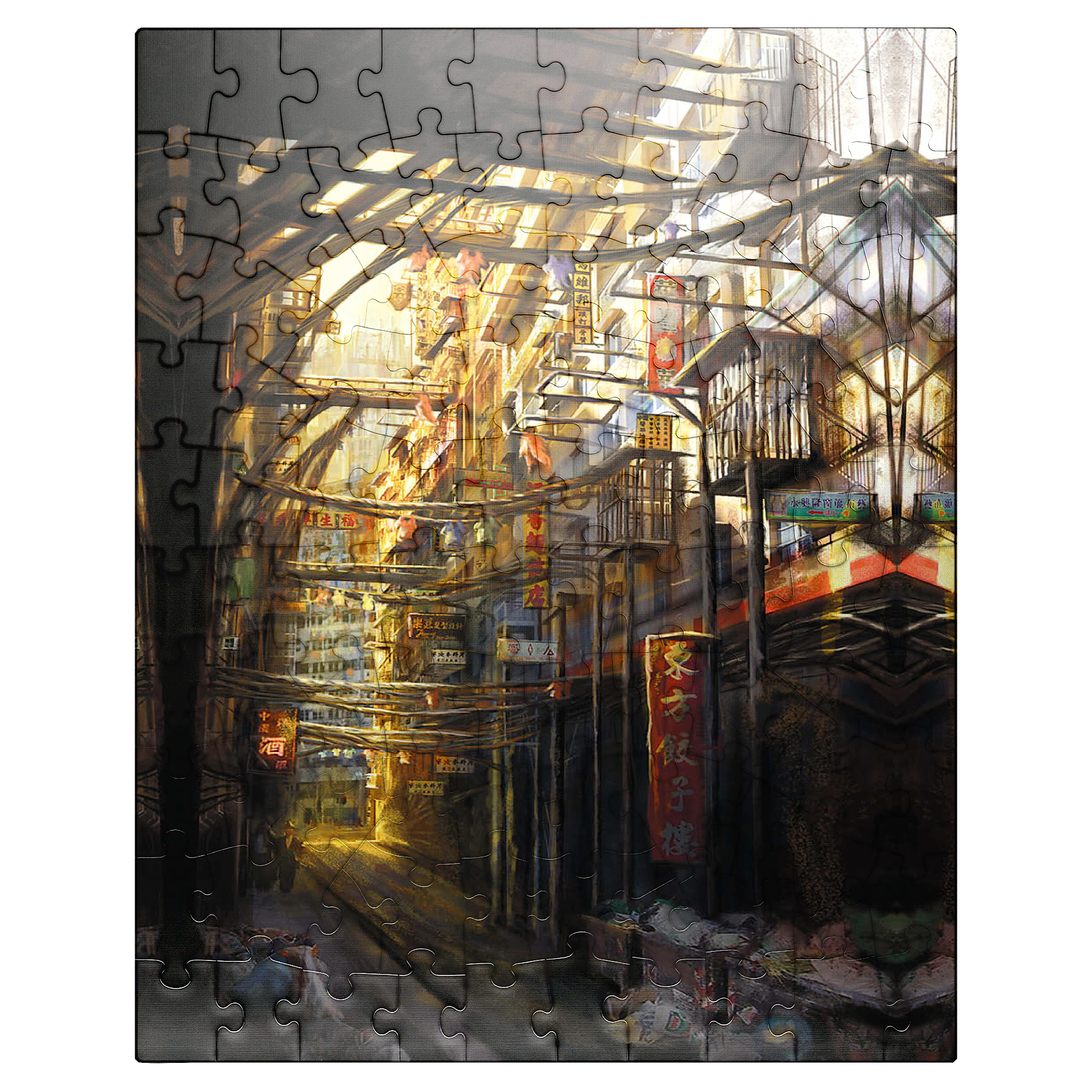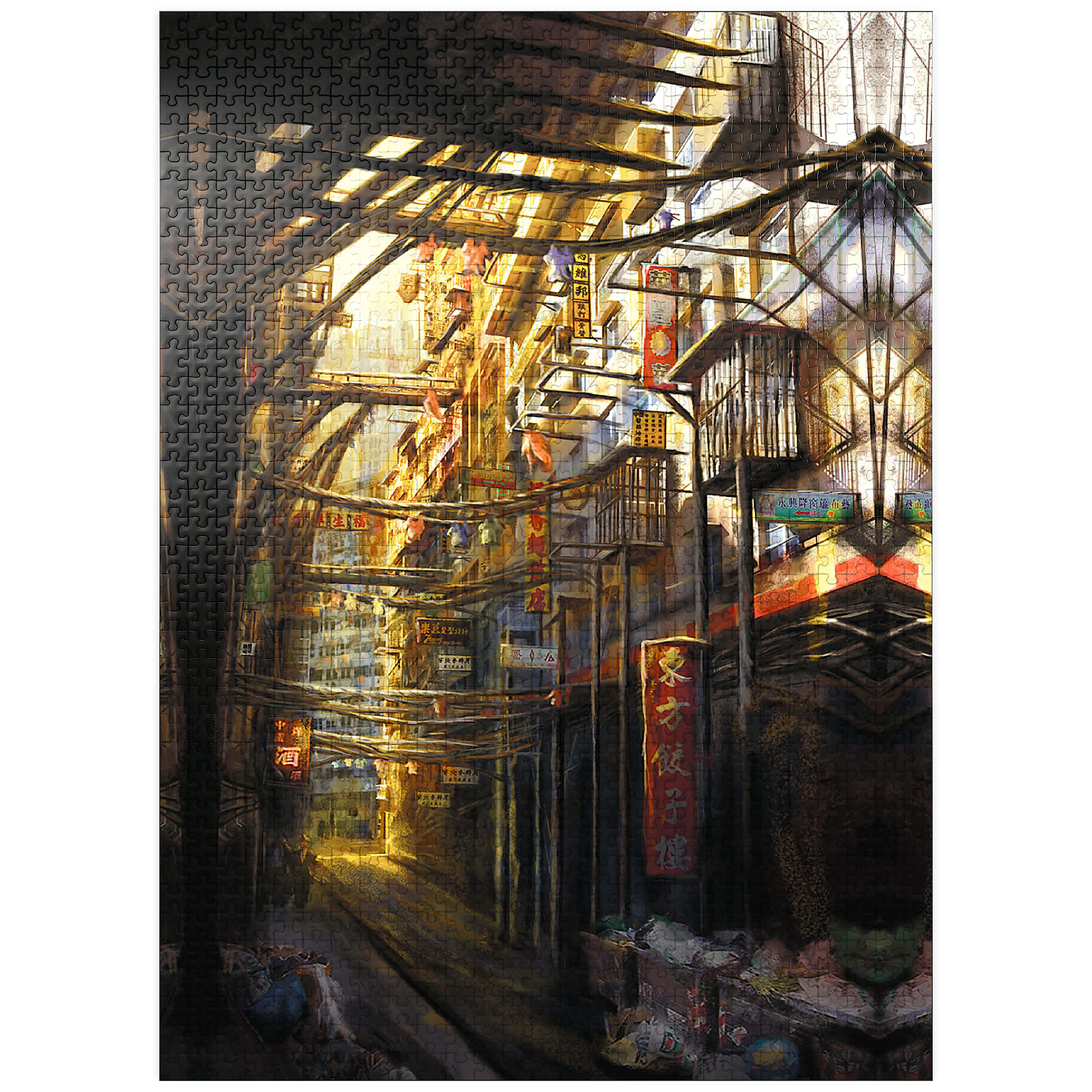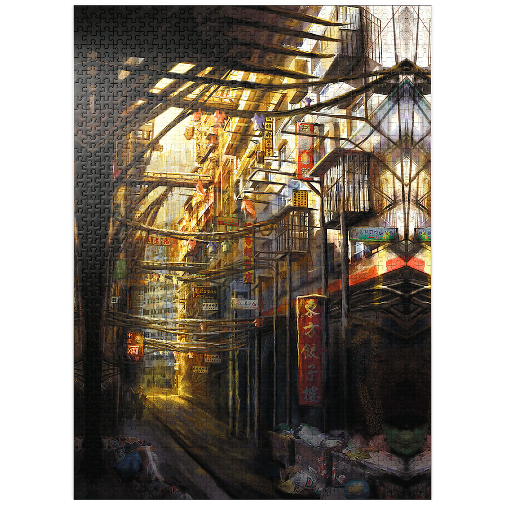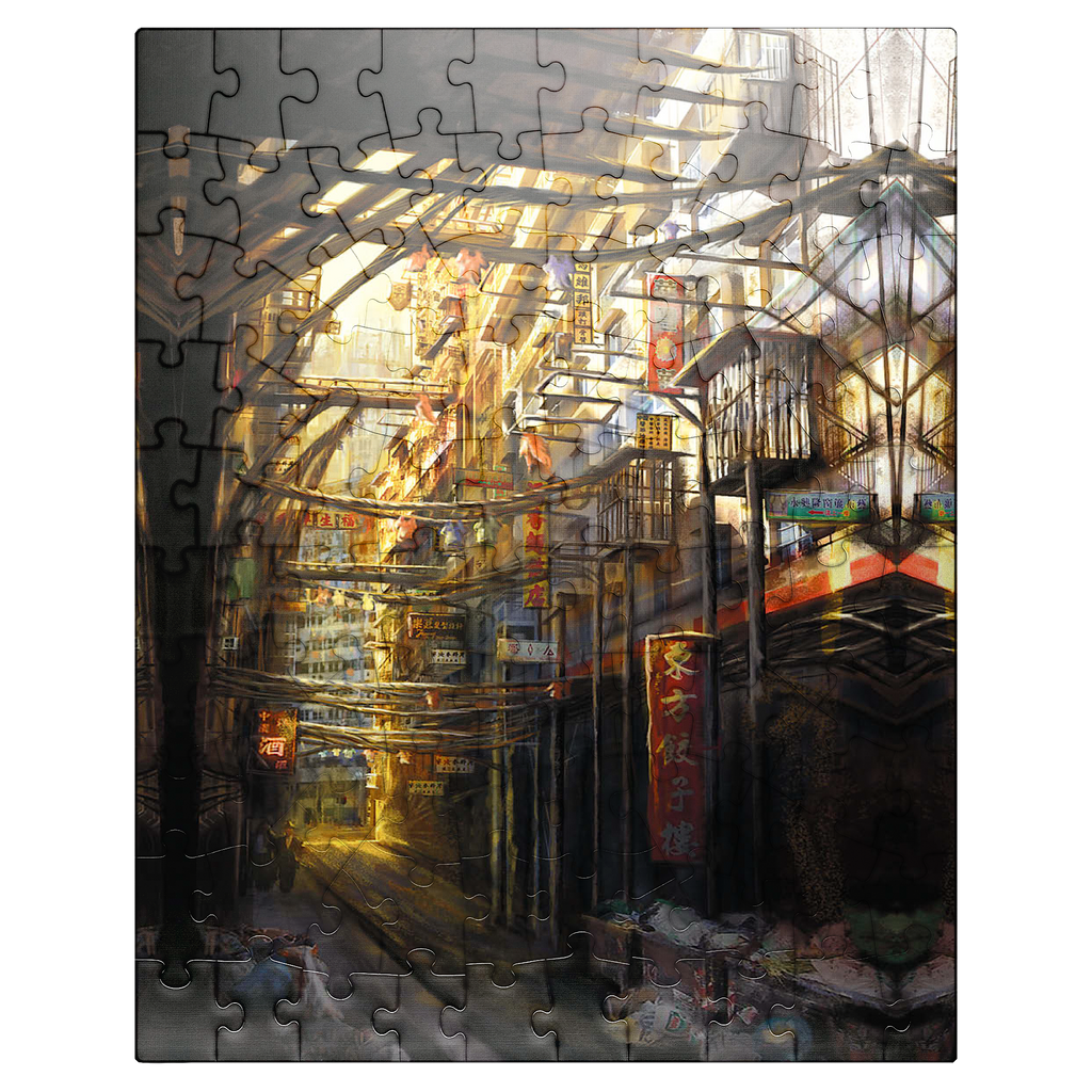 Kowloon is a cyberpunk cityscape that pays tribute to the gritty intensity of 1980s Kowloon Walled City, reimagined with earthy tones of yellow, red, black, and rust. the painting captures a dense urban labyrinth-stacked apartments, tangled wires, and glowing signage-conveying a raw energy that pulses through the narrow alleys. unlike the sleek neon visions of the future, this work embraces a grounded, analog aesthetic where decay and life coexist. smoky air and dim lantern light give the scene a cinematic feel, blending history with speculative fiction. Kowloon is both a dystopian dream and a nostalgic homage to vanished urban chaos.