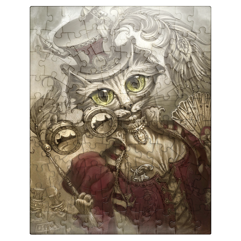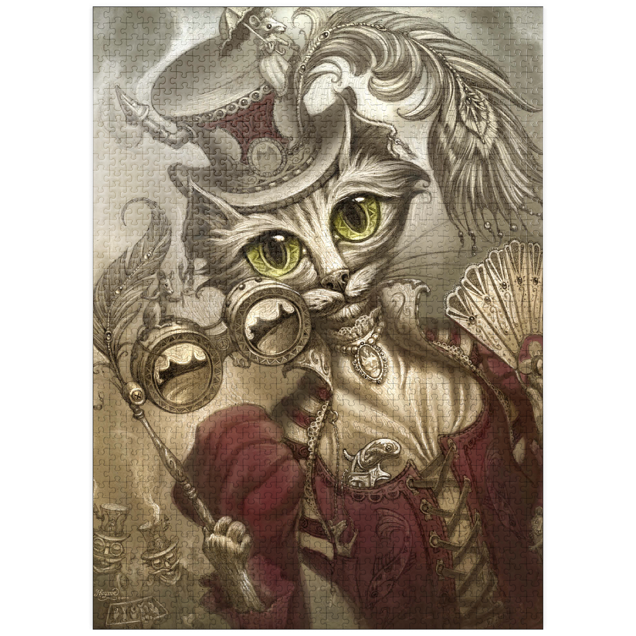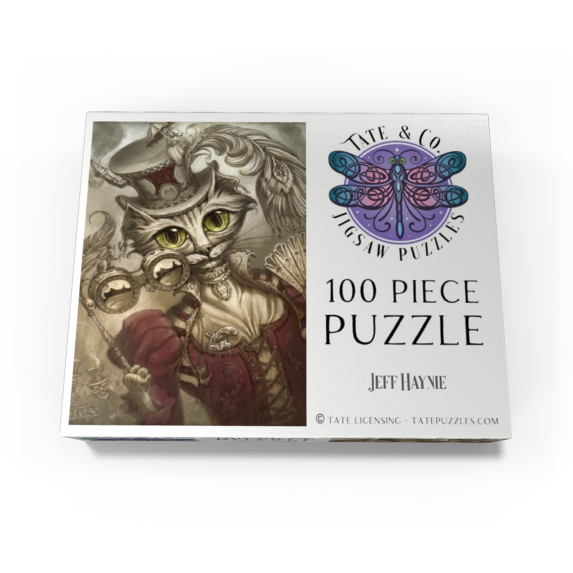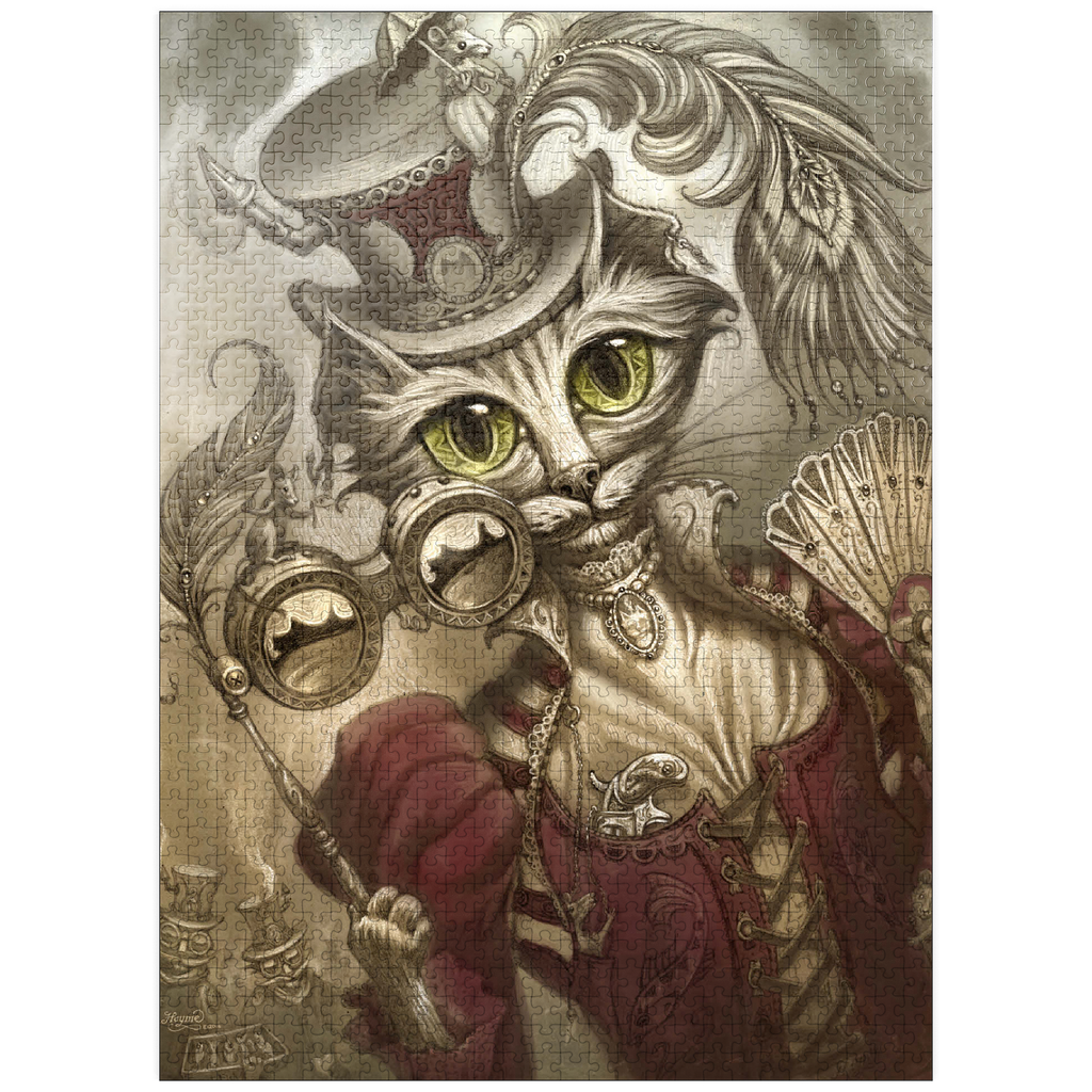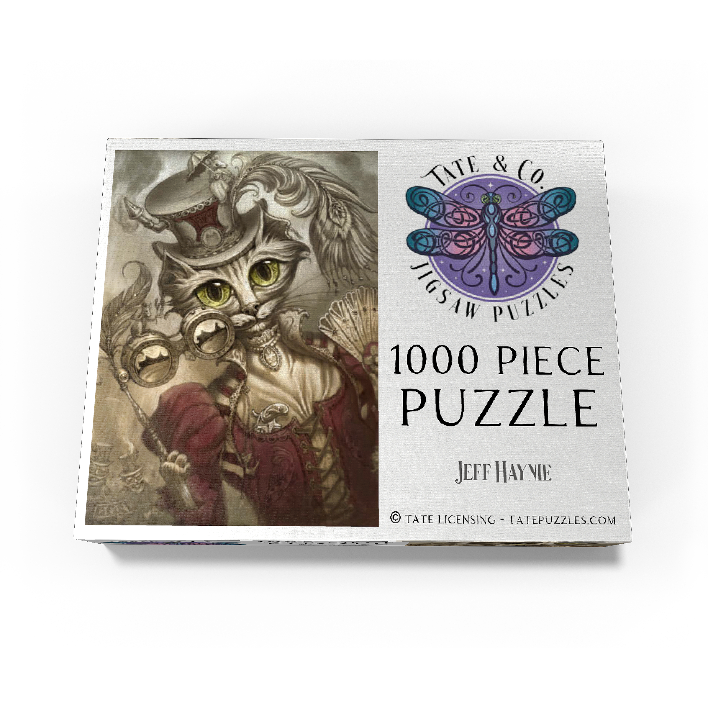 Jeff Haynie's artwork presents a Steampunk lady cat adorned with eccentric finery, surrounded by whimsical details.in the frame of Jeff Haynie's detailed painting, a cat with striking yellow eyes is dressed in elaborate Victorian-era attire