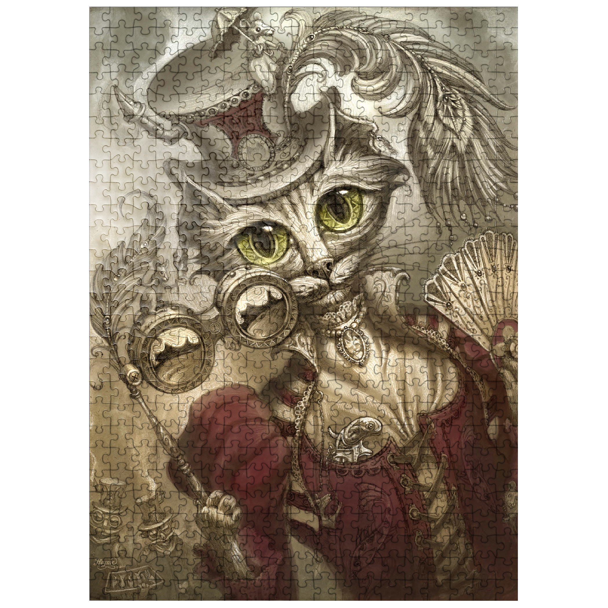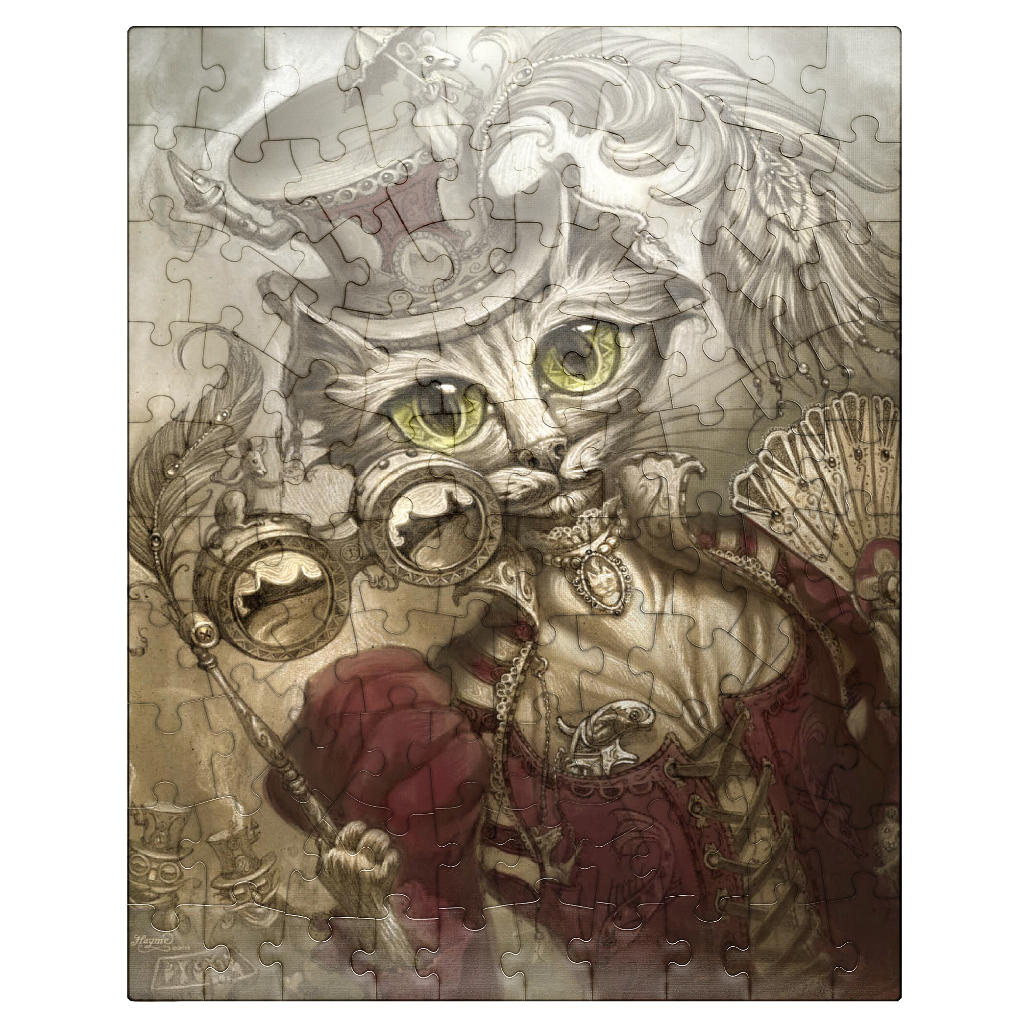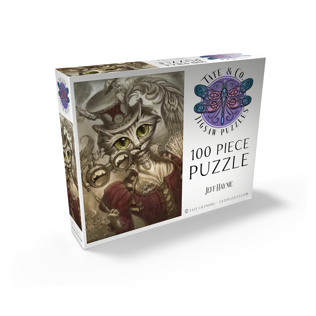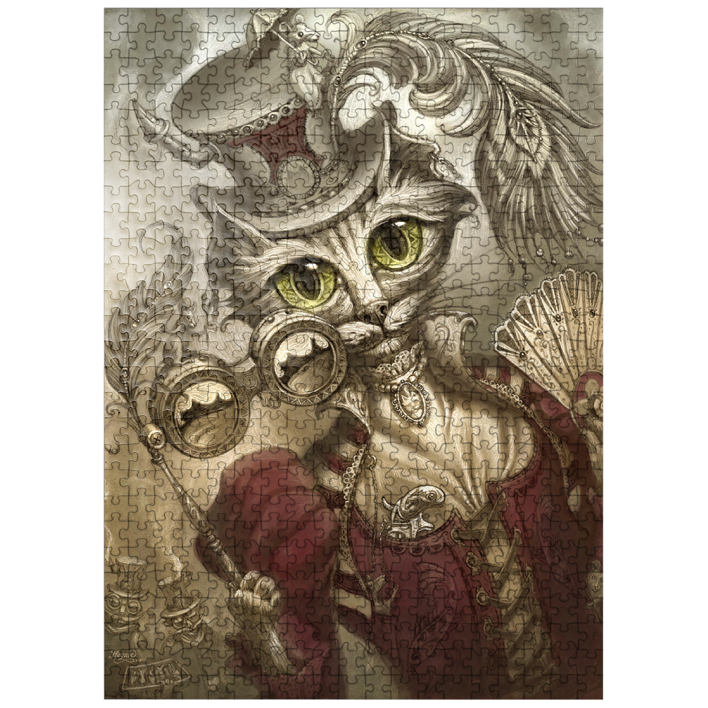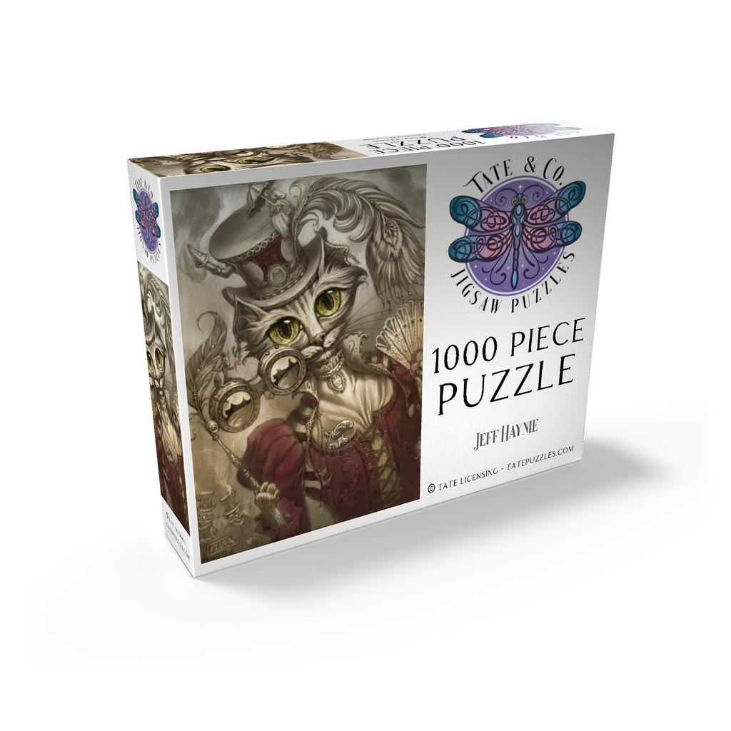 Jeff Haynie's artwork presents a Steampunk lady cat adorned with eccentric finery, surrounded by whimsical details.in the frame of Jeff Haynie's detailed painting, a cat with striking yellow eyes is dressed in elaborate Victorian-era attire