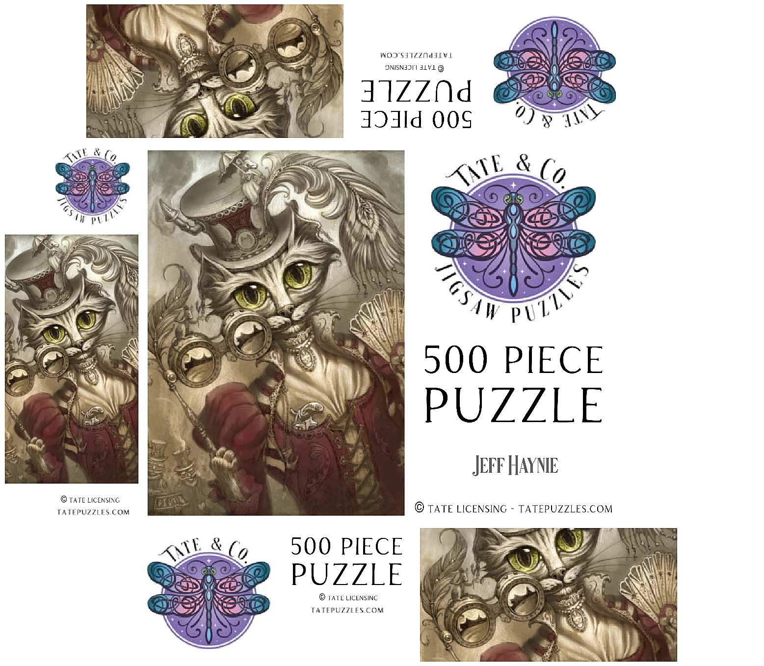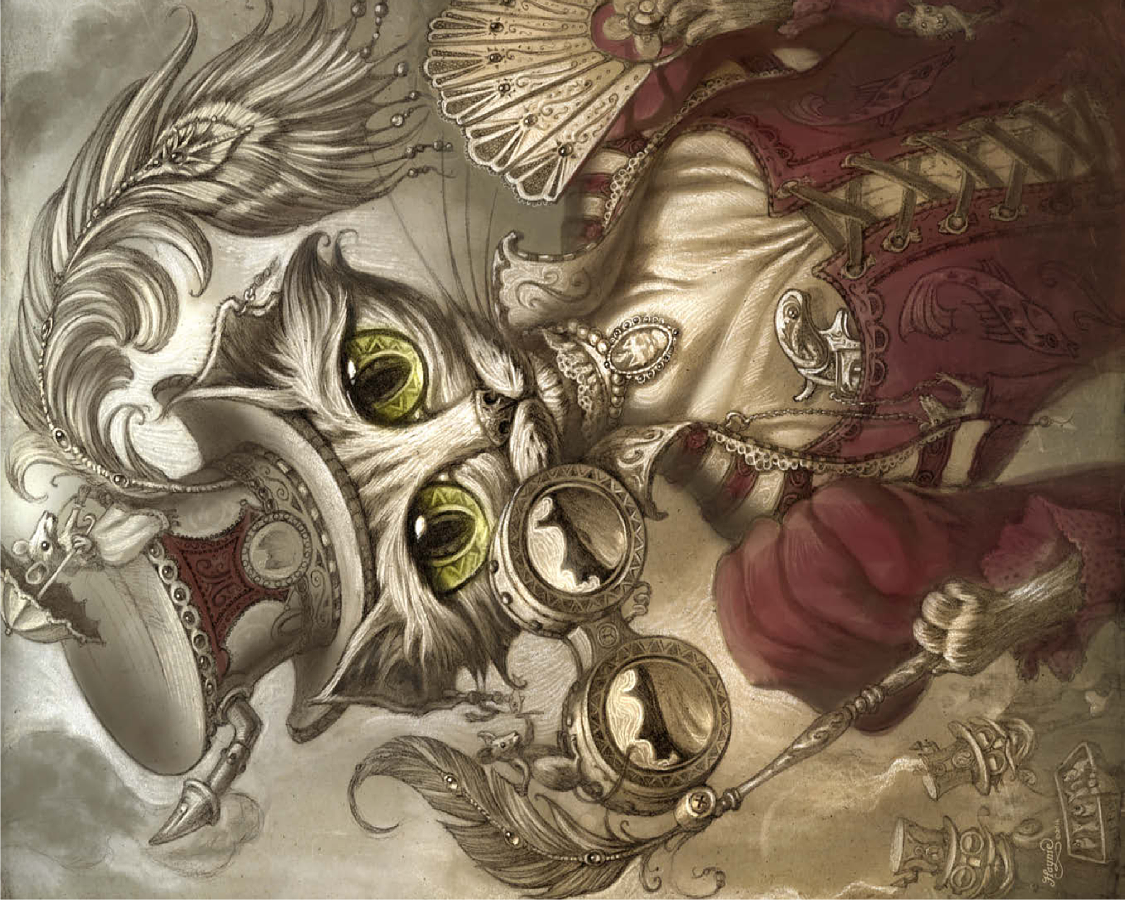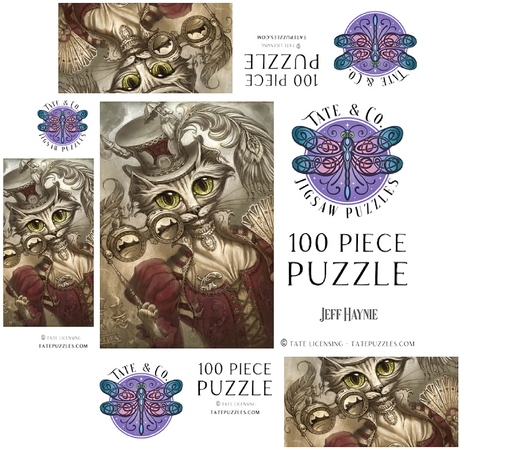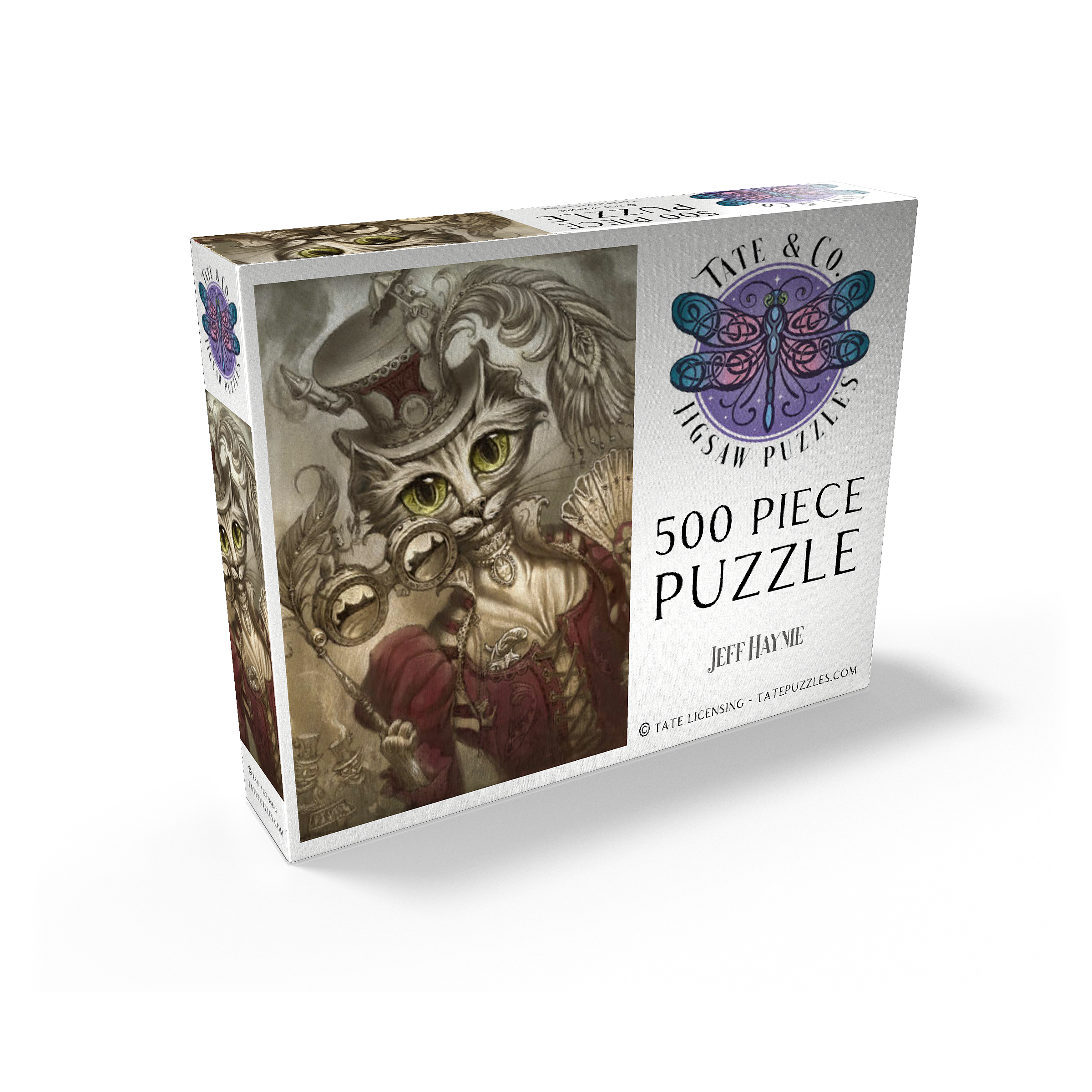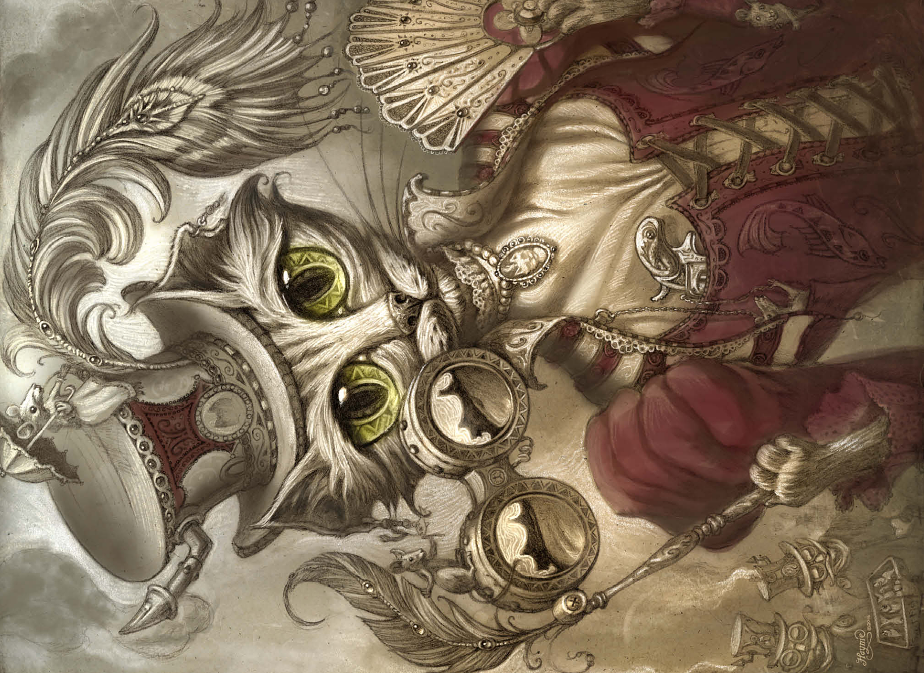 Jeff Haynie's artwork presents a Steampunk lady cat adorned with eccentric finery, surrounded by whimsical details.in the frame of Jeff Haynie's detailed painting, a cat with striking yellow eyes is dressed in elaborate Victorian-era attire