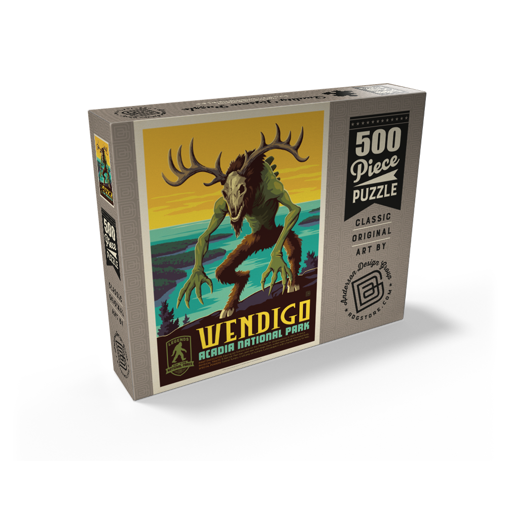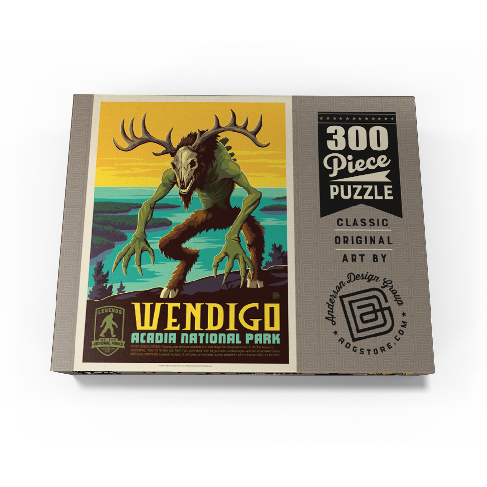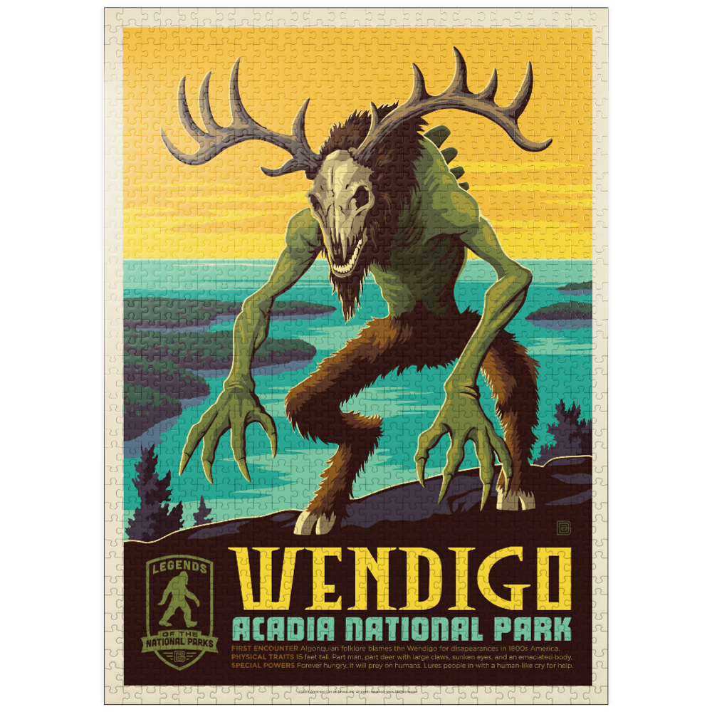 Acadia National Park in Maine USA is featured in a bold retro travel poster style scene on the rugged Atlantic coast of Mount Desert Island, where rocky granite cliffs overlook bright teal tidal waters and dark pine covered islands. A towering antlered Wendigo with a skull like head and long clawed hands dominates the overlook, blending cryptid folklore with classic national parks imagery. The high contrast sunset sky and graphic vintage color palette create a dramatic wilderness mood reminiscent of mid century travel advertising. This striking coastal landscape evokes Acadia shoreline vistas, ocean inlets, evergreen forest, and legendary wilderness storytelling tied to Algonquian inspired myth.