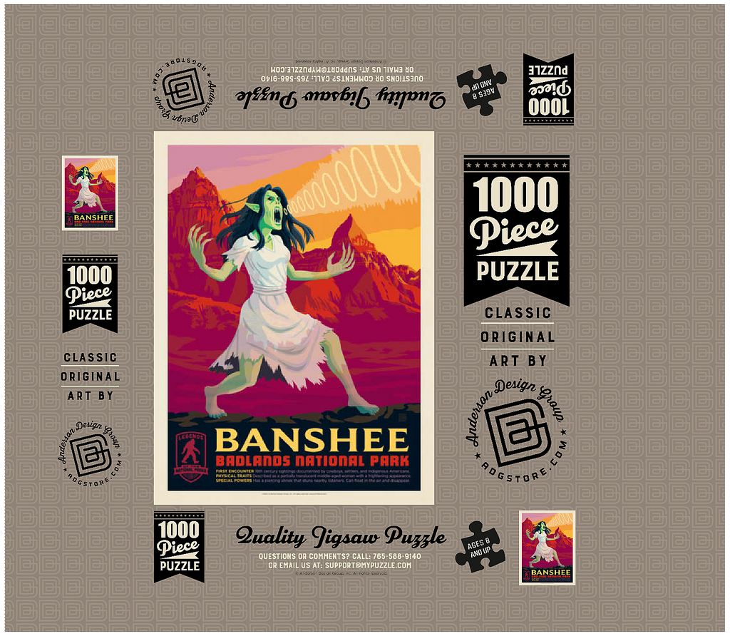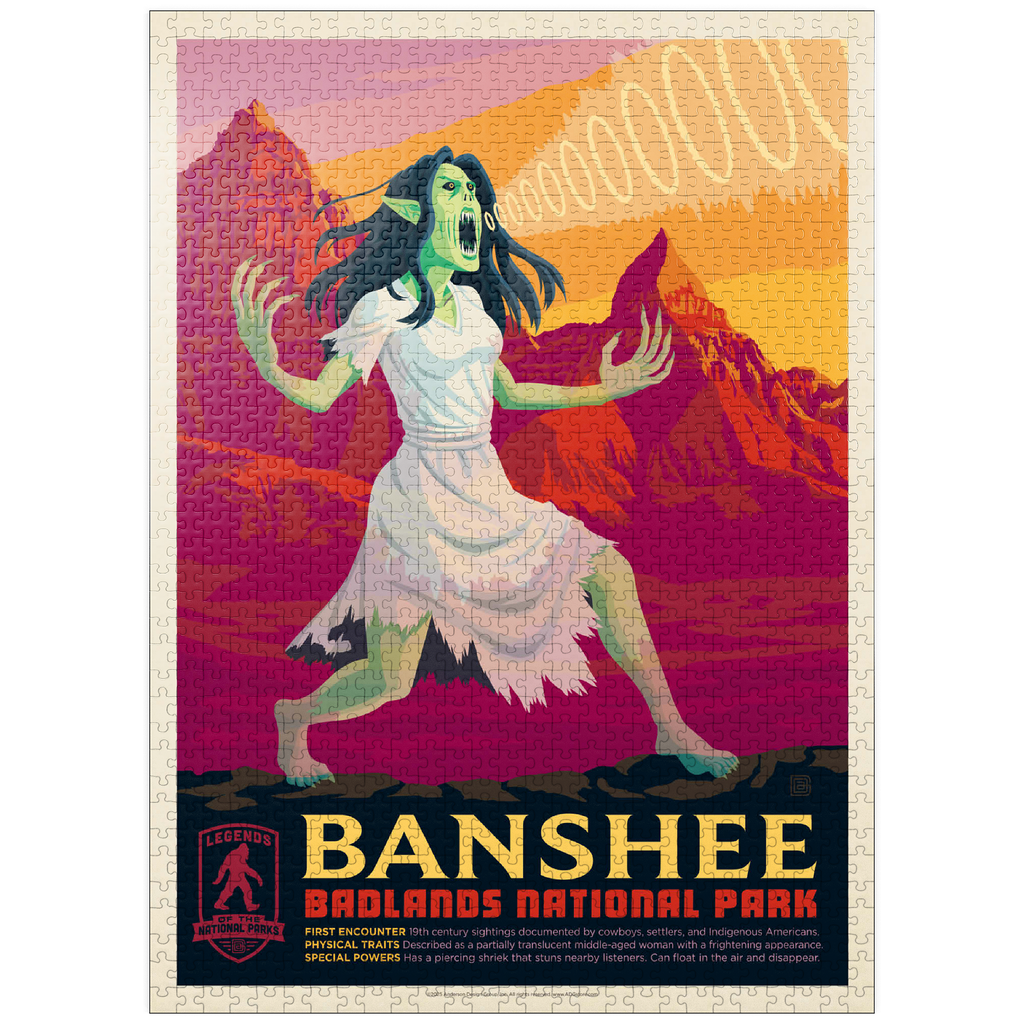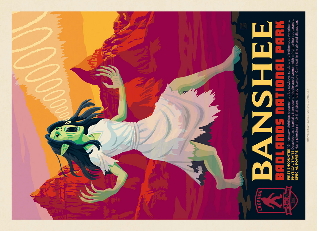 The Banshee of Badlands National Park is a terrifying spectral figure, deeply rooted in 19th-century folklore, with sightings documented by cowboys, settlers, and Indigenous Americans. This ghostly entity is described as a partially translucent, middle-aged woman with piercing eyes, long flowing hair, and tattered white garments. Legends tell of her piercing shriek, a chilling wail that can stun nearby listeners and foretell doom. Known to float above the rugged Badlands landscape, the Banshee is said to disappear into thin air, leaving only echoes of her supernatural cry. This vintage-style illustration captures her eerie presence against the dramatic red rock formations and glowing sunset of Badlands National Park. A must-have for folklore enthusiasts, ghost hunters, and lovers of supernatural legends, this artwork brings an iconic myth to life.