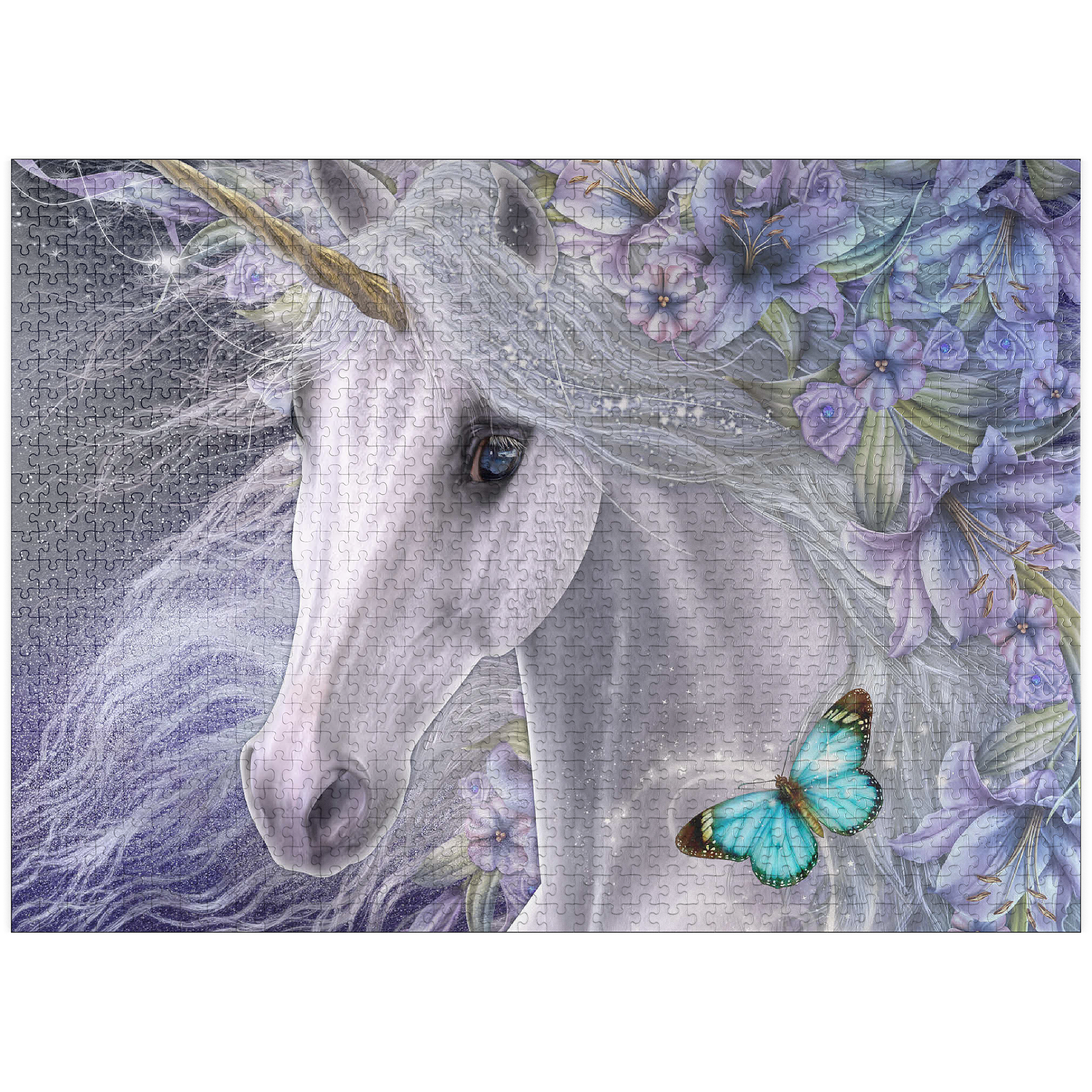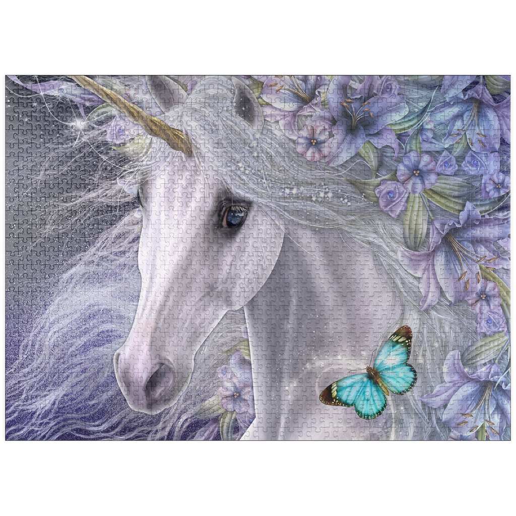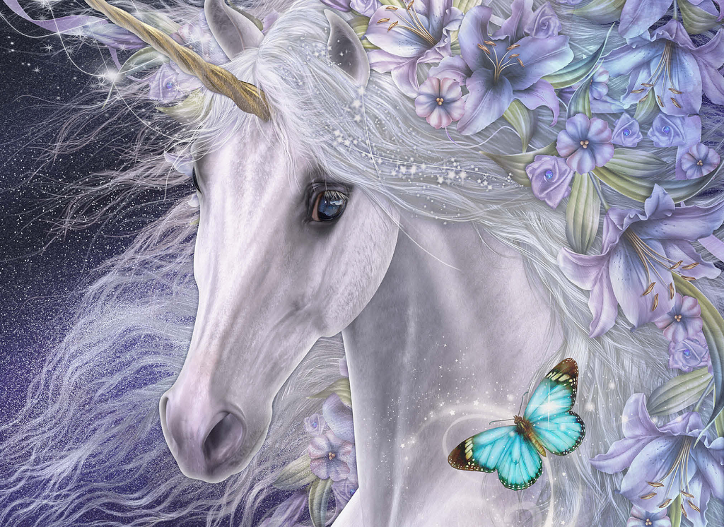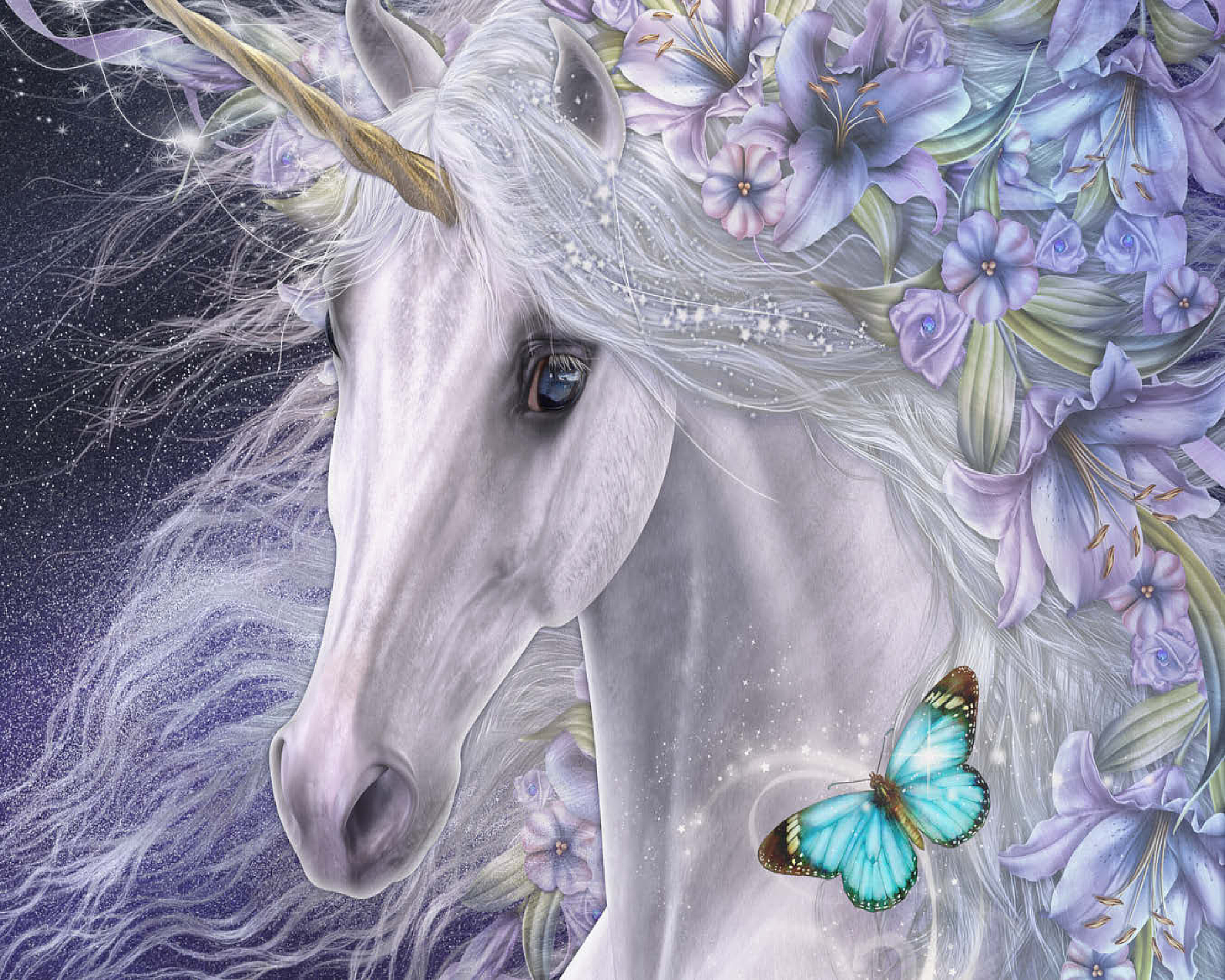 This enchanting fantasy art piece by Laurie Prindle features a majestic white unicorn with flowing mane and golden horn, adorned with vibrant purple and lavender lilies. A playful blue butterfly dances with delight, catching the unicorn's deep liquid eye. Sparkling details, wispy tendrils, and a mystical aura that is perfect for lovers of mythical creatures, all exemplify Laurie's signature style of portraying the fantasy and beauty of the equine form.