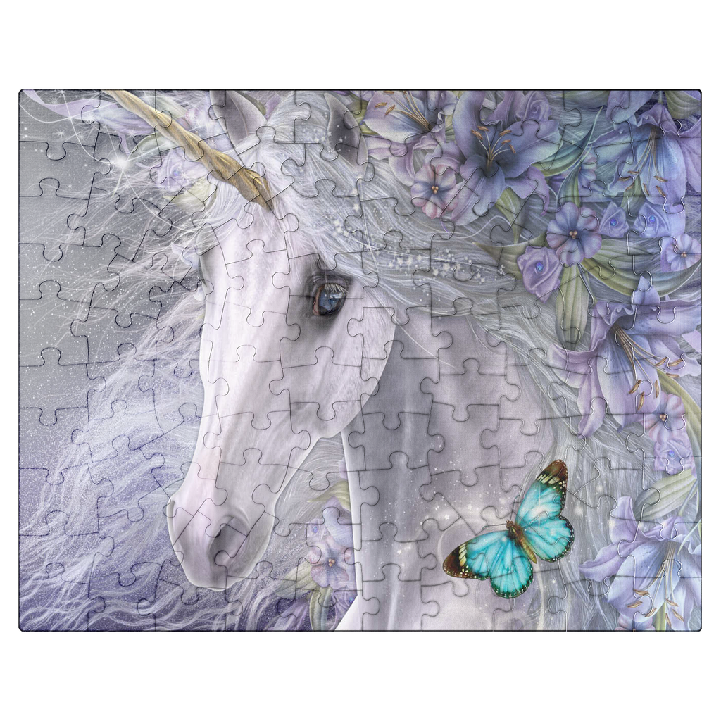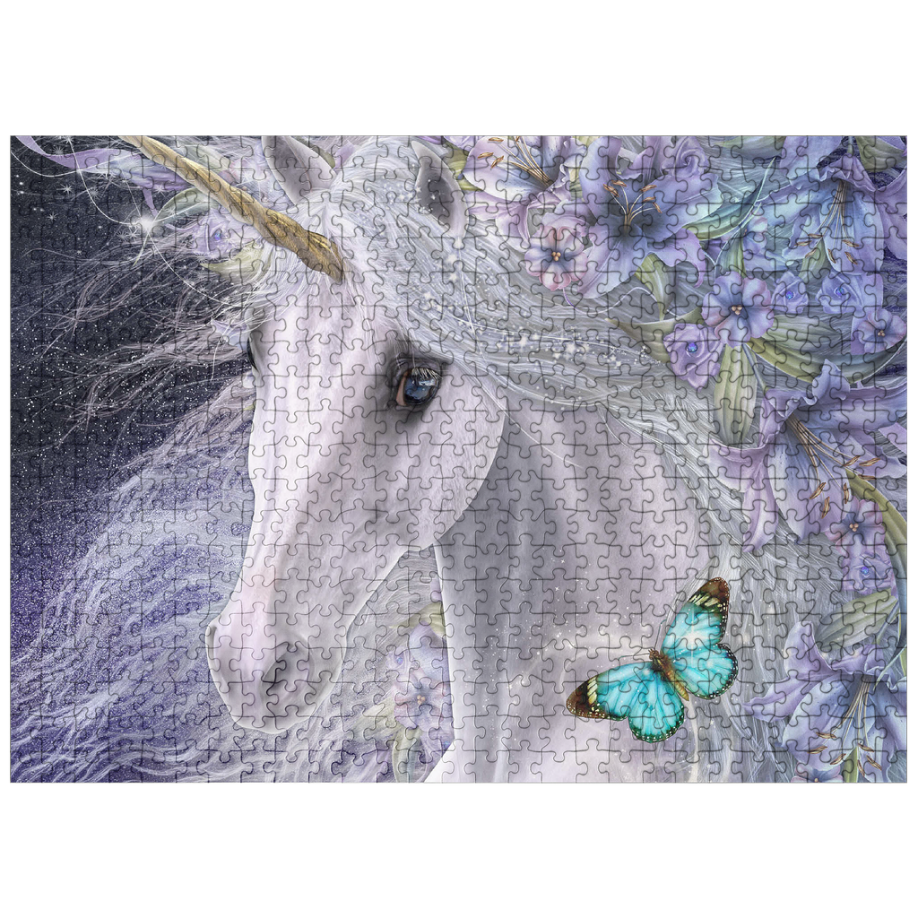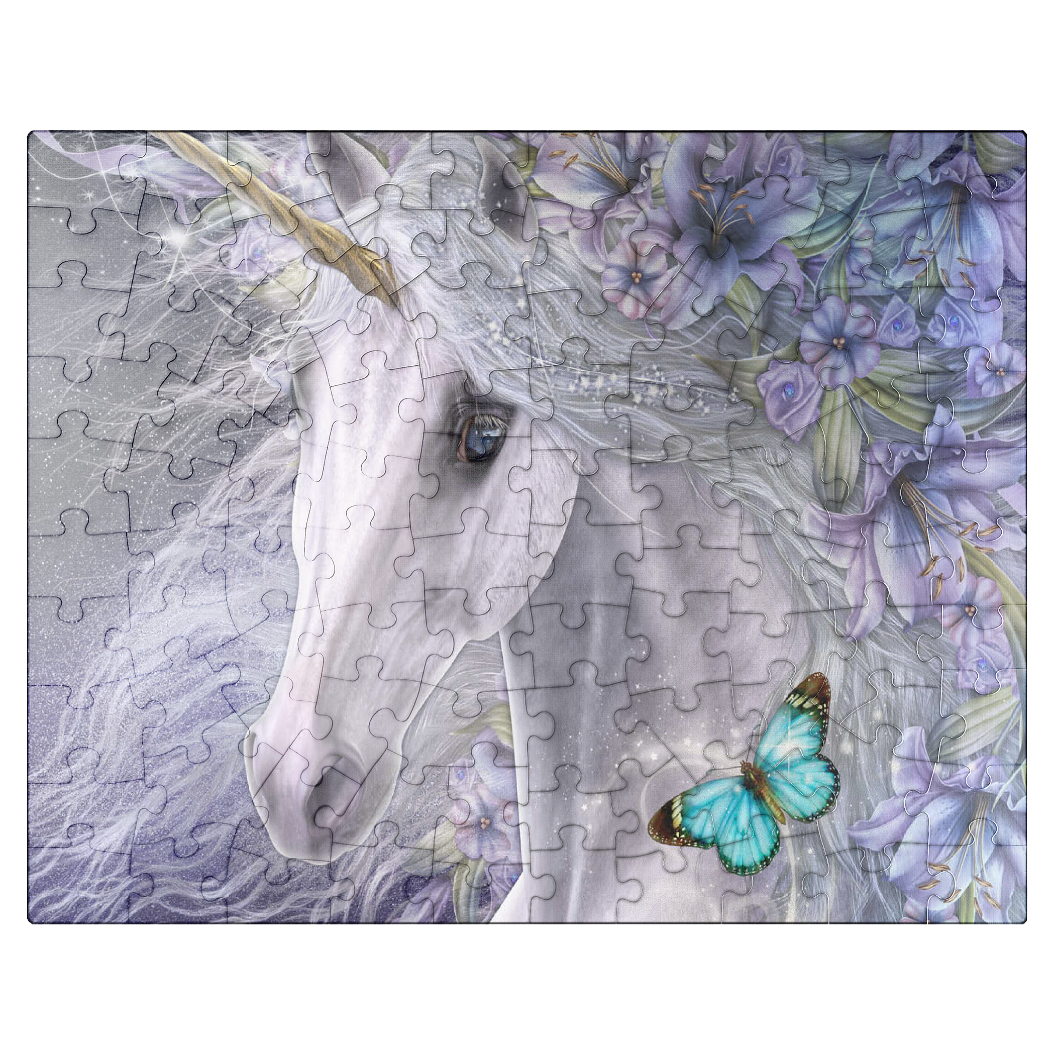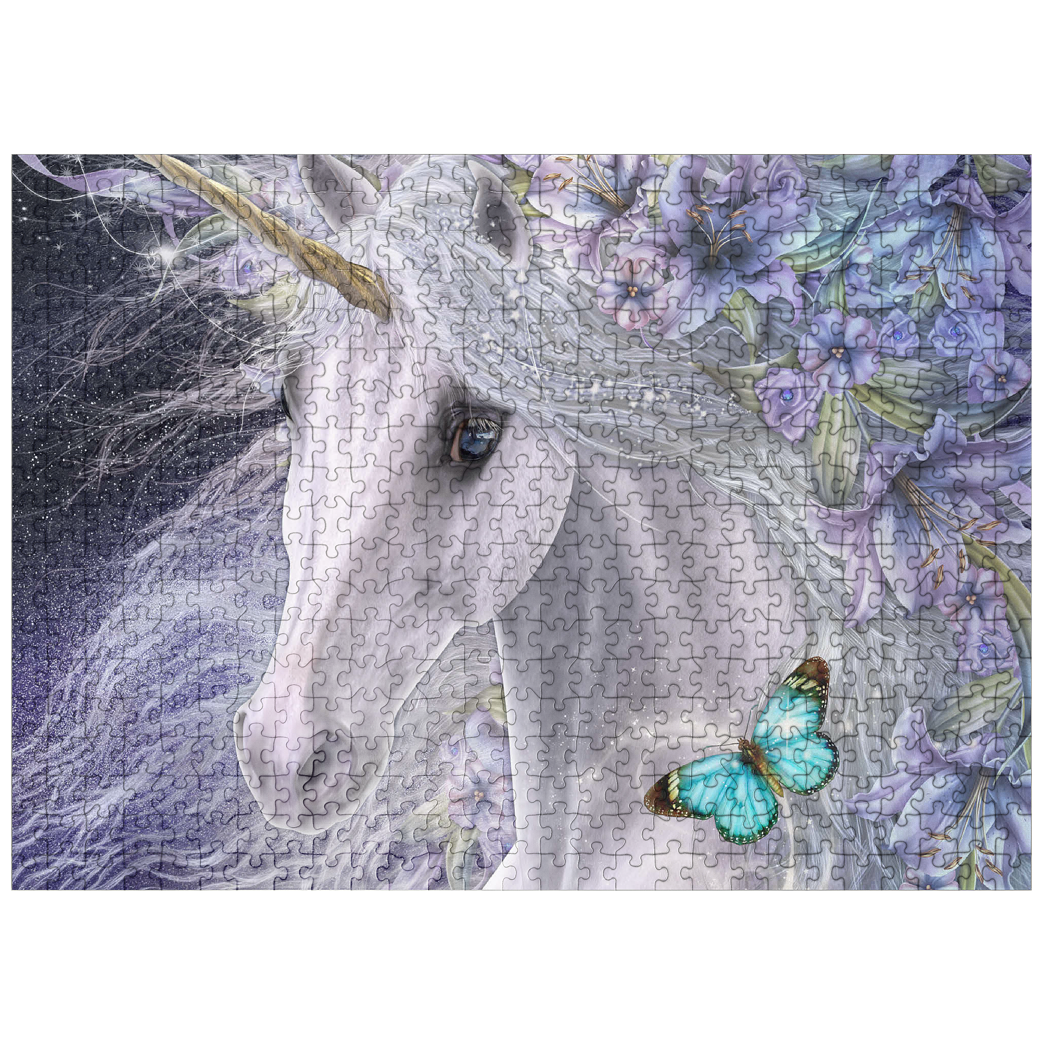 This enchanting fantasy art piece by Laurie Prindle features a majestic white unicorn with flowing mane and golden horn, adorned with vibrant purple and lavender lilies. A playful blue butterfly dances with delight, catching the unicorn's deep liquid eye. Sparkling details, wispy tendrils, and a mystical aura that is perfect for lovers of mythical creatures, all exemplify Laurie's signature style of portraying the fantasy and beauty of the equine form.
