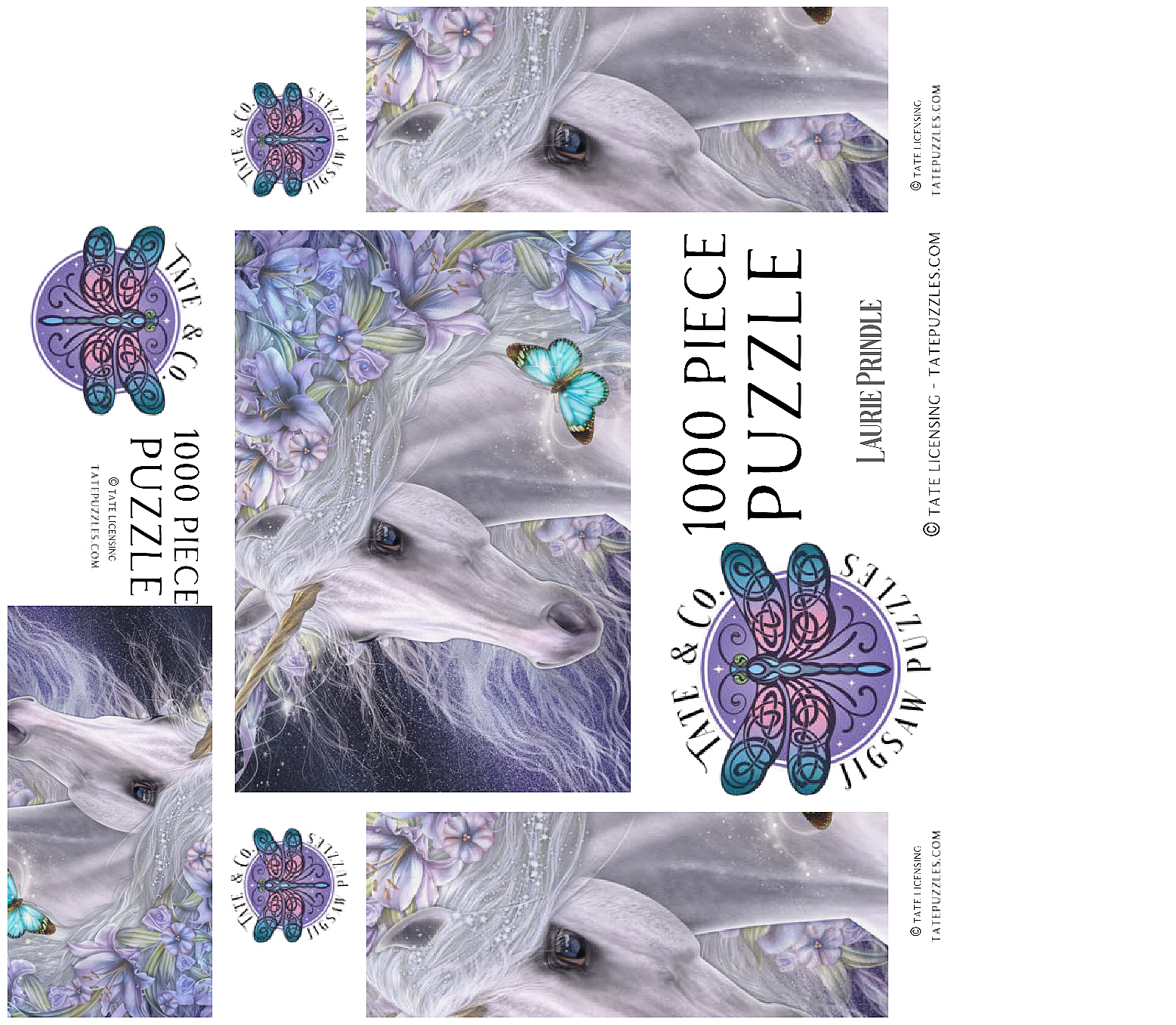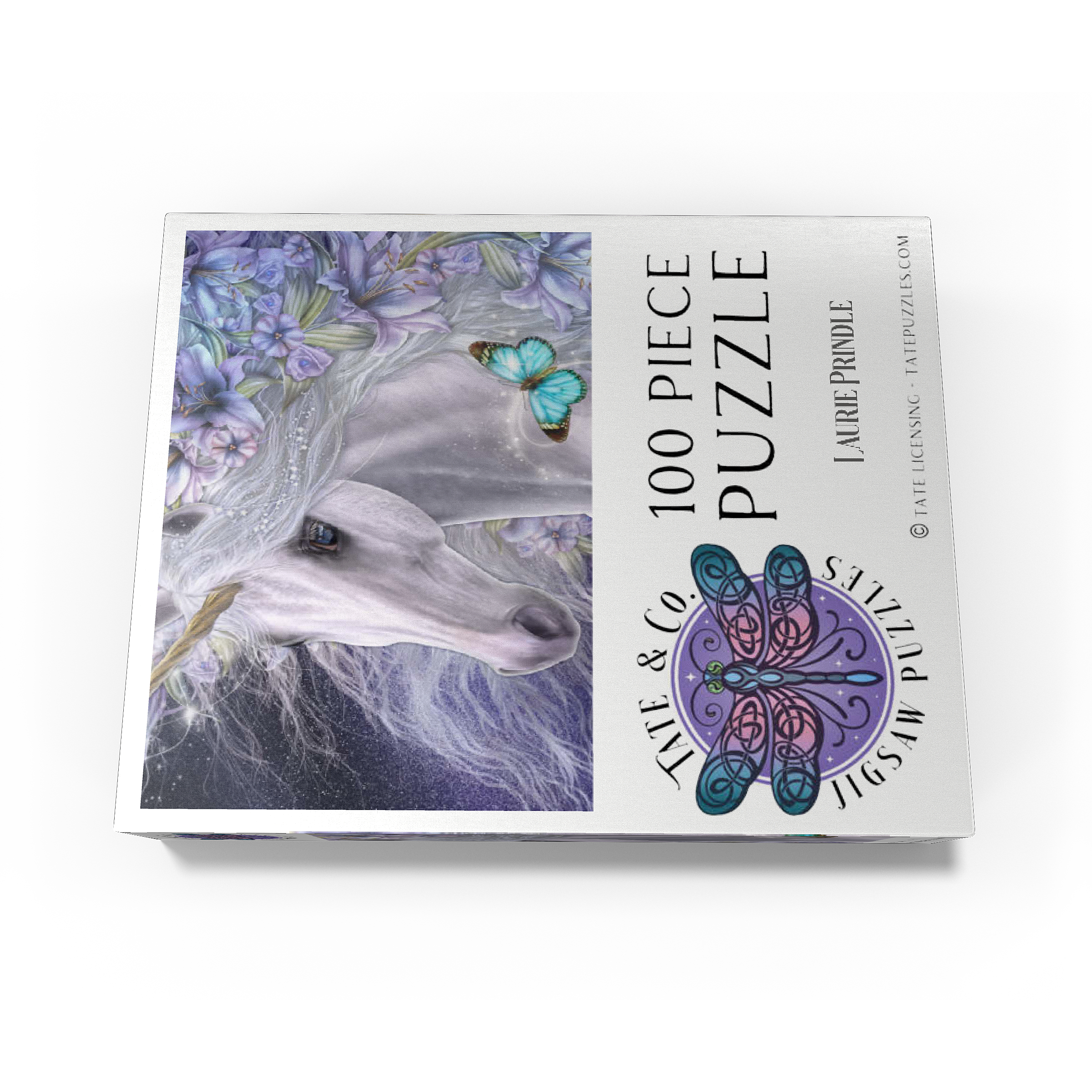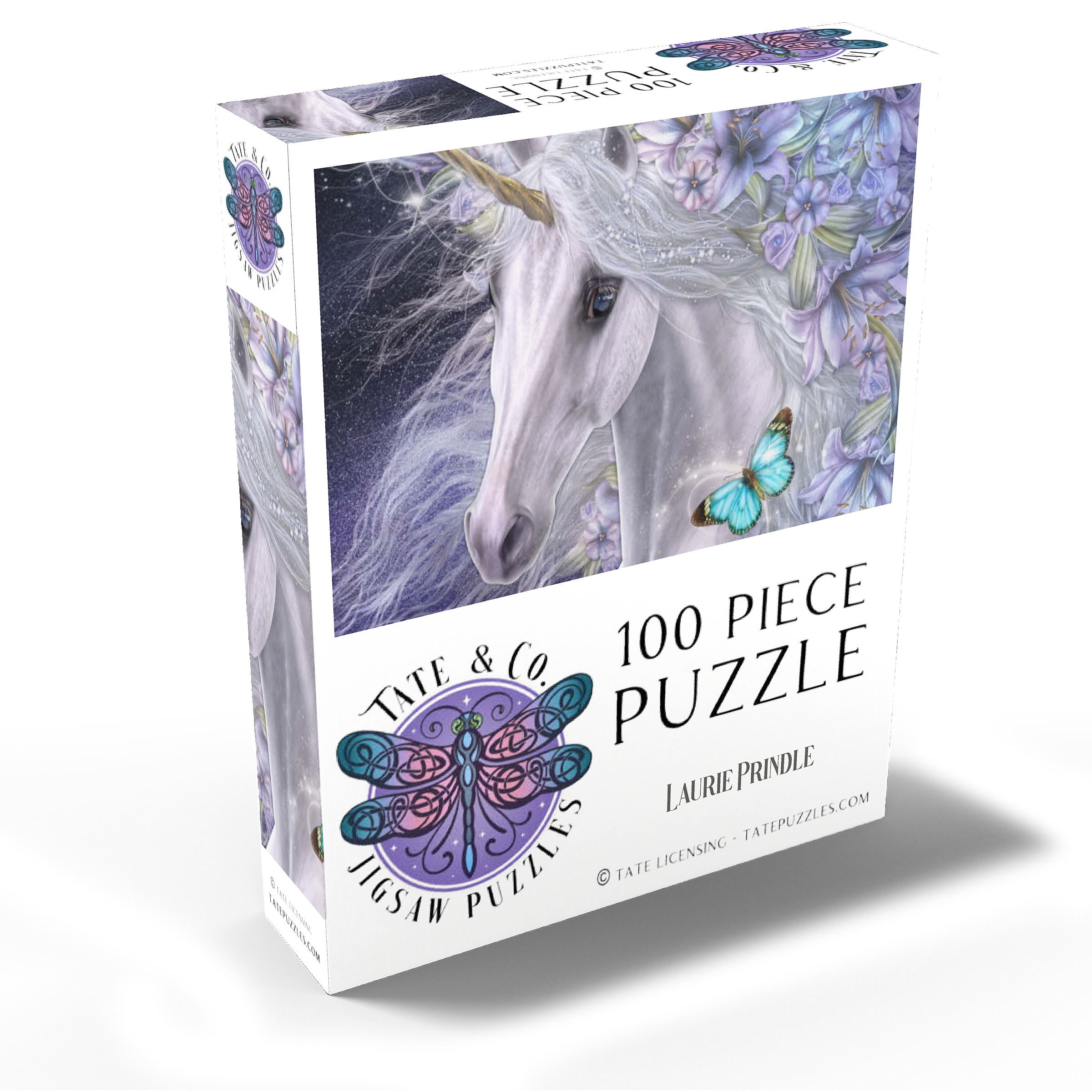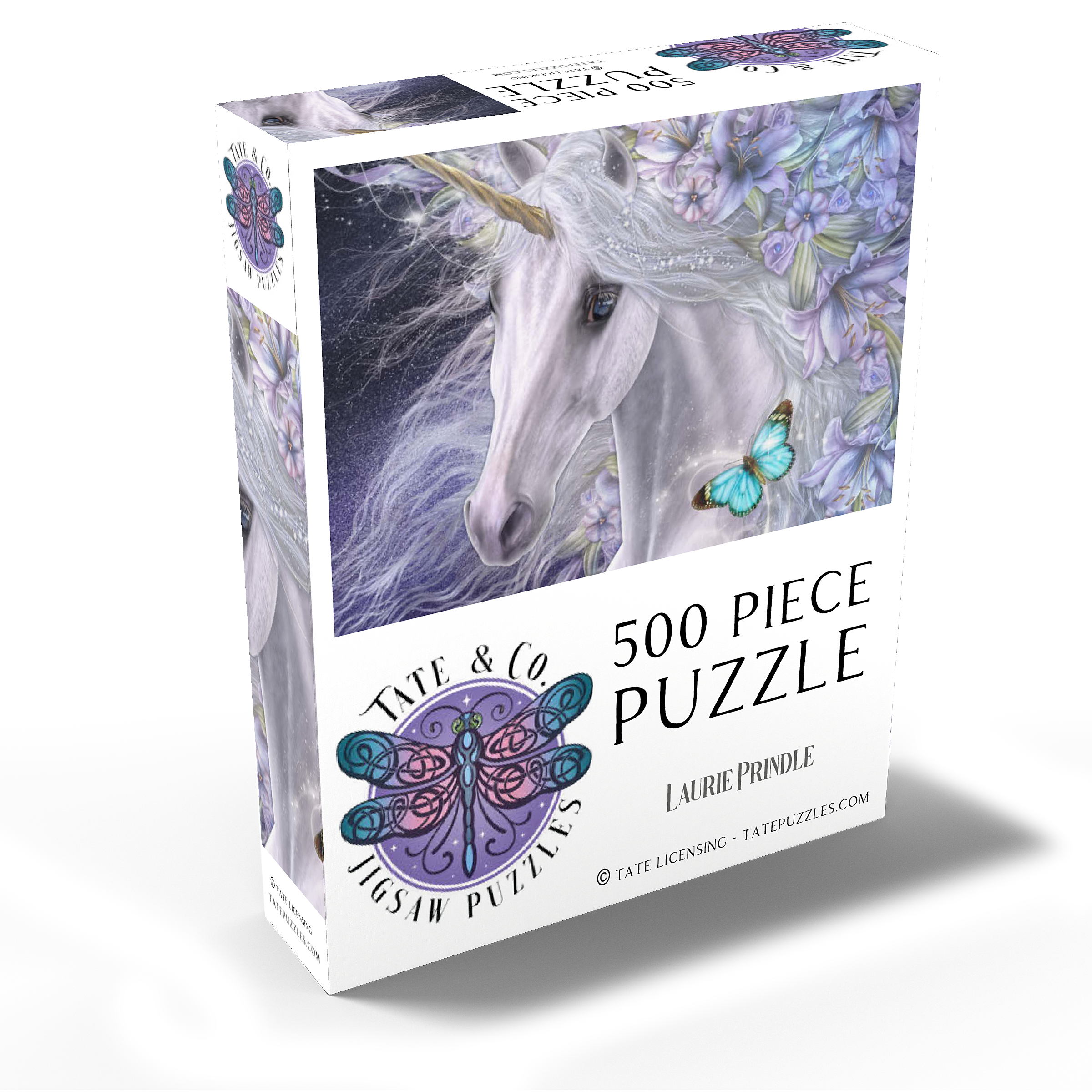 This enchanting fantasy art piece by Laurie Prindle features a majestic white unicorn with flowing mane and golden horn, adorned with vibrant purple and lavender lilies. A playful blue butterfly dances with delight, catching the unicorn's deep liquid eye. Sparkling details, wispy tendrils, and a mystical aura that is perfect for lovers of mythical creatures, all exemplify Laurie's signature style of portraying the fantasy and beauty of the equine form.