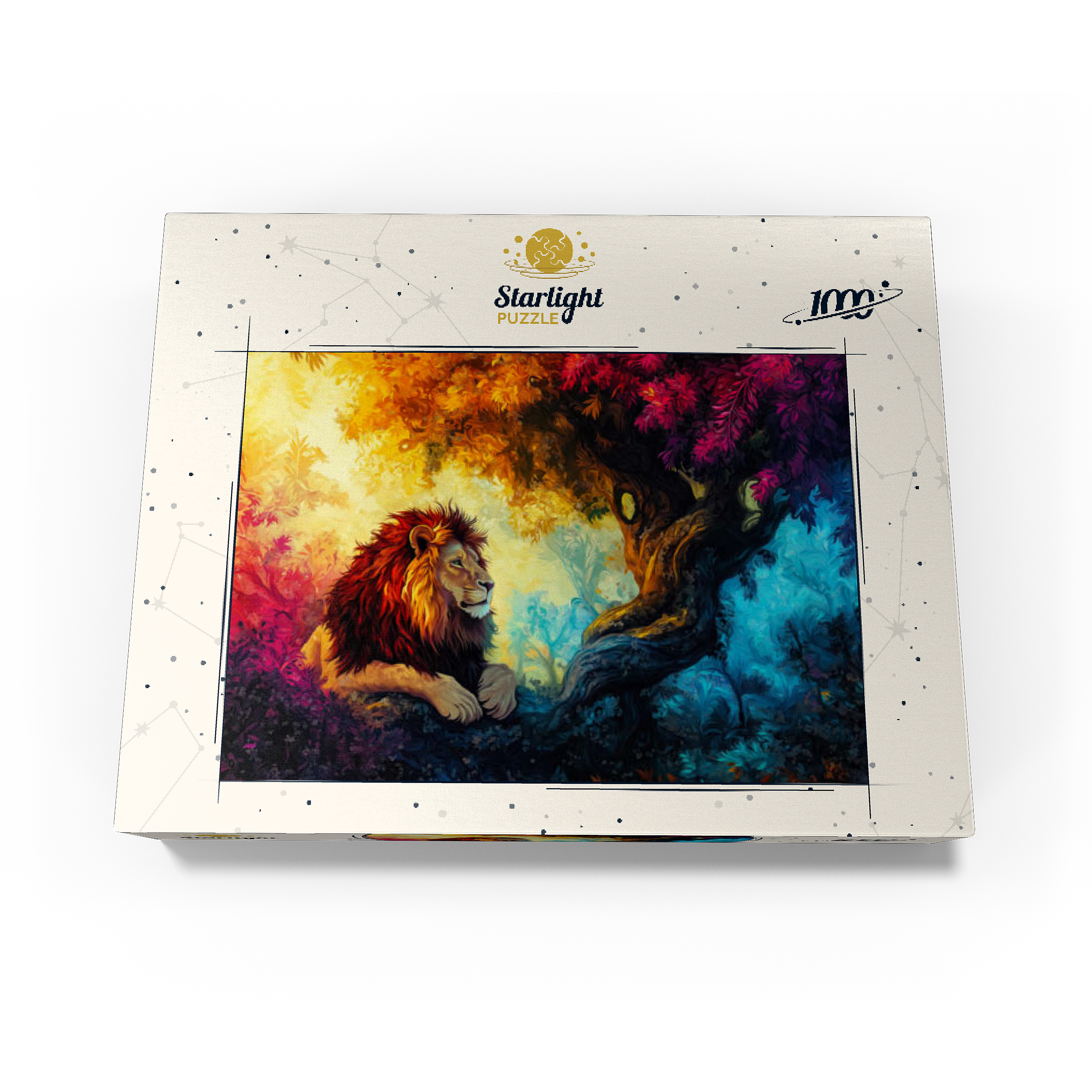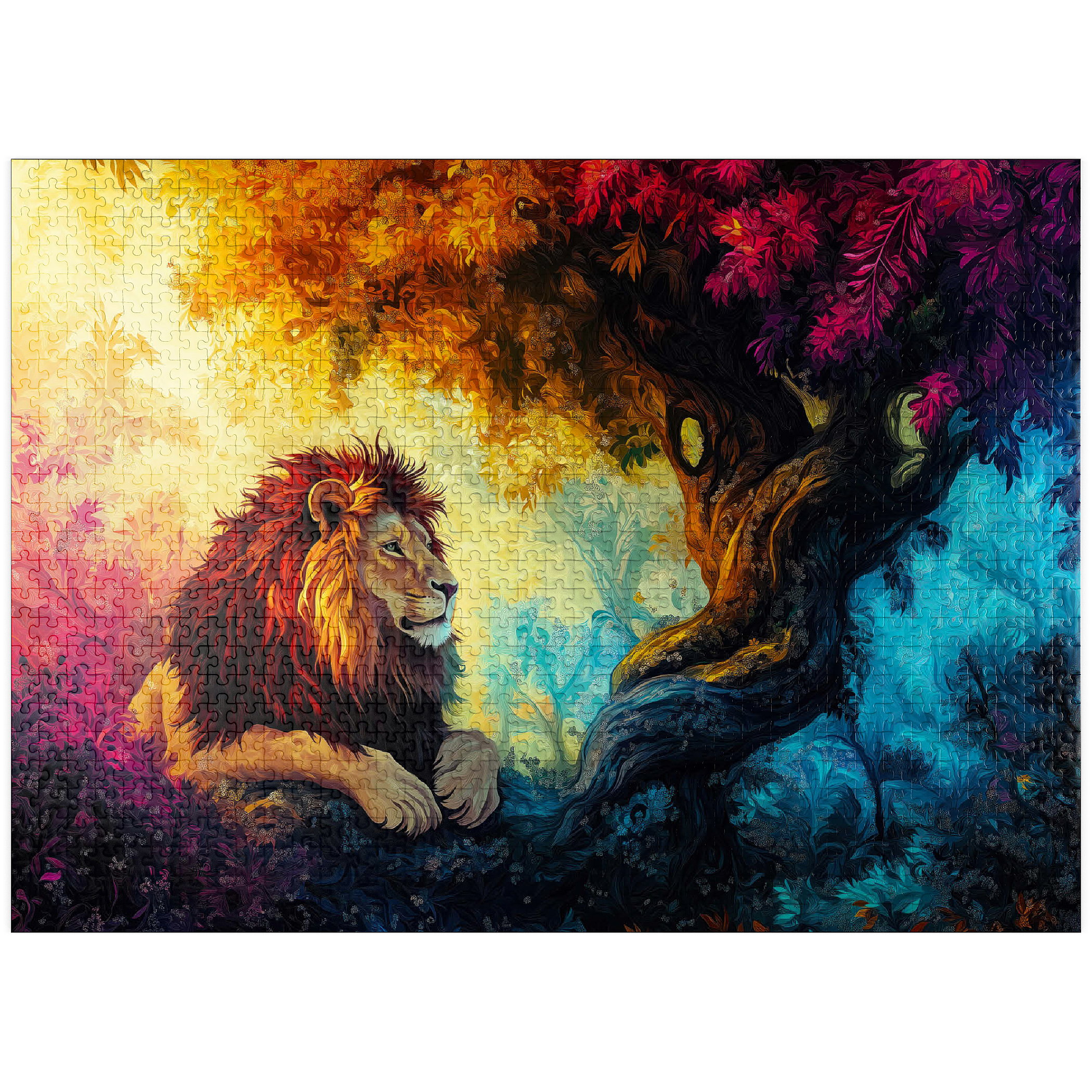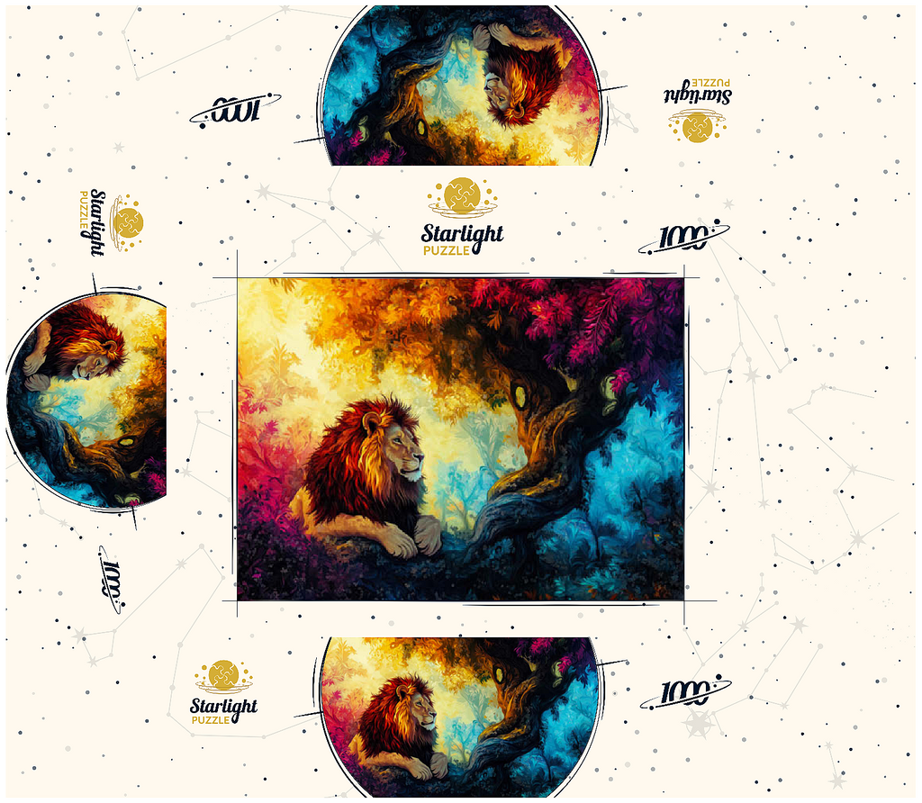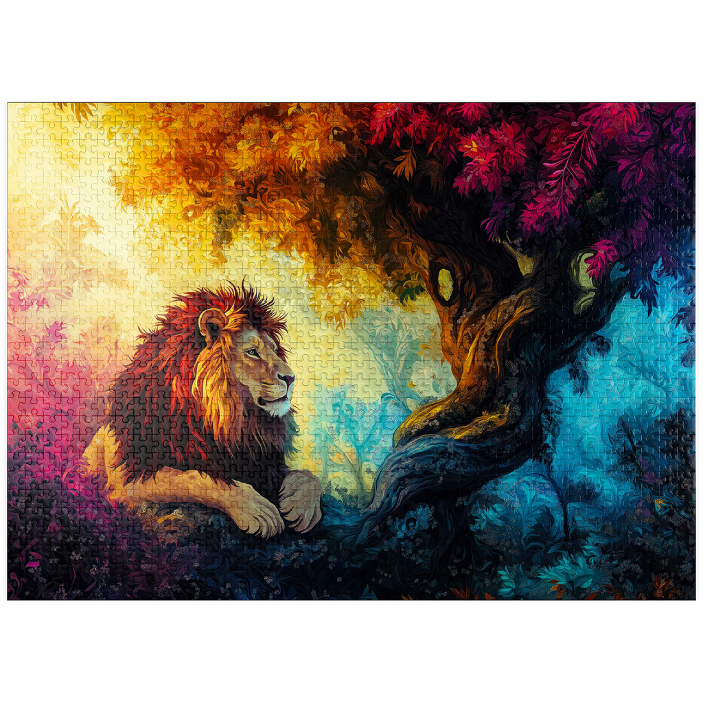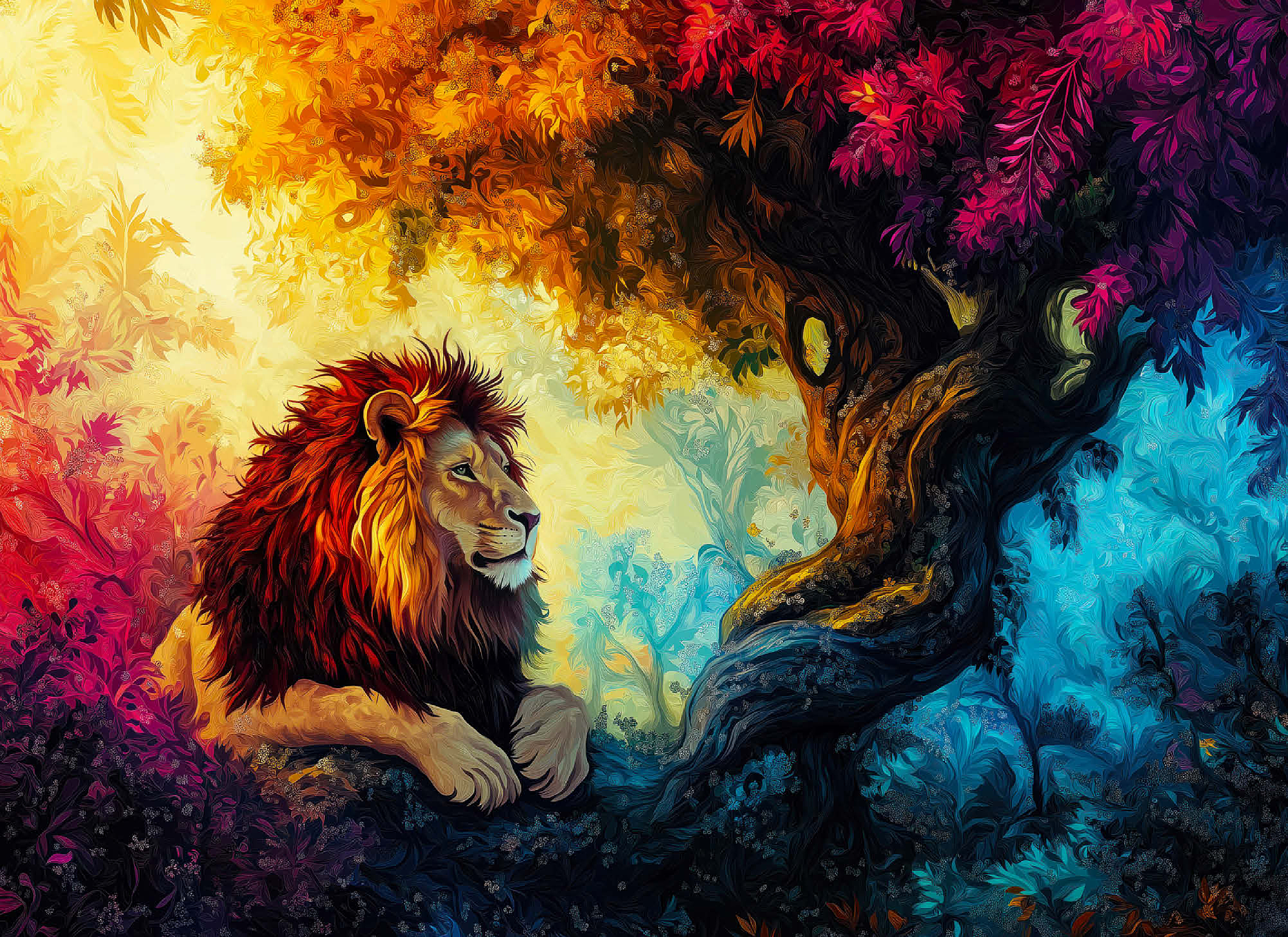 This stunning artwork captures the regal presence of a lion resting beneath an otherworldly tree with vivid, gradient foliage transitioning from warm golden hues to deep purples and blues. The intricate, swirling patterns in the background evoke a dreamlike and fantastical atmosphere. The lion's powerful yet serene demeanor contrasts beautifully with the vibrant, dynamic colors of its surroundings, symbolizing strength and harmony in nature. This captivating scene blends wildlife majesty with artistic imagination, creating a mesmerizing visual masterpiece.