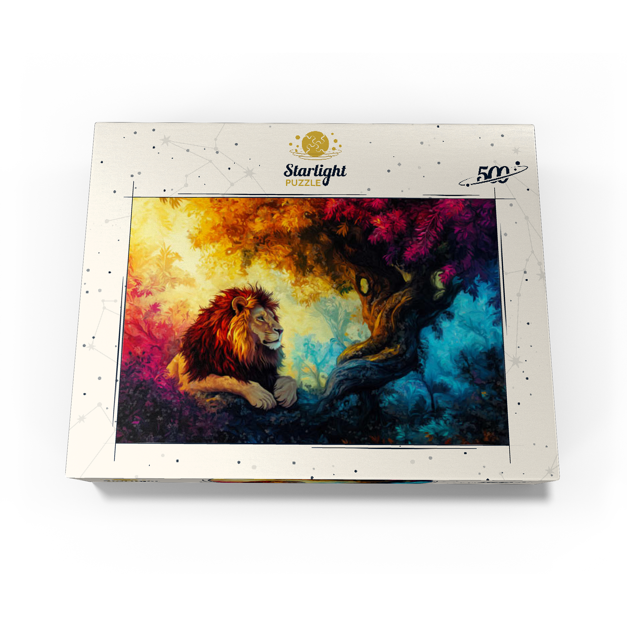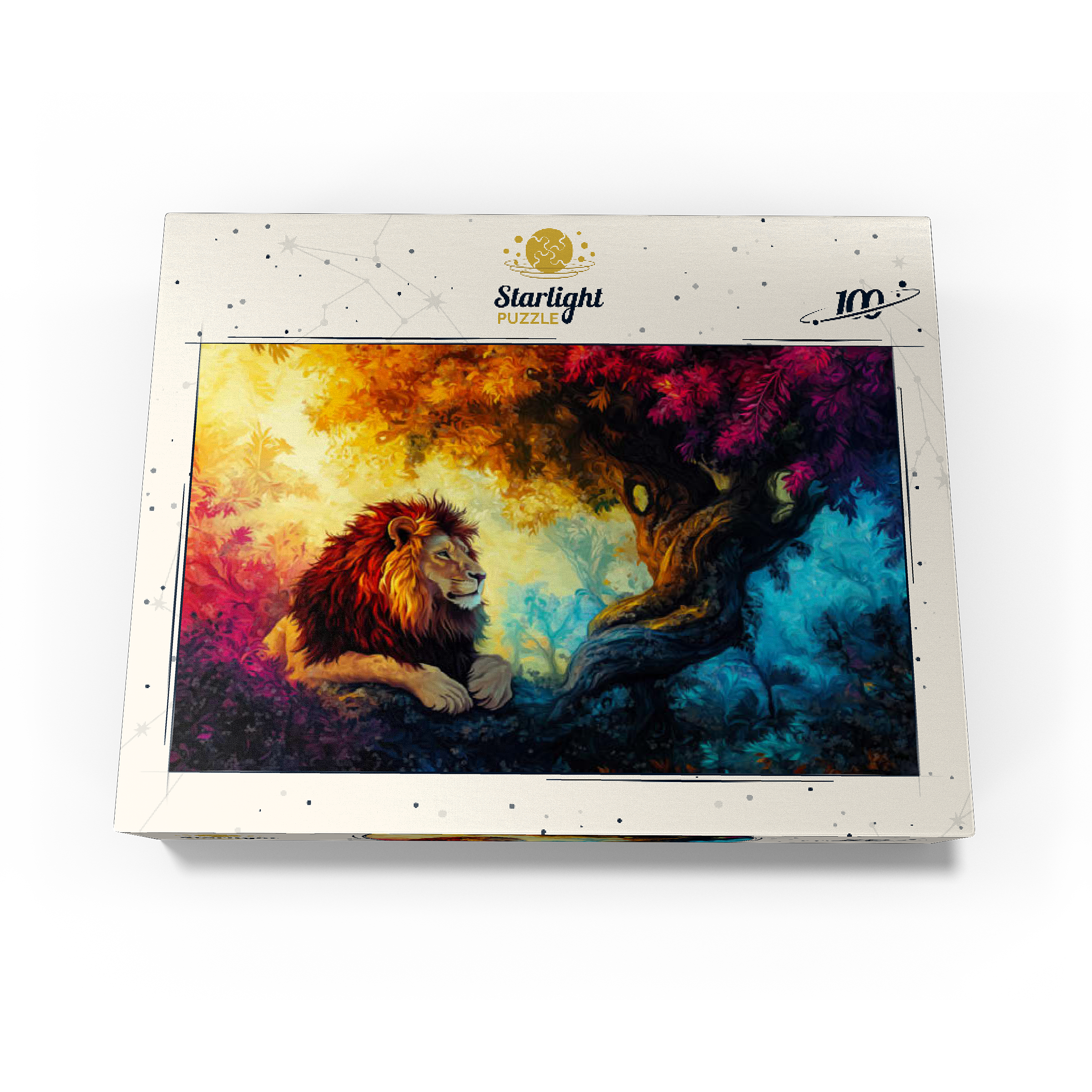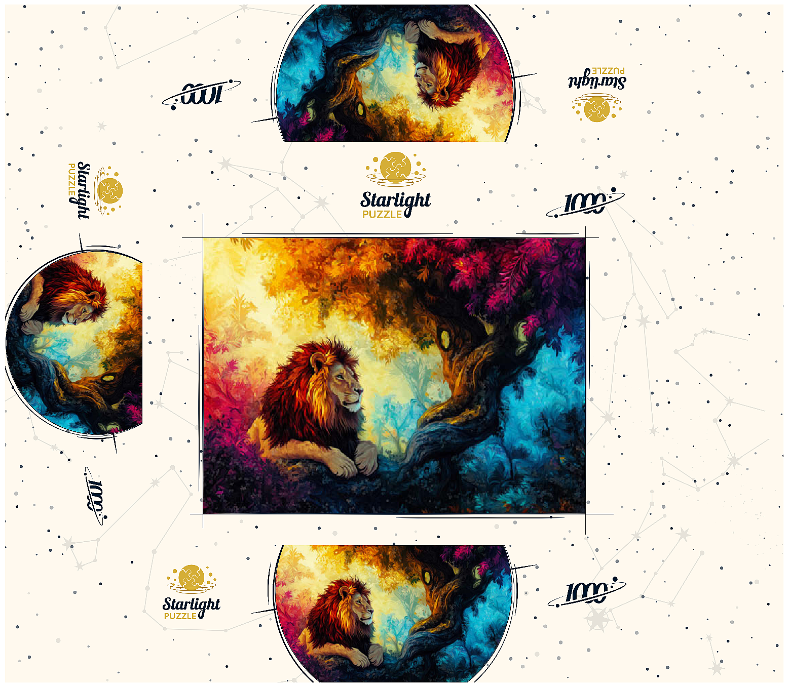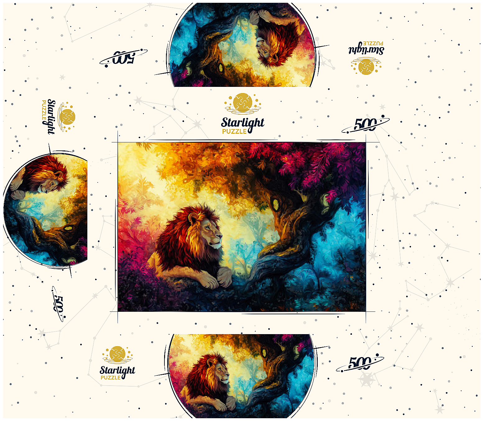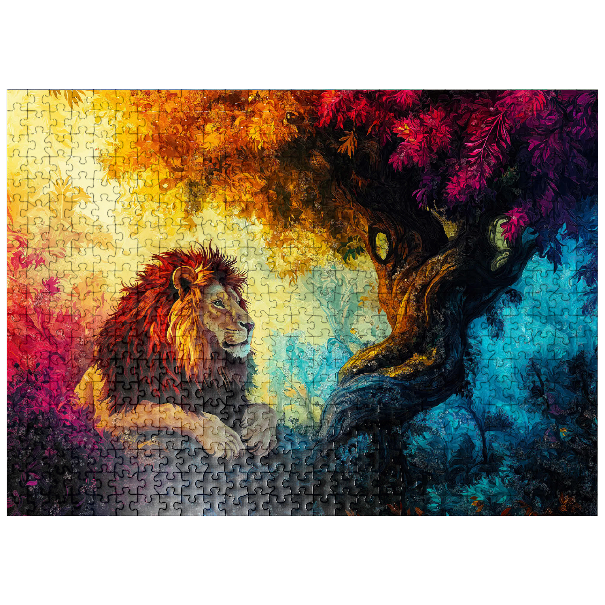 This stunning artwork captures the regal presence of a lion resting beneath an otherworldly tree with vivid, gradient foliage transitioning from warm golden hues to deep purples and blues. The intricate, swirling patterns in the background evoke a dreamlike and fantastical atmosphere. The lion's powerful yet serene demeanor contrasts beautifully with the vibrant, dynamic colors of its surroundings, symbolizing strength and harmony in nature. This captivating scene blends wildlife majesty with artistic imagination, creating a mesmerizing visual masterpiece.