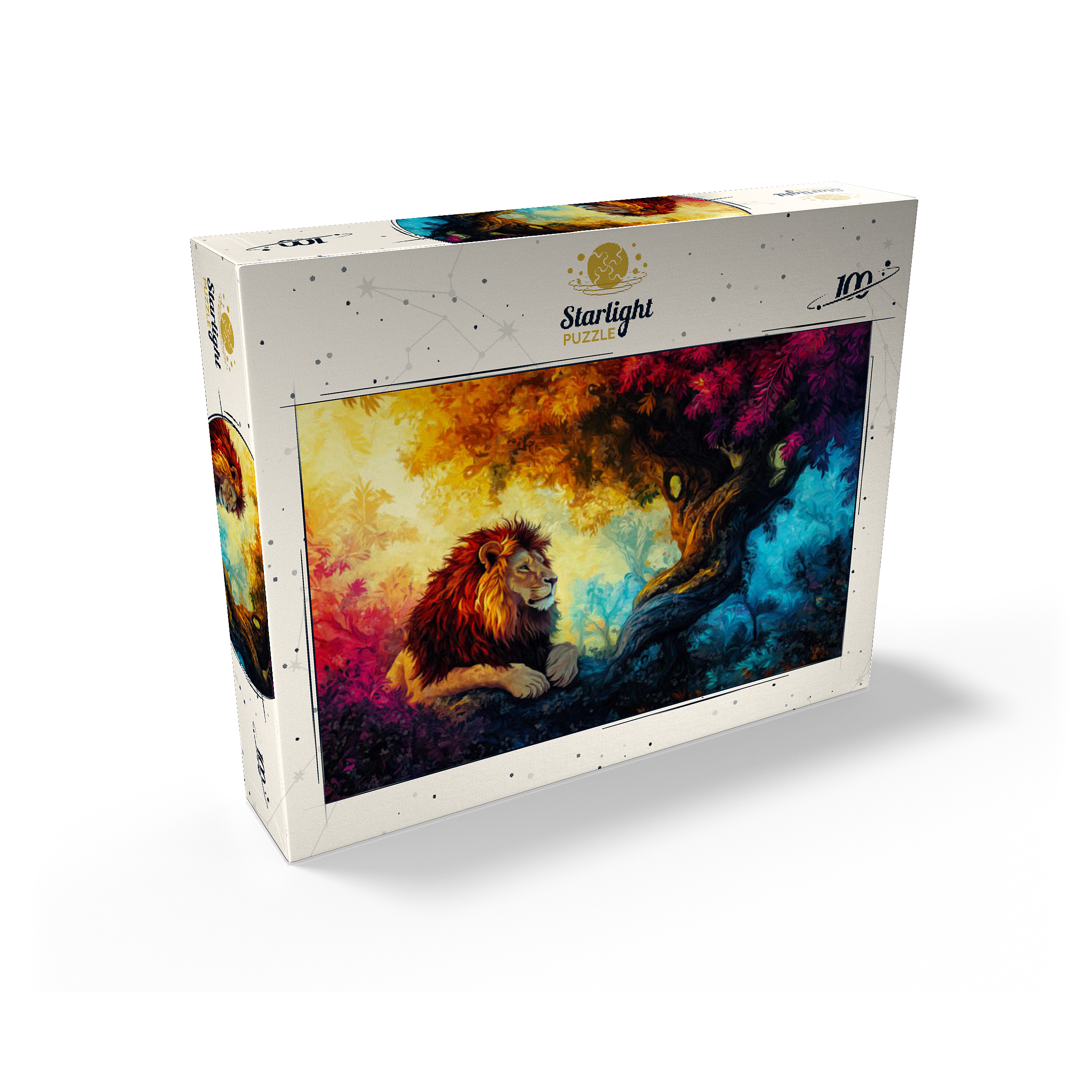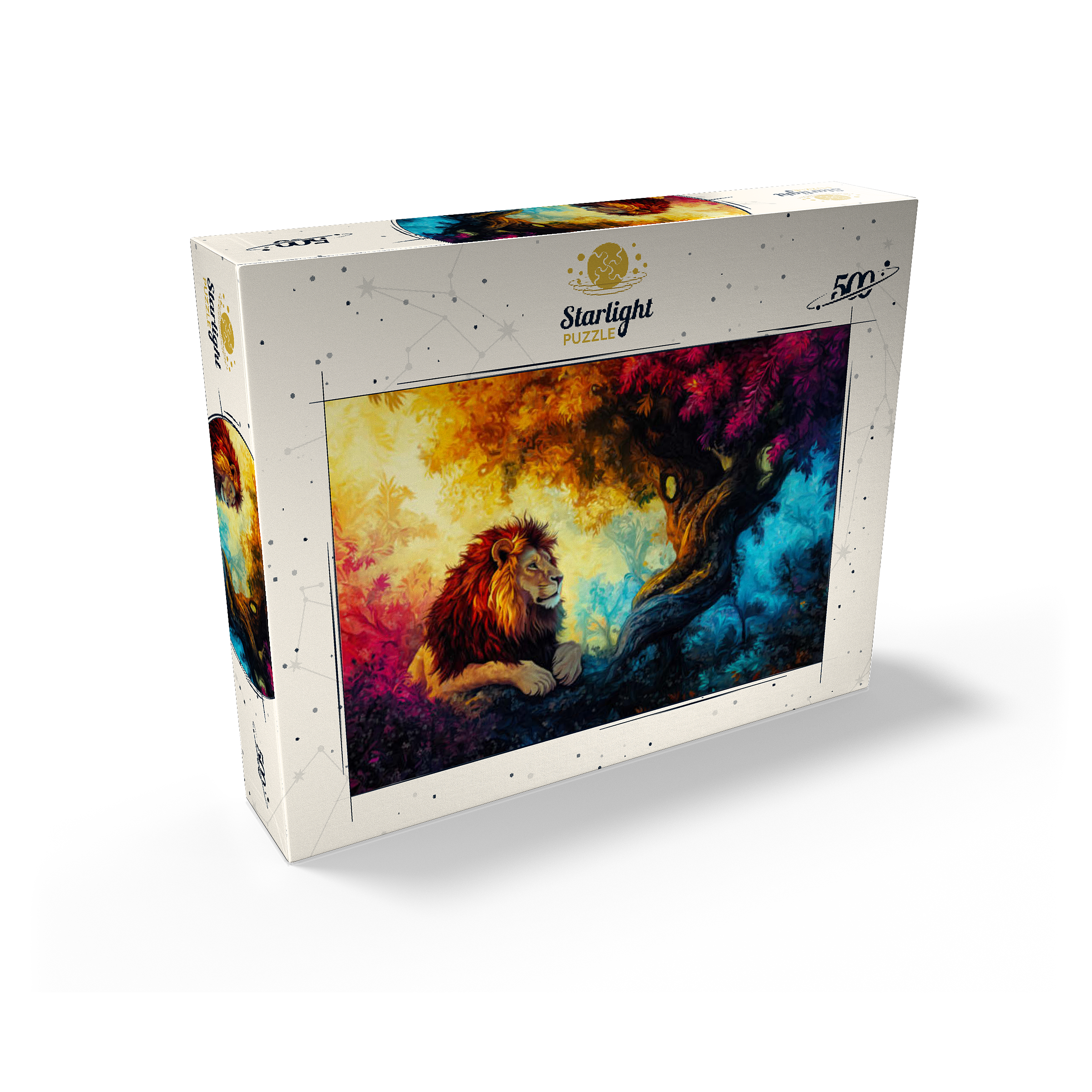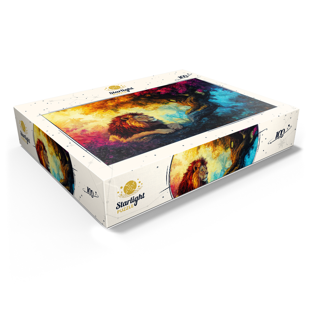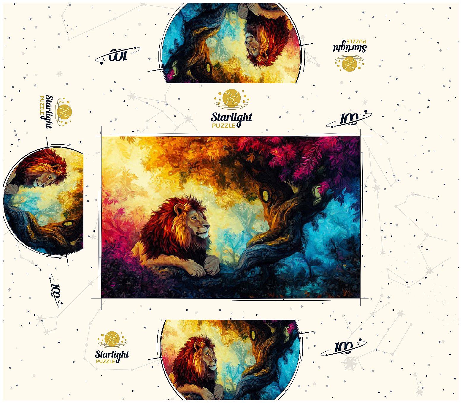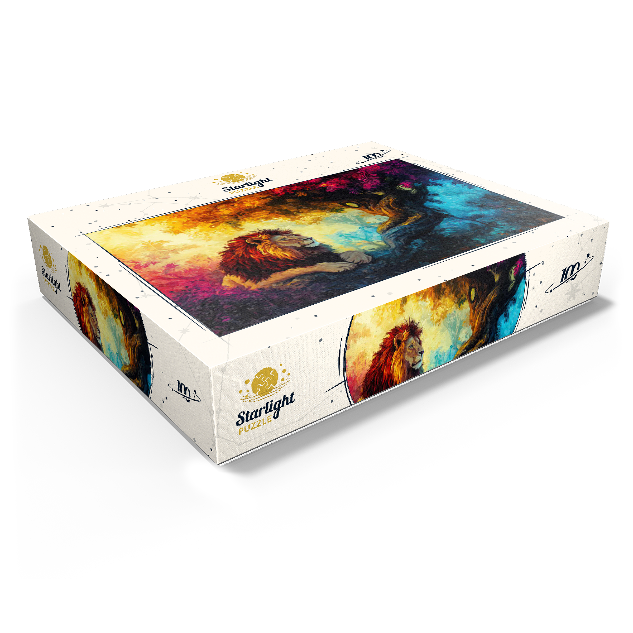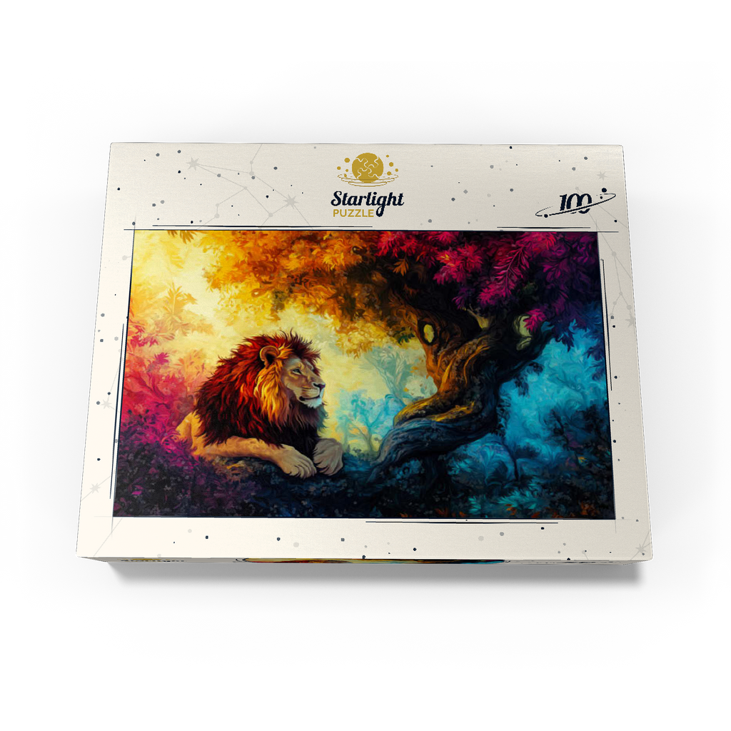 This stunning artwork captures the regal presence of a lion resting beneath an otherworldly tree with vivid, gradient foliage transitioning from warm golden hues to deep purples and blues. The intricate, swirling patterns in the background evoke a dreamlike and fantastical atmosphere. The lion's powerful yet serene demeanor contrasts beautifully with the vibrant, dynamic colors of its surroundings, symbolizing strength and harmony in nature. This captivating scene blends wildlife majesty with artistic imagination, creating a mesmerizing visual masterpiece.