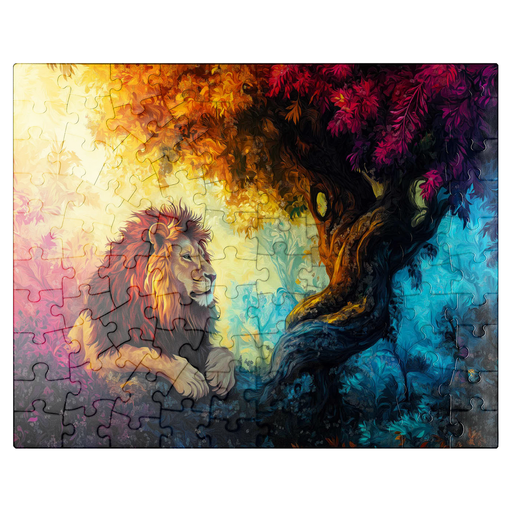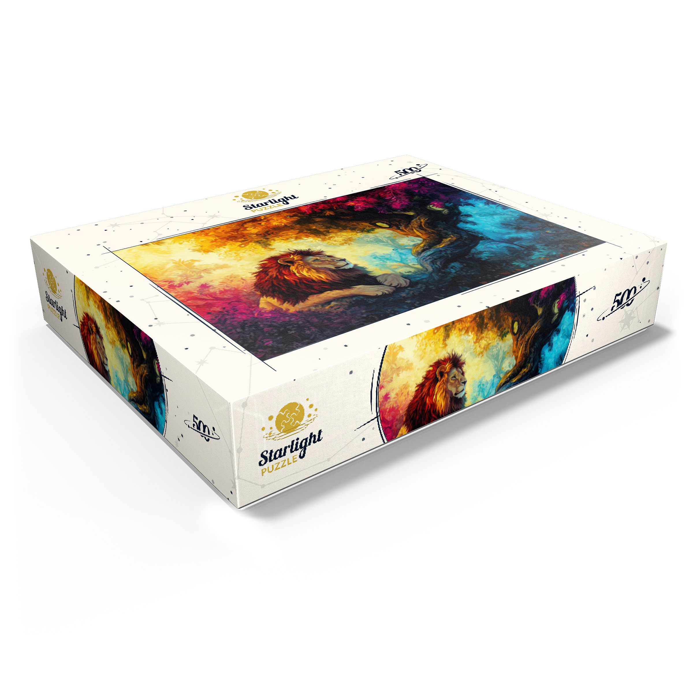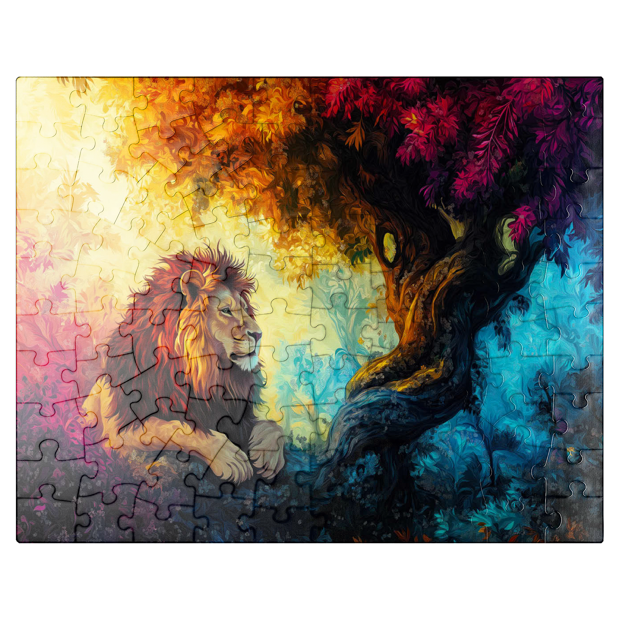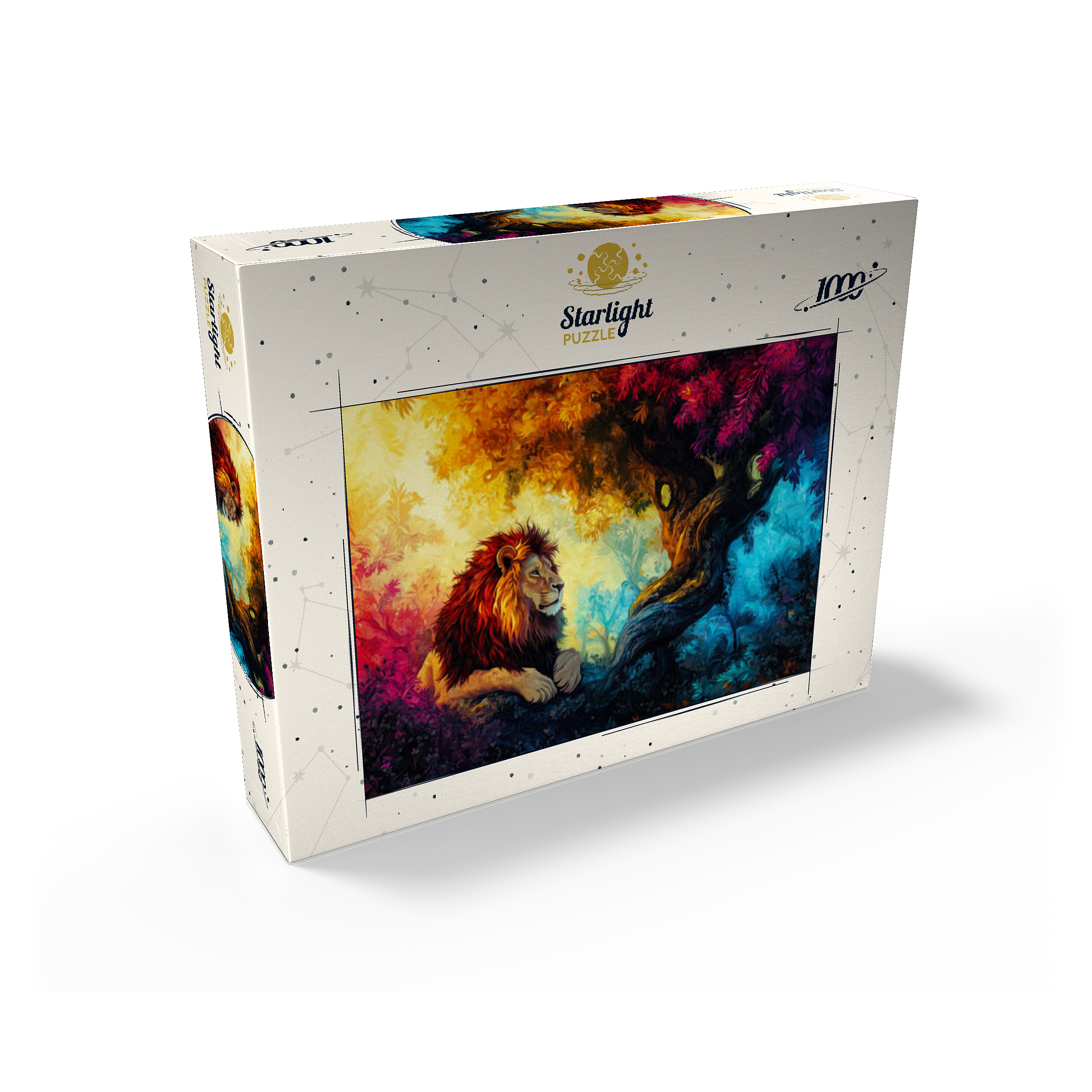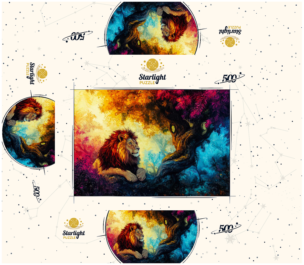 This stunning artwork captures the regal presence of a lion resting beneath an otherworldly tree with vivid, gradient foliage transitioning from warm golden hues to deep purples and blues. The intricate, swirling patterns in the background evoke a dreamlike and fantastical atmosphere. The lion's powerful yet serene demeanor contrasts beautifully with the vibrant, dynamic colors of its surroundings, symbolizing strength and harmony in nature. This captivating scene blends wildlife majesty with artistic imagination, creating a mesmerizing visual masterpiece.