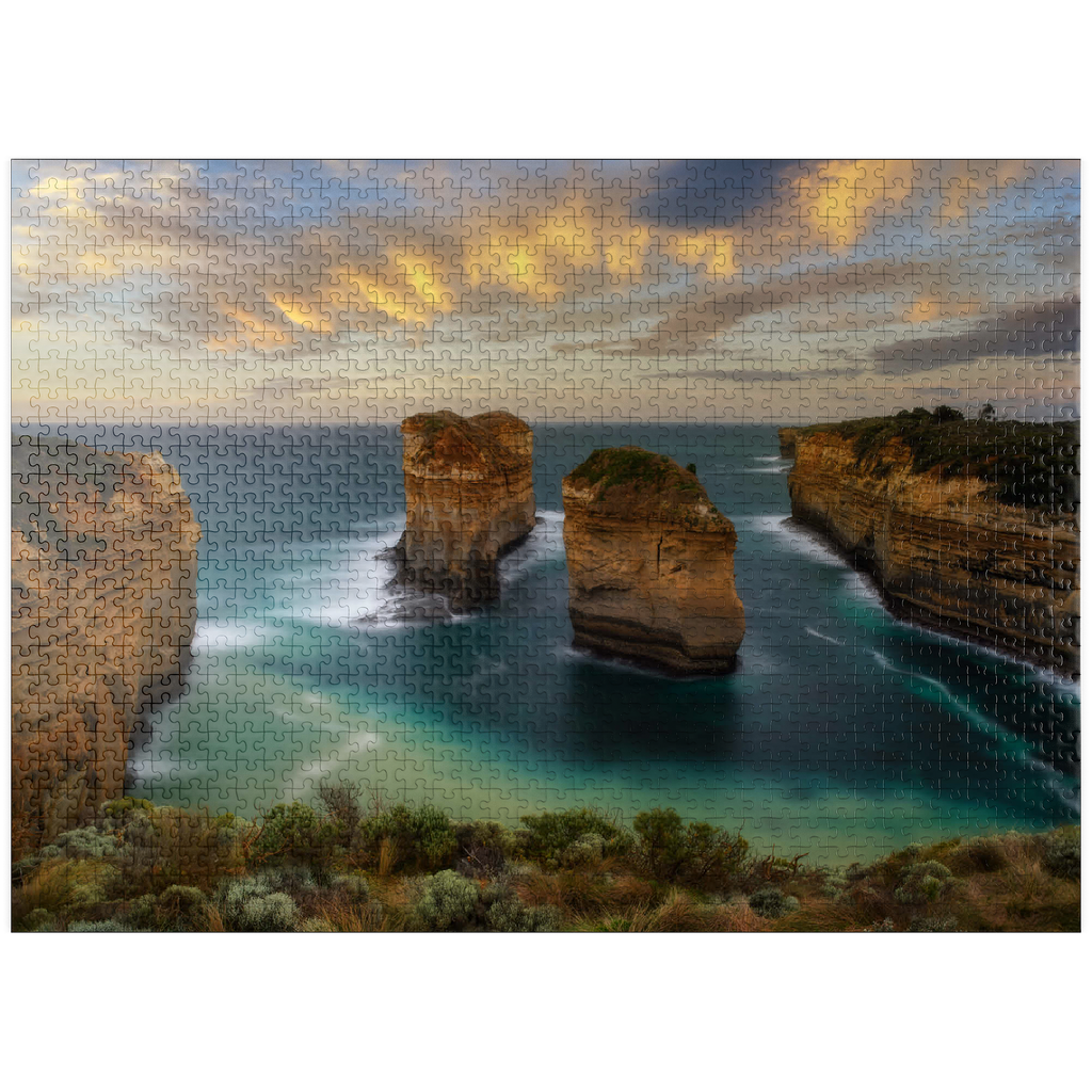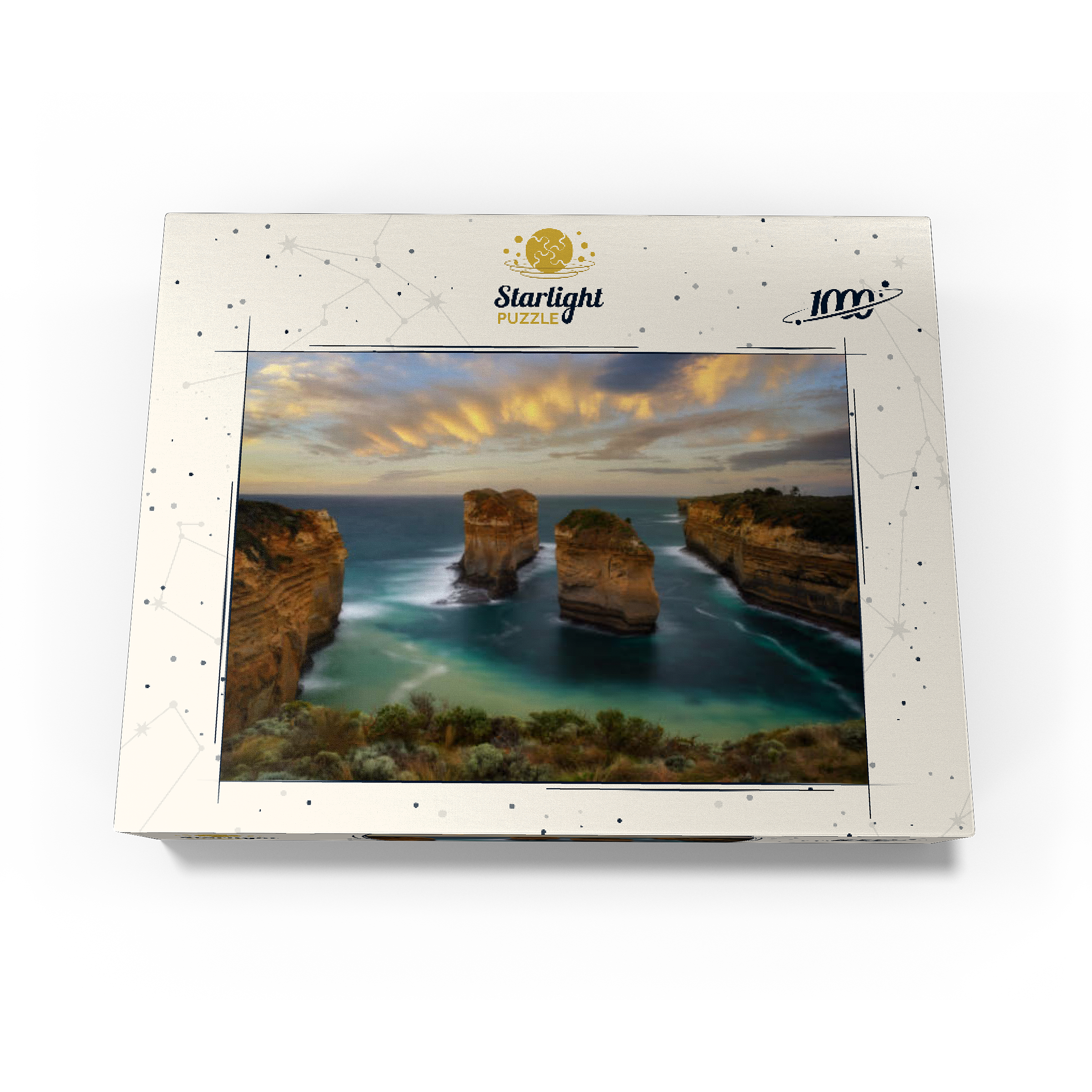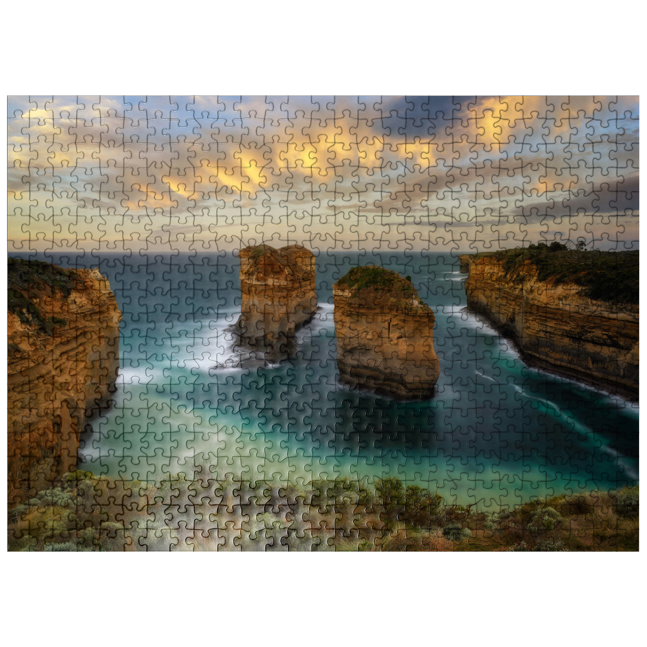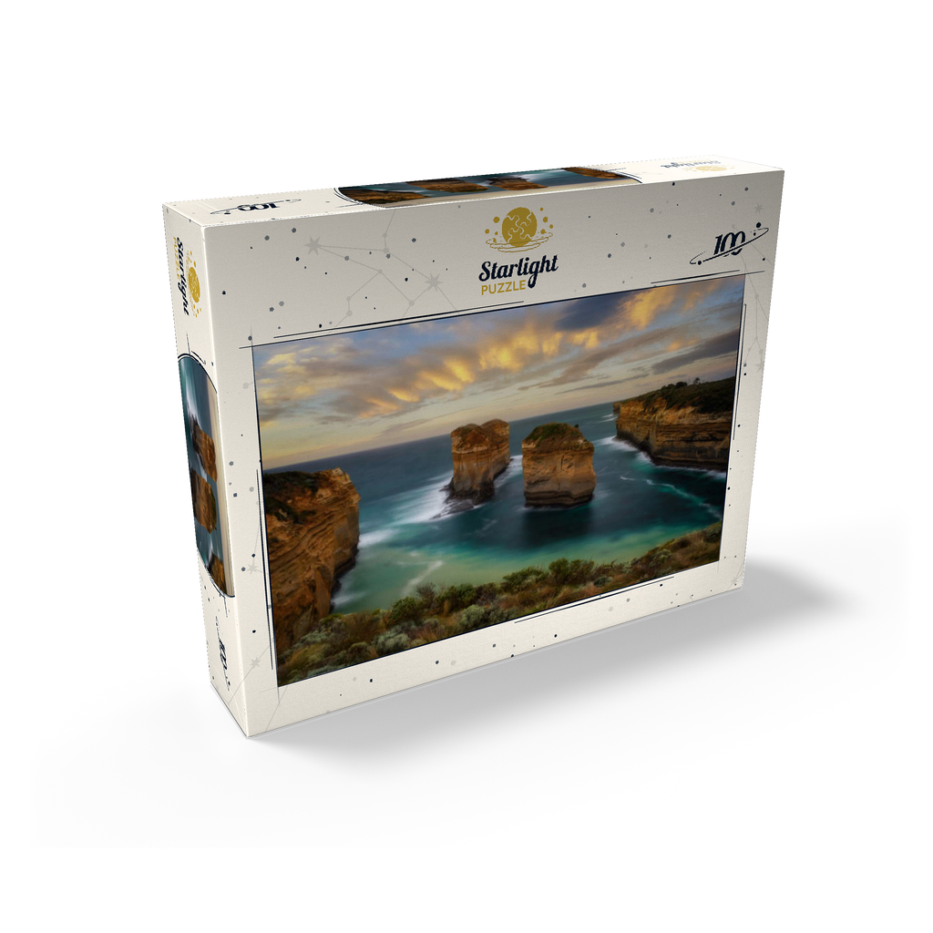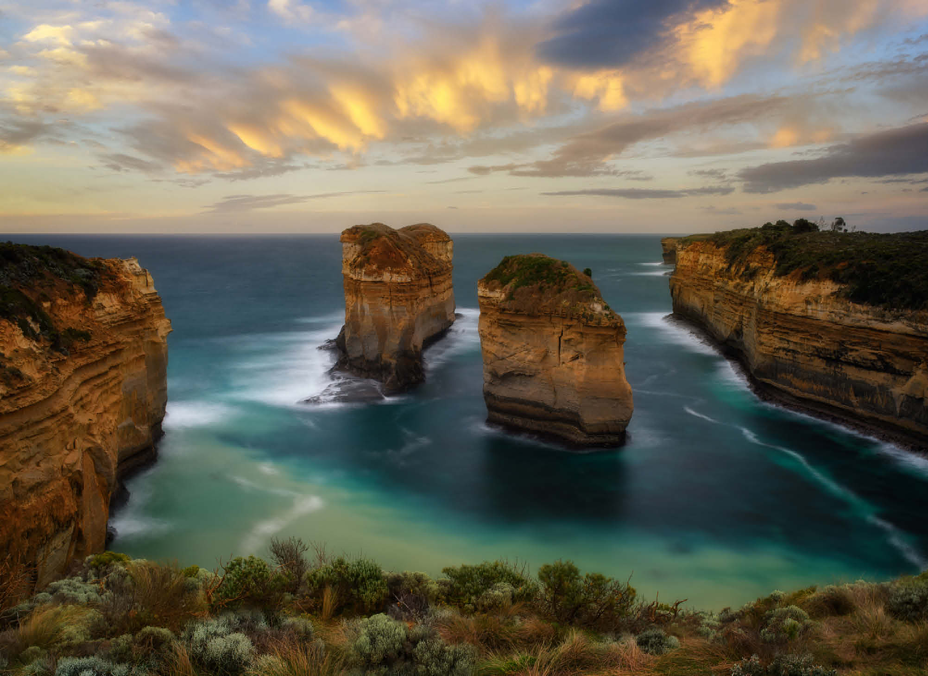 Loch Ard Gorge, part of Australia's Great Ocean Road, is a breathtaking coastal formation characterized by towering limestone cliffs and turquoise waters. Formed through years of erosion, the gorge is named after the shipwreck of the Loch Ard in 1878. The dramatic seascape, with rugged rock pillars standing amid the swirling sea, offers visitors a striking view of nature's raw beauty. At sunset, the golden sky reflects over the ocean, enhancing the stunning contrast between the cliffs and the water below.