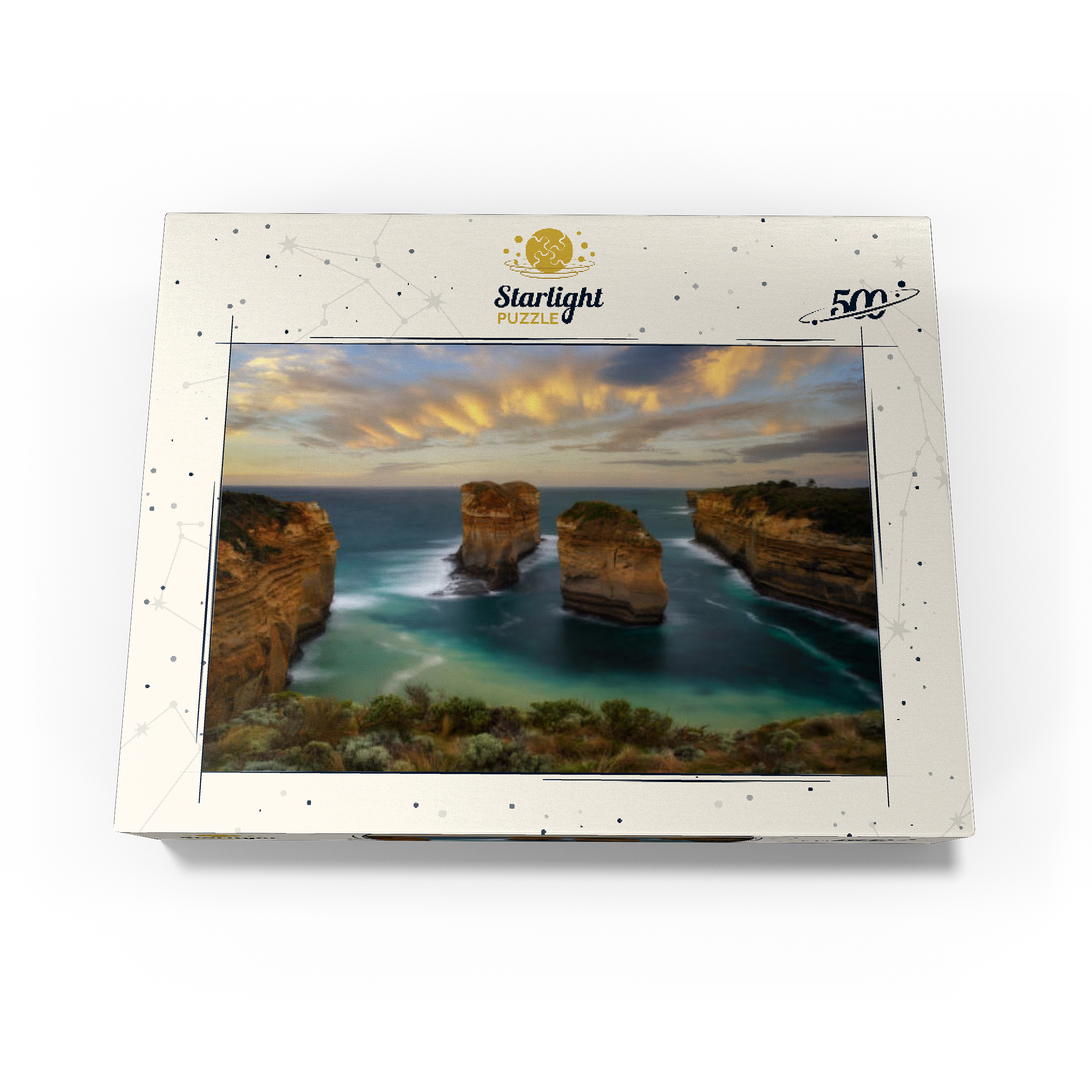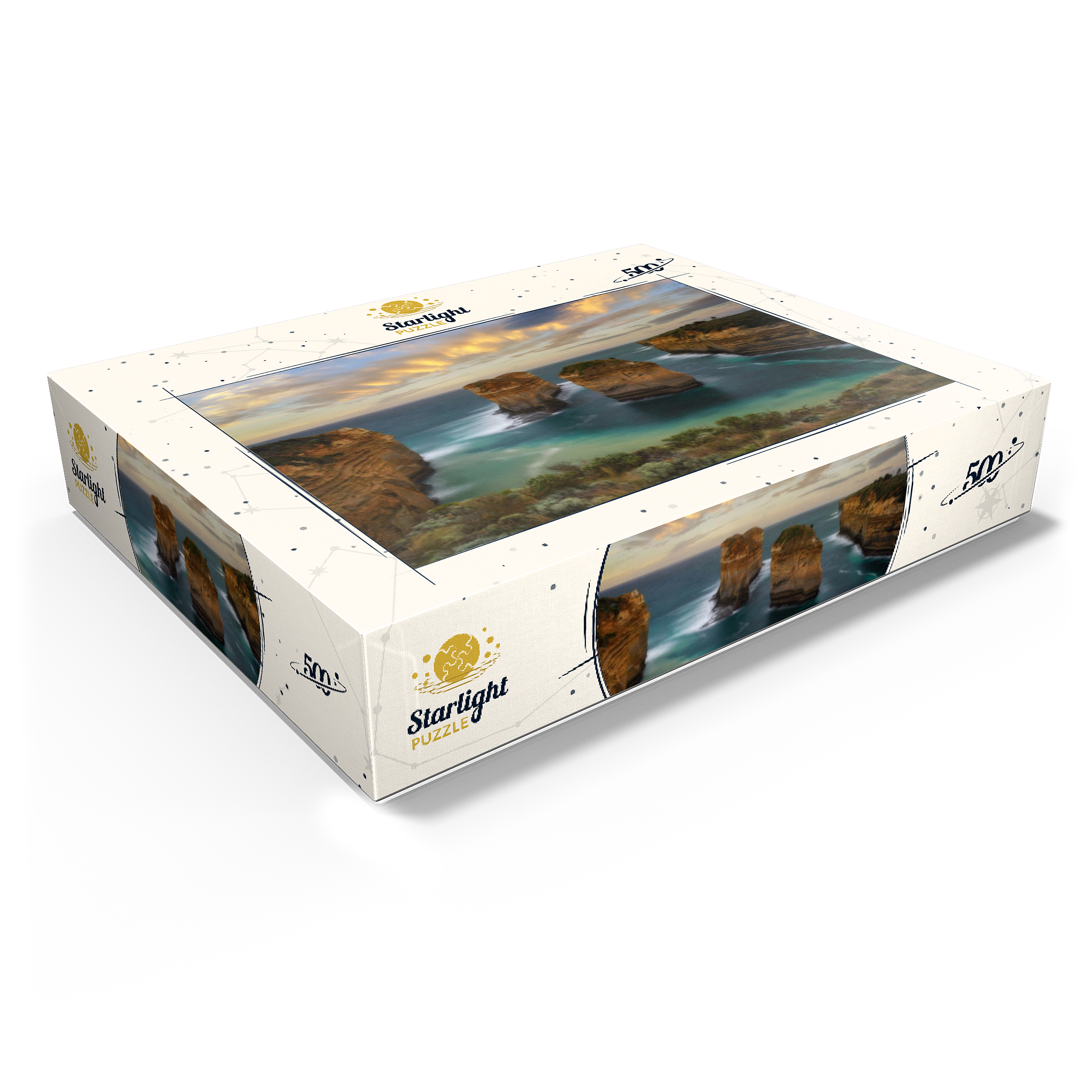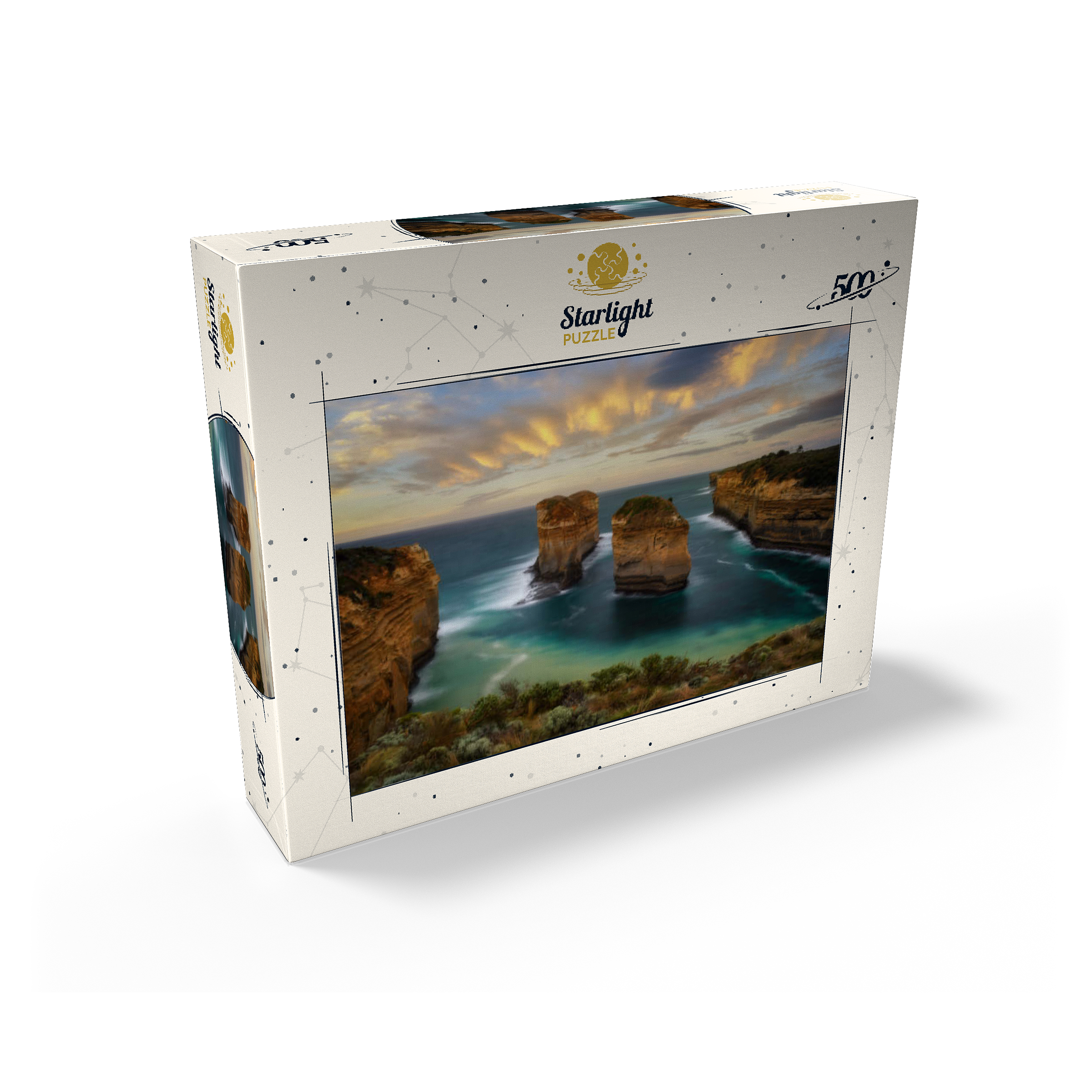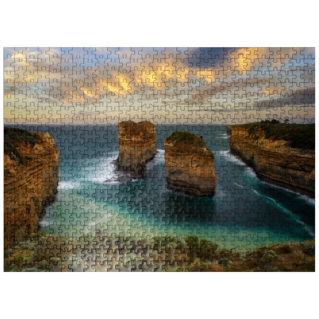 Loch Ard Gorge, part of Australia's Great Ocean Road, is a breathtaking coastal formation characterized by towering limestone cliffs and turquoise waters. Formed through years of erosion, the gorge is named after the shipwreck of the Loch Ard in 1878. The dramatic seascape, with rugged rock pillars standing amid the swirling sea, offers visitors a striking view of nature's raw beauty. At sunset, the golden sky reflects over the ocean, enhancing the stunning contrast between the cliffs and the water below.